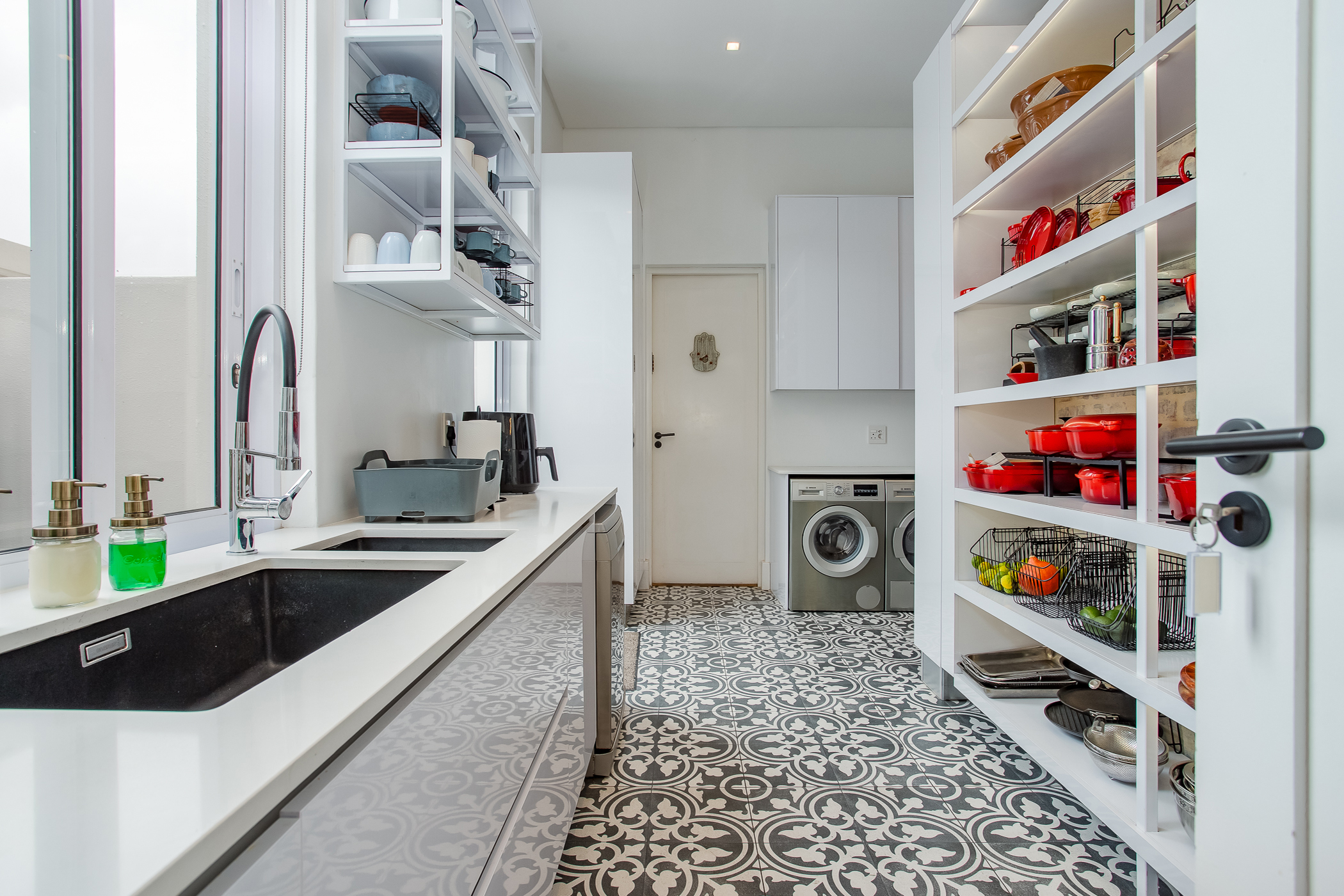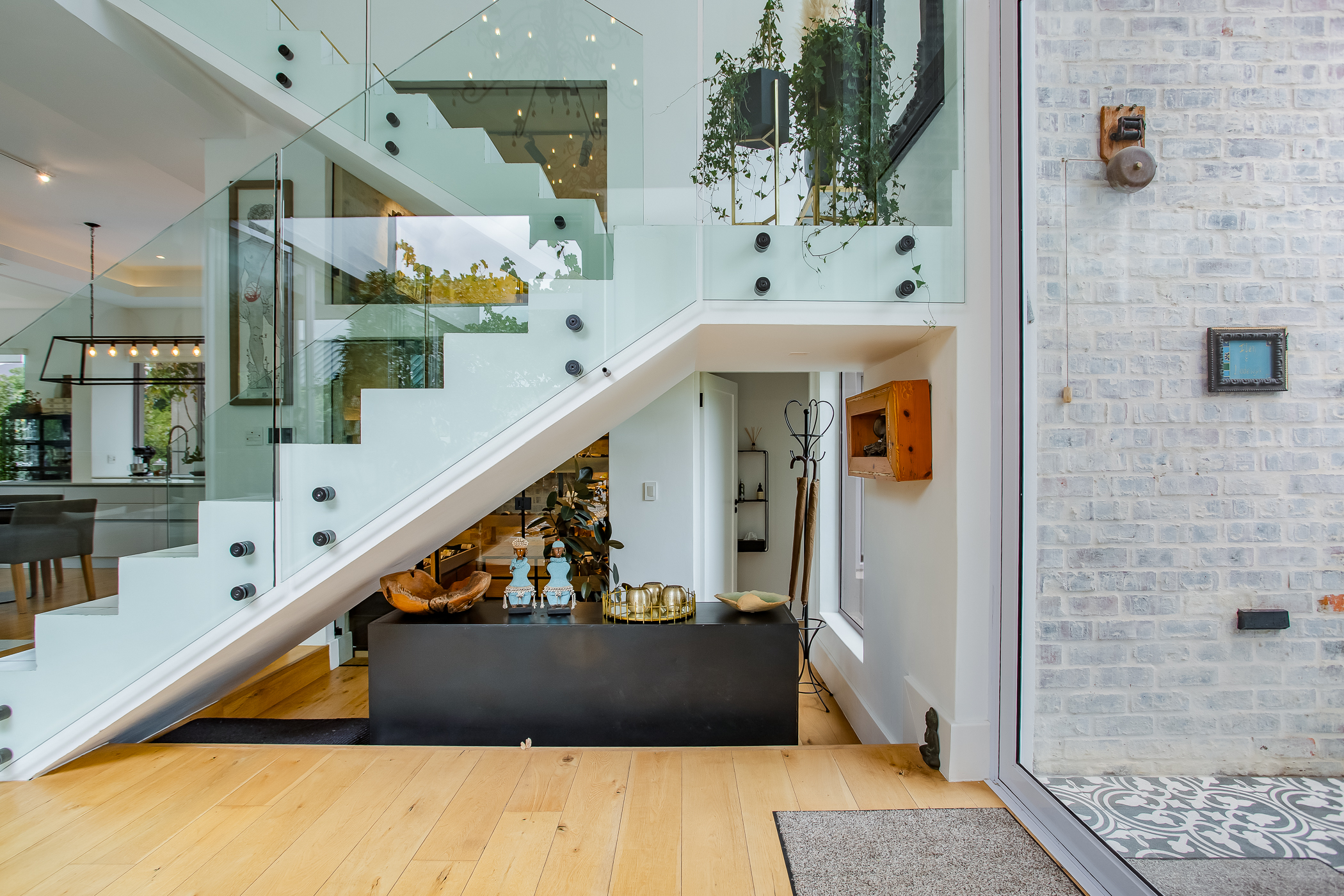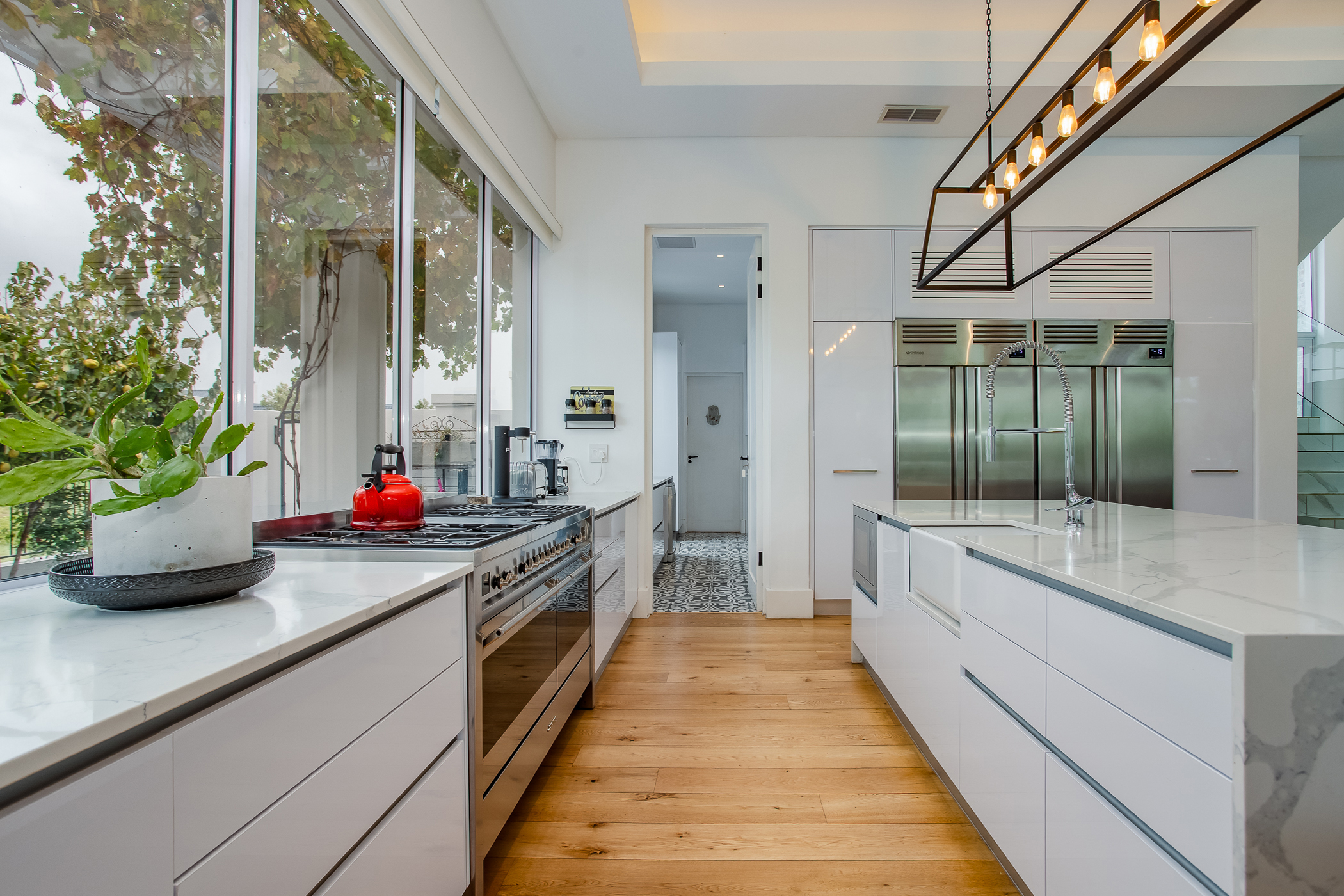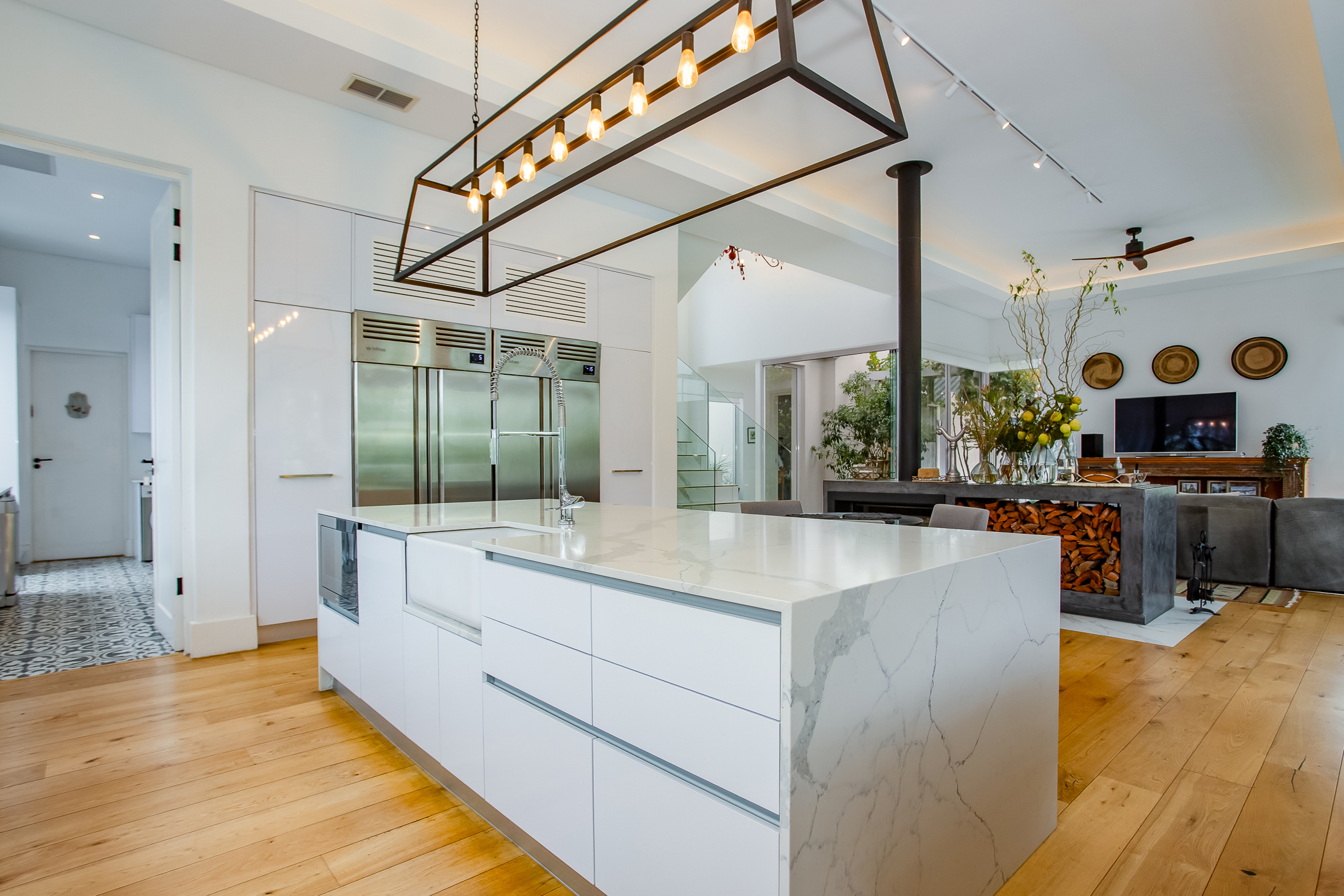 The heart of the home is a striking open-plan living area defined by high ceilings, abundant natural light and an exceptional sense of volume. Large windows frame the surrounding greenery, creating a seamless connection between interior spaces and the natural beauty of the estate. The gourmet kitchen is designed for both functionality and style, featuring a range cooker, integrated industrial fridge/freezer and a separate scullery, flowing effortlessly into the dining and lounge areas to create a welcoming space for entertaining and everyday living.