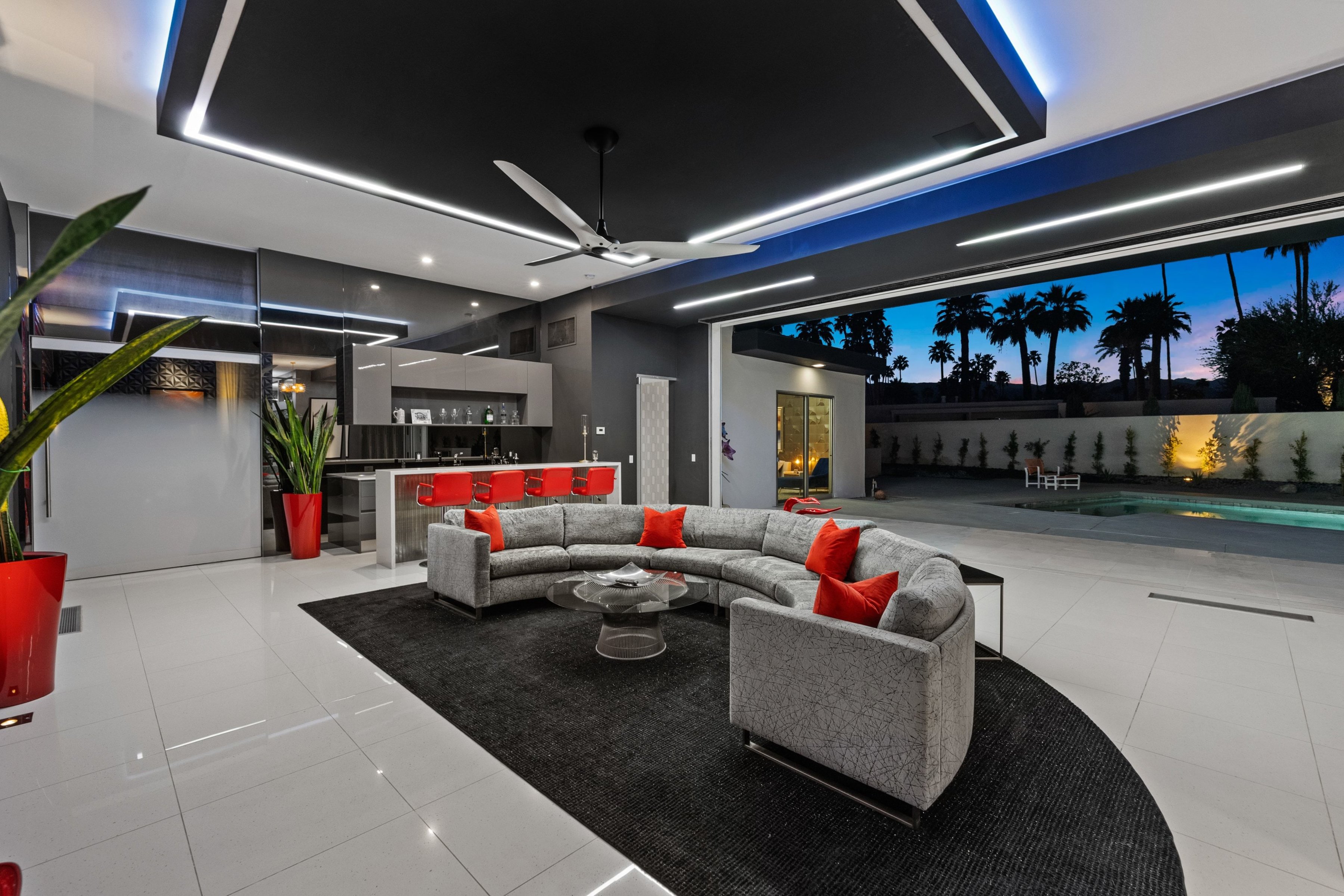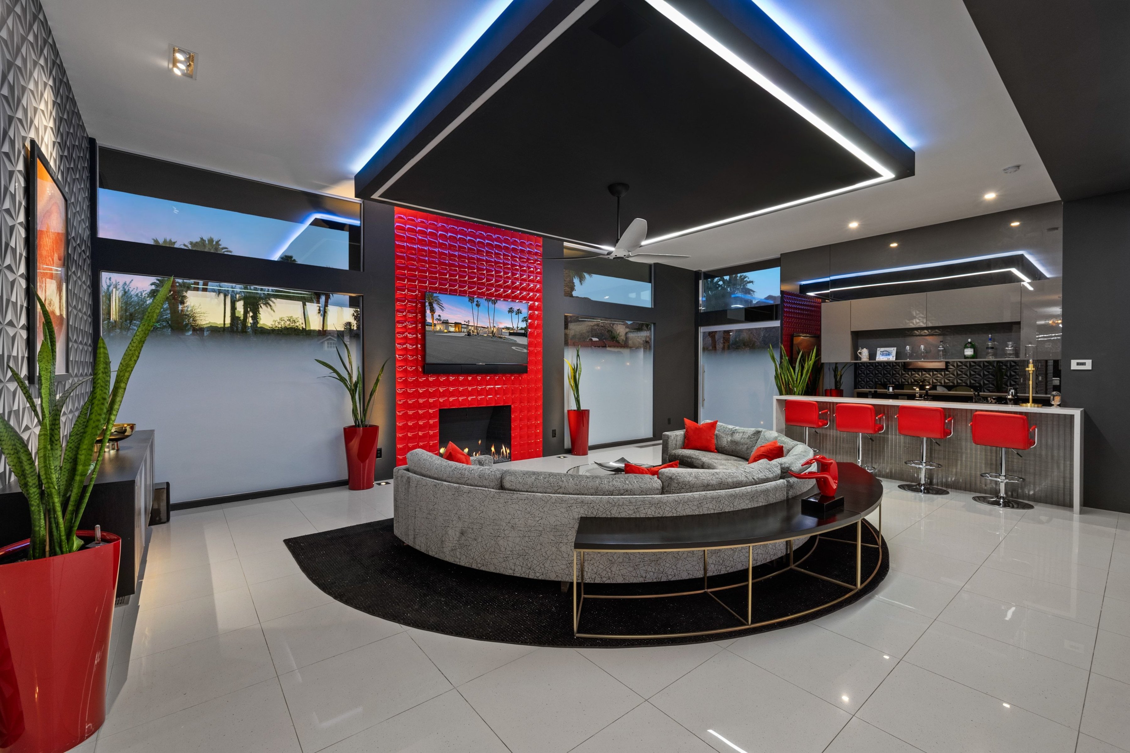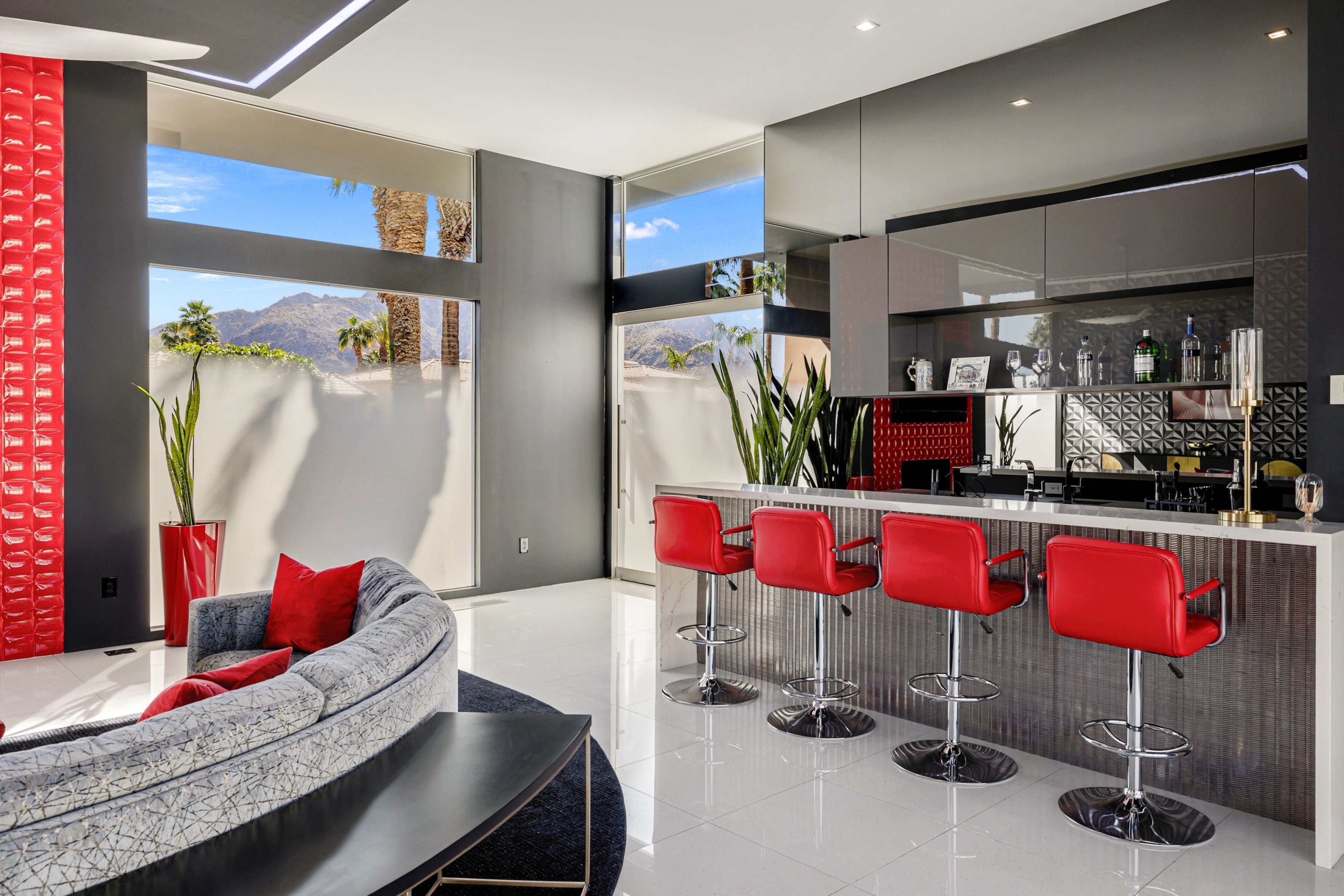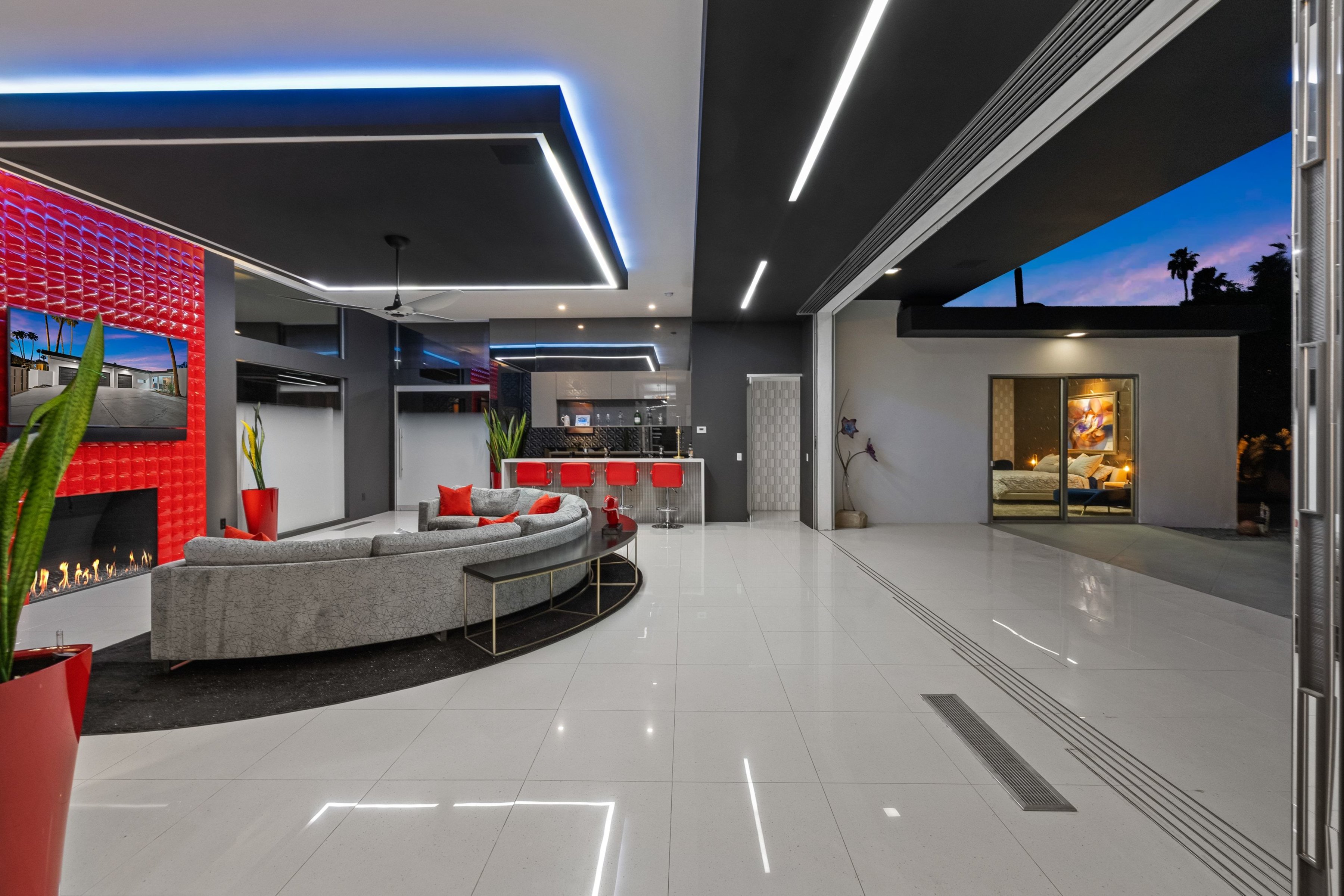 Situated in the heart of Indian Wells, this exceptional contemporary estate rests on a rare oversized double lot, offering grand living spaces, striking designer finishes, soaring ceilings, and seamless indooroutdoor flow. Enter through your privately gated courtyard, where a dramatic 6-foot-wide glass pivot door makes a bold architectural statement. Inside, the living room leaves a lasting impression with sixteen-foot ceilings and a custom floor-to-ceiling red porcelain fireplace serving as a stunning focal point. A stylish wet bar and disappearing walls of glass open effortlessly to the expansive, low-maintenance backyard and pool — creating the ultimate environment for entertaining family and friends. The luxurious primary suite serves as a private retreat, featuring a wall of glass with direct access to the pool and yard, plush carpeting, dual oversized closets, and a spa-inspired bath designed for relaxation. In addition to the primary suite, the home offers two beautifully appointed designer-finished bedroom suites, four baths, a fully equipped media room with wet bar, and a game room thoughtfully designed for unforgettable game days, movie nights, or casual gatherings. The adjacent dining area and sleek custom modern kitchen are bright, open, and highly functional, framed by walls of glass on both sides that flood the space with natural light while maintaining effortless flow. For those seeking the ultimate Desert Luxury Lifestyle, this rare double-lot contemporary residence delivers exceptional space, privacy, and the perfect balance of sophistication and relaxed desert living.
