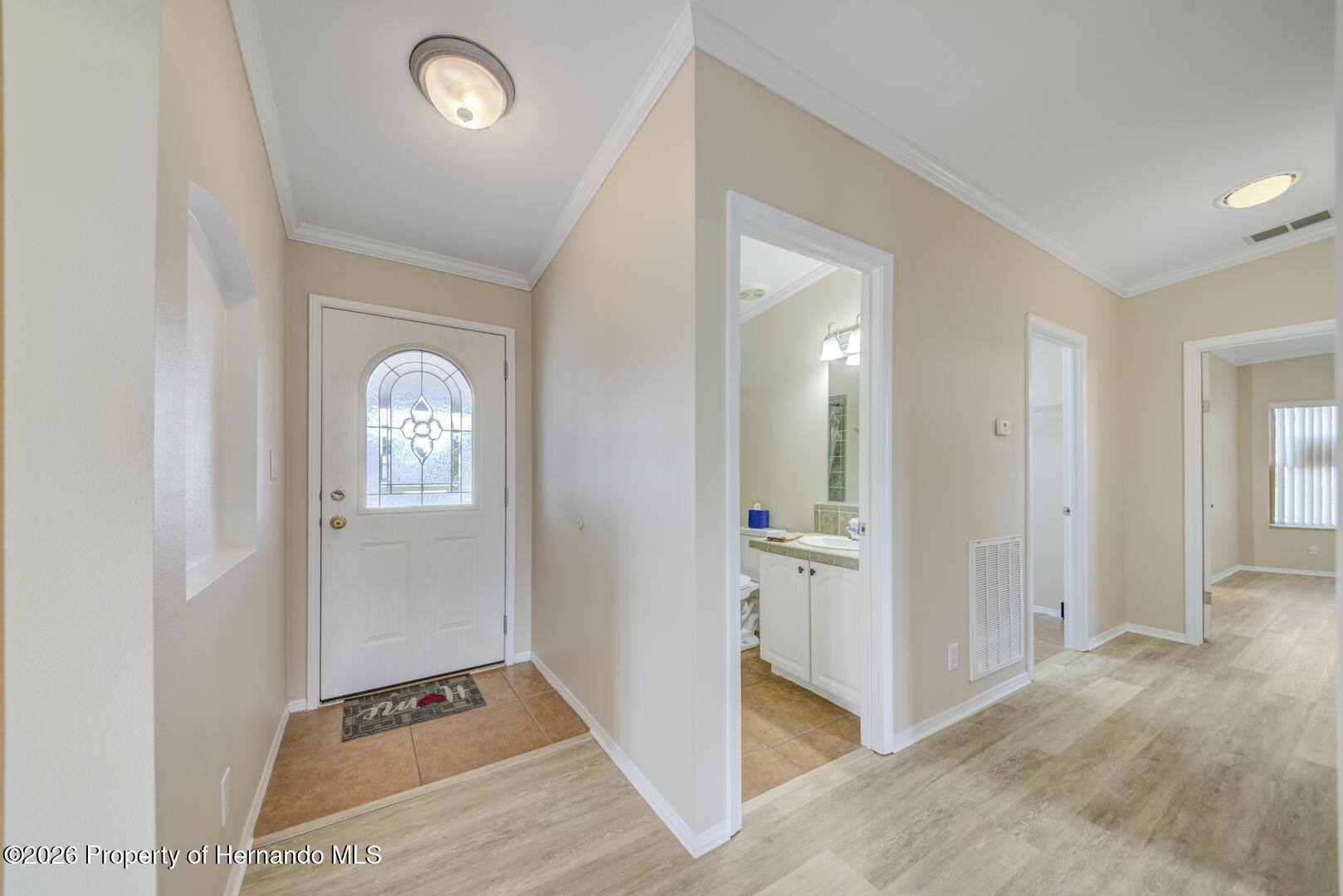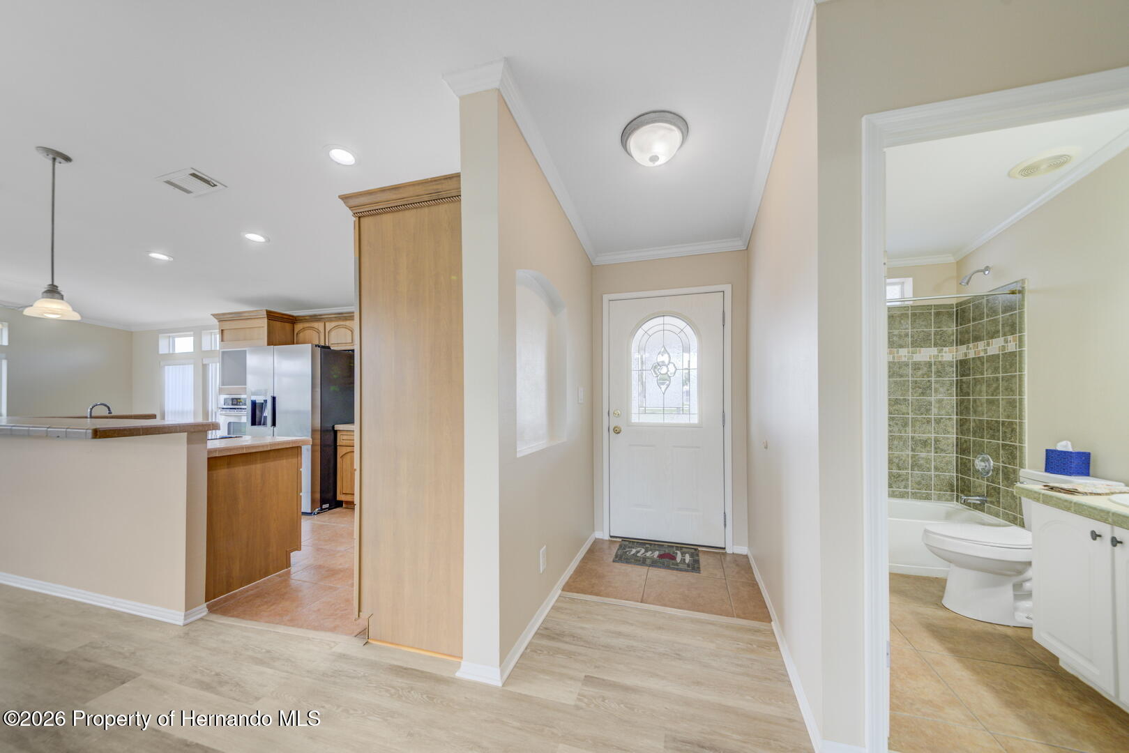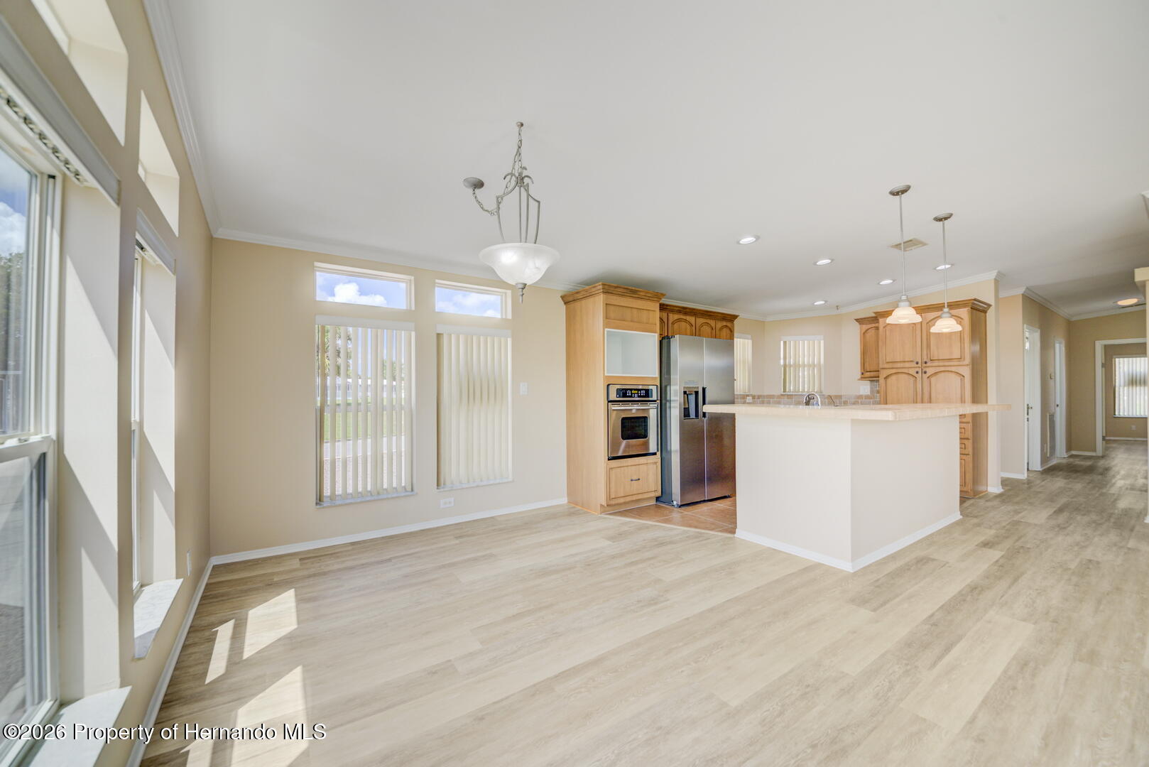 Welcome to your dream abode, nestled on a desirable corner lot within a vibrant 55+ community. New Laminate Flooring and Freshly Painted! This delightful residence offers an ideal blend of comfort, functionality, and style, making it the perfect haven for those seeking a serene yet active lifestyle. The home boasts two spacious bedrooms, providing ample space for relaxation and rest. Each room is thoughtfully designed to ensure comfort and tranquility. The primary suite features a luxurious primary bath equipped with double sinks, a garden tub for leisurely soaks, and a separate shower for convenience and ease. Step into the great room, where an abundance of natural light streams through large windows, creating a bright and inviting atmosphere. This space is ideal for entertaining guests or enjoying a quiet afternoon with a good book. The well-appointed kitchen is a cook's delight, featuring a convenient bar for casual dining or entertaining, an extra sink for added functionality, and plenty of cabinets to accommodate all your culinary needs. Whether you are preparing a meal for yourself or hosting friends, this kitchen is equipped to handle it all. The family room offers a cozy space for movie nights or gatherings, while the enclosed Lanai provides a perfect spot to enjoy the outdoors year-round without leaving the comfort of your home. This versatile area can be customized to suit your personal preferences, whether it's a reading nook or a hobby space. Workshop: Perfect for DIY enthusiasts or those needing additional storage space. New Roof: Recently updated to ensure the home is well-protected and energy-efficient. This charming residence offers not just a place to live, but a community to thrive in.This is a ACTIVE, GATED, GOLFING COMMUNITY close to shopping, medical facilities, restaurants and much more. The Brookridge community has a lot to offer with many clubs, a heated swimming pool, pickleball/tennis courts, shuffleboard courts and a 72-par golf course and pro shop. With its thoughtful design and prime location, this home is ready to welcome you into a lifestyle of comfort and joy.