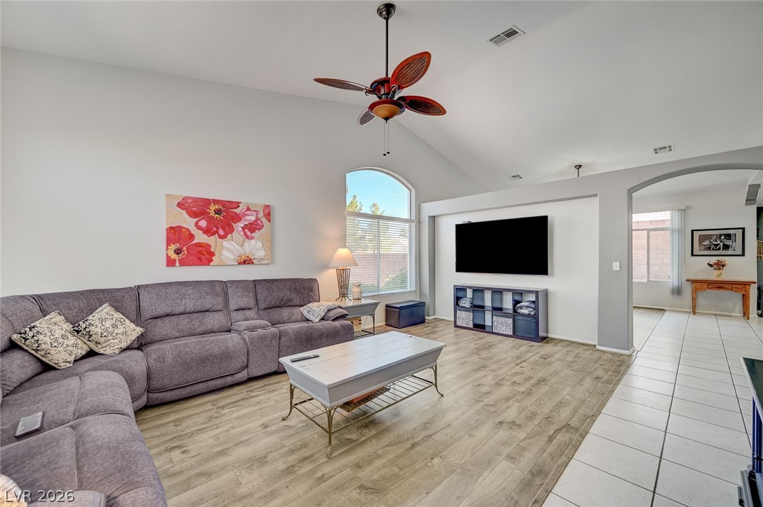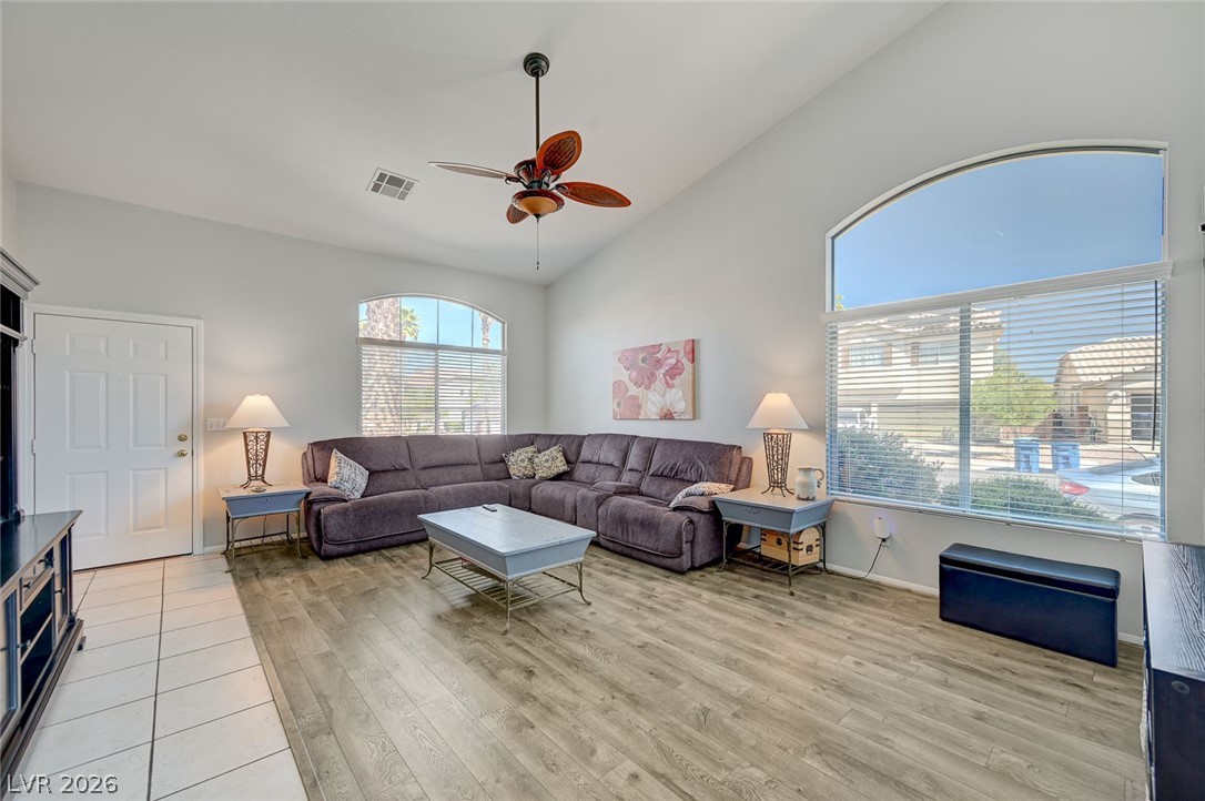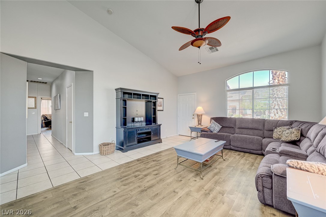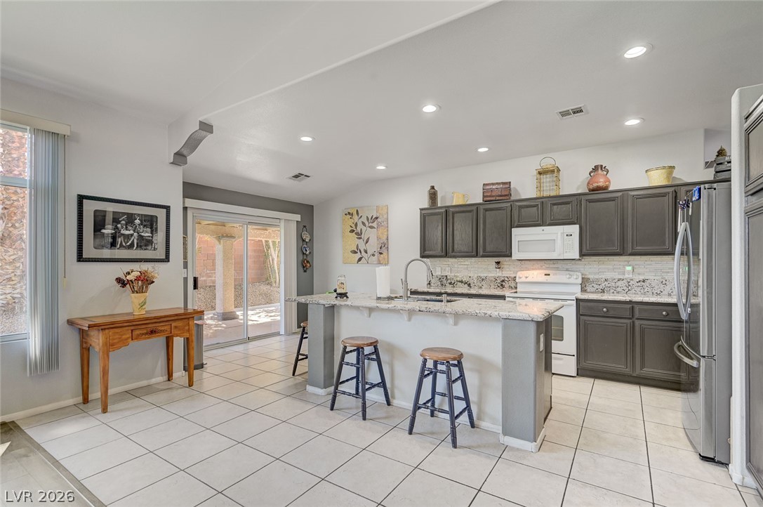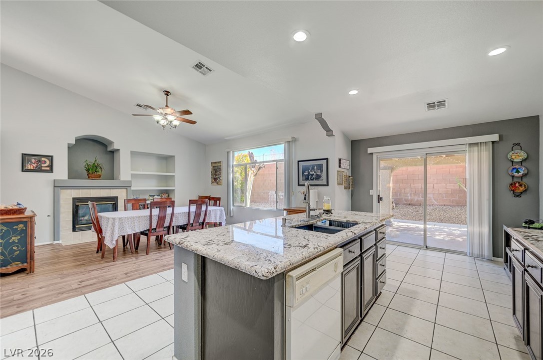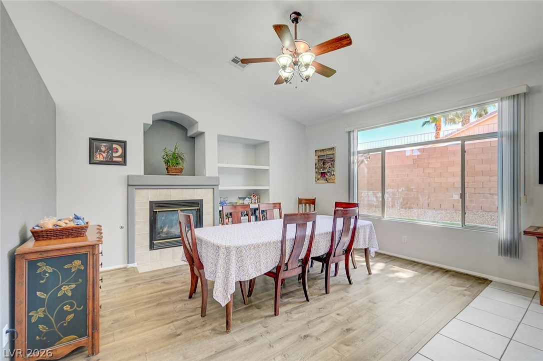 Beautifully maintained single-story home featuring 3 oversized bedrooms, 2 bathrooms, and an expansive 3-car garage. Enjoy bright, open living and dining areas with vaulted ceilings, complemented by stylish vinyl plank and tile flooring throughout. The spacious island kitchen is filled with natural light and offers granite countertops, a cozy dining nook, and recessed lighting - perfect for both everyday living and entertaining. The living room showcases soaring vaulted ceilings and a warm, inviting fireplace. The primary suite provides a private retreat with dual sinks, a custom walk-in shower, and a generous walk-in closet. An oversized secondary bedroom includes a ceiling fan and ample closet space. Step through the sliding glass doors to a large covered patio overlooking a lush backyard with mature landscaping - ideal for relaxing or hosting. The front yard features low-maintenance desert landscaping for added convenience. This home won't last - schedule your tour today!