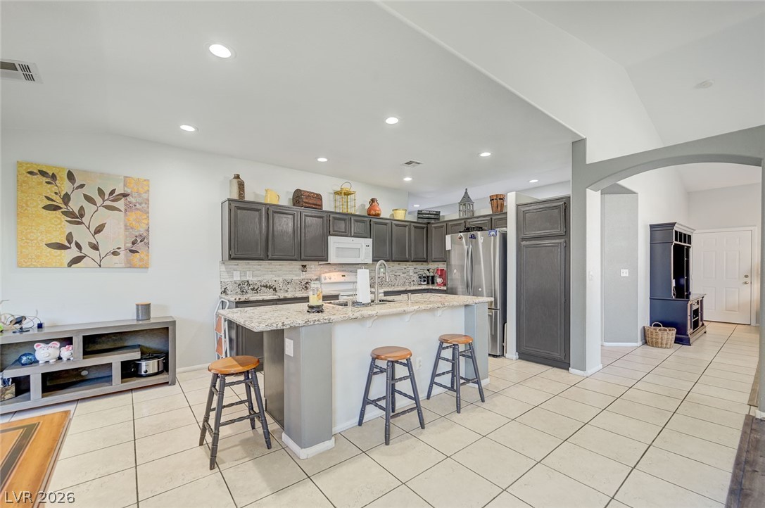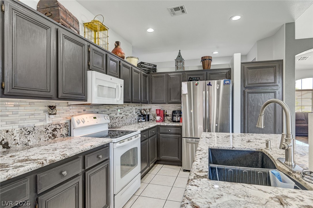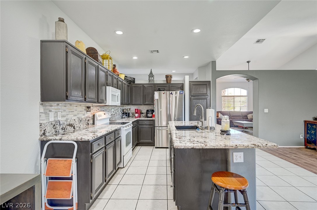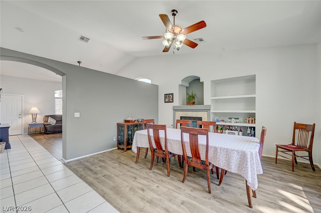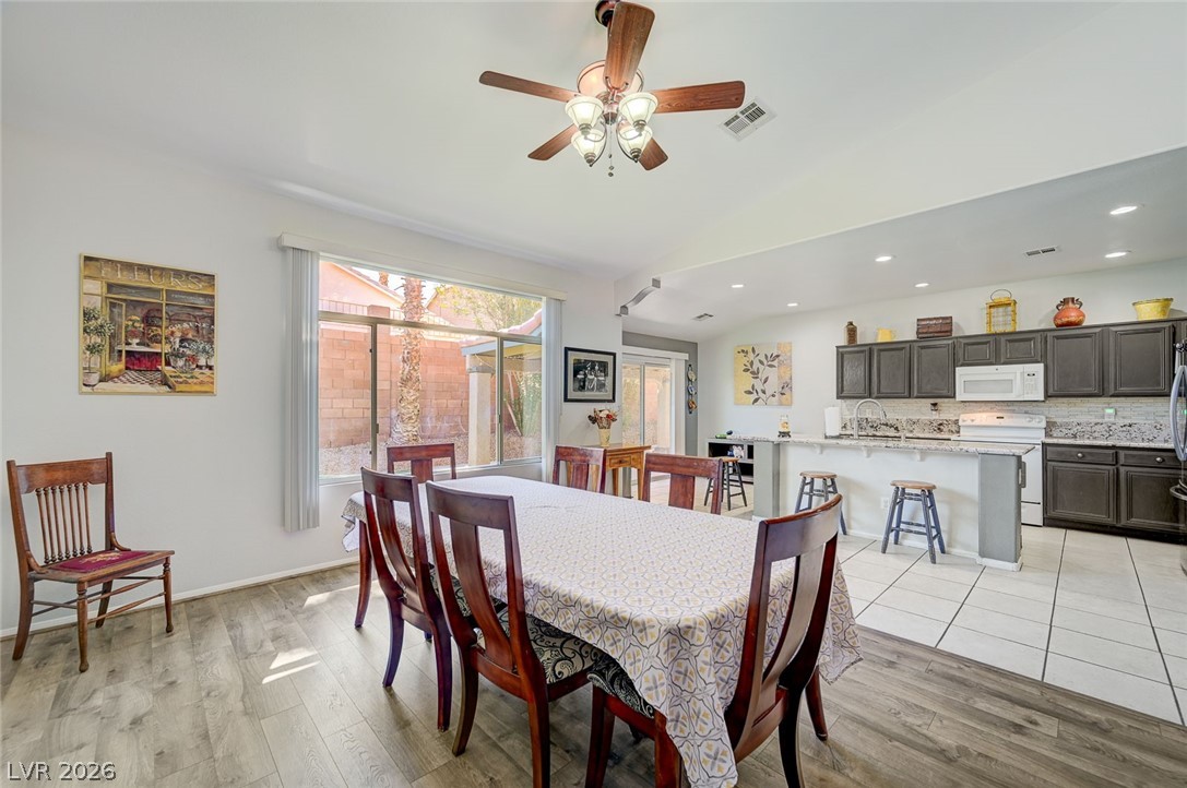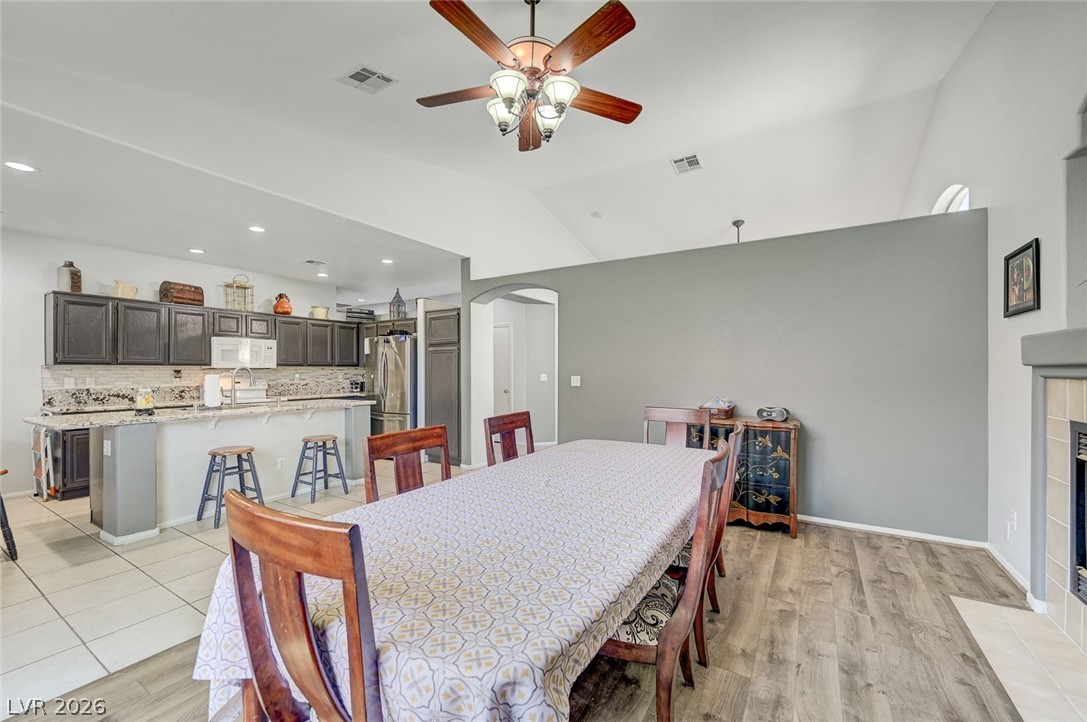 Beautifully maintained single-story home featuring 3 oversized bedrooms, 2 bathrooms, and an expansive 3-car garage. Enjoy bright, open living and dining areas with vaulted ceilings, complemented by stylish vinyl plank and tile flooring throughout. The spacious island kitchen is filled with natural light and offers granite countertops, a cozy dining nook, and recessed lighting - perfect for both everyday living and entertaining. The living room showcases soaring vaulted ceilings and a warm, inviting fireplace. The primary suite provides a private retreat with dual sinks, a custom walk-in shower, and a generous walk-in closet. An oversized secondary bedroom includes a ceiling fan and ample closet space. Step through the sliding glass doors to a large covered patio overlooking a lush backyard with mature landscaping - ideal for relaxing or hosting. The front yard features low-maintenance desert landscaping for added convenience. This home won't last - schedule your tour today!