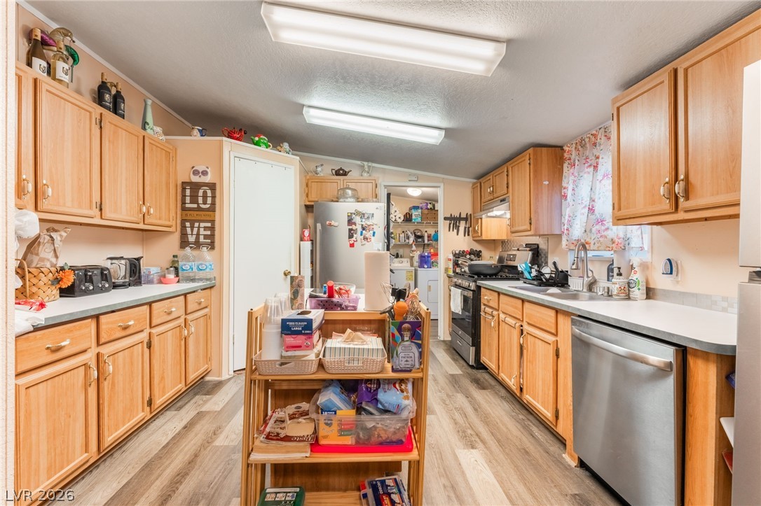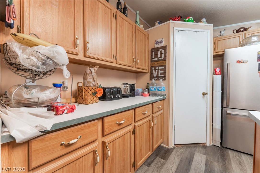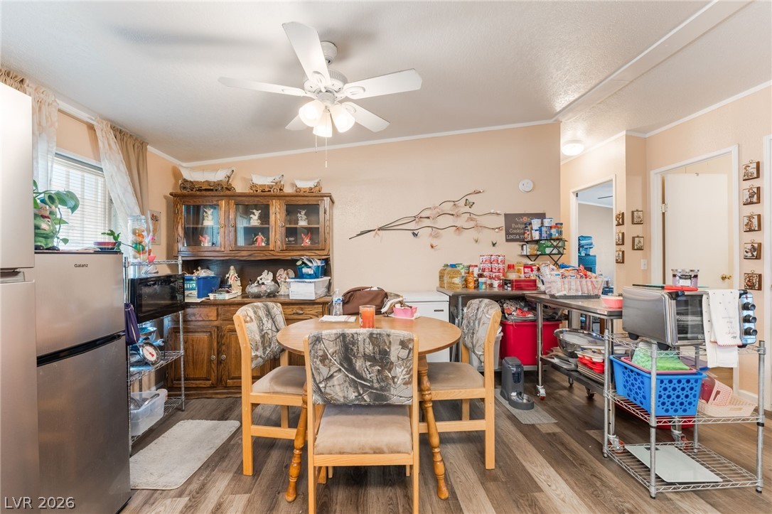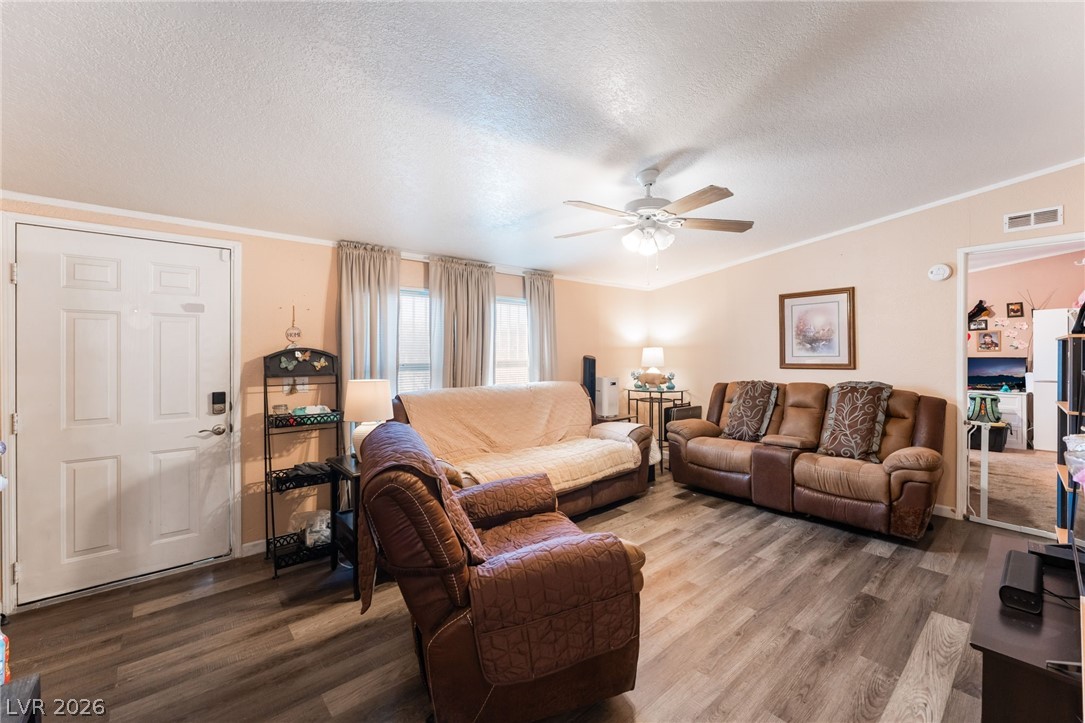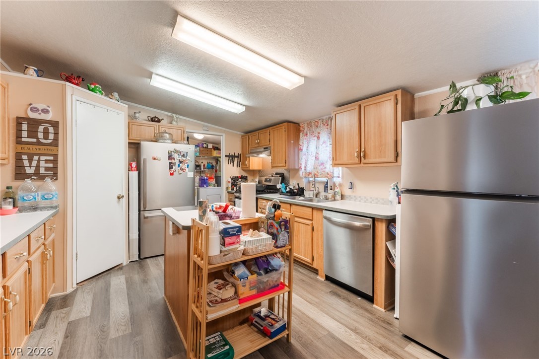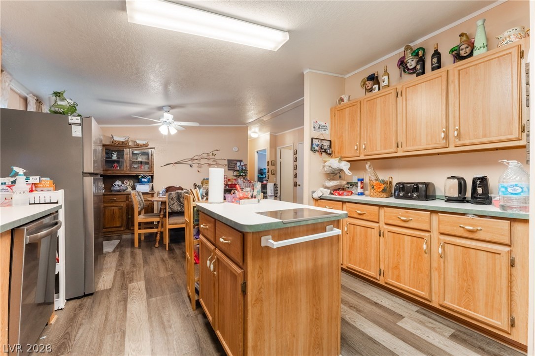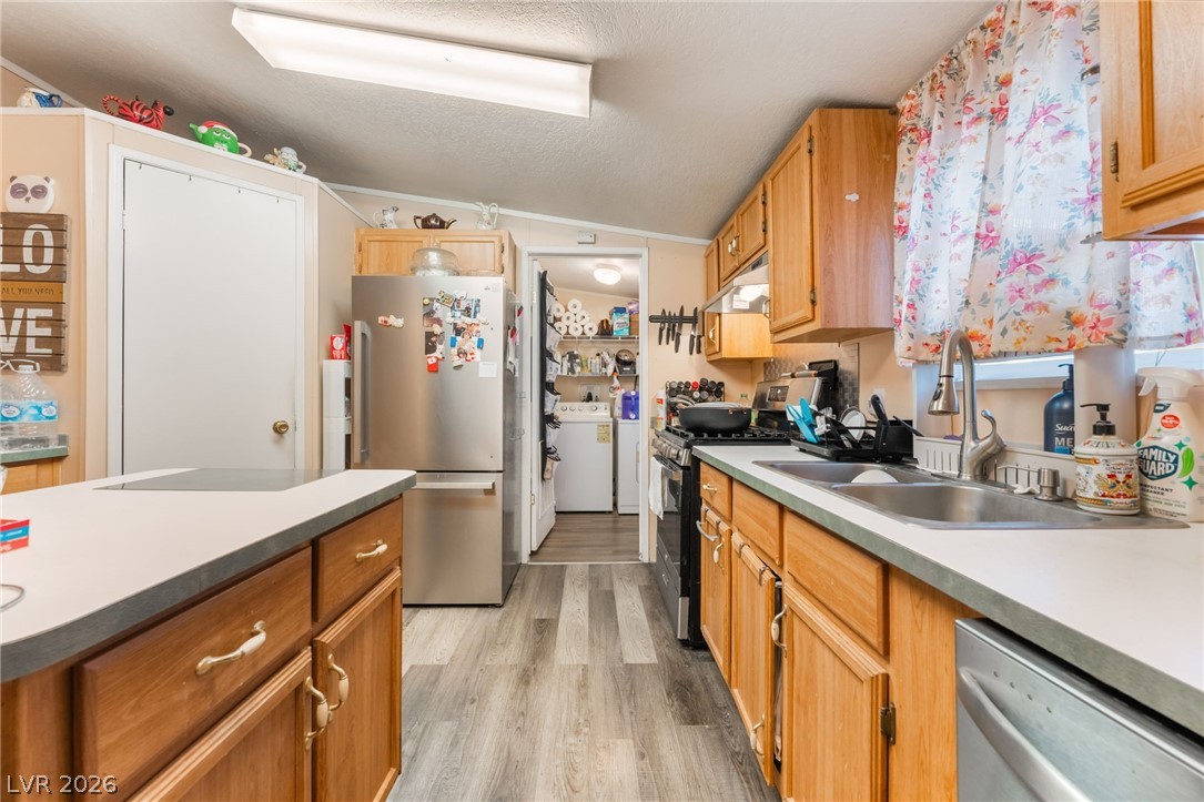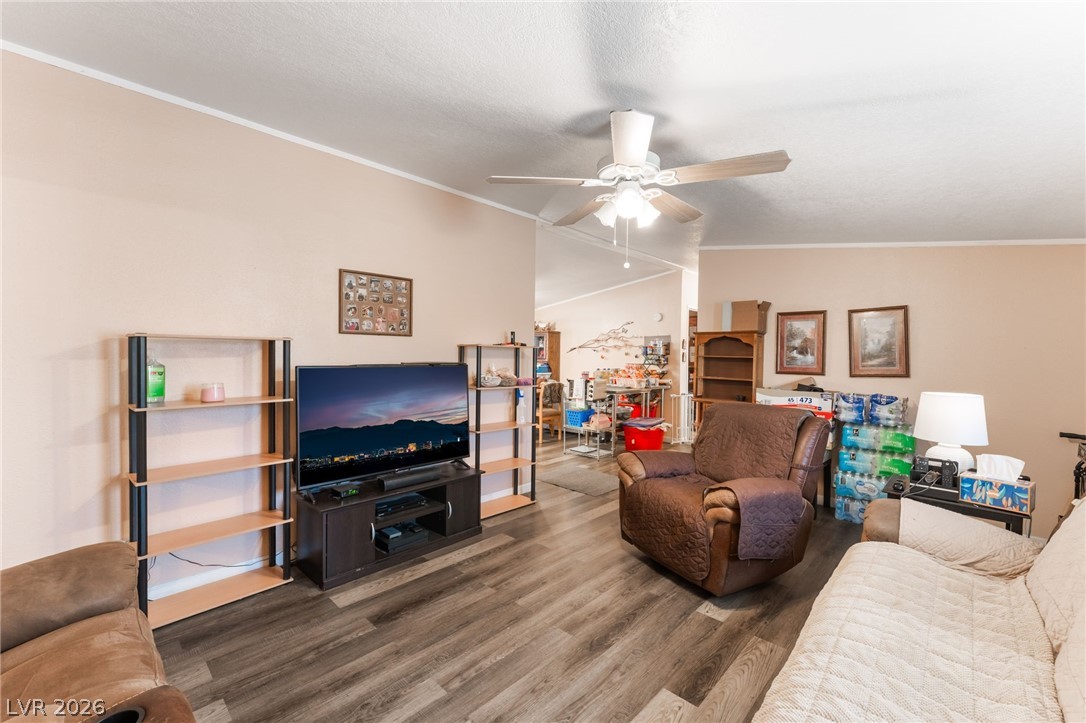 Gorgeous manufactured home converted to real property featuring 3 bedrooms and 2 full baths - best of all, no HOA! This inviting home offers a spacious living room that is open and bright. The lovely kitchen showcases beautiful cabinetry, garden window, center island, and a dedicated dining area. Laminate flooring throughout the home except bedrooms. Primary separate from secondary bedrooms. The spacious primary suite features a walk-in closet and ceiling fan, while the en-suite bath offers dual sinks, a separate soaking tub, and a walk-in shower. Secondary bedrooms are generously sized, each with ceiling fans for added comfort. Large, low-maintenance yard with desert landscaping. Storage sheds. RV/Boat Parking. NEW ROOF! Don't miss the opportunity!