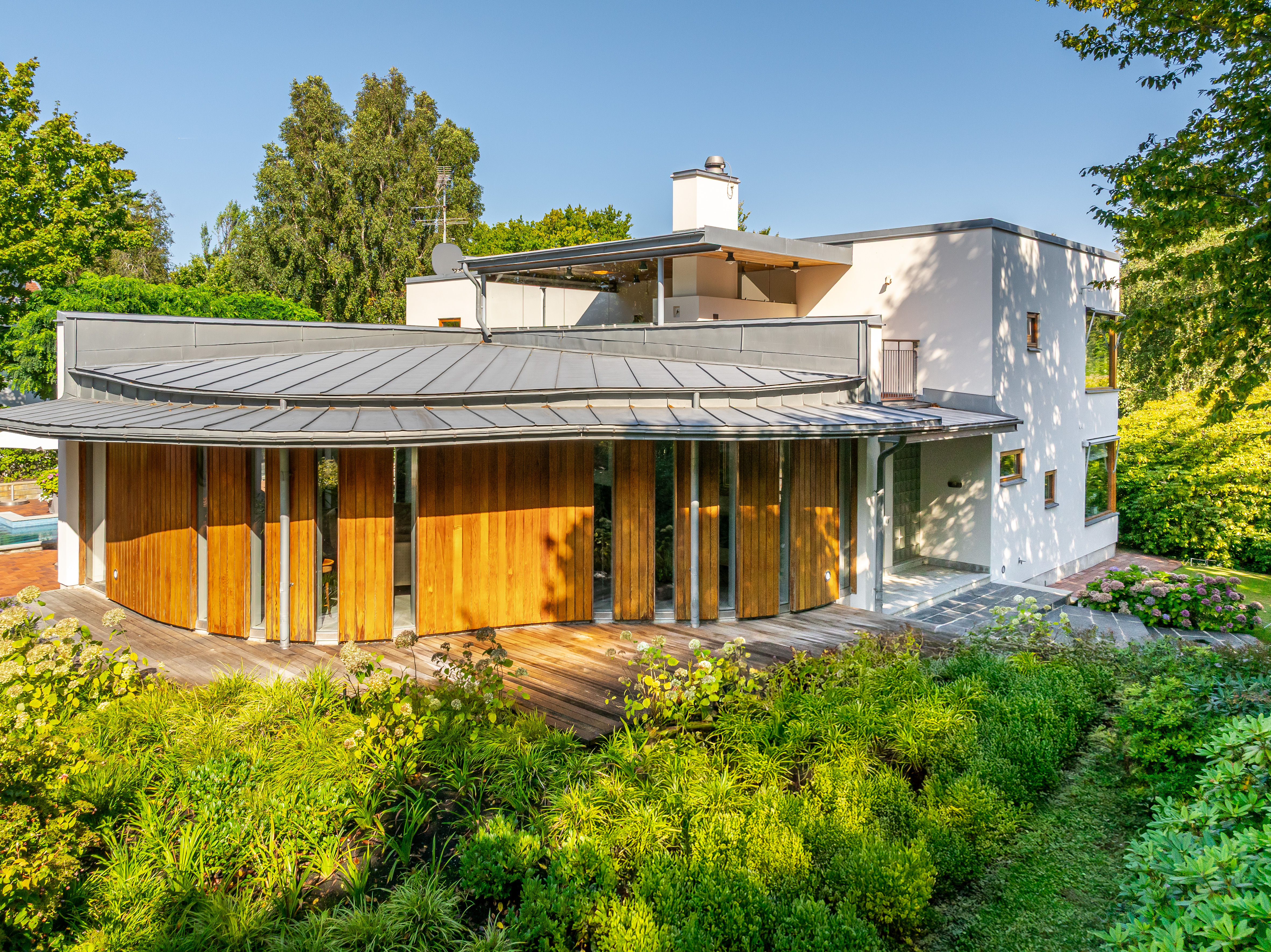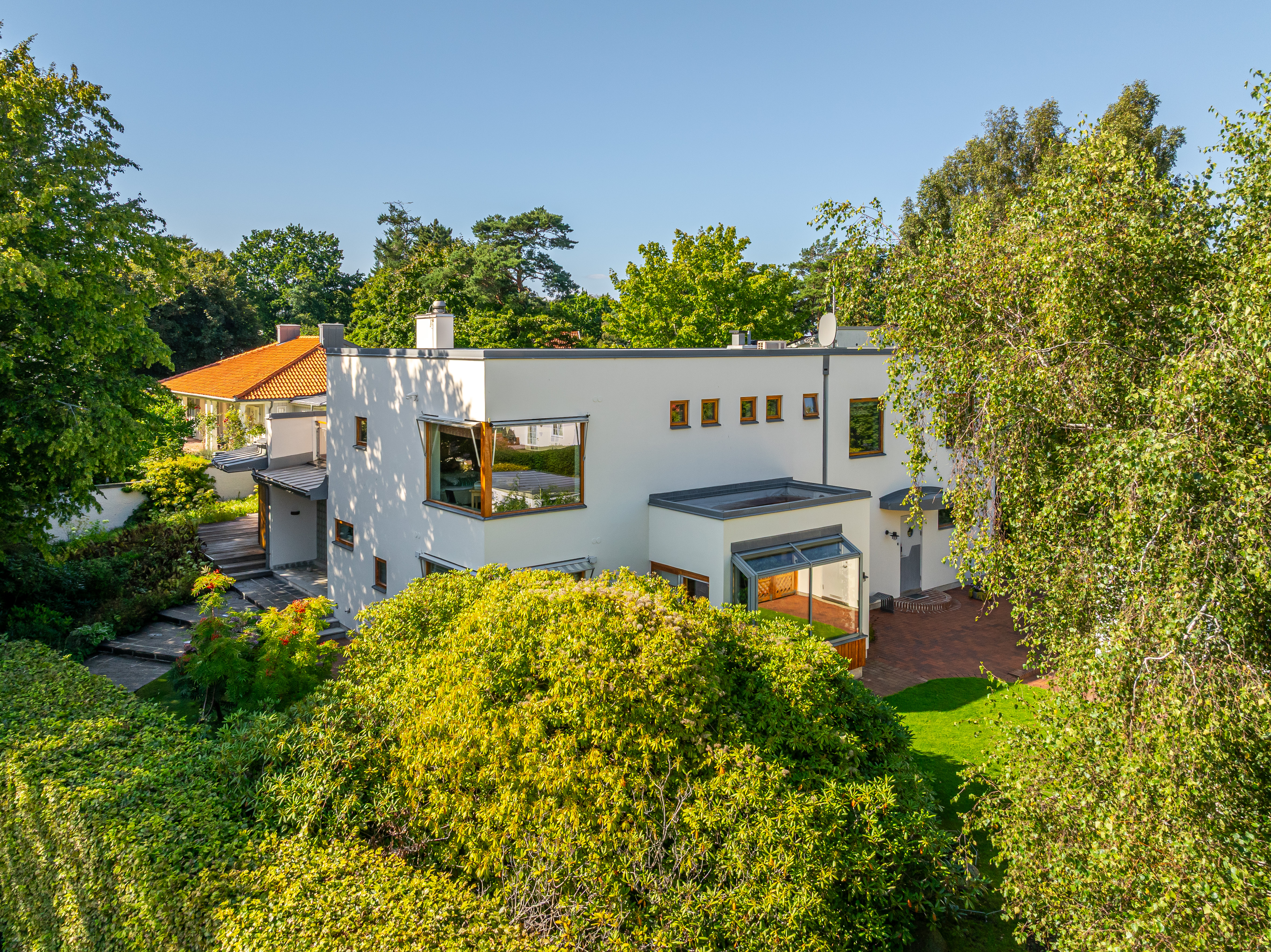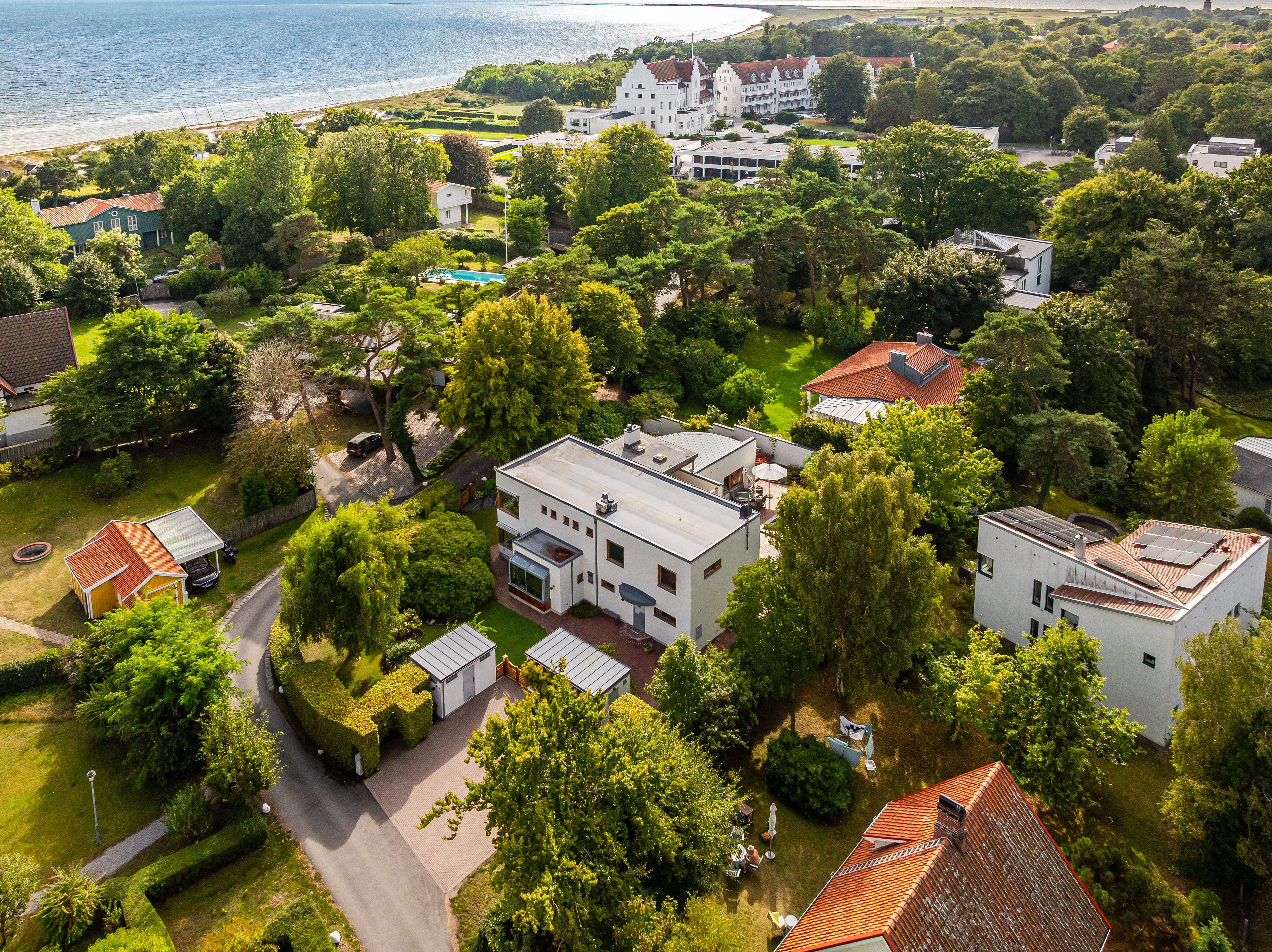 Situated on one of Falsterbo’s most coveted addresses—on Anklamvägen, a distinguished and more private parallel street to Sjögatan—this impressive modern villa stands as a refined example of architecture where the precision of functionalism meets a more humanistic expression. The architect’s brief was to create a home where form and function merge with effortless elegance—where the architecture speaks the same language as the surrounding nature. The undulating façade, timeless materials, and light-filled interior flow give the house a sense of movement, adaptability, and enduring appeal. It is one of Falsterbo’s most characterful examples of Nordic modernism, alongside the functionalist villas of Josef Frank.