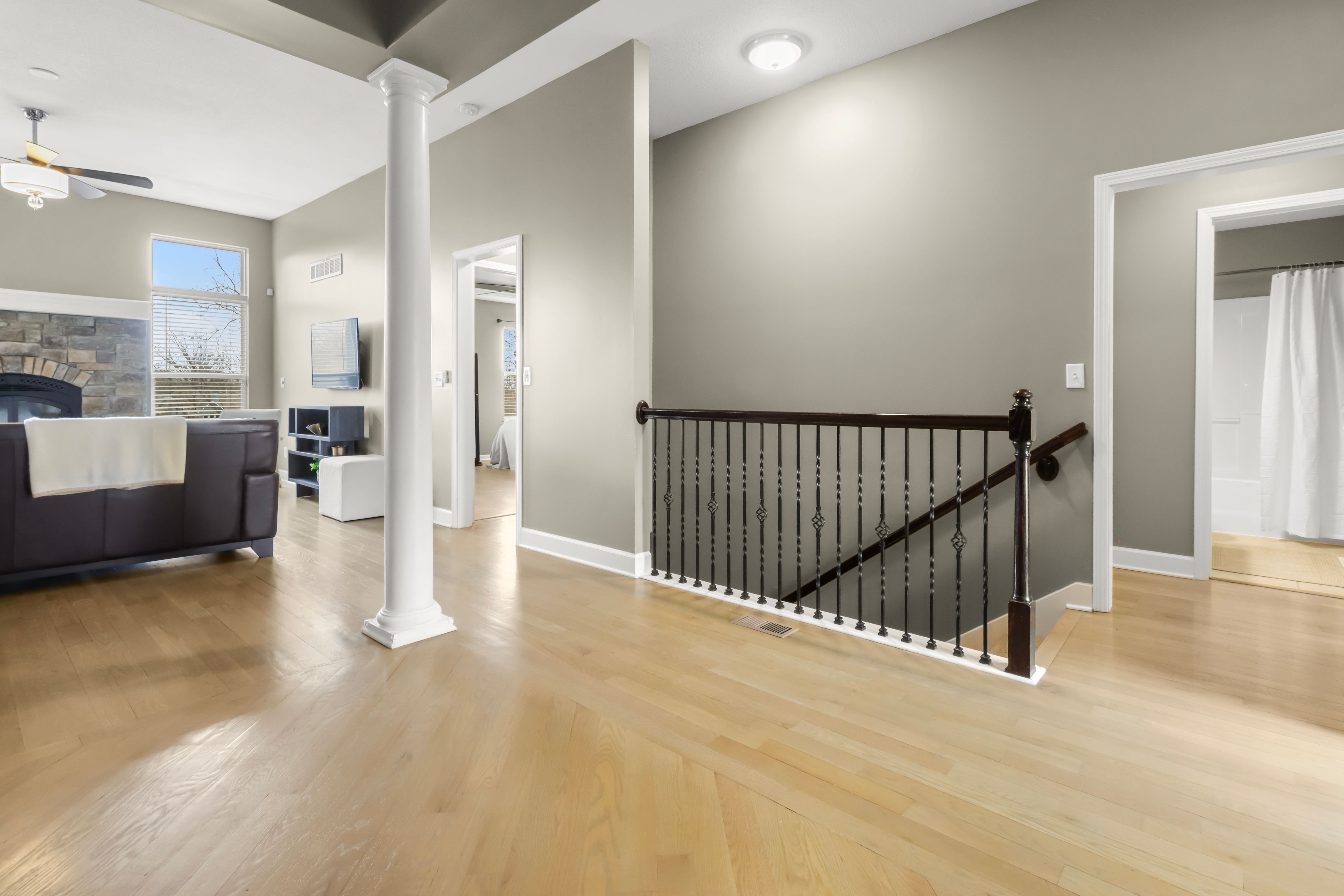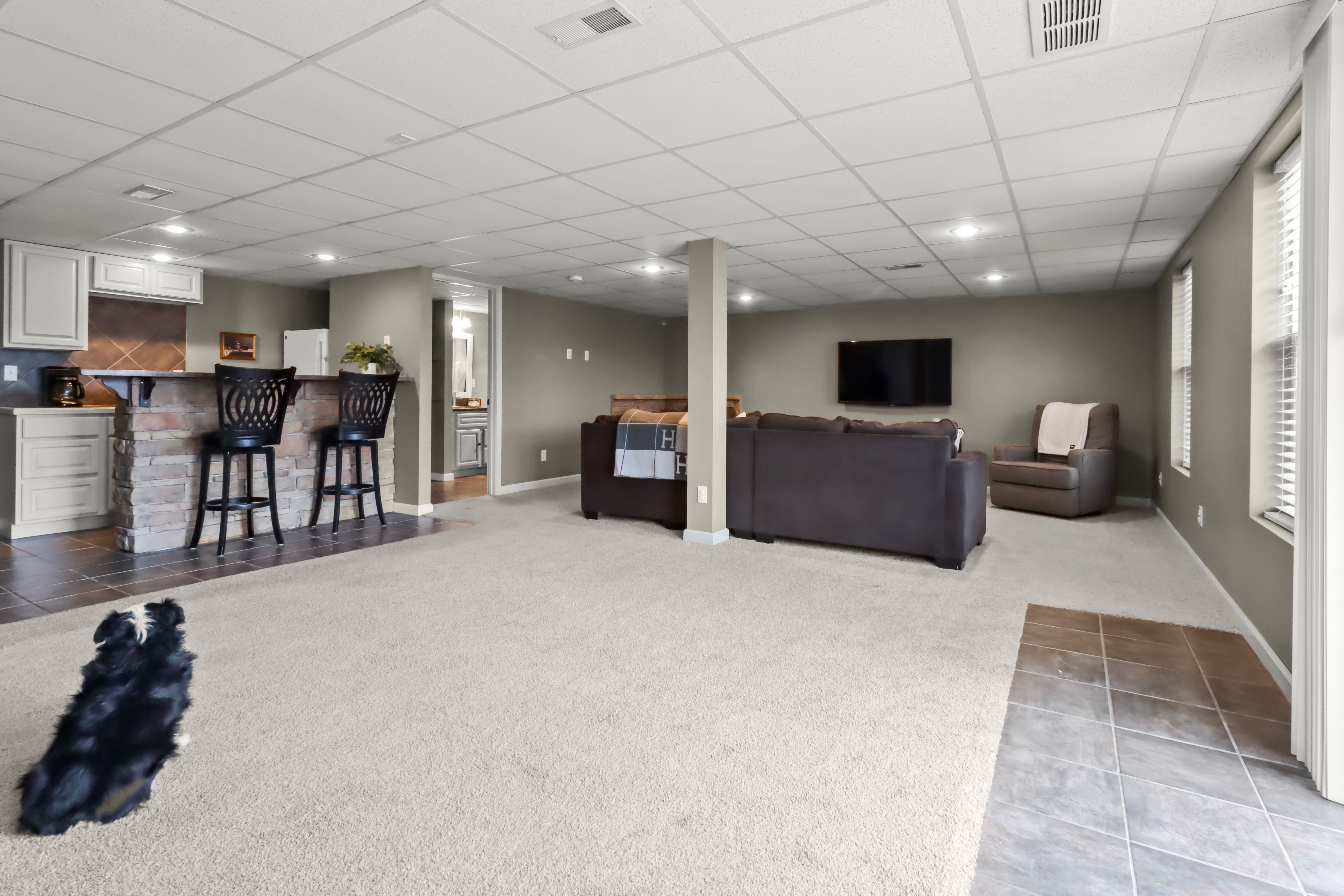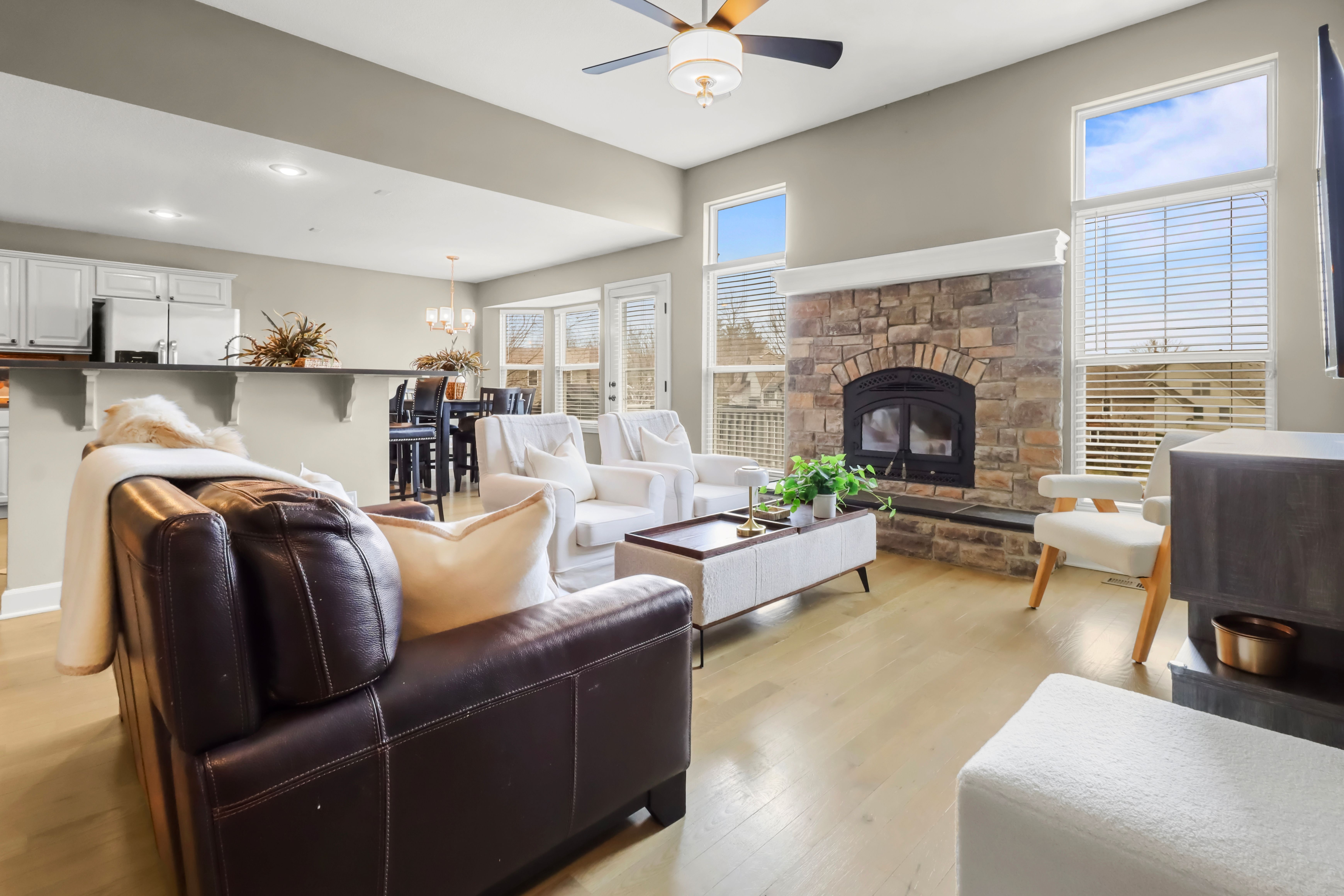 An open, light-filled floor plan welcomes you with a timeless neutral palette, creating a warm yet refined atmosphere throughout. Expansive windows frame serene water views while inviting natural light to pour into the living spaces, enhancing the home’s effortless elegance. The kitchen and all bathrooms are appointed with solid-surface countertops, complemented by tile flooring in each bath and at the wet bar. In the primary suite and lower-level landing, newer wide-plank, wood-look flooring adds a modern touch while offering both durability and ease of living. The walk-out lower level extends the home’s versatility with a spacious recreation room, inviting wet bar, two additional bedrooms, and a flexible bonus space ideal for a home office, fitness studio, or creative retreat. Beyond the home itself, the community offers an equally inviting lifestyle—enjoy access to a neighborhood pool, scenic walking trails, and peaceful pond surroundings that create a sense of connection and calm just outside your door. Thoughtfully updated and truly move-in ready, with a newly installed AC, this home blends comfort, style, and setting—an exceptional opportunity for those seeking both beauty and functionality in a picturesque lakeside environment.