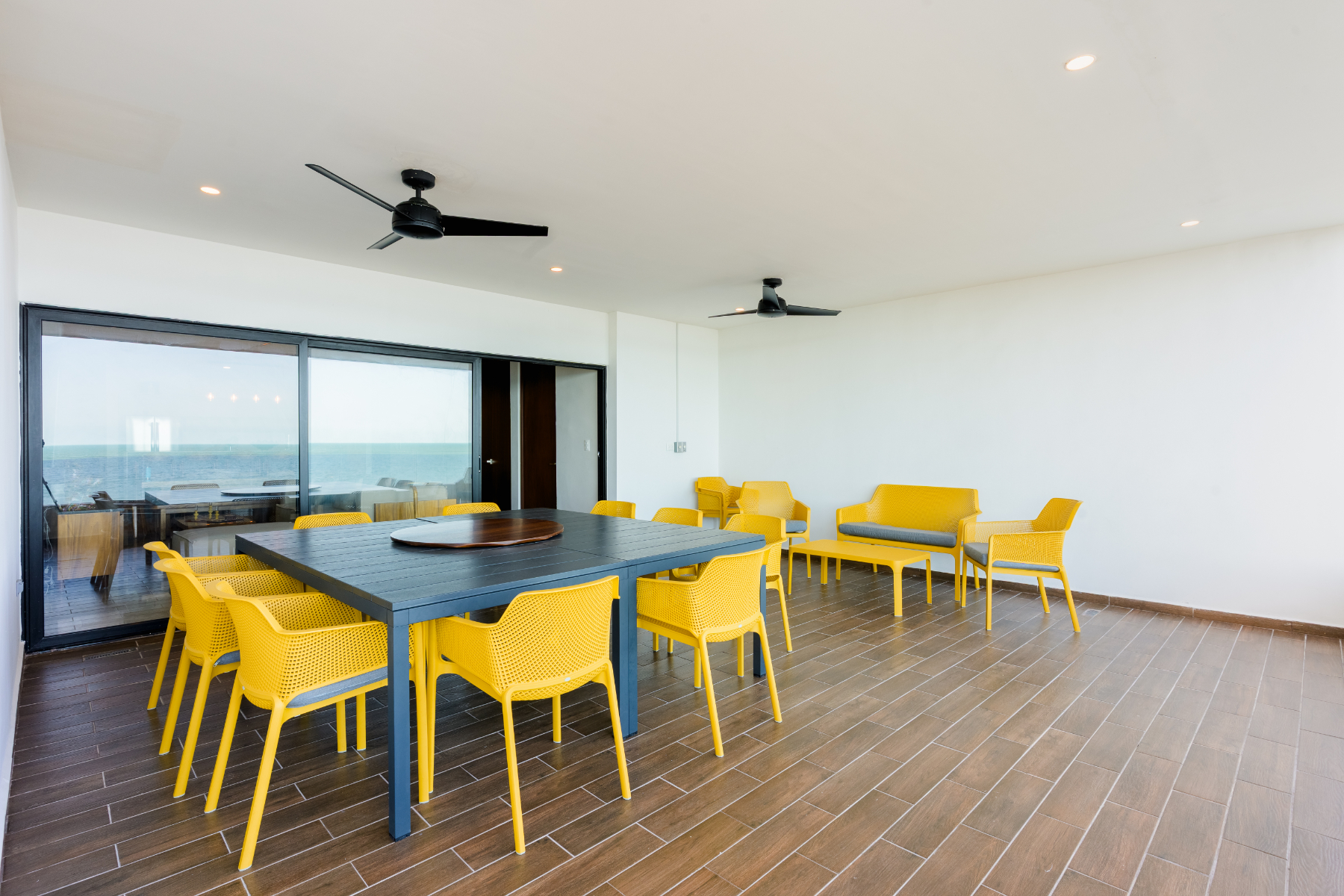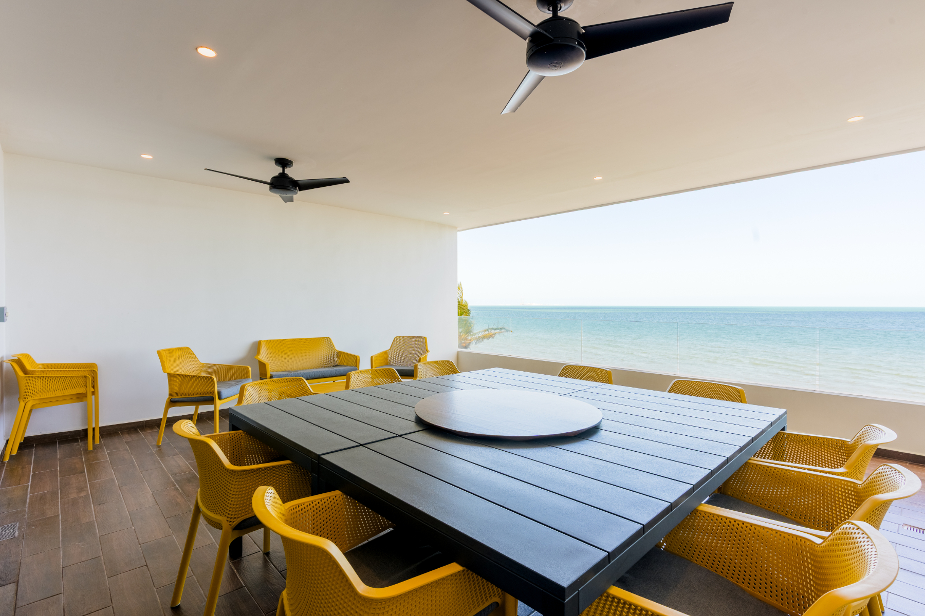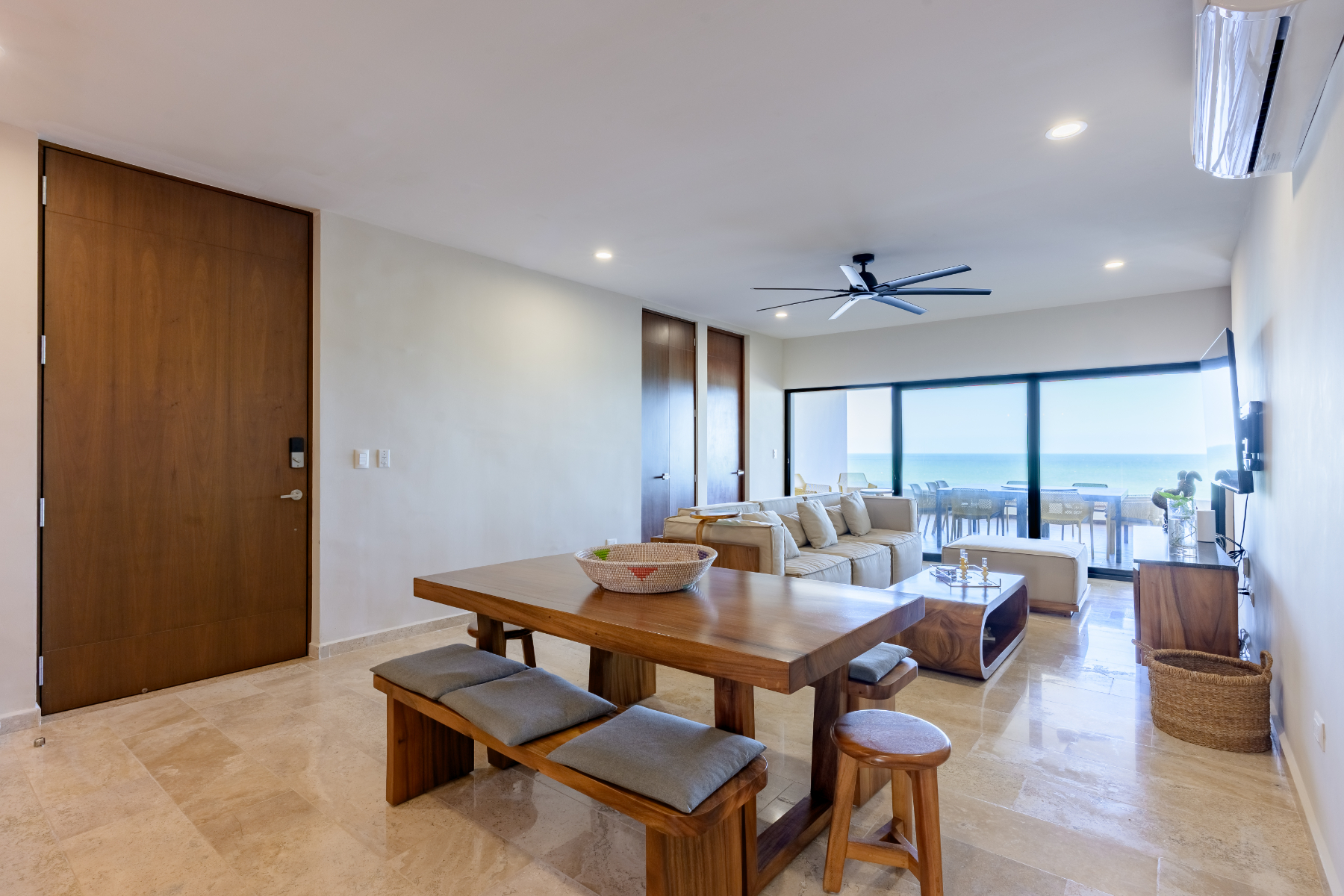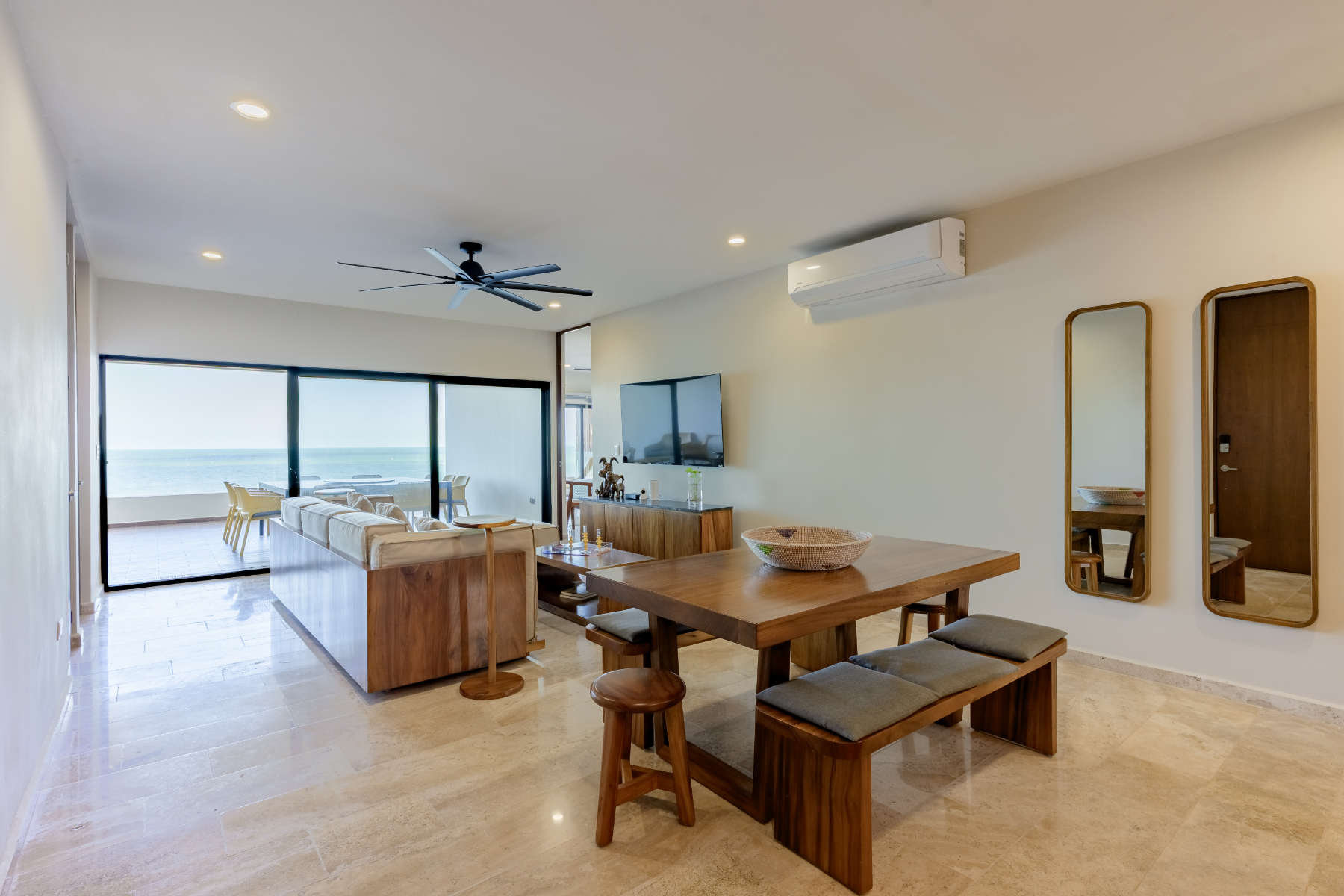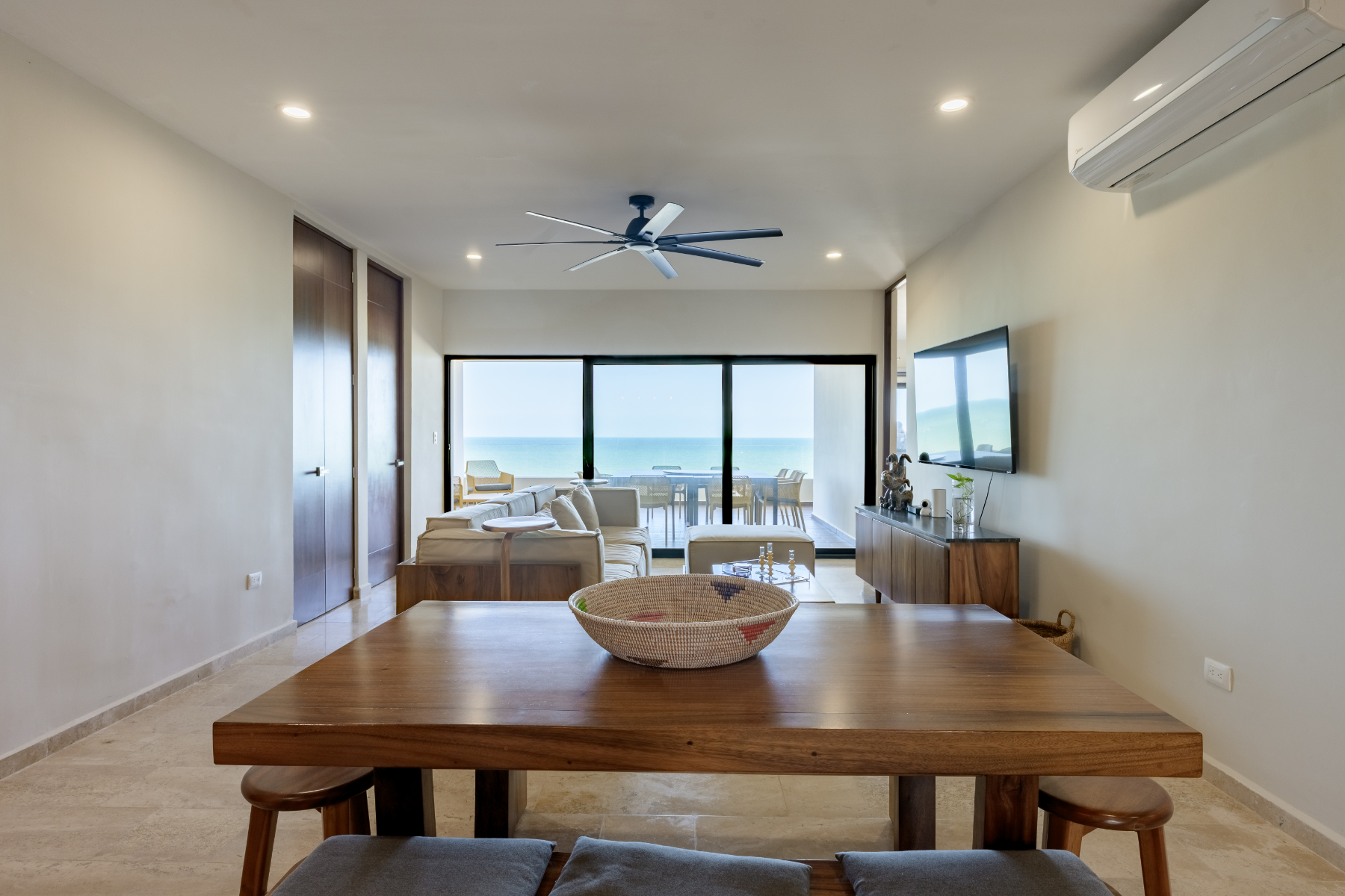 The open-concept living and dining area flows into a spaciously covered terrace, creating a perfect indoor-outdoor experience where ocean views and breezes become part of daily living.