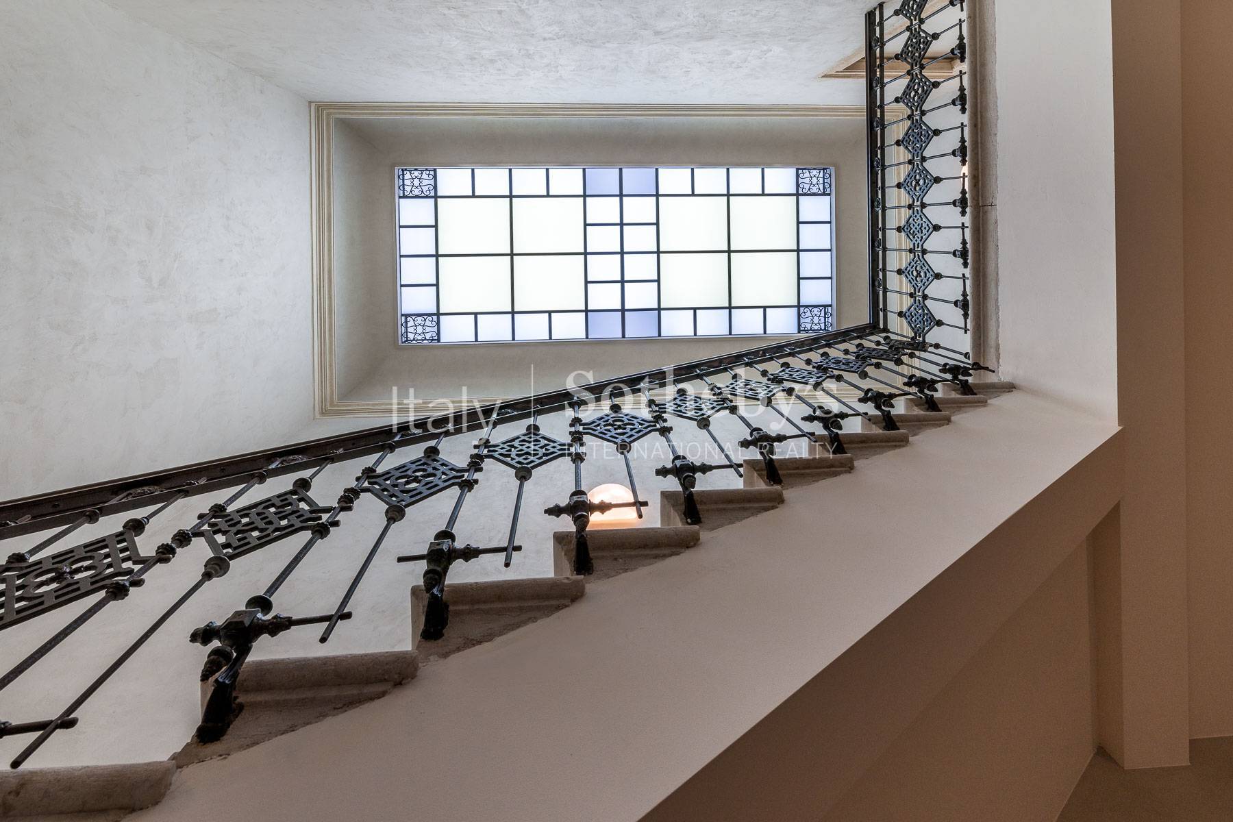 The property, accessible via lift or an impressive period staircase with original wrought-iron balustrade, is arranged over two levels. The entrance opens onto a bright living area with open kitchen, overlooking a spacious internal terrace of over 40 sqm, fully equipped with electricity, gas and water connections-an ideal setting for refined outdoor living and relaxation.