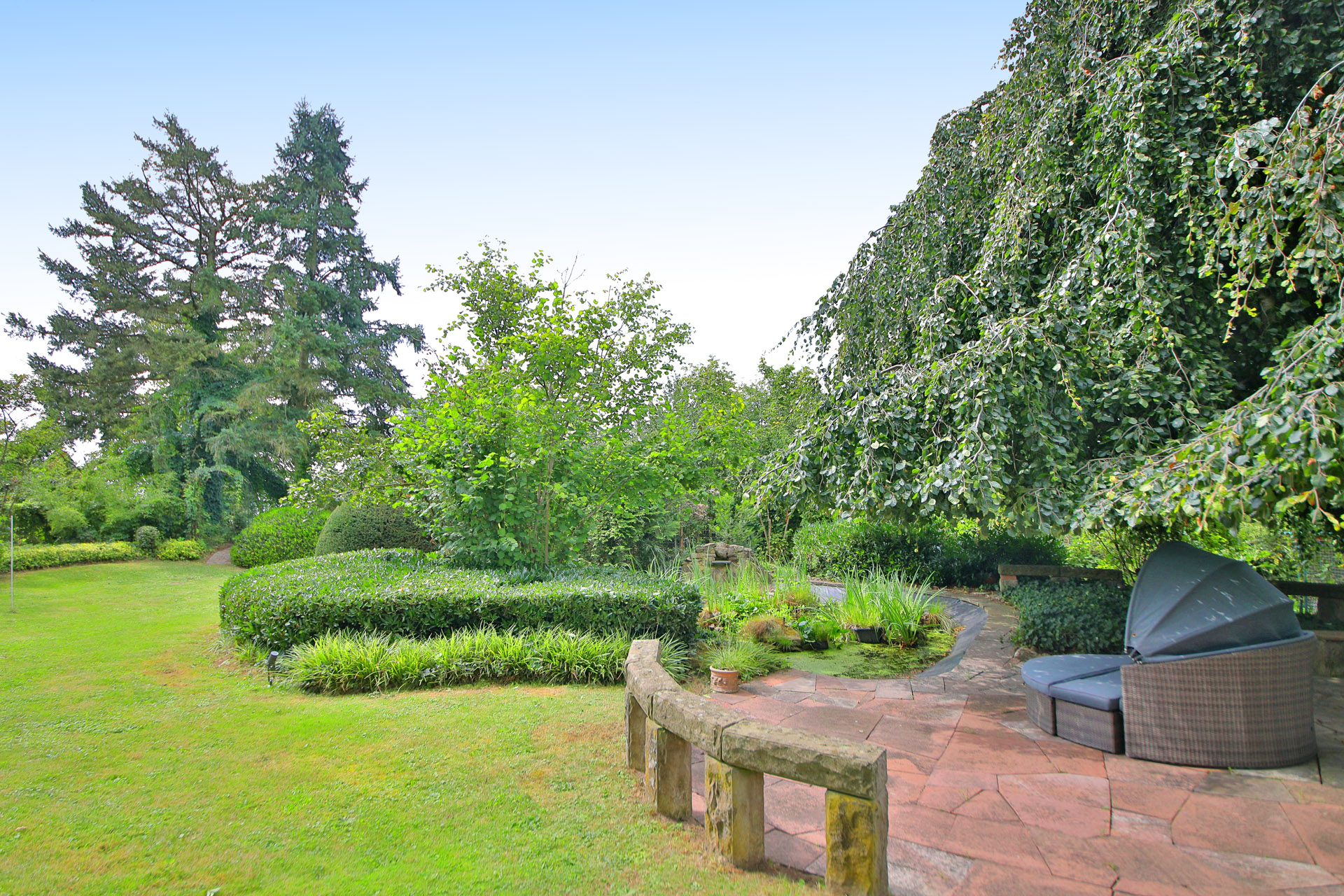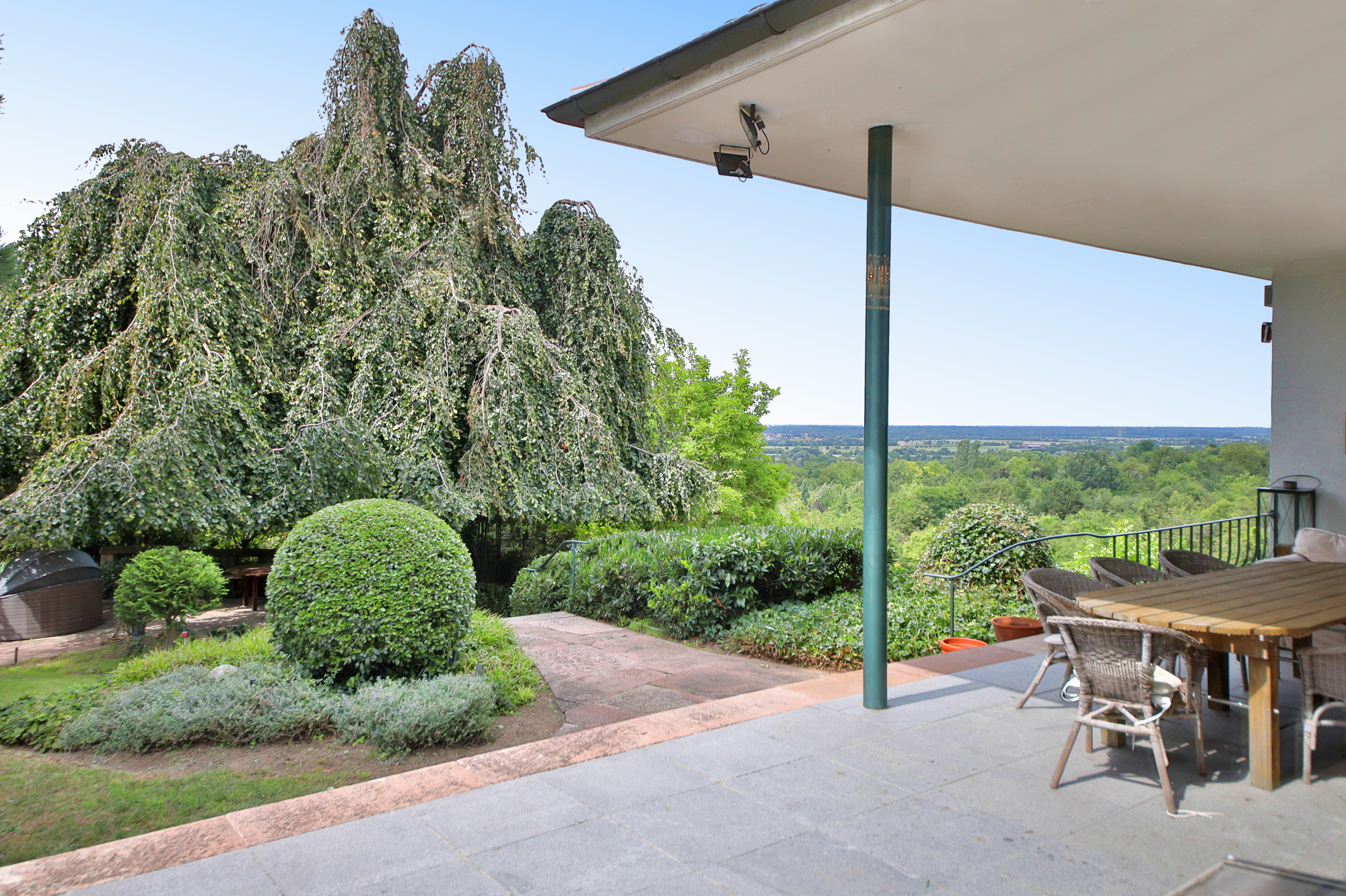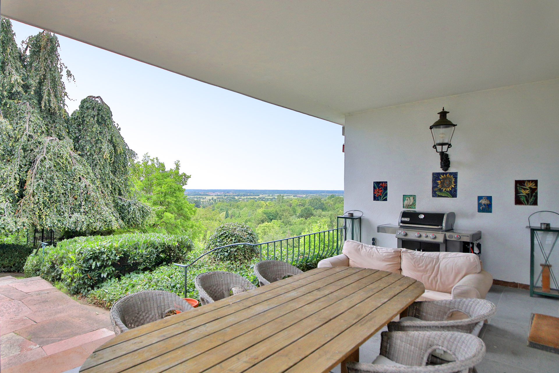A highlight of the property is the idyllic pond, which has been harmoniously integrated into the garden and lends it an additional touch of elegance. The fantastic south-west-facing position and the unobstructed view over the Rhine plain guarantee breathtaking sunsets and an exceptional quality of life.
