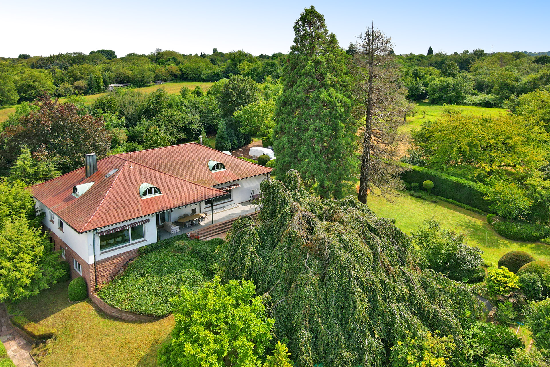 This exceptional property offers a unique opportunity for discerning buyers looking for something special. Built in 1957, the entrepreneurial villa exudes the timeless charm of the 1950s and was constructed on a spacious, park-like plot. The extensive grounds impress with mature trees and a lovingly designed, high-quality garden that invites you to linger.