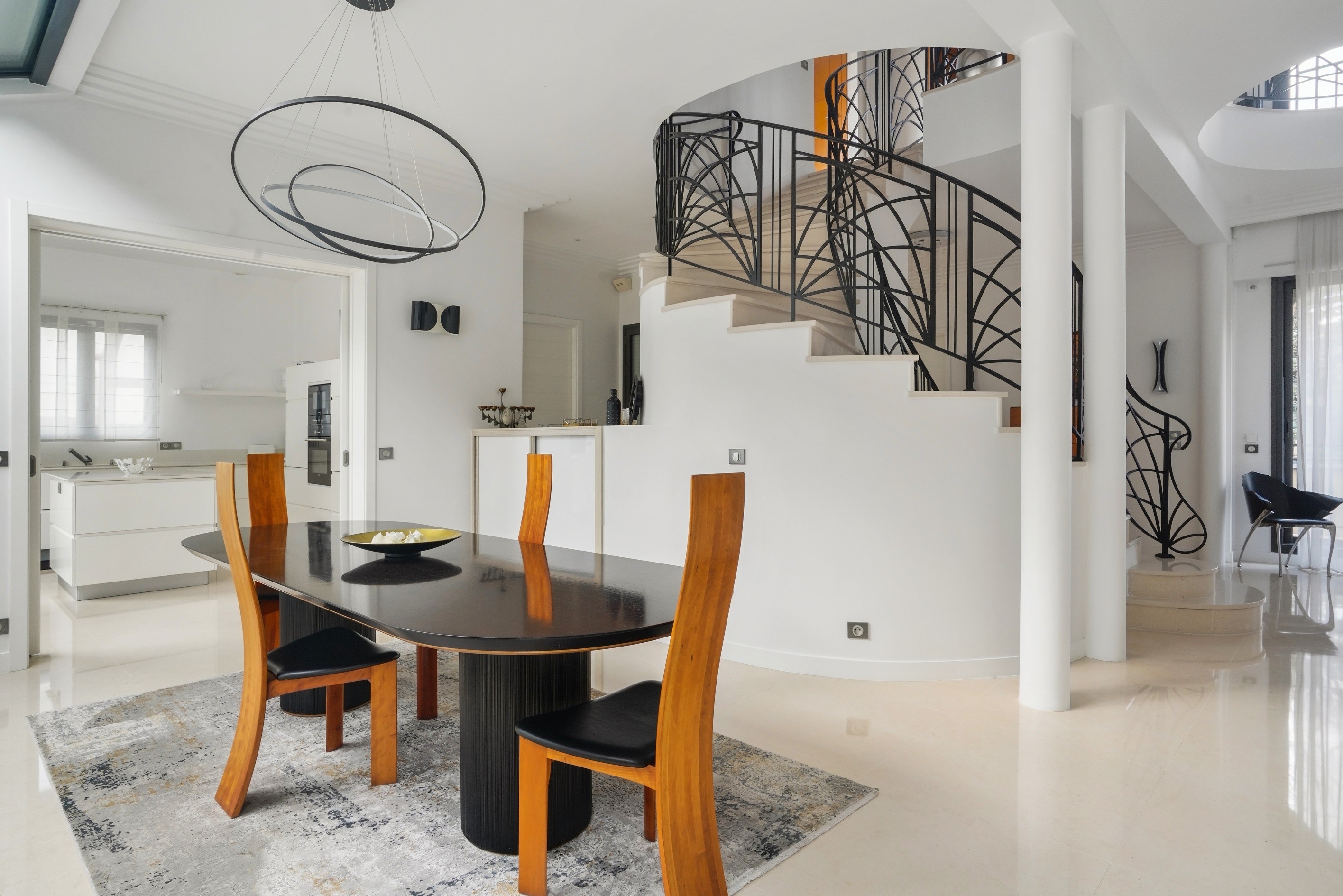 Sotheby’s International Realty Paris Ouest presents an exceptional contemporary residence, nestled in the heart of the prestigious La Varenne-Saint-Hilaire district. Located just steps from the idyllic banks of the Marne, this property offers nearly 300 m² of refined living space, where sleek architectural lines meet masterful volumes. The soul of this home is a majestic 90 m² reception hall, partially crowned by a breathtaking glass canopy. Bathed in natural light, this space offers a seamless flow between the formal lounge and the dining area, creating an ambiance of effortless sophistication. The ground floor also features a high-end kitchen and a spacious primary suite that opens directly onto a sun-drenched terrace. This sanctuary includes a spa-inspired bathroom with a whirlpool tub, a walk-in Italian shower, and a bespoke dressing room of palatial proportions. The upper floor is dedicated to peace and serenity, comprising four beautifully appointed bedrooms, including two junior suites. Each benefits from private access to solarium terraces, offering elevated views of the verdant surroundings. Three additional premium bathrooms ensure ultimate comfort for family and guests alike. The 155 m² basement is designed for the connoisseur, featuring a fitness studio, an expansive games room, and a temperature-controlled wine cellar for your finest vintages. A secure internal garage with capacity for up to six vehicles completes this villa.