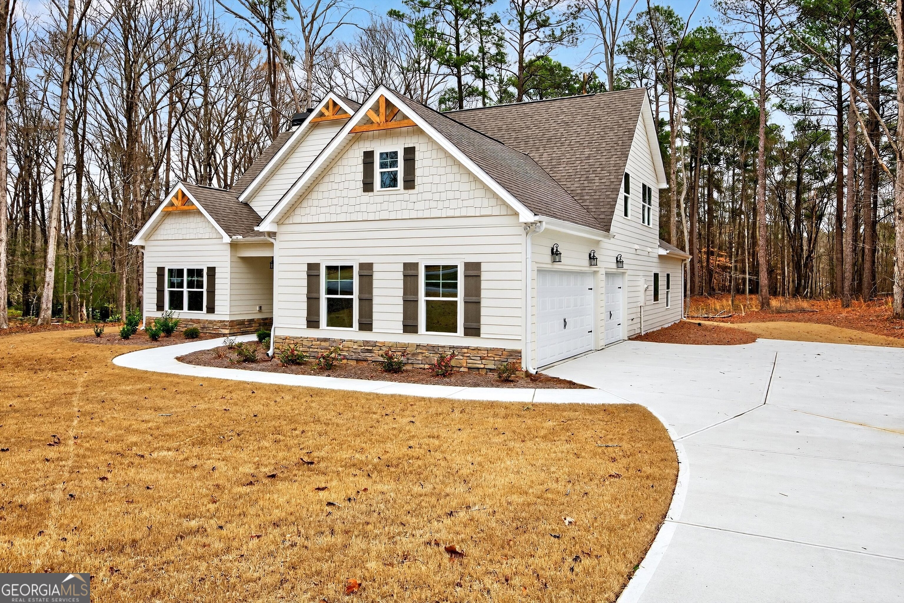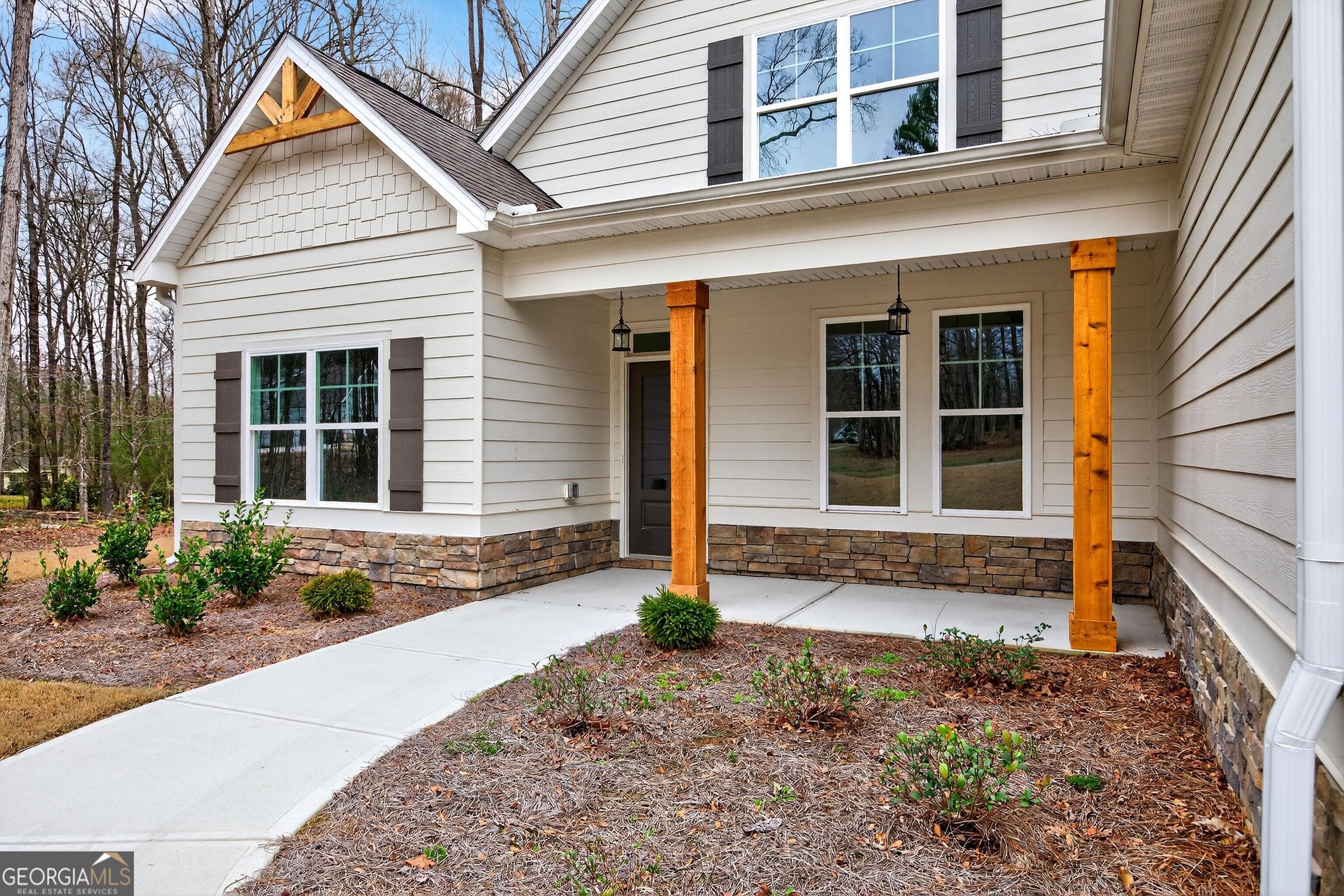 Situated on a 1.6-acre lot, the Grovetown Plan by Dustin Shaw Homes blends charm with thoughtful design. A welcoming front porch opens to a spacious, open layout ideal for both everyday living and entertaining. The formal dining room flows seamlessly into a bright kitchen featuring granite countertops, tile flooring, stainless steel appliances, custom cabinetry, and a generous pantry. The main level includes a private primary suite with dual walk-in closets, along with a secondary bedroom and full bath,perfect for guests or flexible living. Hardwood floors extend throughout the foyer, dining room, kitchen, breakfast area, and great room, adding warmth and character. Step outside to a covered porch overlooking a private backyard, creating the perfect setting for relaxing or entertaining.Upstairs offers two additional bedrooms and a shared full bathroom with dual sinks, along with a versatile bonus/flex space ideal for a media room, office, or playroom. Enjoy the quality and craftsmanship of custom home living at an exceptional value.
