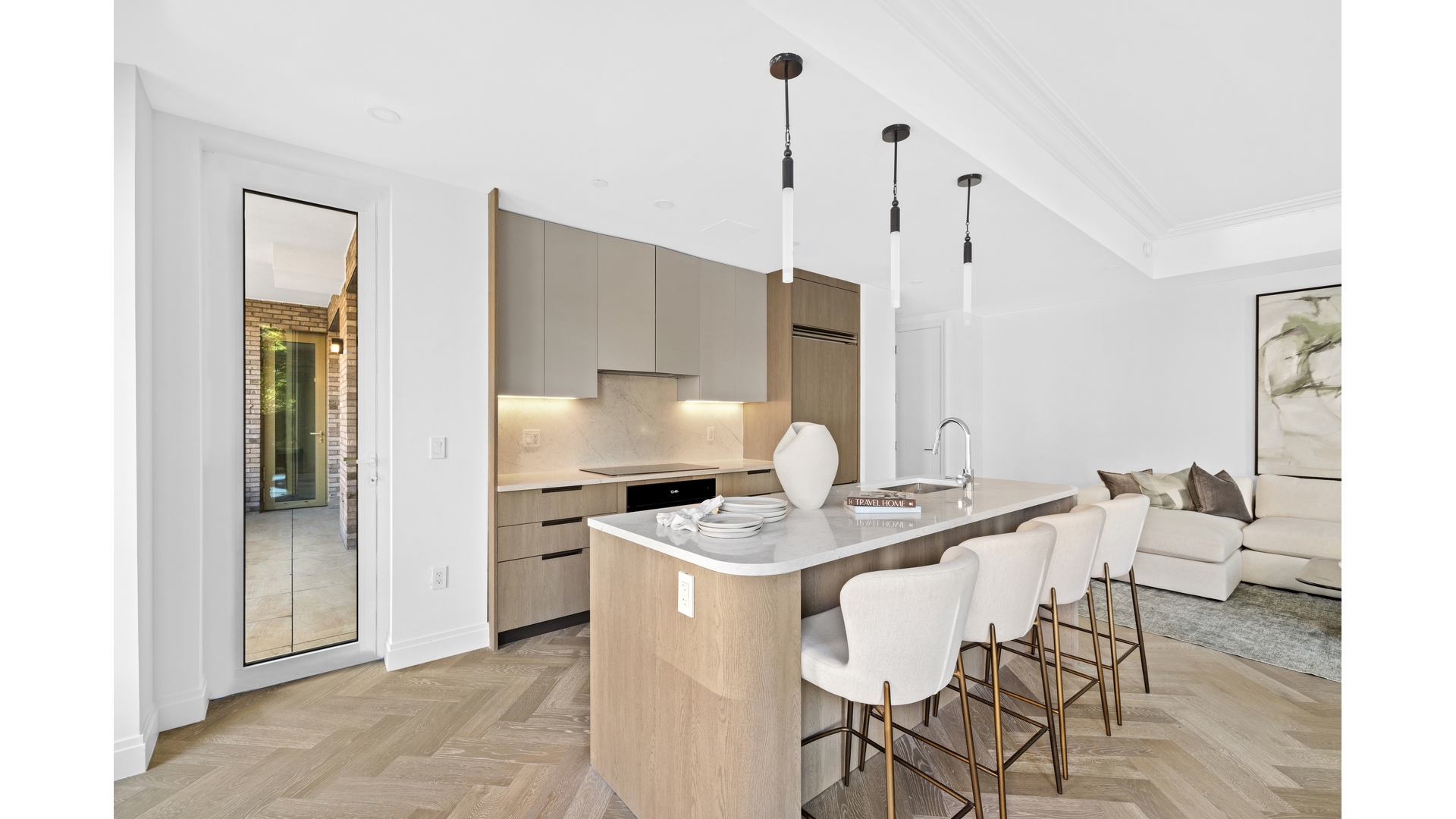 With interiors by Italian design firm S20M, the home begins with a gracious entry foyer and a spacious coat closet, unfolding into a striking living area where oversized, triple-glazed windows - including a distinctive curved corner - flood the space with light, while herringbone white oak floors set an elegant tone. The adjacent private terrace allows for true indoor / outdoor living.