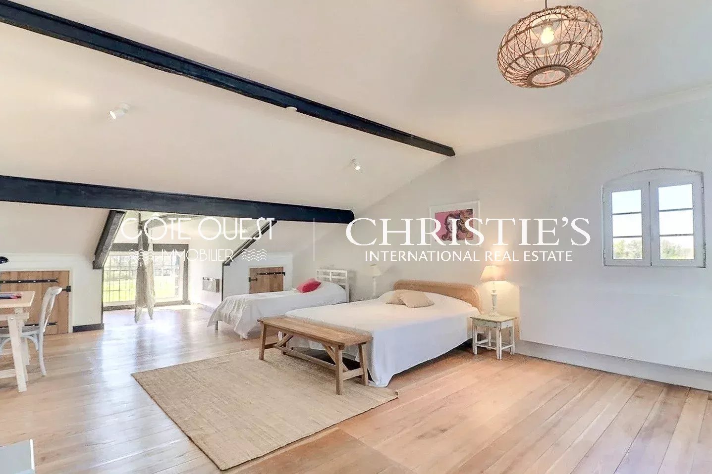 The main farm building of over 350 sqm consists of a large living/dining room opening onto a covered terrace of 40 sqm and a heated pool without vis-à-vis. This ground floor also offers a fully equipped 25 sqm kitchen, a 31 m² master room with an adjoining shower room, a second bedroom, guest toilets, and a laundry room. The upstairs, served by a landing, includes a bedroom with a private shower room, a master suite, and two other bedrooms, as well as a shower room and toilets. A double garage completes this part of the property.