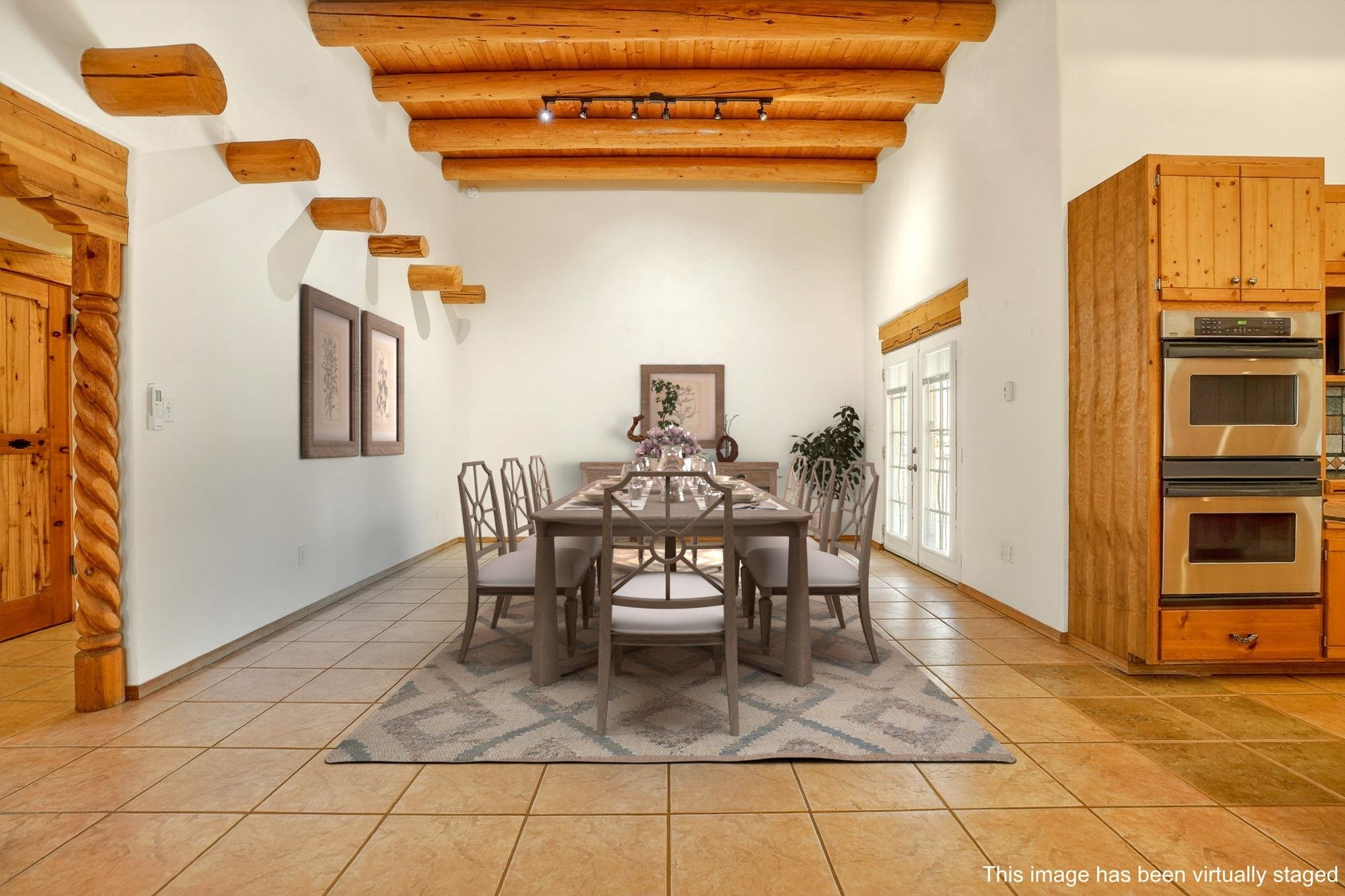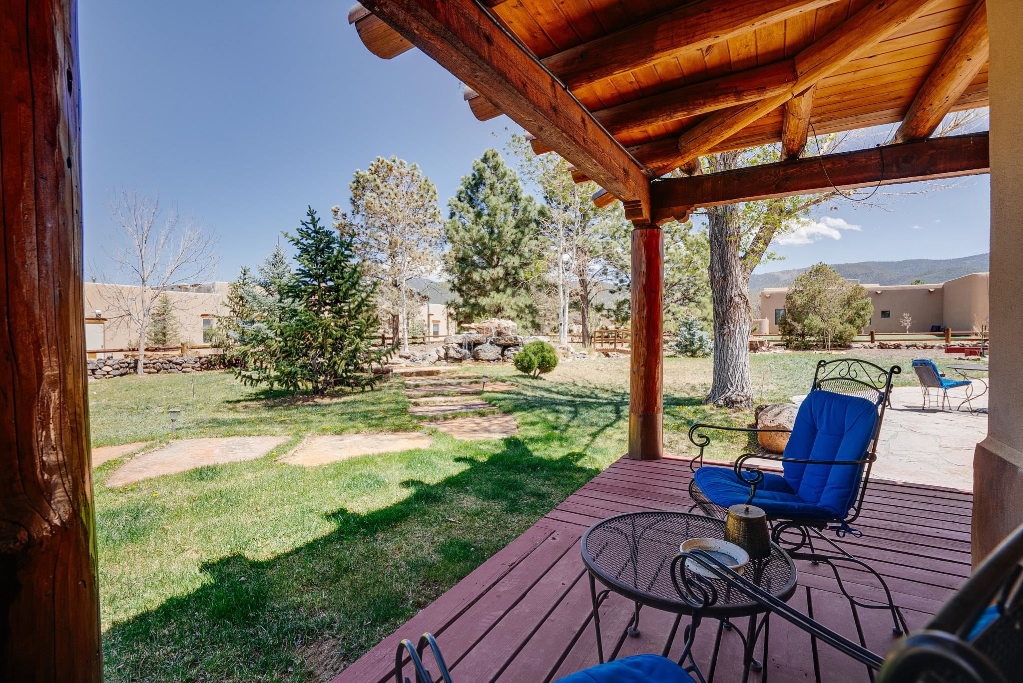 Welcome to this spacious 4-bedroom, 3-bathroom home offering approximately 3,400 square feet of comfort, character, and Southwestern charm in the Vegas De Taos subdivision. Set on a peaceful .68-acre lot, this in-town property combines convenience with a sense of privacy, complete with paved roads, sidewalks, and a welcoming community atmosphere. The beautifully curated grounds feature multiple water features, lush lawn areas, raised garden beds, and a diverse collection of mature trees, including conifers, deciduous varieties, and fruit trees. Enjoy mountain views, big open skies, and a thoughtful blend of low-maintenance xeriscaping in the front with a vibrant backyard retreat. Rock walls and wood fencing create a variety of inviting outdoor spaces, perfect for relaxing or entertaining. Inside, the grand great room impresses with 14-foot vaulted ceilings, custom woodwork, and radiant floor heating, complemented by efficient split units for year-round comfort. French doors off the dining area open to a generous covered veranda, ideal for indoor-outdoor living. The kitchen is designed for both function and gathering, featuring stainless steel appliances, a double oven, a smooth-surface cooktop on the island, a 3-basin sink, and a large island with seating for up to eight. A formal dining room offers additional space for hosting. The west wing includes two guest bedrooms, a spacious full bathroom, and a private primary suite with hickory Pergo flooring, a sitting area or office nook, a whirlpool tub, a separate shower, and an oversized walk-in closet. The east wing offers an additional bedroom, a guest bath, a large pantry, hall storage, and a laundry room with access to the covered breezeway and detached two-car garage. Located just minutes from downtown Taos, the hospital, and local amenities, this property offers a rare combination of space, comfort, and a true in-town homestead feel.