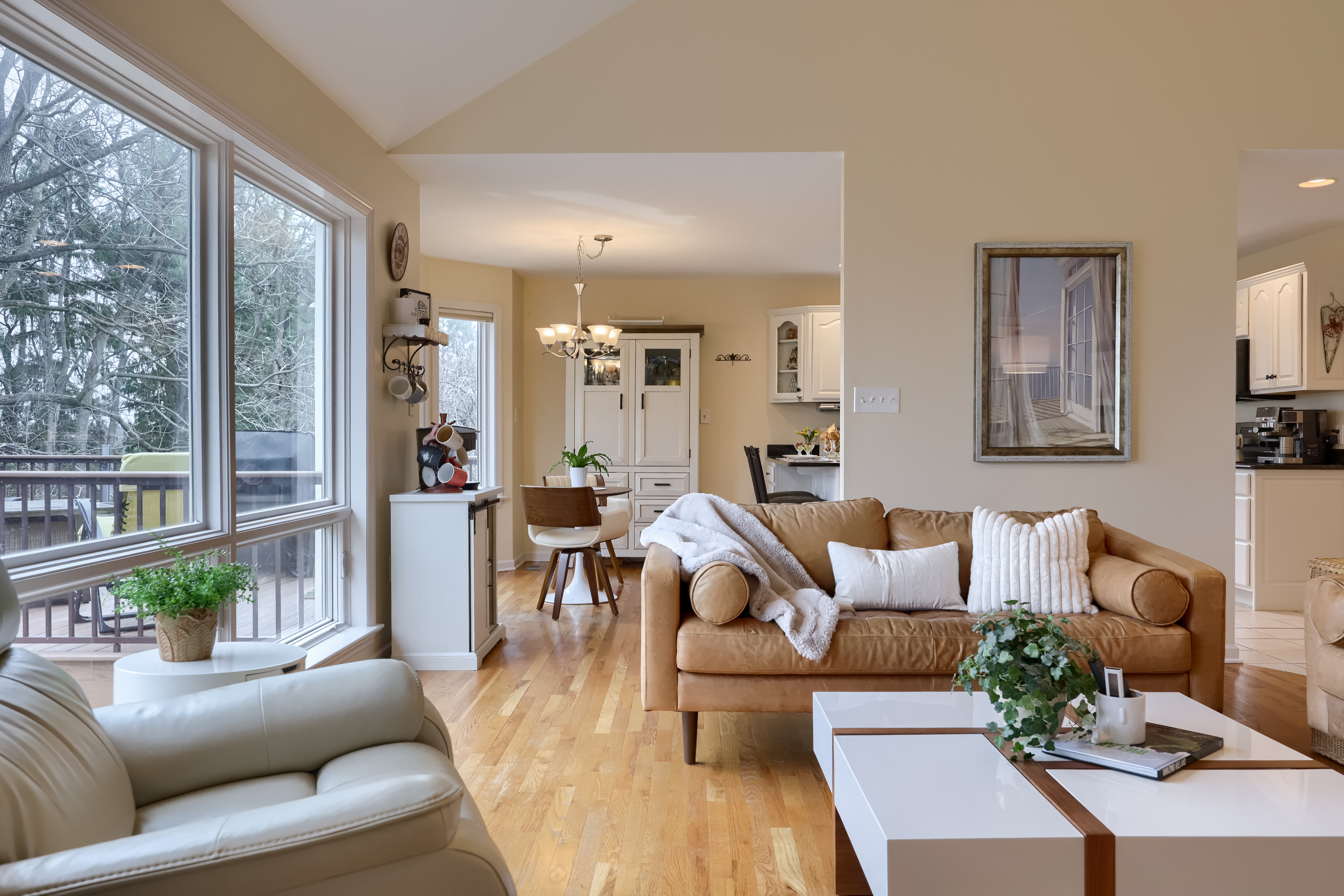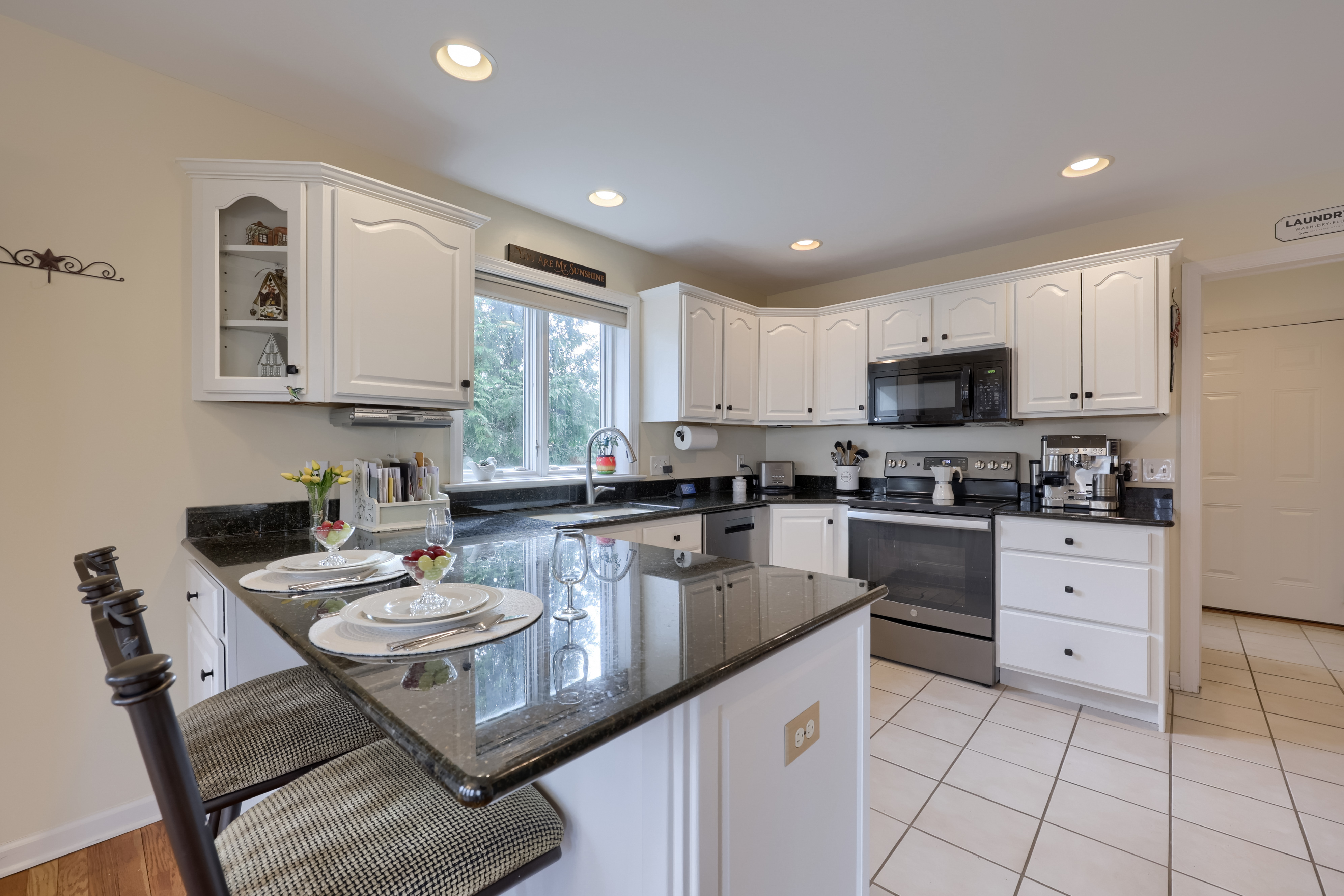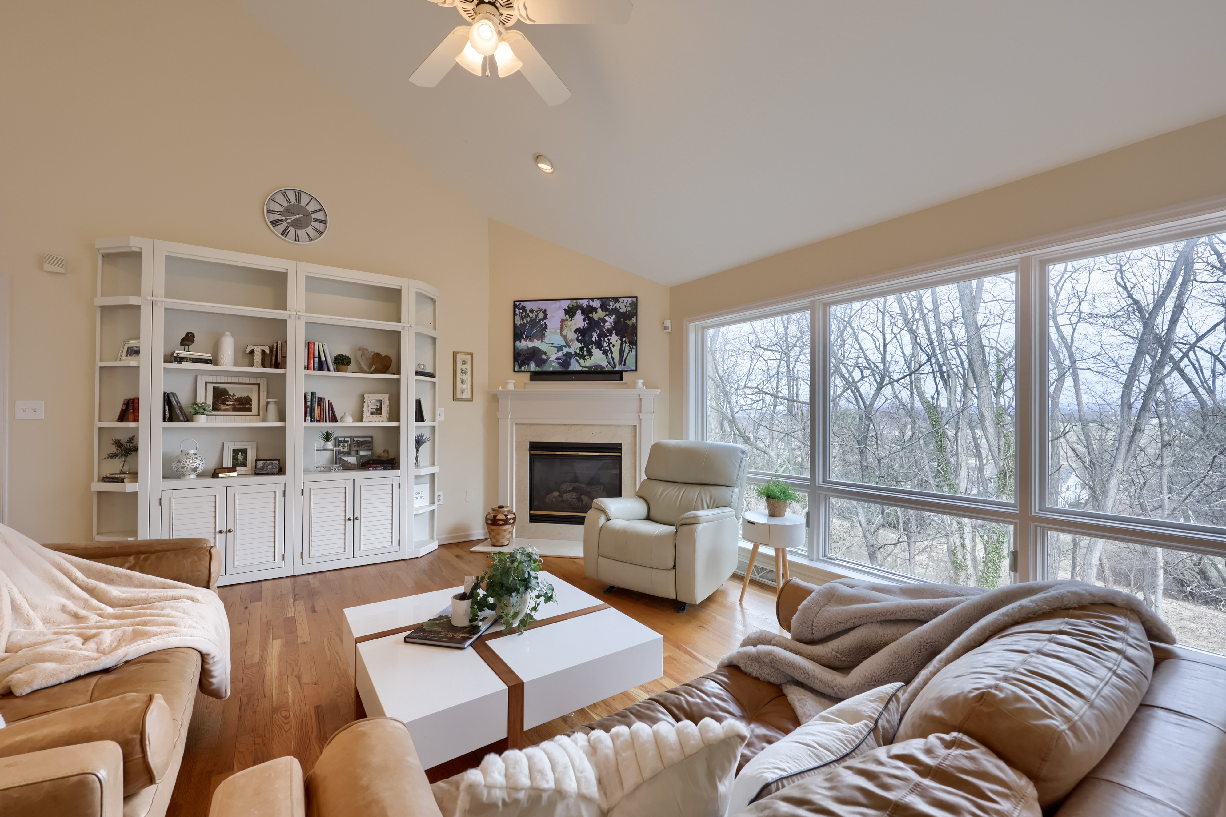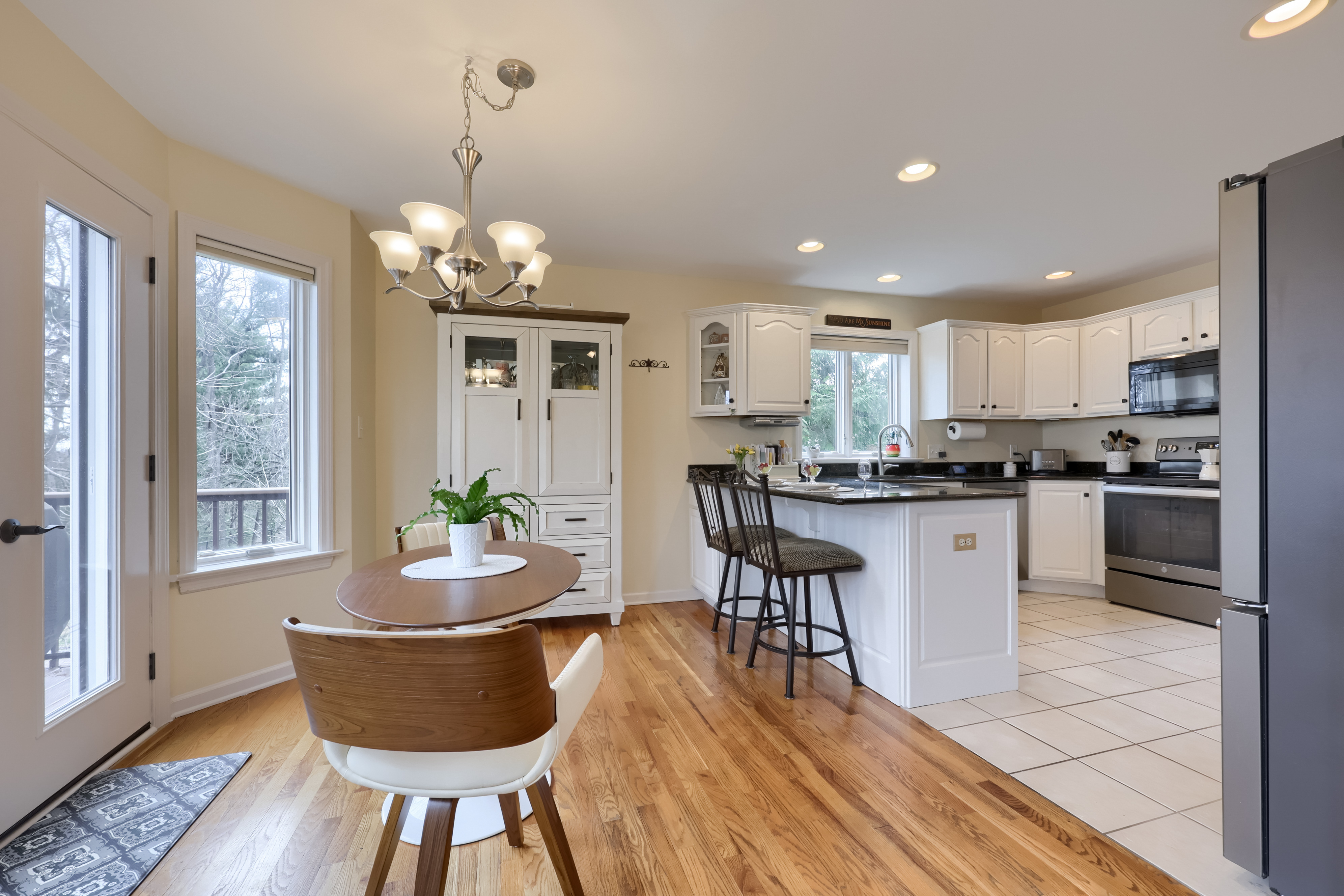 Step inside to find gleaming hardwood floors on the main living area, a dining room with chair rail and crown molding, and an impressive vaulted great room anchored by a cozy gas fireplace and walls of natural light. Rear windows reveal breathtaking views for miles in the winter, while the summertime features serene and private greenery. The inviting eat-in kitchen boasts abundant cabinetry, generous counter space, and an island with seating for two, flowing seamlessly into a bright breakfast area overlooking the wooded rear yard.