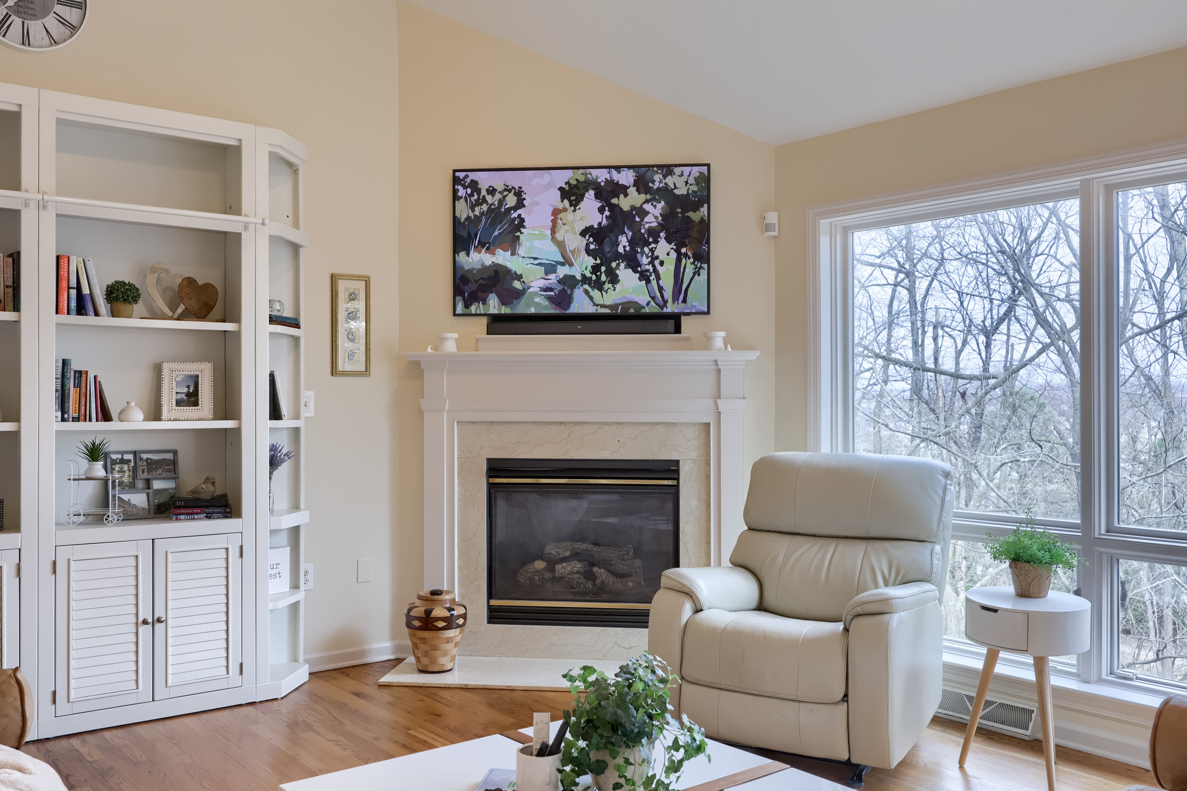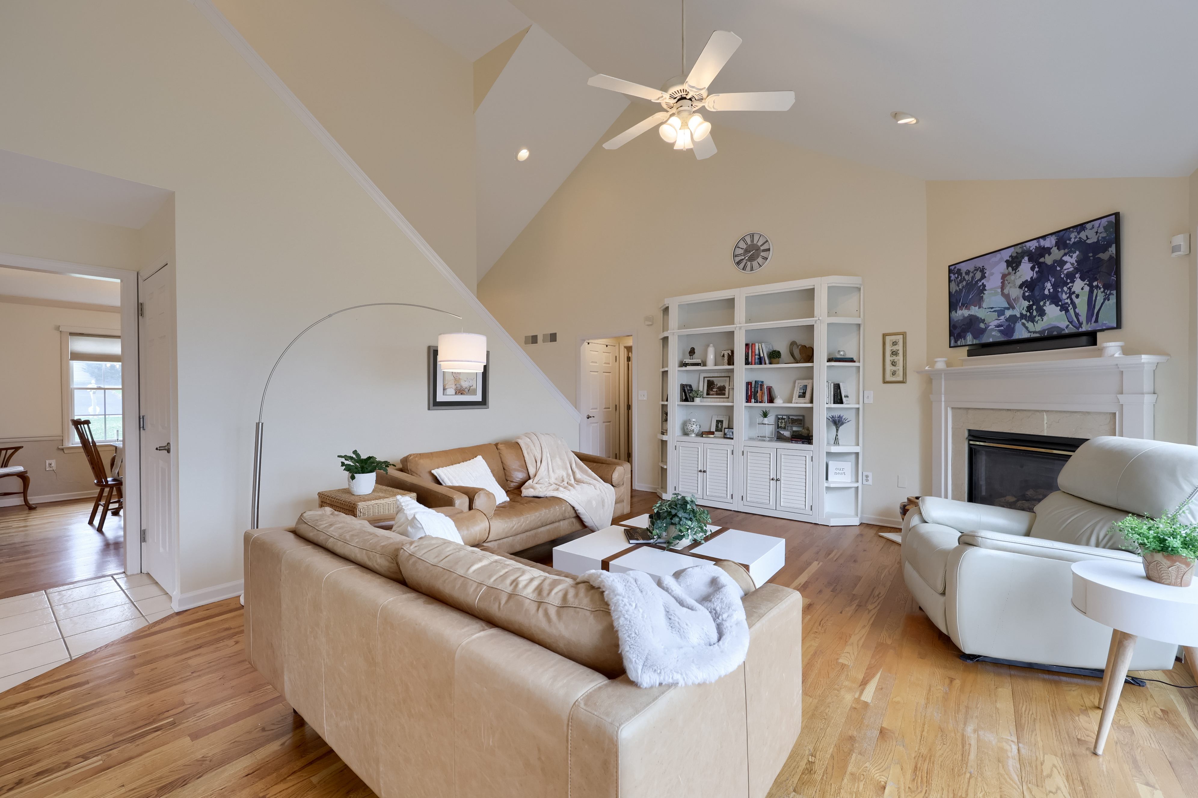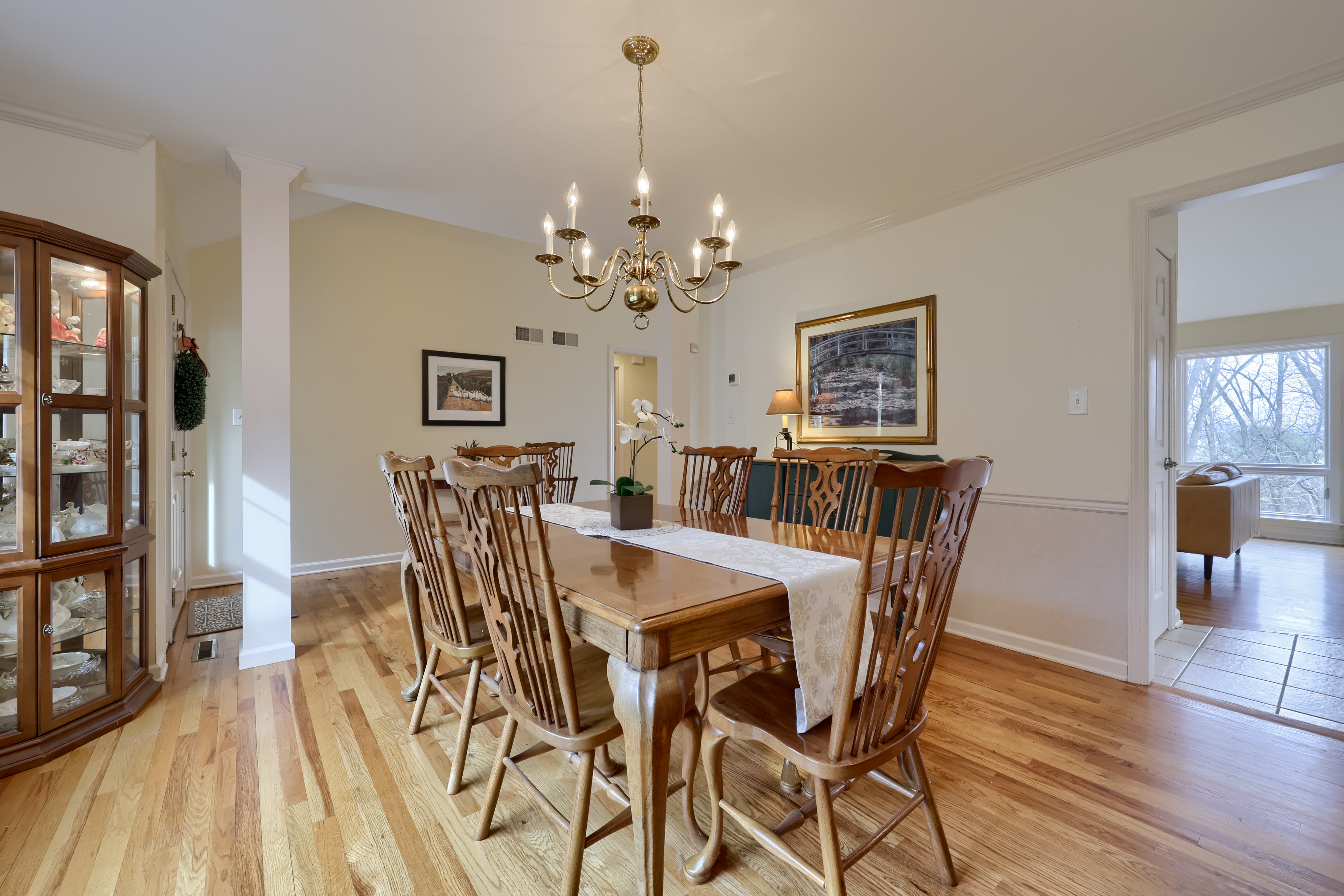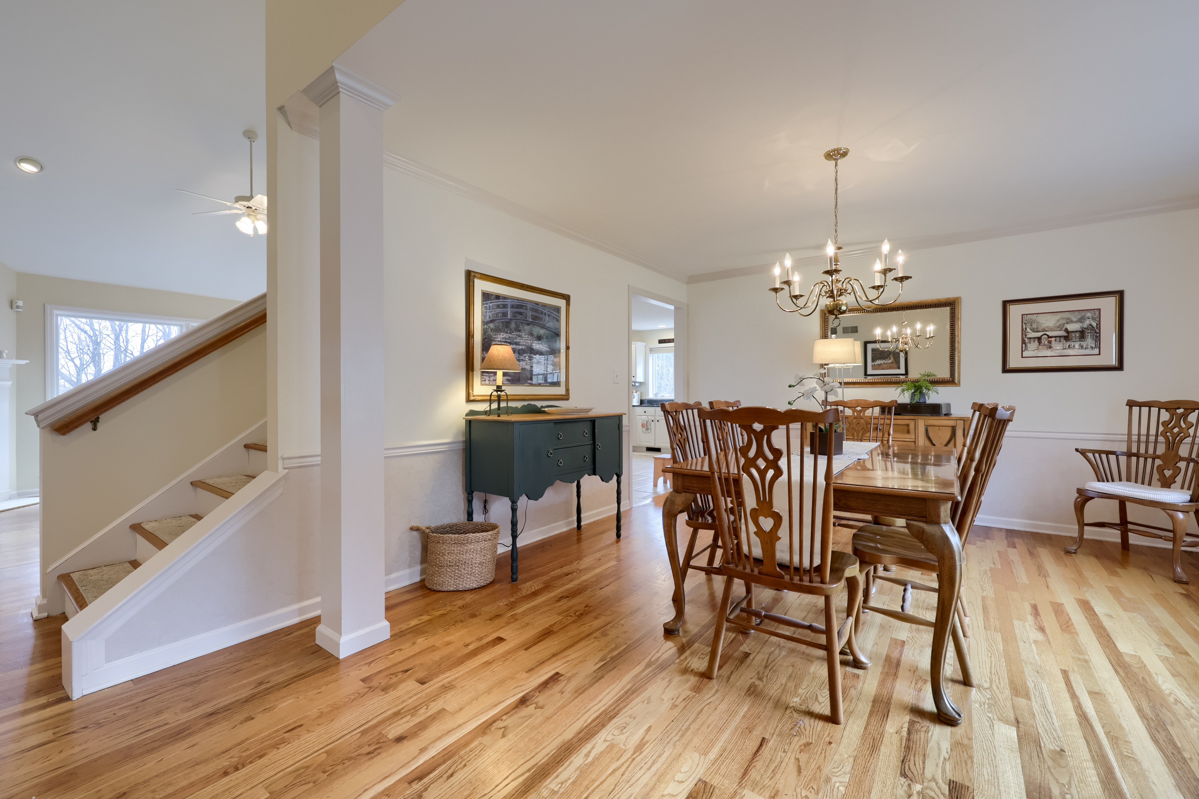 Step inside to find gleaming hardwood floors on the main living area, a dining room with chair rail and crown molding, and an impressive vaulted great room anchored by a cozy gas fireplace and walls of natural light. Rear windows reveal breathtaking views for miles in the winter, while the summertime features serene and private greenery. The inviting eat-in kitchen boasts abundant cabinetry, generous counter space, and an island with seating for two, flowing seamlessly into a bright breakfast area overlooking the wooded rear yard.