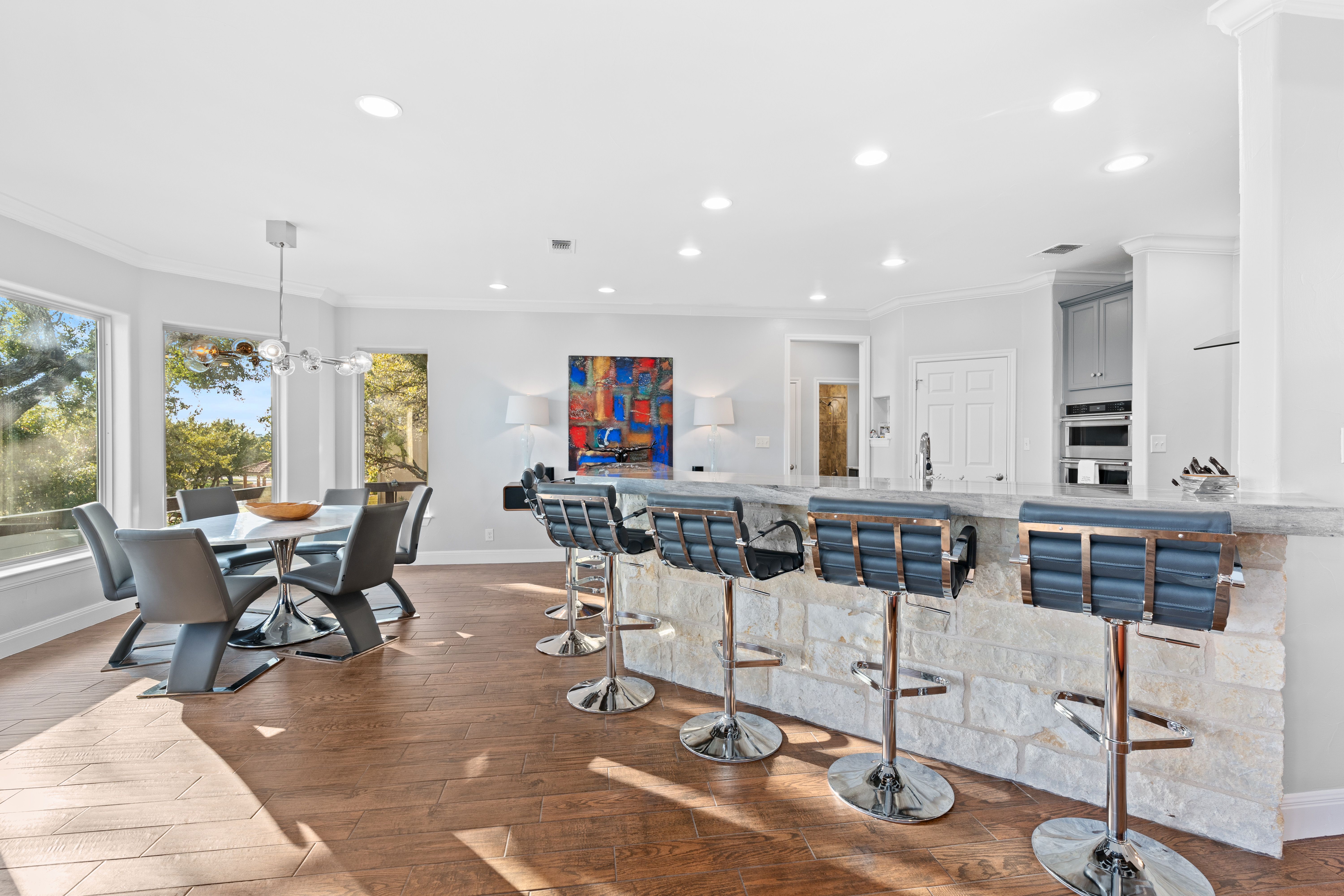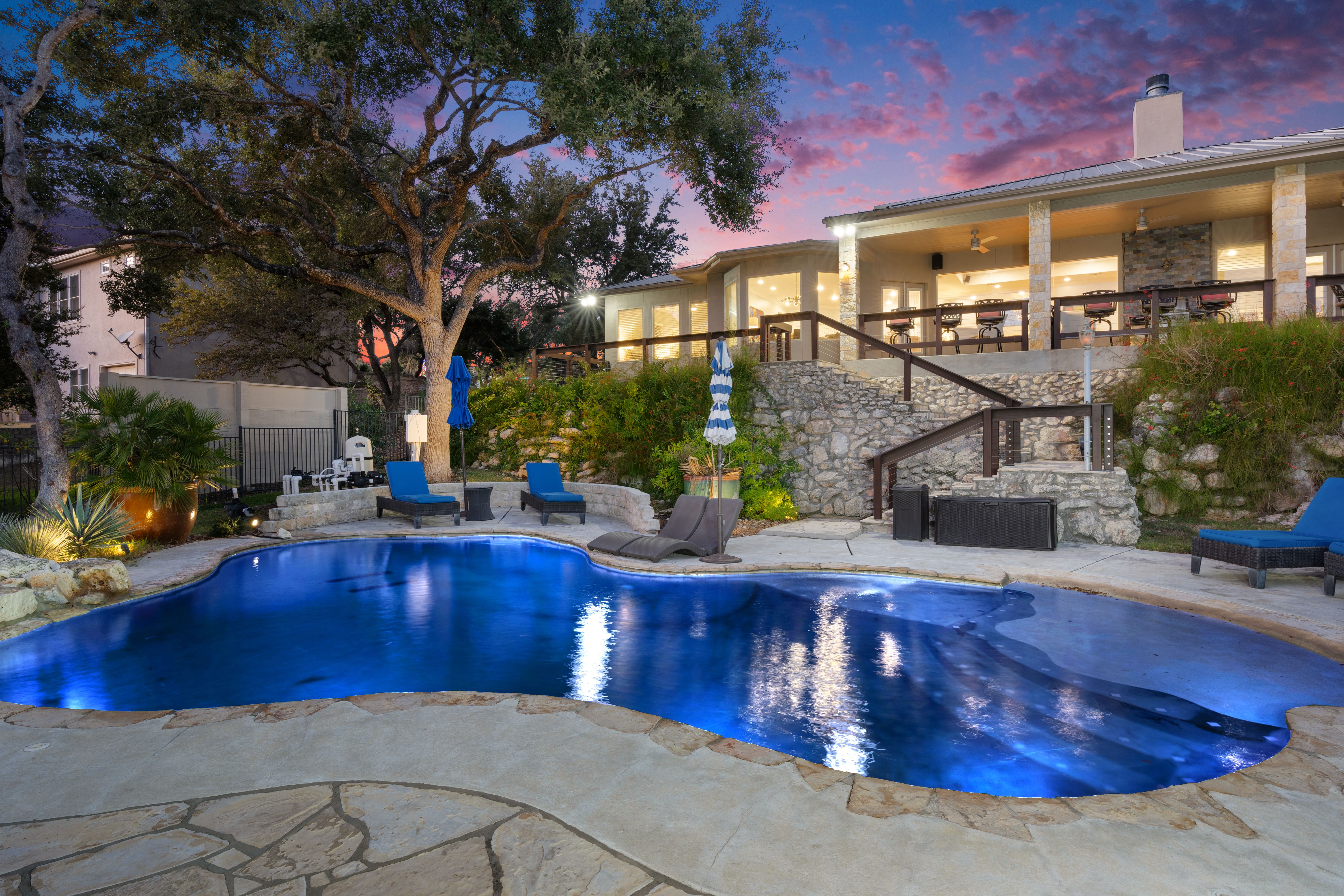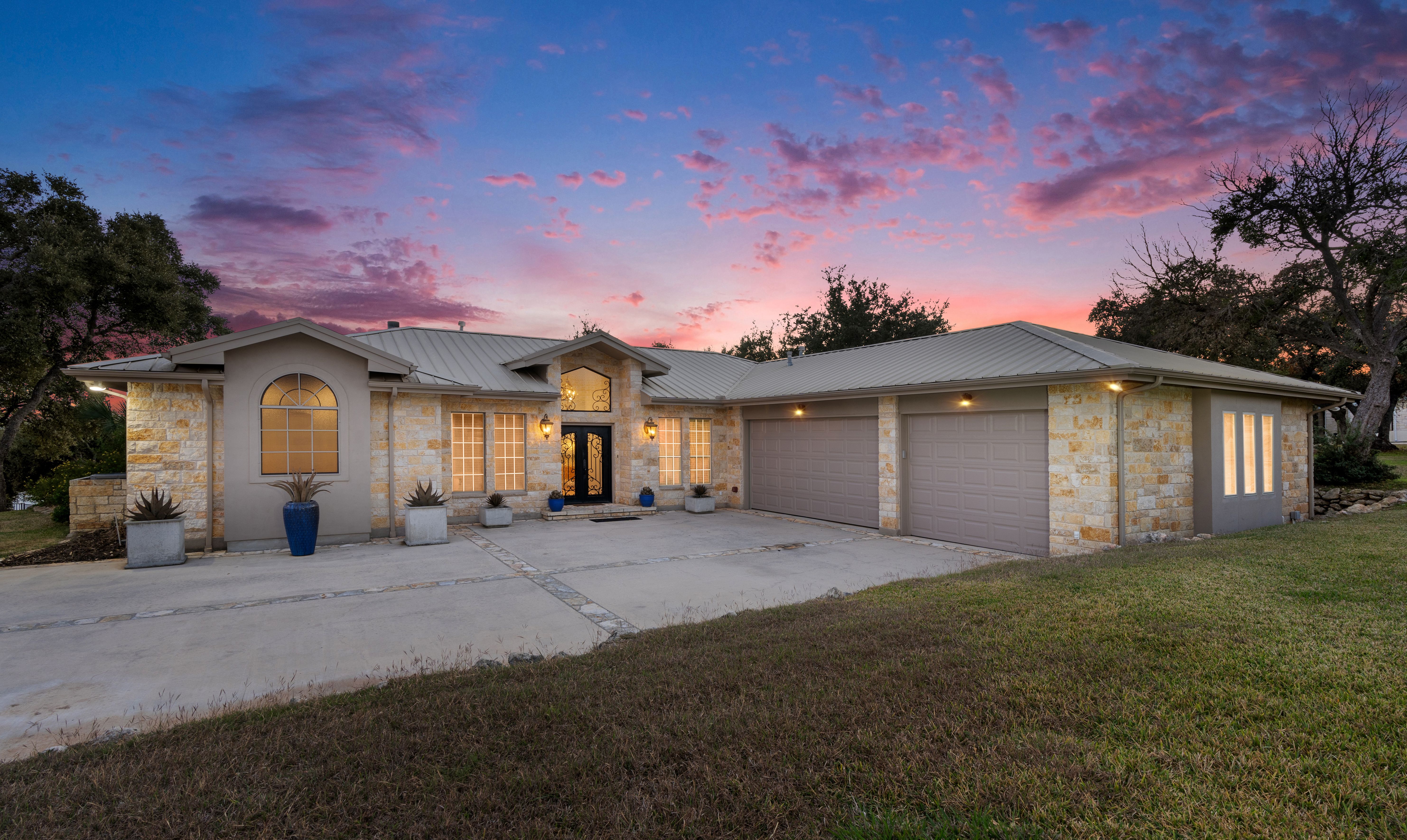 Welcome to your lake-view retreat on a rare double lot, where resort-style outdoor living and move-in ready updates come together to create the ultimate Canyon Lake lifestyle. Recently remodeled and designed for modern living, this open-concept home features a beautifully updated kitchen with generous workspace, stylish finishes, and seamless flow into the dining and living areas—perfect for everyday living or entertaining guests. With 4 spacious bedrooms, 2.5 baths, and a dedicated home office, this home supports today’s remote work and flexible living needs. The primary suite offers a private escape with double vanities, walk-in shower, freestanding soaking tub, and French doors leading directly to the outdoor living space. Step outside to experience what today’s buyers are searching for—a private backyard oasis featuring a luxury in-ground pool, expansive covered patio, and breathtaking lake views from multiple vantage points. Whether hosting gatherings or enjoying peaceful evenings, this home delivers true indoor-outdoor living. Additional highlights include three-car garage, high ceilings, mature trees, water access, and no city taxes, making this property both functional and lifestyle-driven. Ideally located with convenient access to both Austin and San Antonio, it's the perfect blend of lake living, modern comfort, and everyday convenience.