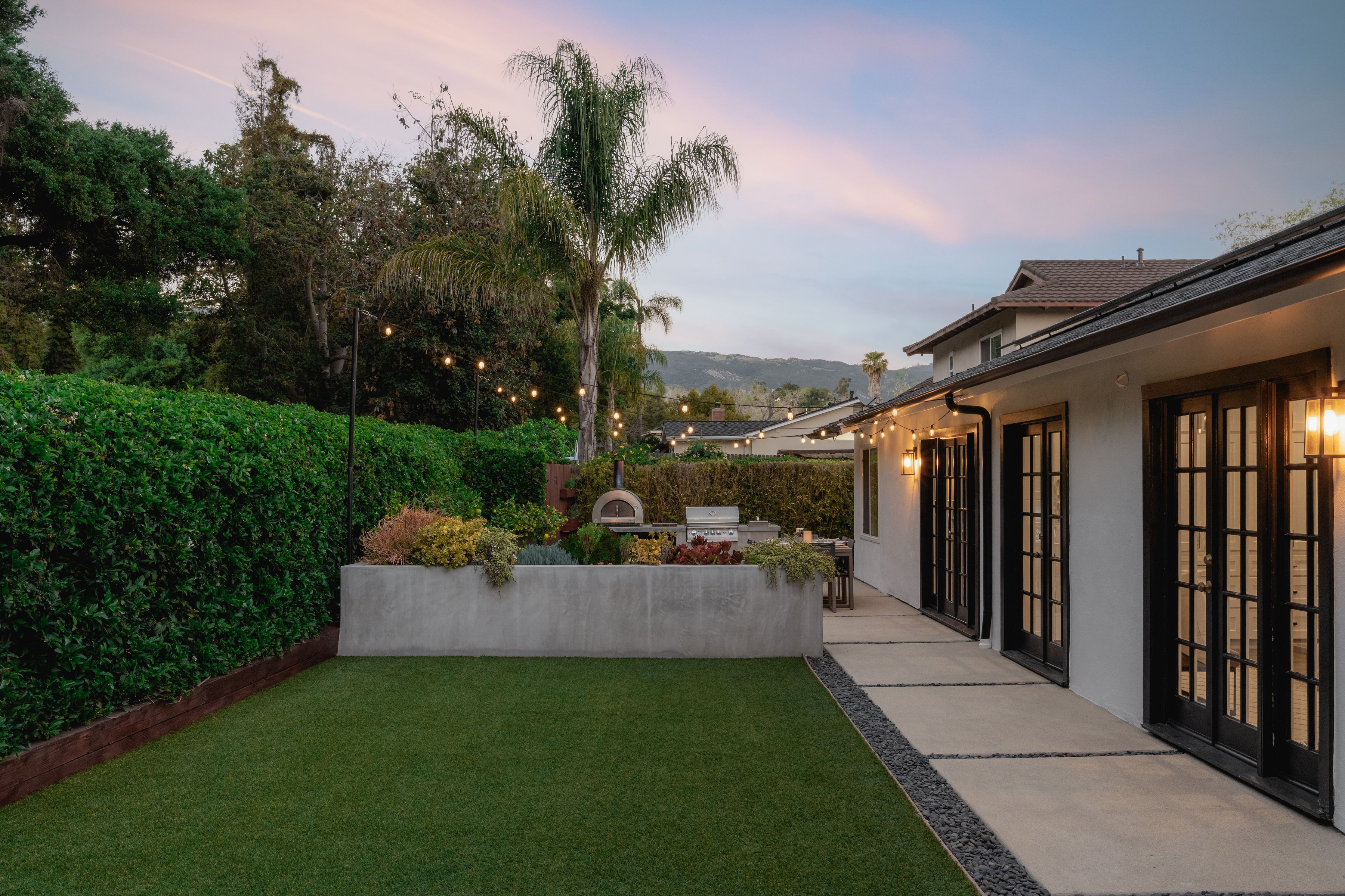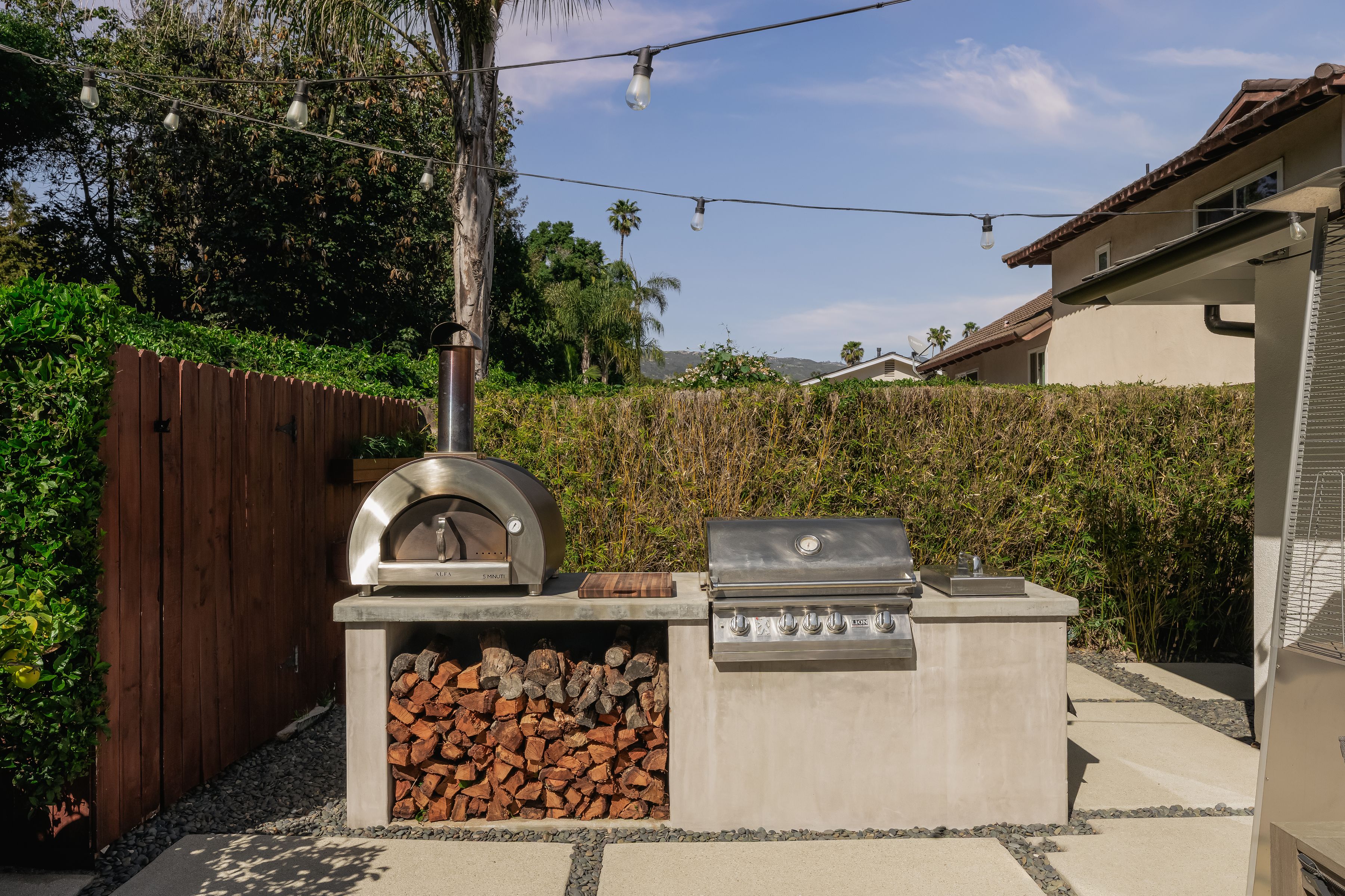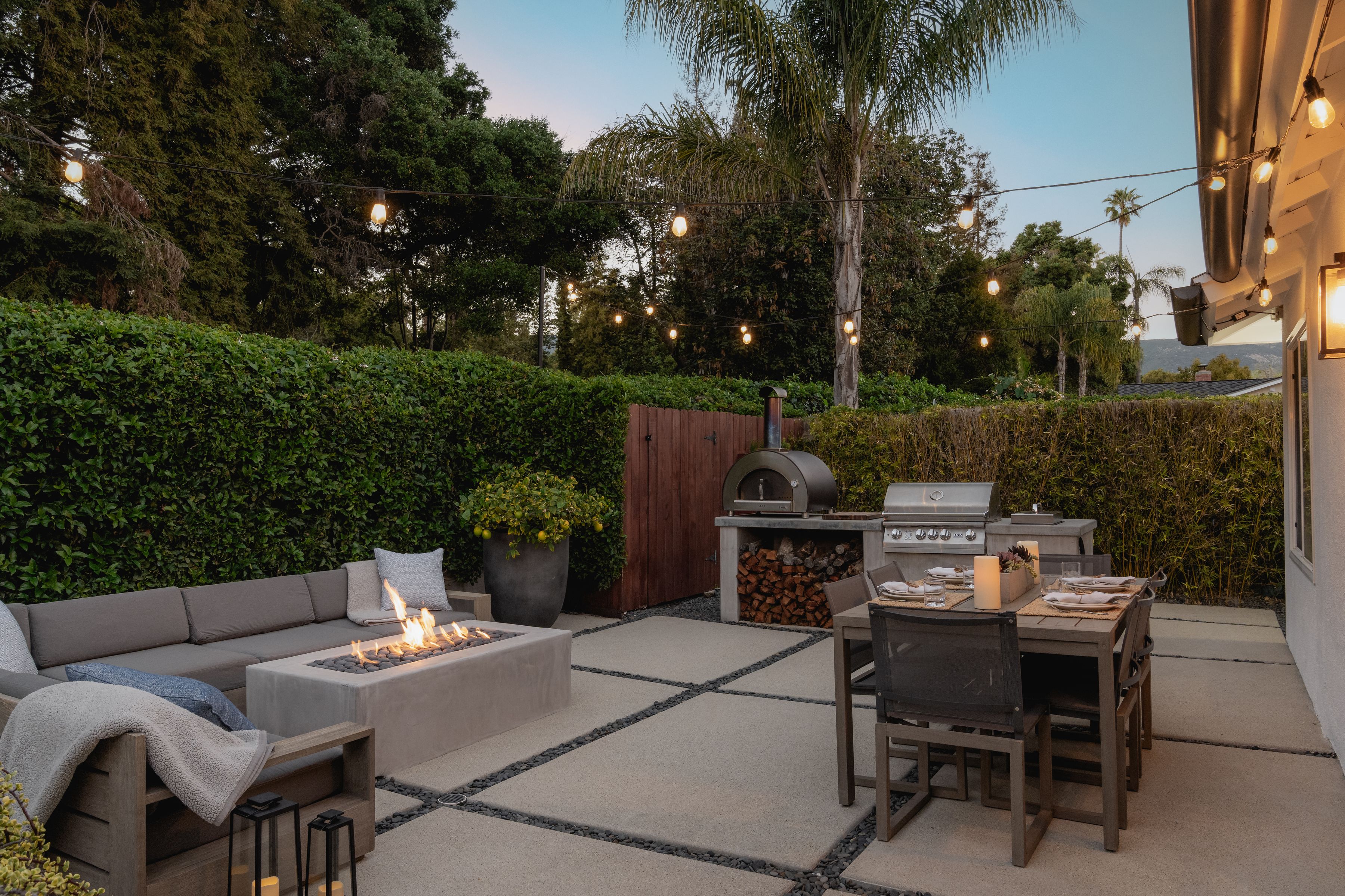 French doors open to a beautifully redesigned backyard retreat that reflects the spirit of the Santa Barbara coastal lifestyle. A gourmet outdoor kitchen with wood-fired pizza oven and gas grill anchors the space, complemented by a fire pit lounge—creating an inviting setting for entertaining and relaxed evenings outdoors.