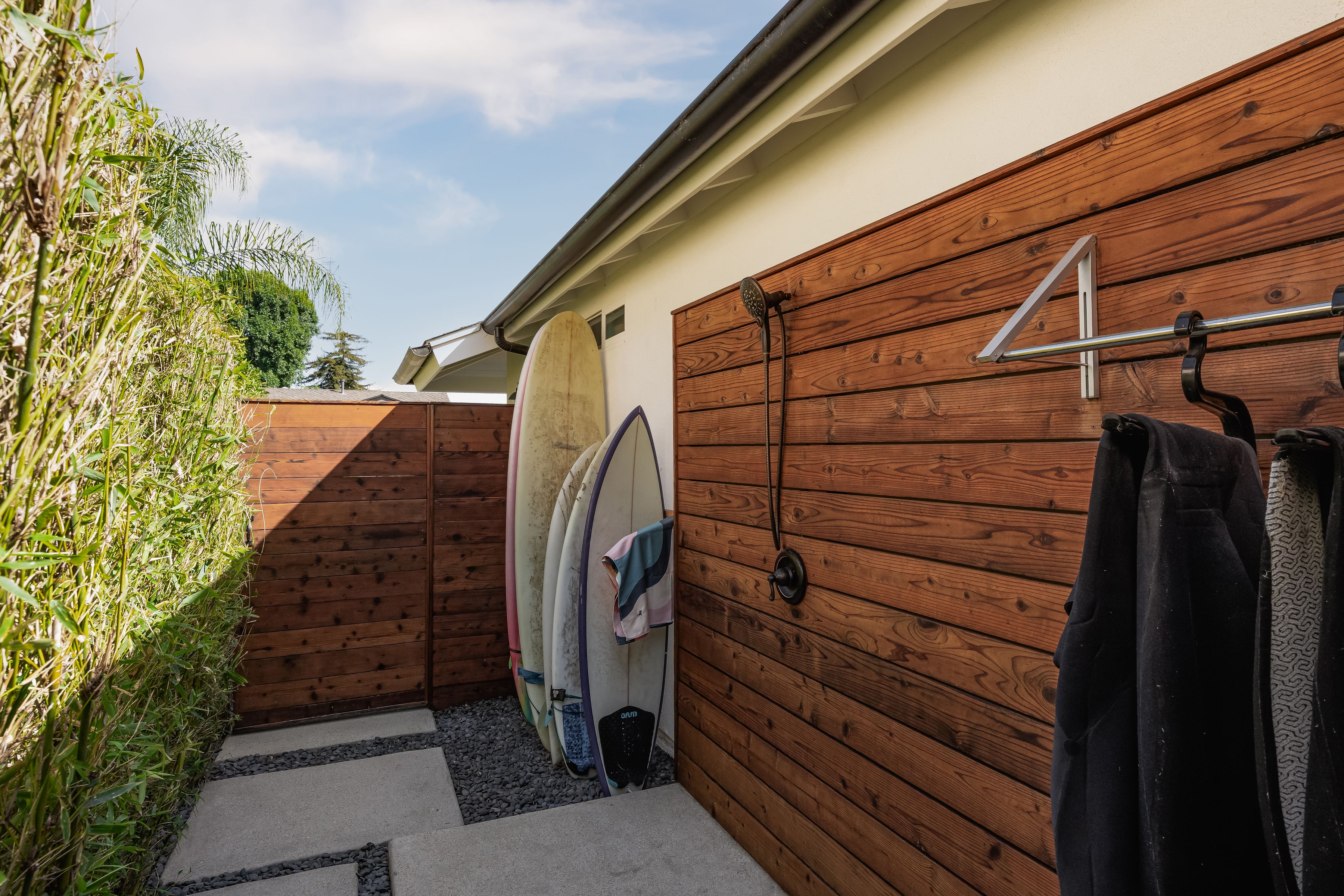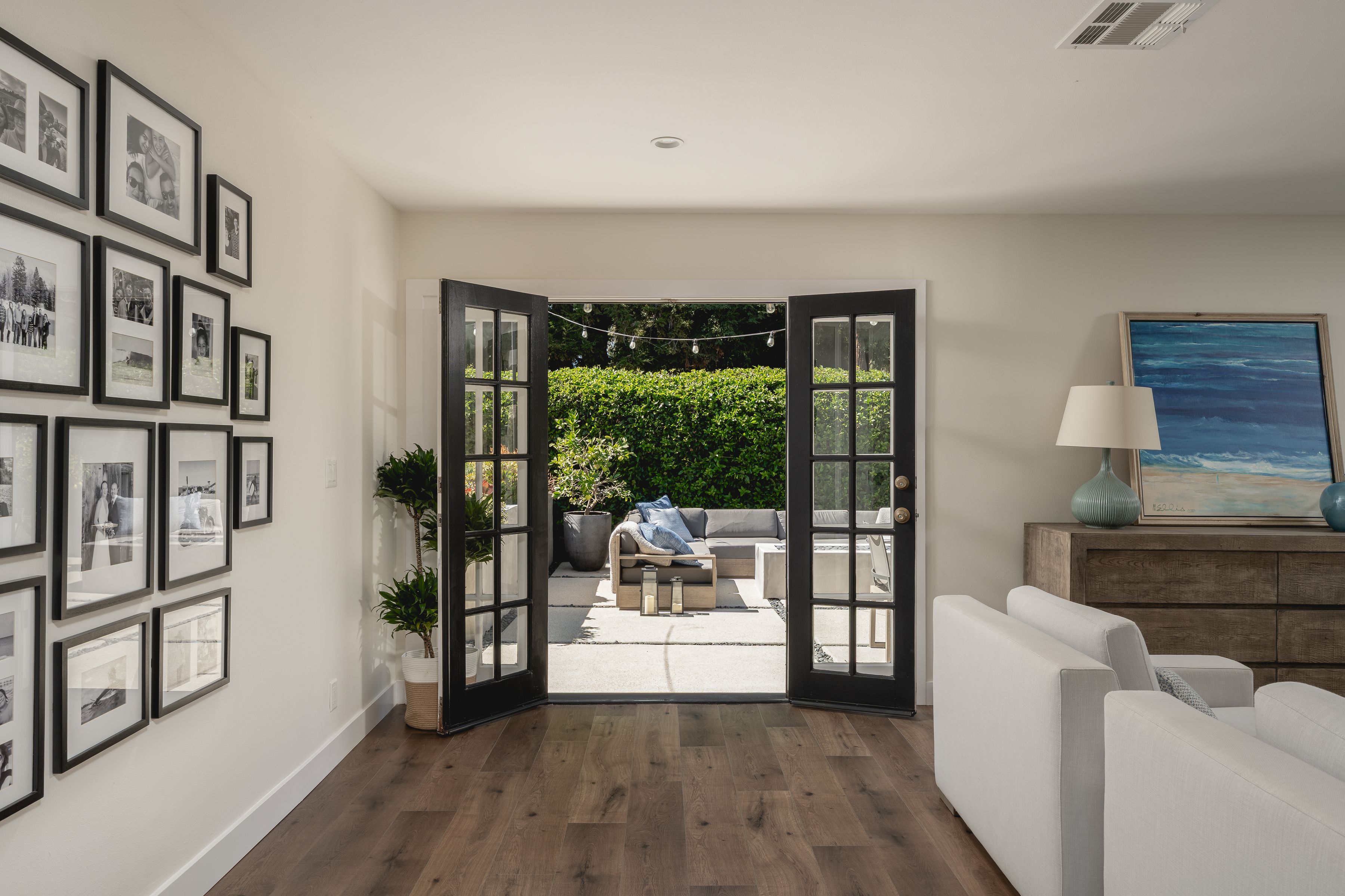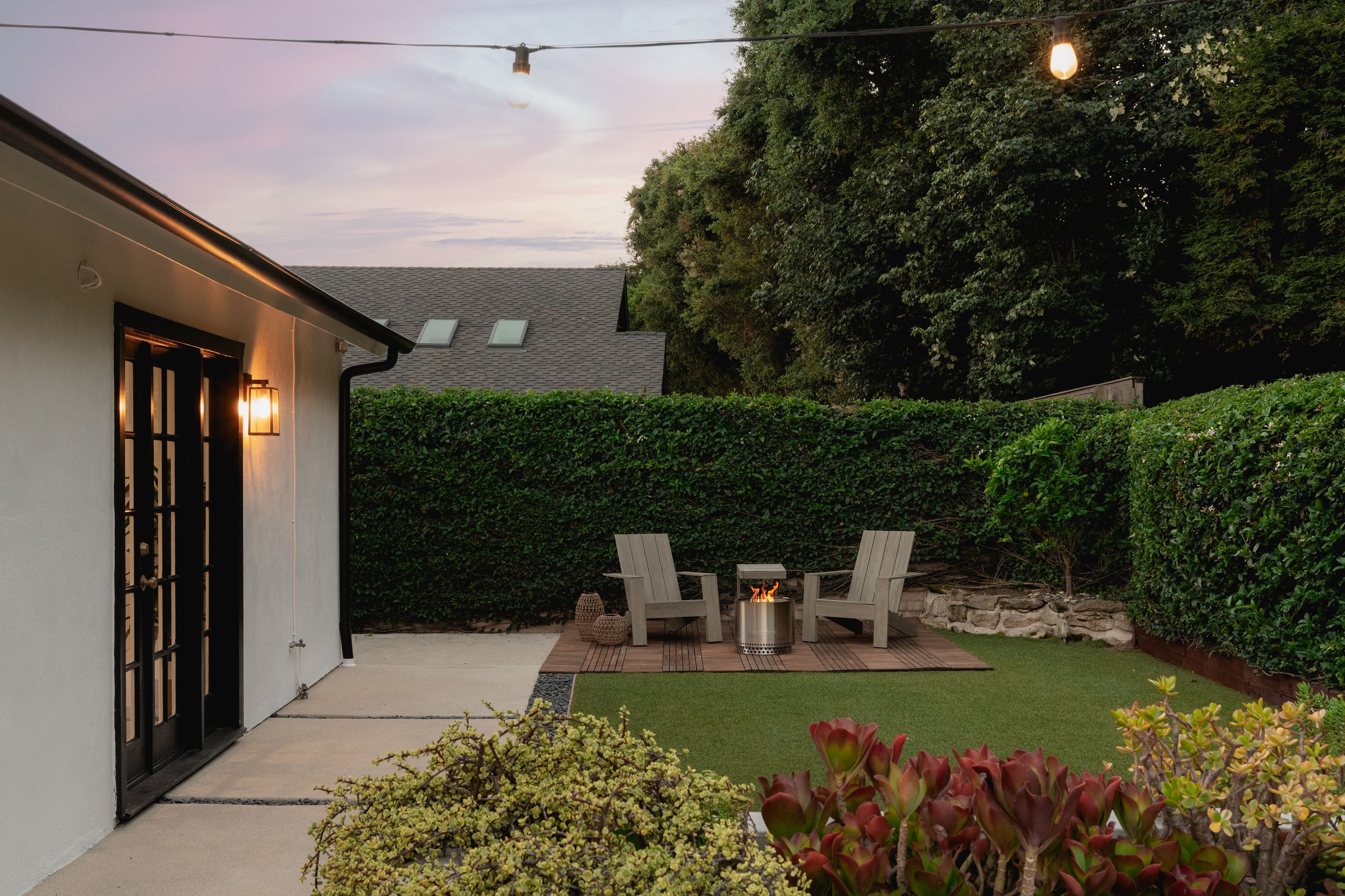 French doors open to a beautifully redesigned backyard retreat that reflects the spirit of the Santa Barbara coastal lifestyle. A gourmet outdoor kitchen with wood-fired pizza oven and gas grill anchors the space, complemented by a fire pit lounge—creating an inviting setting for entertaining and relaxed evenings outdoors.