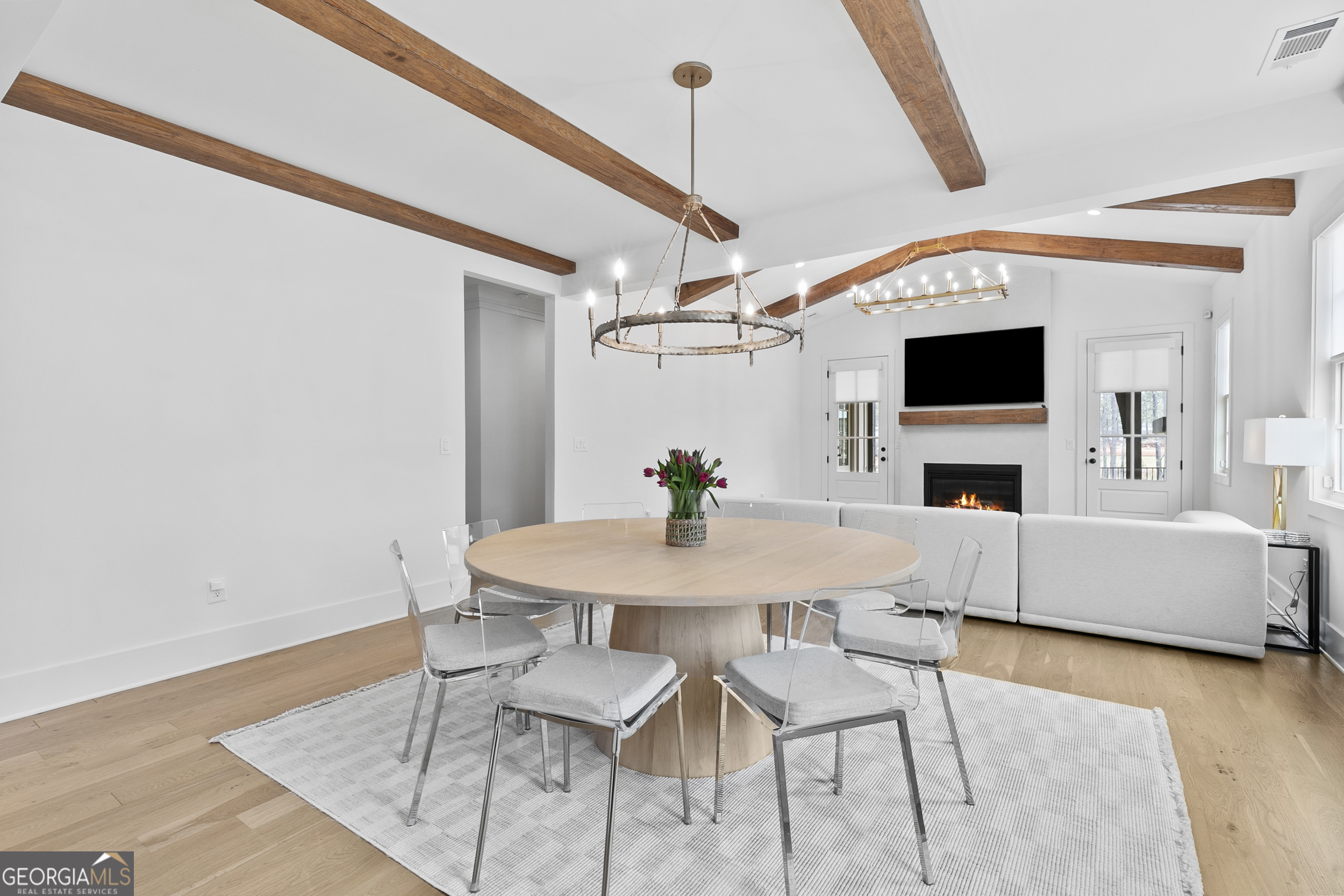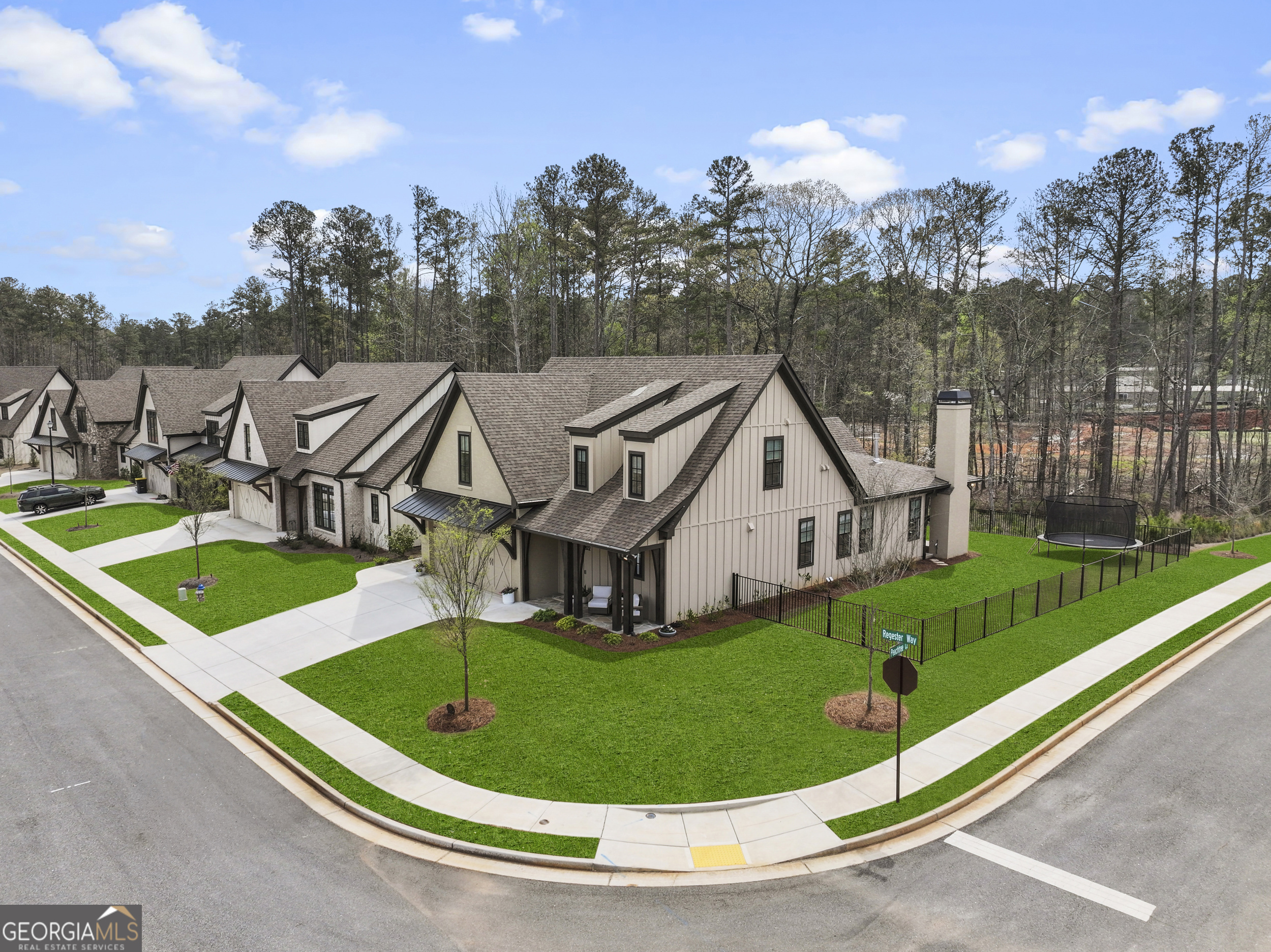 Walkable living meets refined design in one of Peachtree City's most convenient locations. Beautifully designed 5-bedroom, 3.5-bath home in Towson Village, one of Peachtree City's fastest-growing communities, zoned for the highly sought-after McIntosh school district. From the moment you step inside, wide plank white oak hardwood floors-carried throughout-set a warm, refined tone. The chef's kitchen features quartz countertops, custom cabinetry, top-of-the-line appliances, a walk-in pantry, and an oversized island with built-in storage, all complemented by brushed brass finishes that add a subtle, elevated touch. A spacious dining area framed by exposed wood beams flows seamlessly into the living room, where those architectural details continue overhead. Natural light fills the space, anchored by an oversized fireplace and mantle. Just beyond, a covered back patio with its own gas fireplace extends the living space outdoors, overlooking a fenced backyard on a corner lot-ideal for both relaxing and entertaining. The main-level primary suite offers a private retreat with vaulted ceilings, tree-line views, and a thoughtfully designed en-suite bath featuring a walk-in shower, freestanding soaking tub, and custom walk-in closet. Two additional bedrooms, a shared bath, laundry room, and a well-appointed half bath complete the main level. Upstairs includes two additional bedrooms, a full bath, and an expansive walk-in attic providing exceptional storage and flexibility. Additional features include spray foam insulation, tankless water heater, electric vehicle charging, and a spacious 2-car garage with a dedicated golf cart bay. Towson Village continues to grow with a new amenities center underway, including a pool and clubhouse. Ideally positioned within walking distance to Publix, Starbucks, restaurants, and everyday shopping, with direct access to Peachtree City's extensive golf cart path system. Just minutes from Trilith, offering a vibrant mix of dining, retail, and entertainment. A thoughtfully designed, move-in ready home that delivers elevated finishes, functional living, and a lifestyle centered around convenience and connection.