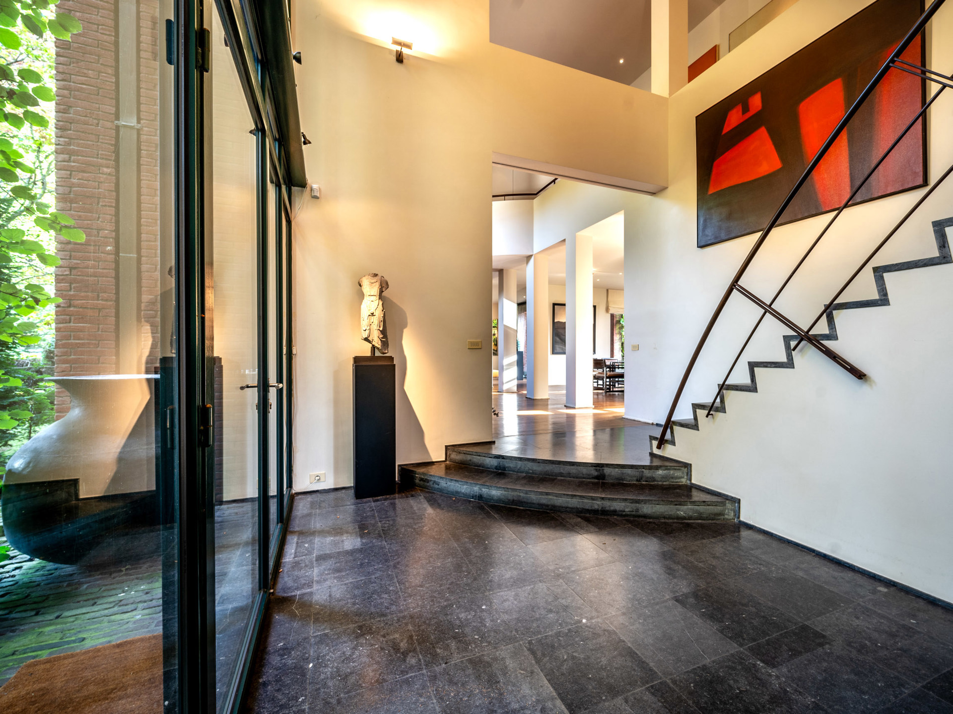 On the edge of the Forêt de Soignes, in a sought-after district of Watermael-Boitsfort, this 90s villa designed by architect Marc Corbiau has a gross floor area of 820 m² and is set in a remarkable 45-acre plot planted with trees. It comprises an entrance hall, with cloakroom and guest toilet, access to the living rooms, overlooking the ideally oriented, unoverlooked garden, comprising a music room with mezzanine and 7.5 m high ceilings, two lounges with wood-burning fireplaces, a dining room and a fully-equipped Obumex kitchen. This floor is completed with guest bedroom with en-suite shower room. On the first floor, a hall with sitting area leads to two bedrooms sharing a bathroom, two further bedrooms and their respective shower rooms, and a master suite with dressing room and full bathroom. The basement with service entrance has two closed garages, various cellars, a multi-purpose area, a former wellness area (sauna, jaccuzi, shower room) and a laundry room. Other features: underfloor heating, gas boiler, water softener, alarm, oak parquet flooring, insulated copper roof, double-glazed windows, Gaggenau kitchen equipment. Watermael-Boitsfort is a quiet, picturesque wooded community within easy reach of the city. It offers a wide range of shops, including a market every Sunday, and numerous public transport links with easy access to the airport and major roads. For further information, please contact Bertrand de Moffarts on +32 (0) 475 944 508.