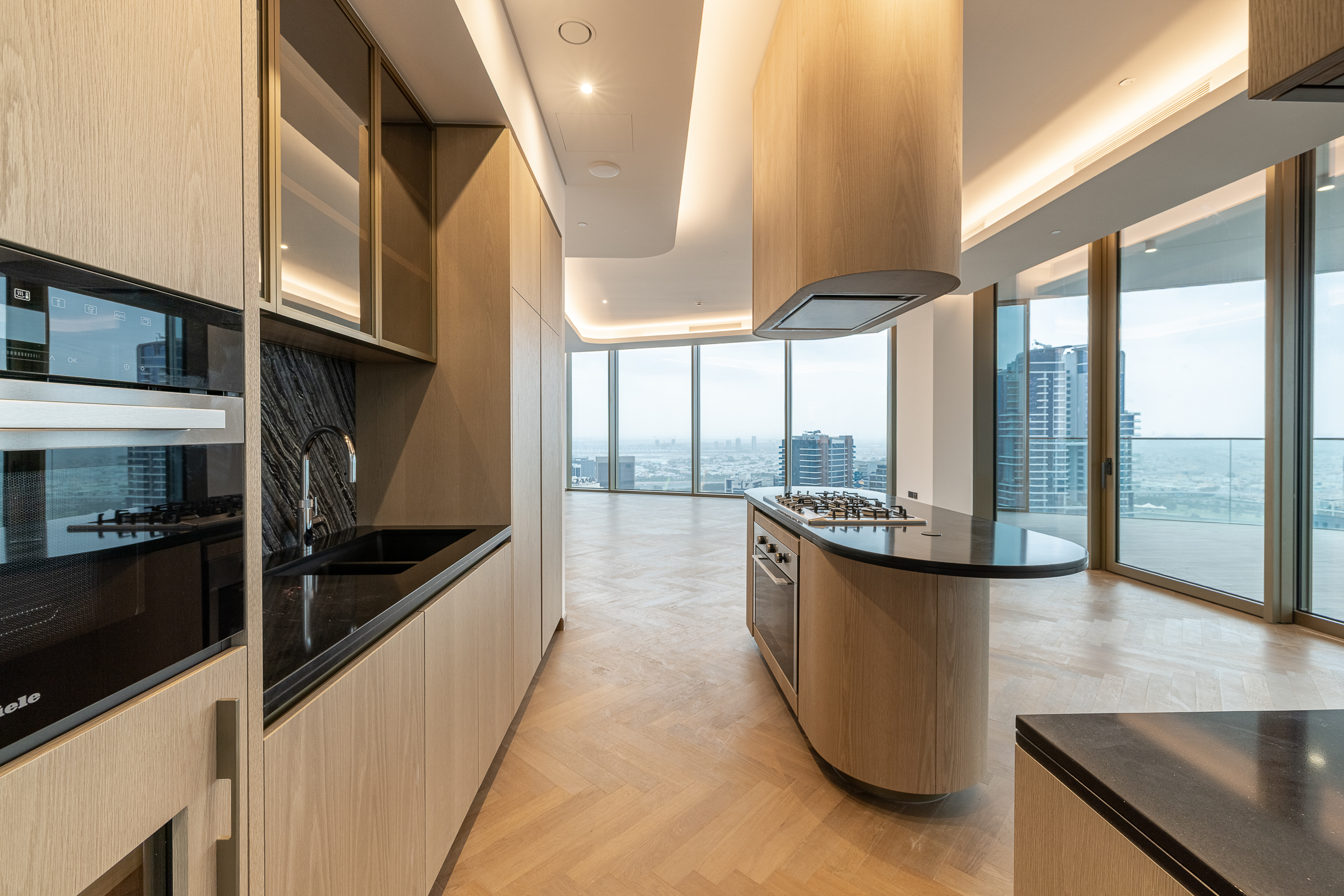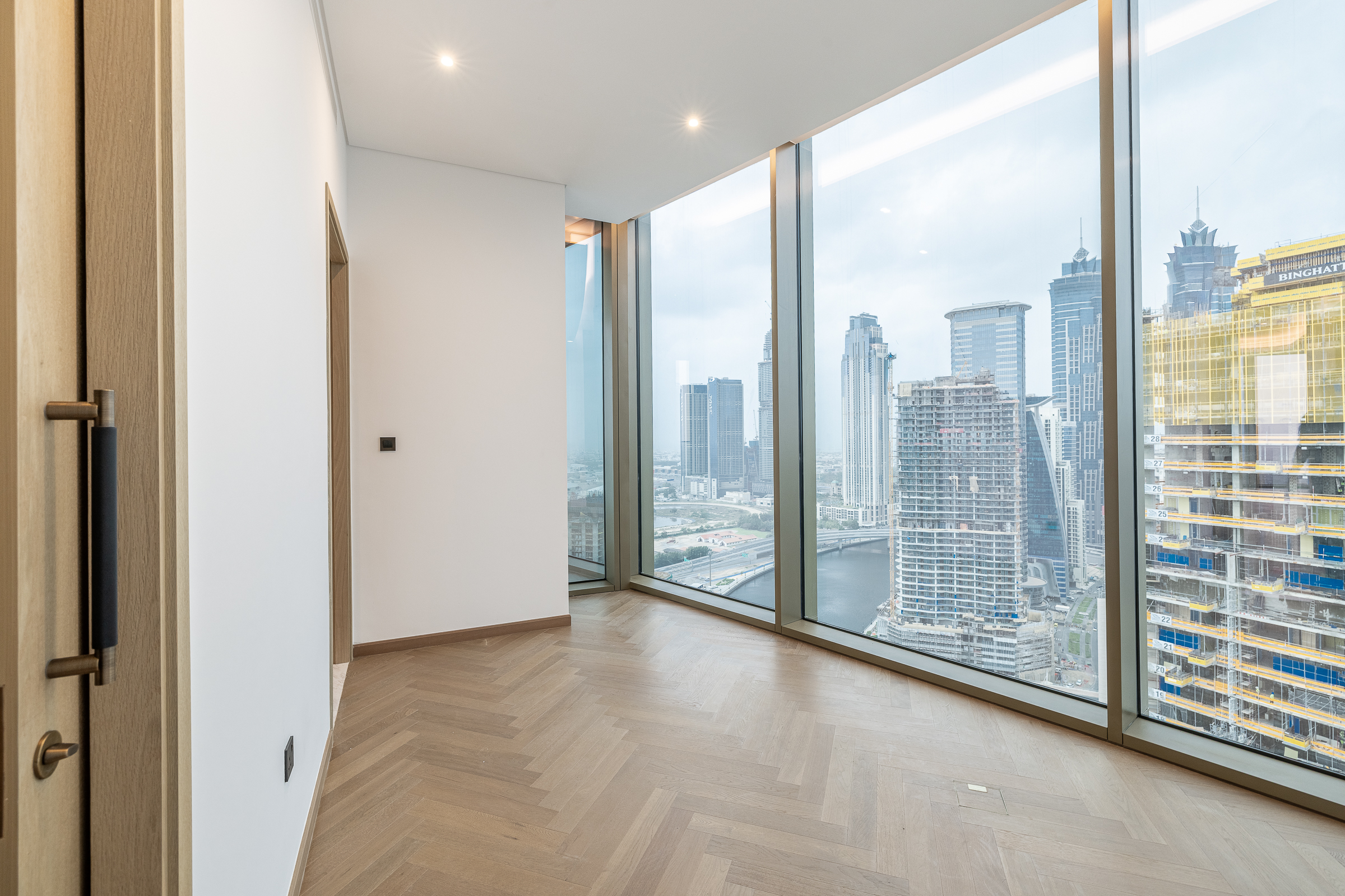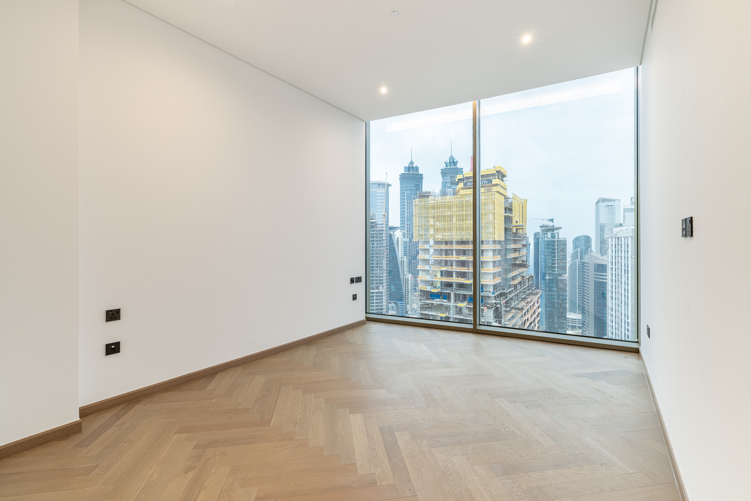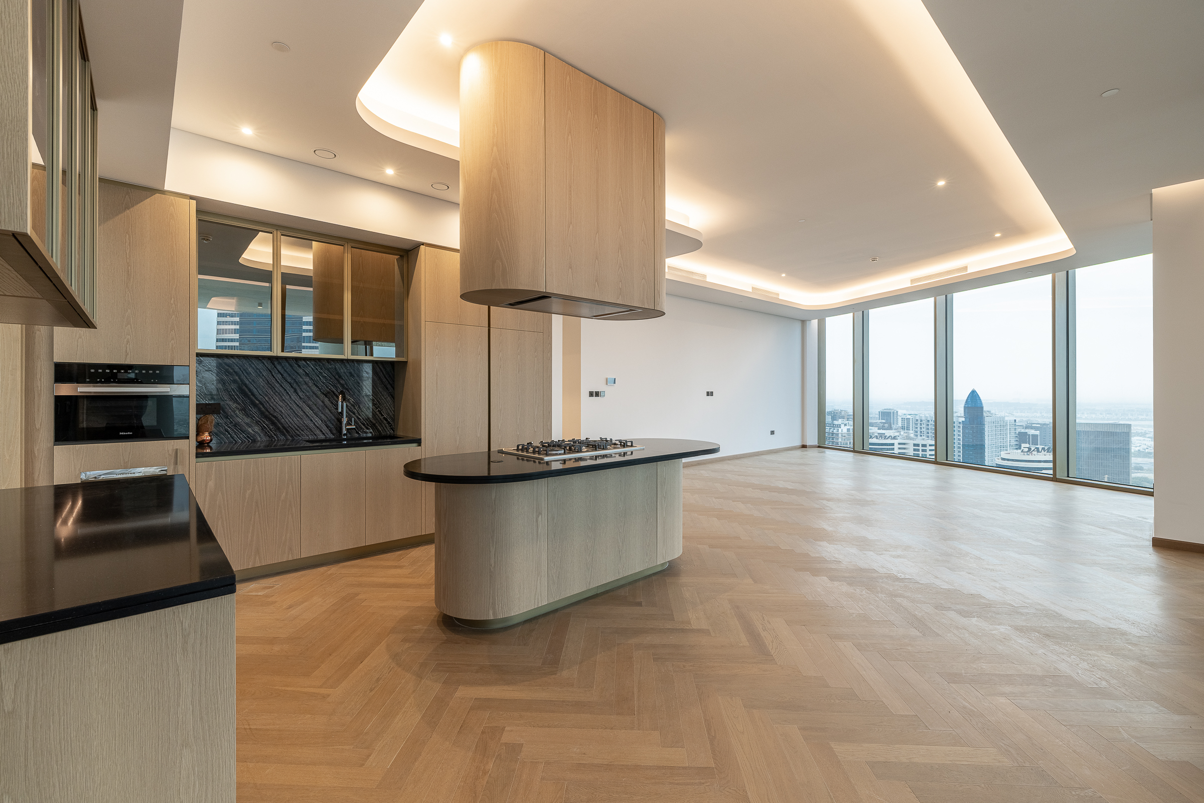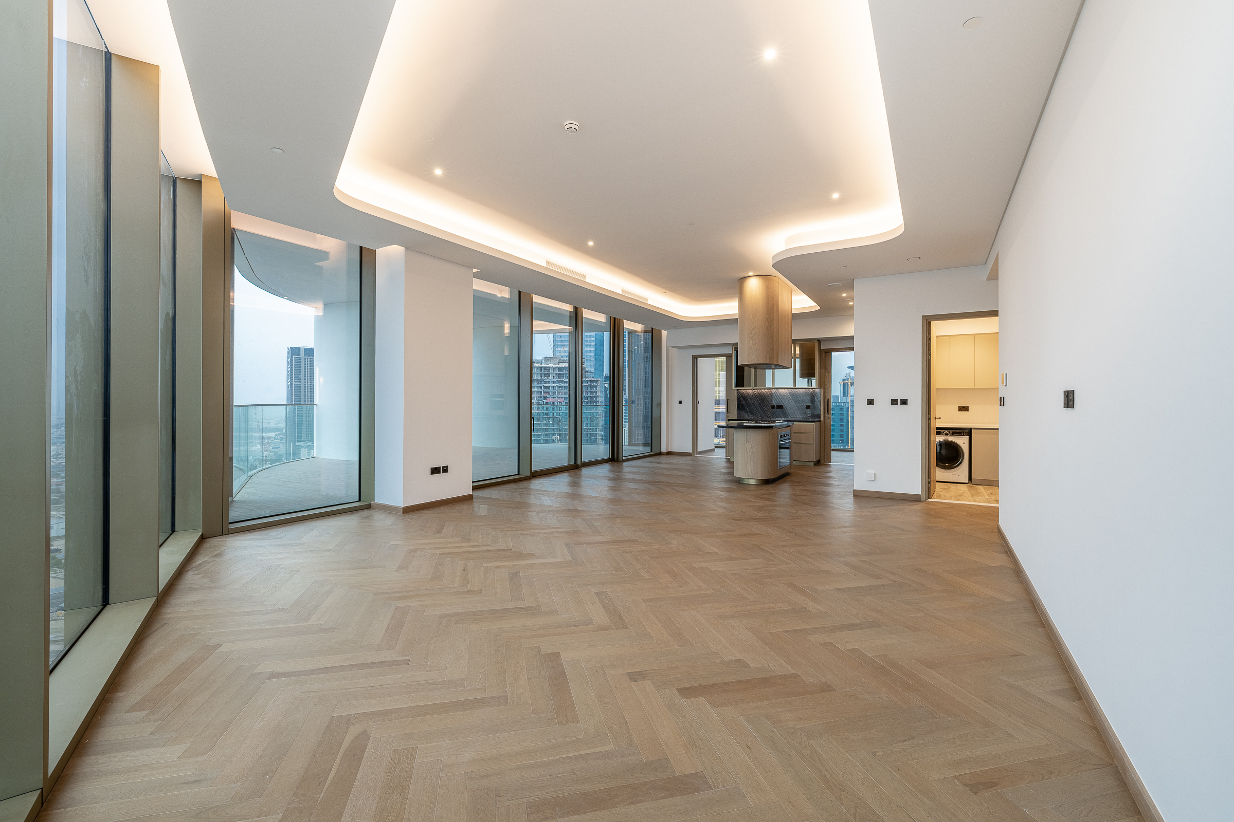 Occupying a high floor within the prestigious Jumeirah Living in Business Bay, this brand new three-bedroom apartment is one of elevated living in all respects. Ready for handover, this polished home is spread across 3040.80 sq.ft. The interiors balance an understated white palette with warm wooden panelling and herringbone flooring.