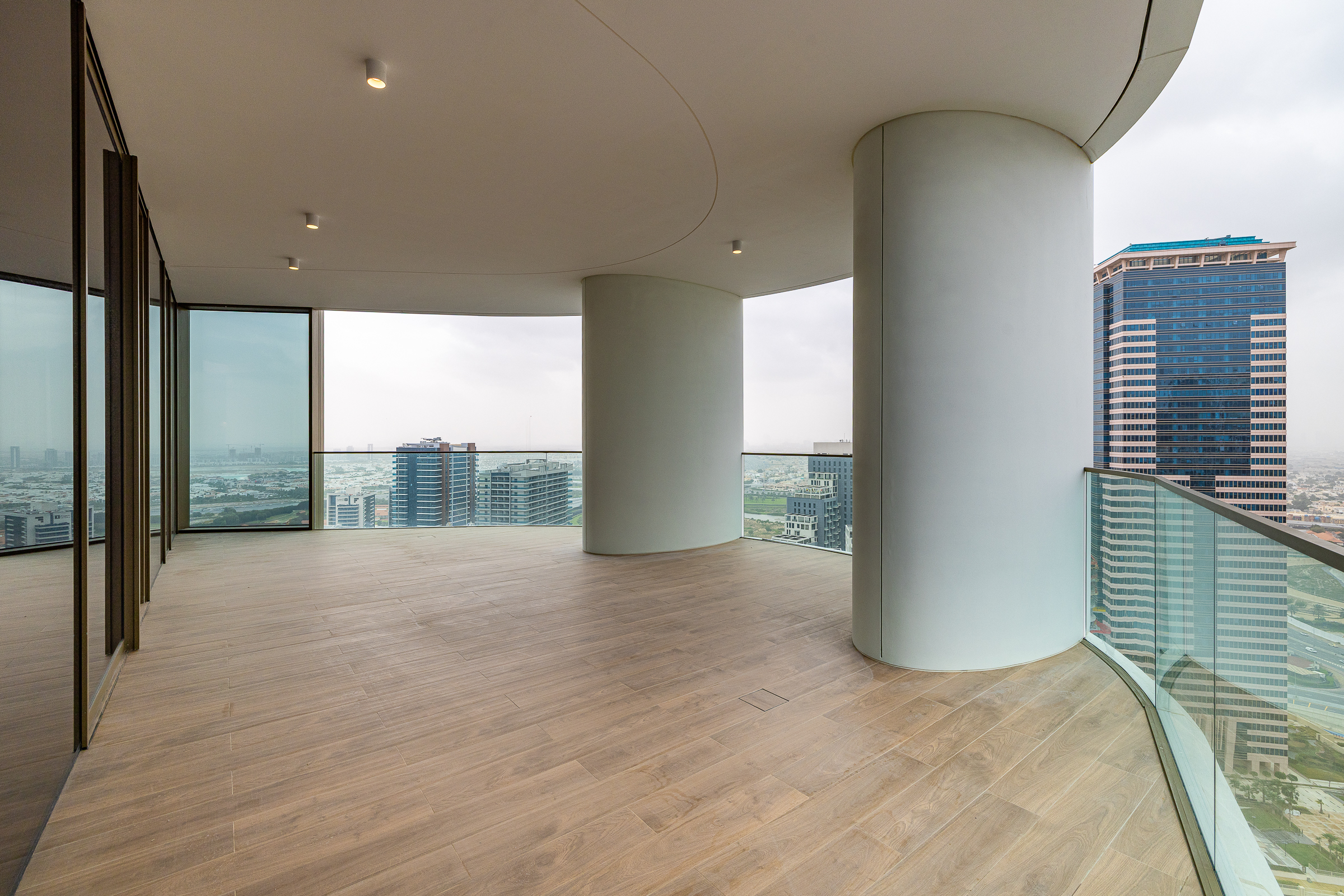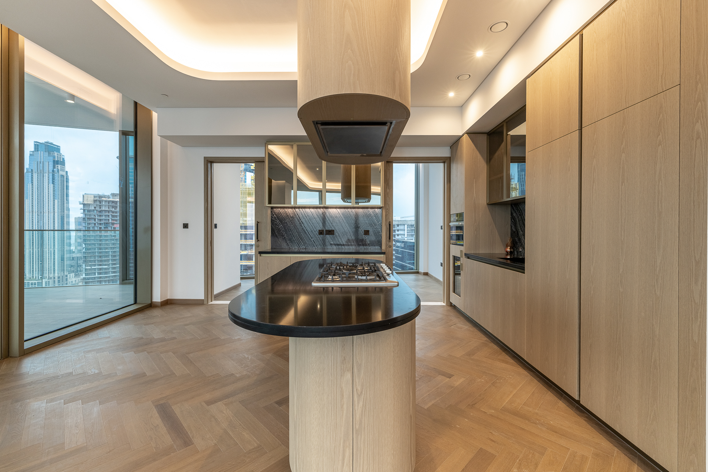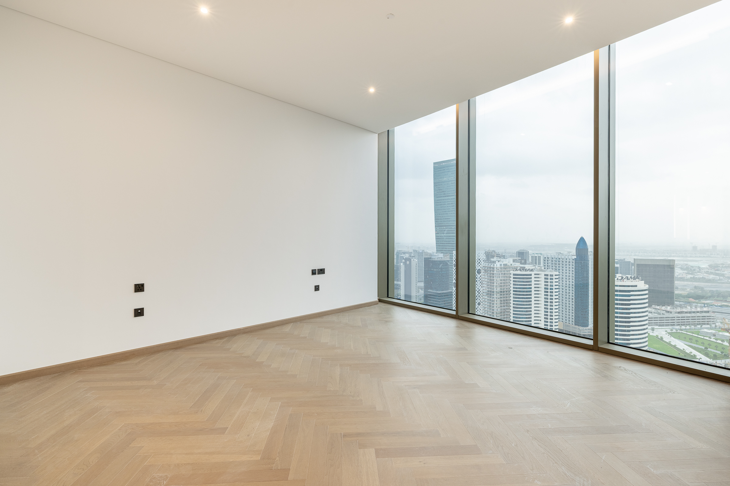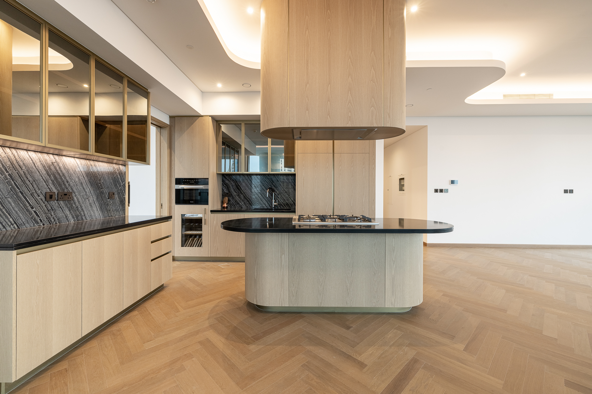 Occupying a high floor within the prestigious Jumeirah Living in Business Bay, this brand new three-bedroom apartment is one of elevated living in all respects. Ready for handover, this polished home is spread across 3040.80 sq.ft. The interiors balance an understated white palette with warm wooden panelling and herringbone flooring.