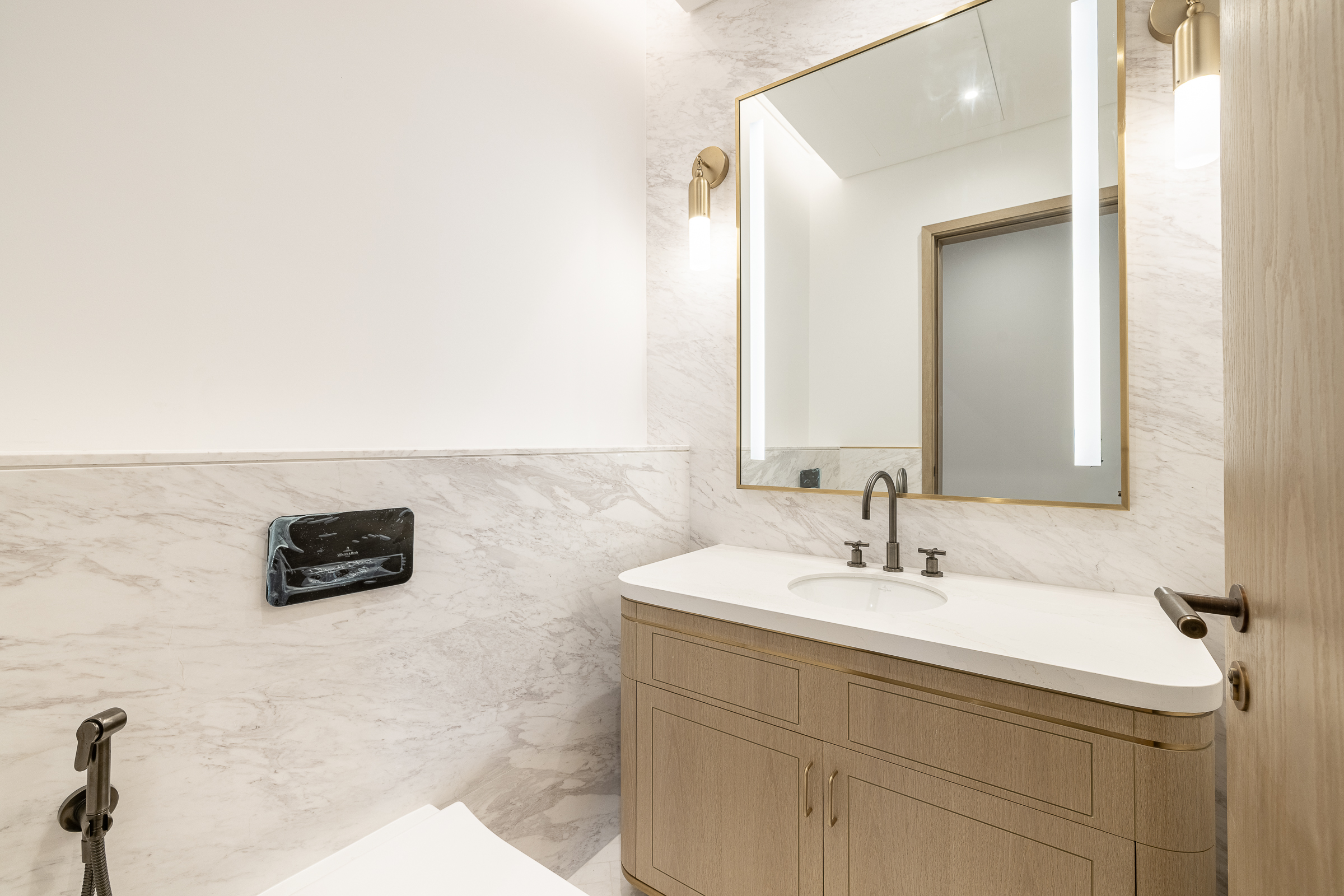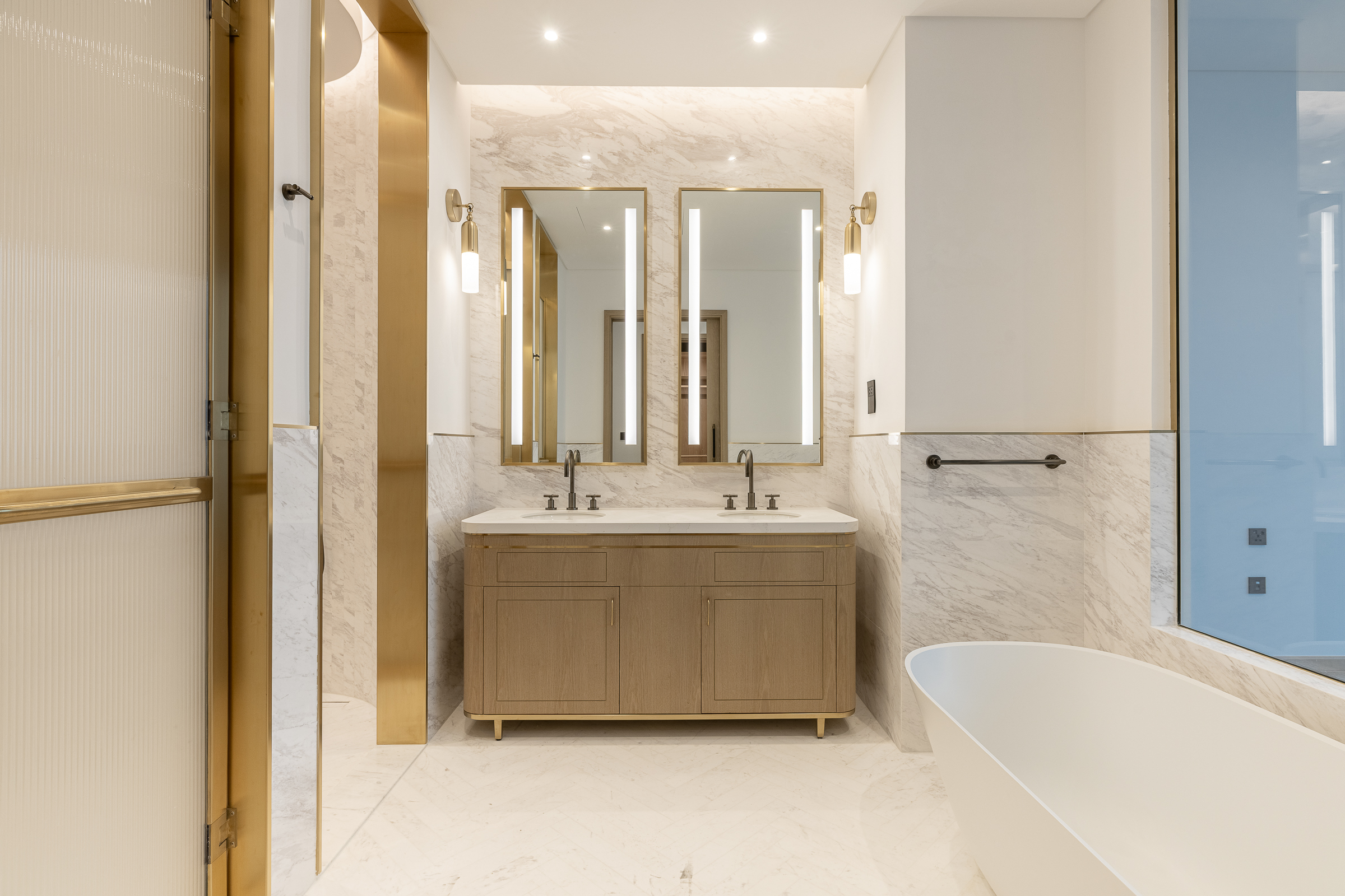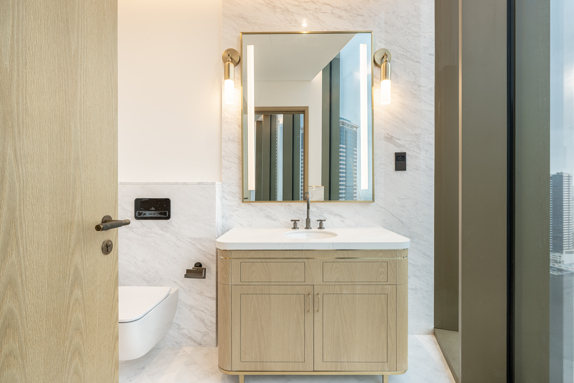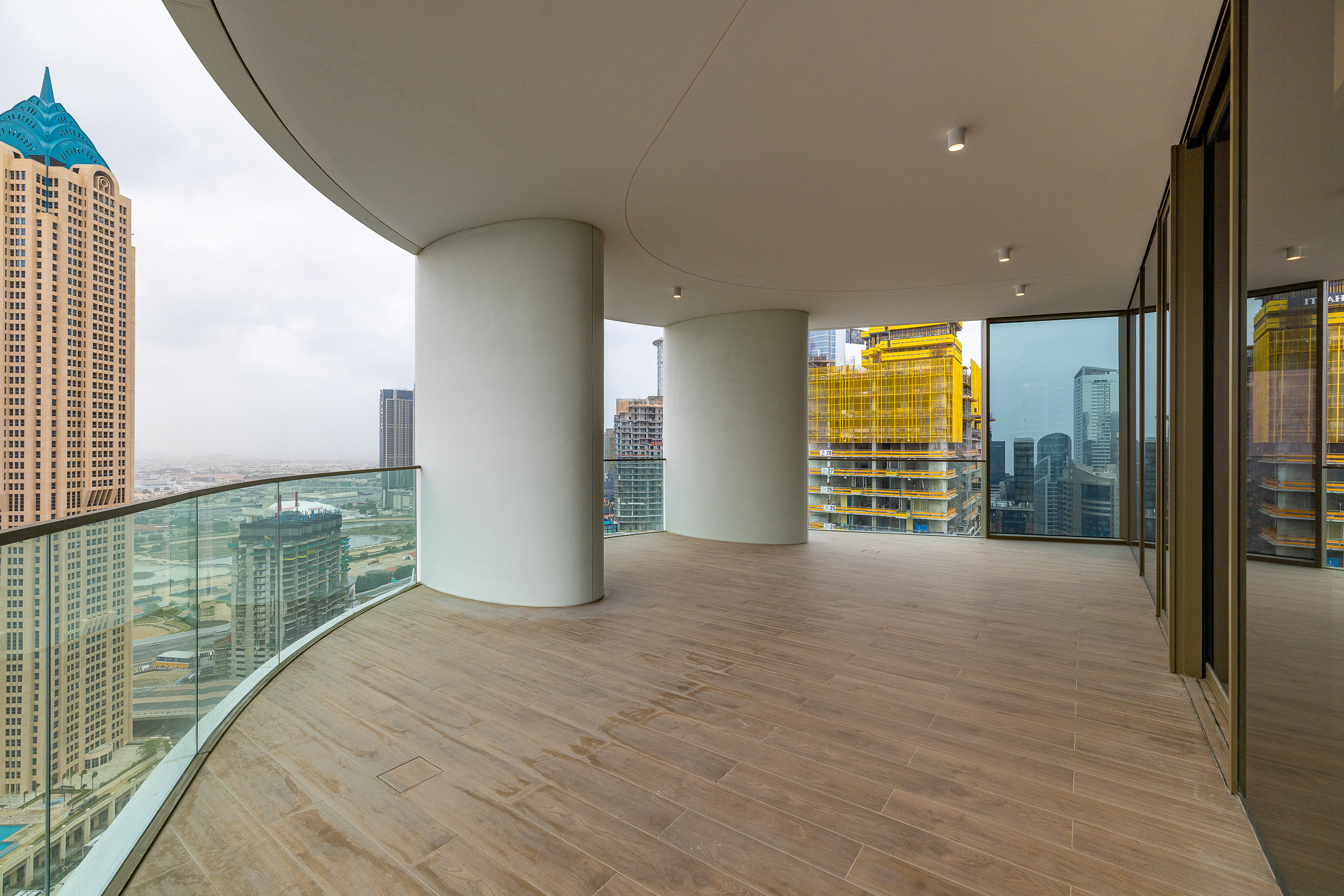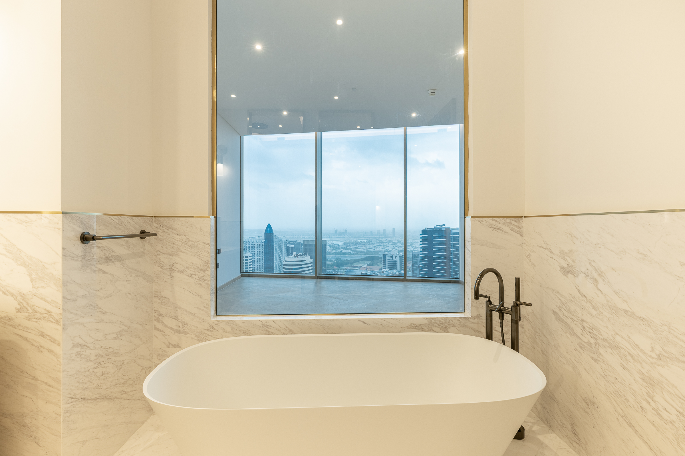 Occupying a high floor within the prestigious Jumeirah Living in Business Bay, this brand new three-bedroom apartment is one of elevated living in all respects. Ready for handover, this polished home is spread across 3040.80 sq.ft. The interiors balance an understated white palette with warm wooden panelling and herringbone flooring.