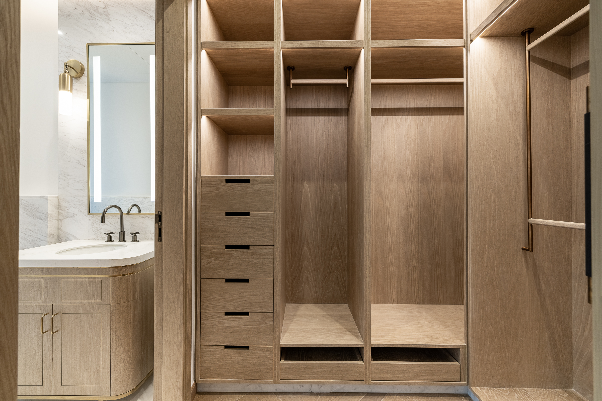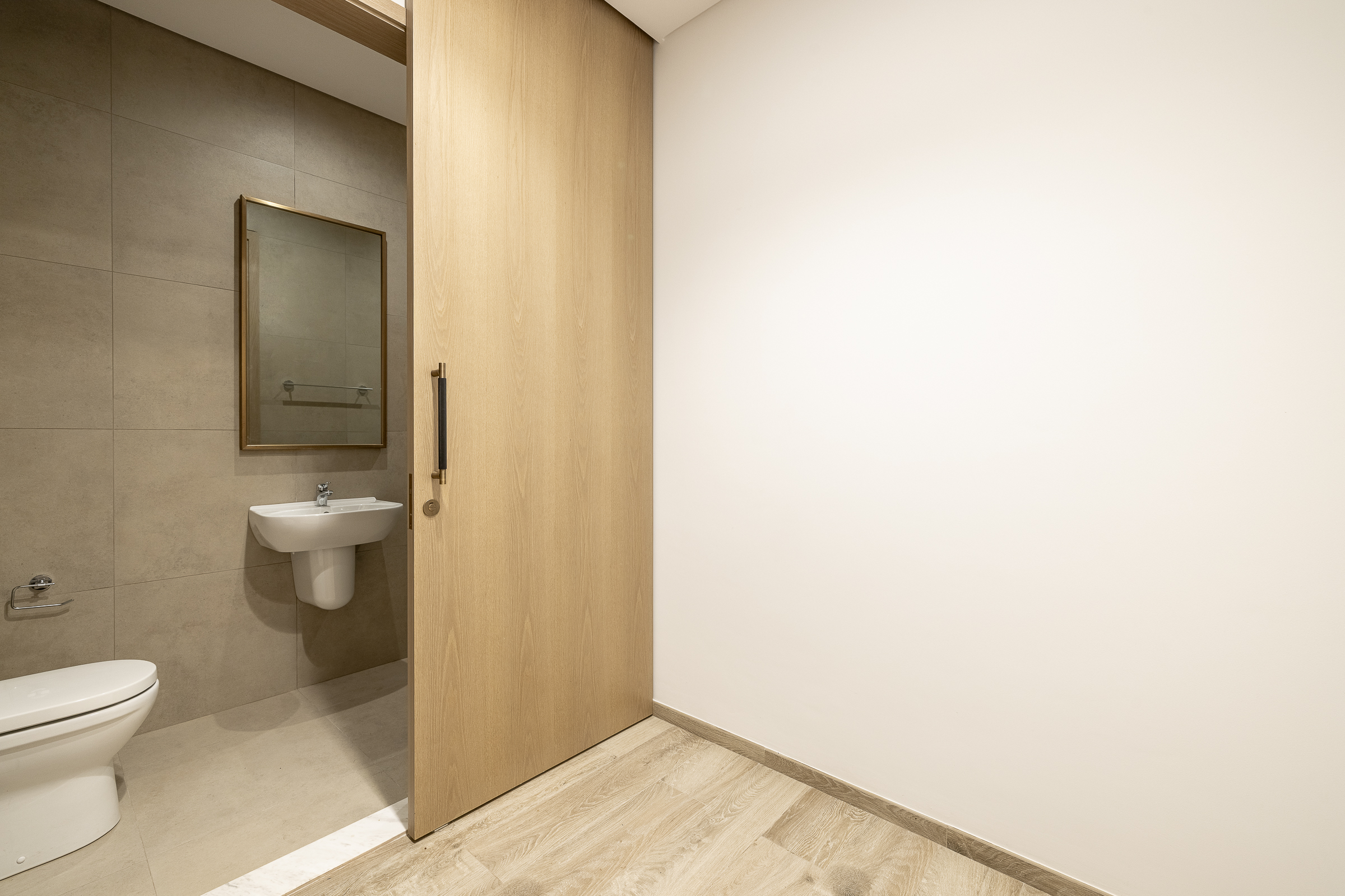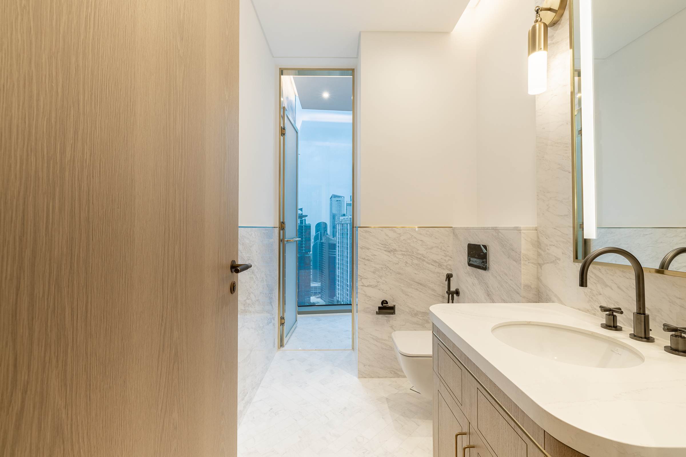 Its large open-concept living room shares space with a dining area and well-appointed built-in kitchen, creating a warm, intimate social heart of the home. Full-height glazing draws in natural light while also extending this core outdoors onto a vast balcony — offering a generous al fresco entertaining space. Far-reaching views of the serene bay waters and skyline elevate this setting, a feature shared by all rooms within the residence.