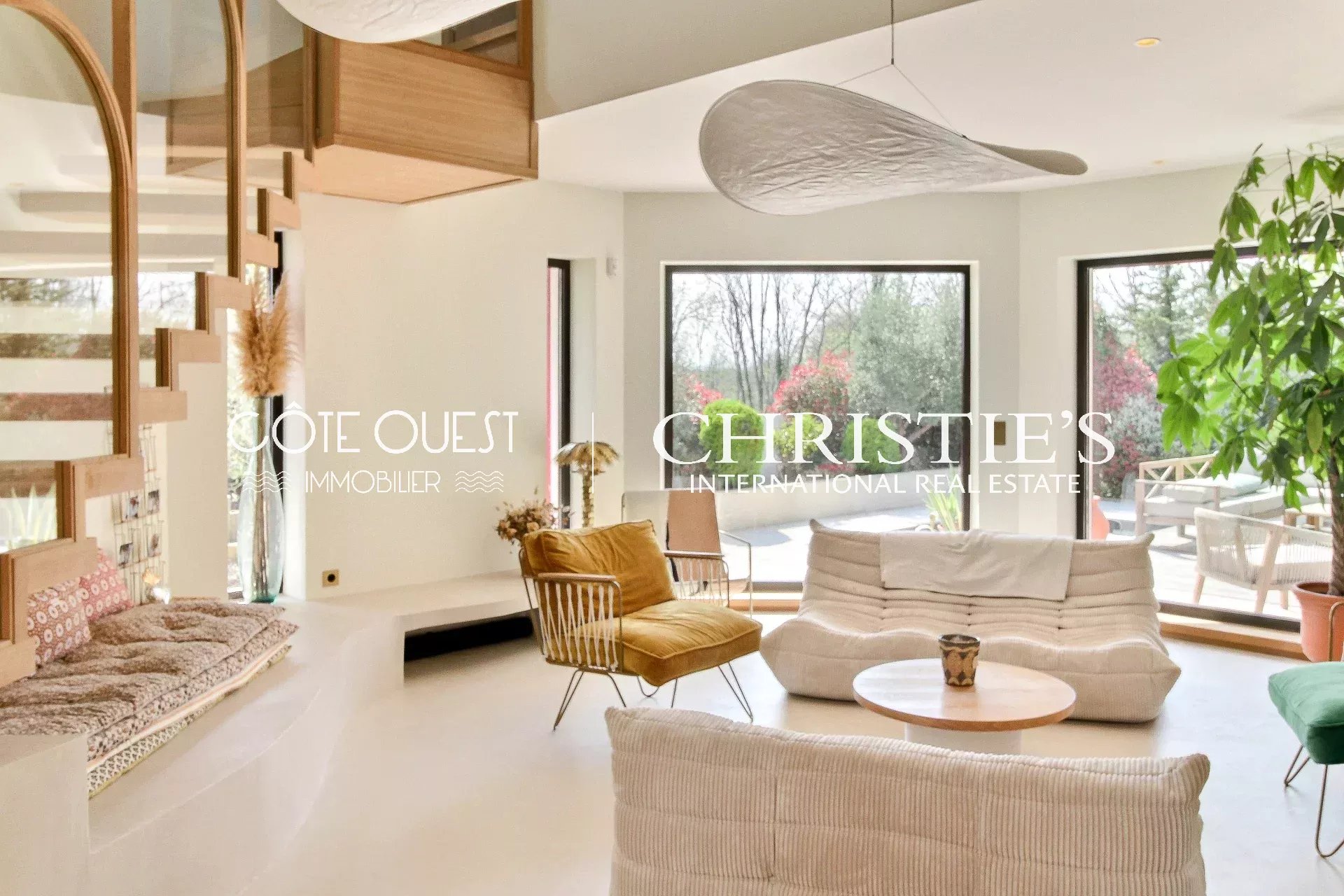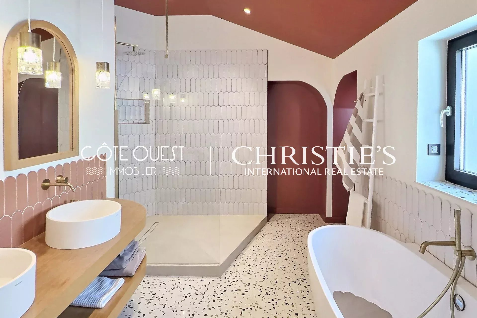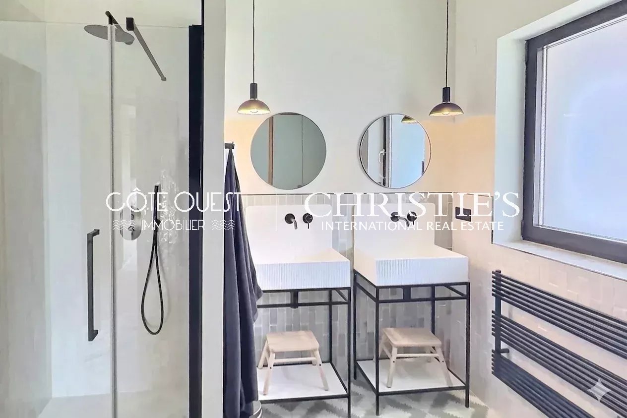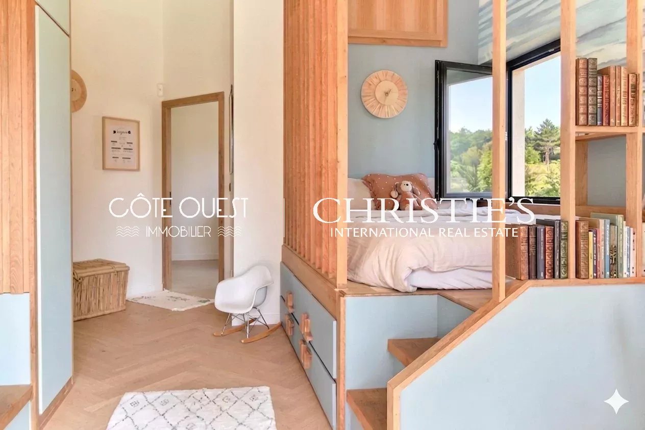 The property consists of five bedrooms, including two elegant suites, as well as three bathrooms. We find a large fitted and equipped kitchen, open to a bright double living room. A closed mezzanine office completes the living spaces, ideal for teleworking.