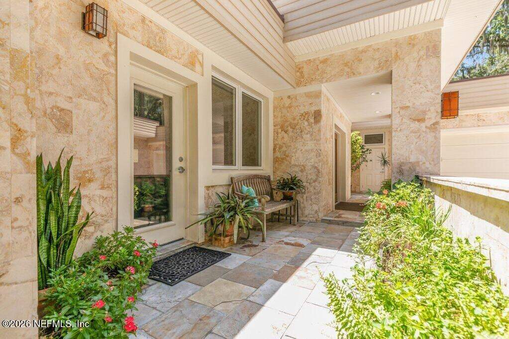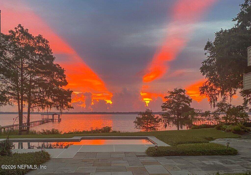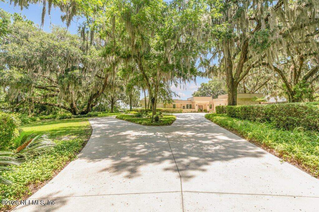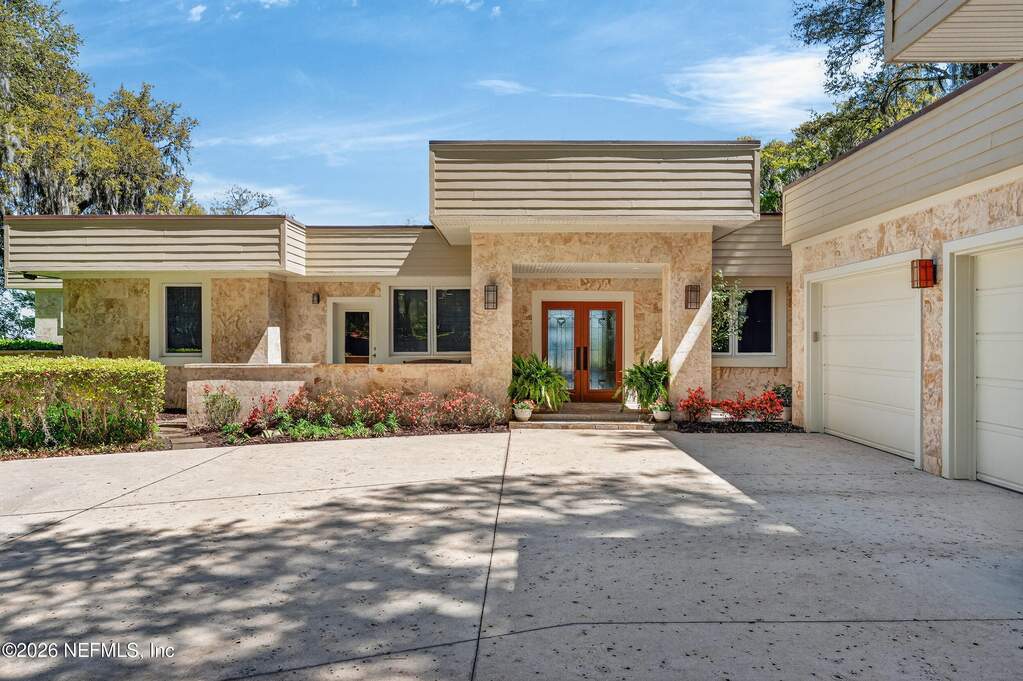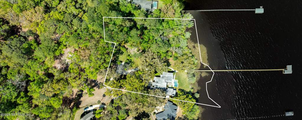 Set along the serene banks of the St. Johns River, this extraordinary riverfront estate is truly a once-in-a-lifetime opportunity--an irreplaceable sanctuary where architecture, nature, and privacy converge. Encompassing nearly 3 acres with an impressive 420 feet of river frontage, this gated property feels like your own private nature preserve. A canopy of majestic oaks, abundant wildlife, and lush surroundings create a peaceful retreat--yet you're still within reach of modern conveniences. Inspired by the timeless design principles of Frank Lloyd Wright, the midcentury modern residence is a masterful blend of natural materials and architectural elegance. Originally crafted with intention and completely renovated and expanded in 2007, the home showcases coral stone construction, slate flooring throughout, and warm cypress-lined living spaces that evoke both sophistication and comfort. Inside the main residence, 4 bedrooms and 3.5 baths are thoughtfully arranged to maximize both privacy and breathtaking river views. From the moment you enter, walls of glass frame the water beyond, filling the home with natural light. The living and dining areas anchored by a fireplace, along with a cozy family room, create an inviting environment for everyday living. Designed for effortless entertaining, the stunning river room features near floor-to-ceiling windows and opens seamlessly to a sprawling covered and open-air patio. Here, a custom pool and spa overlook the river, offering the perfect setting for gatherings or quiet sunset evenings. The chef's kitchen is both functional and refined, with custom cabinetry, granite countertops, and stainless steel appliances. The expansive primary suite is a true retreat, boasting panoramic river views, a California walk-in closet, and a spa-inspired bath with dual vanities, a soaking tub, and private access to the hot tub. Additional highlights include a dedicated office with French doors, a flexible fifth bedroom space, and well-appointed guest accommodations. A separate 731-square-foot guest house or in-law suite provides complete independence with its own kitchen, fireplace, bedroom, bath and laundry--ideal for extended family or visitors. Outdoors, the estate continues to impress with a 500-foot dock, boathouse, and 20,000 lb lift, making it a dream for boating enthusiasts. The fully fenced grounds include a separate dog run and a variety of fruit and nut trees, enhancing the property's natural charm. Built for both luxury and resilience, the home features poured concrete block construction, foam insulation, hurricane impact windows, enhanced security, and solar panels that power much of the home while serving as a backup energy source. A total of 6 garage spaces--3 attached and 3 detached--provide ample room for vehicles and storage. Adding to its distinct character, this remarkable estate was featured in the 2022 film Artifice Girl. This offering also includes the adjoining lot on Wilkies Point Rd (Parcel #28052601433400100), featuring a scenic pond and a tranquil creek that flows to the river, further enhancing privacy and future possibilities. A rare fusion of architectural significance, modern comfort, and unmatched natural beauty--this is more than a home; it's a legacy property on the St. Johns River.
