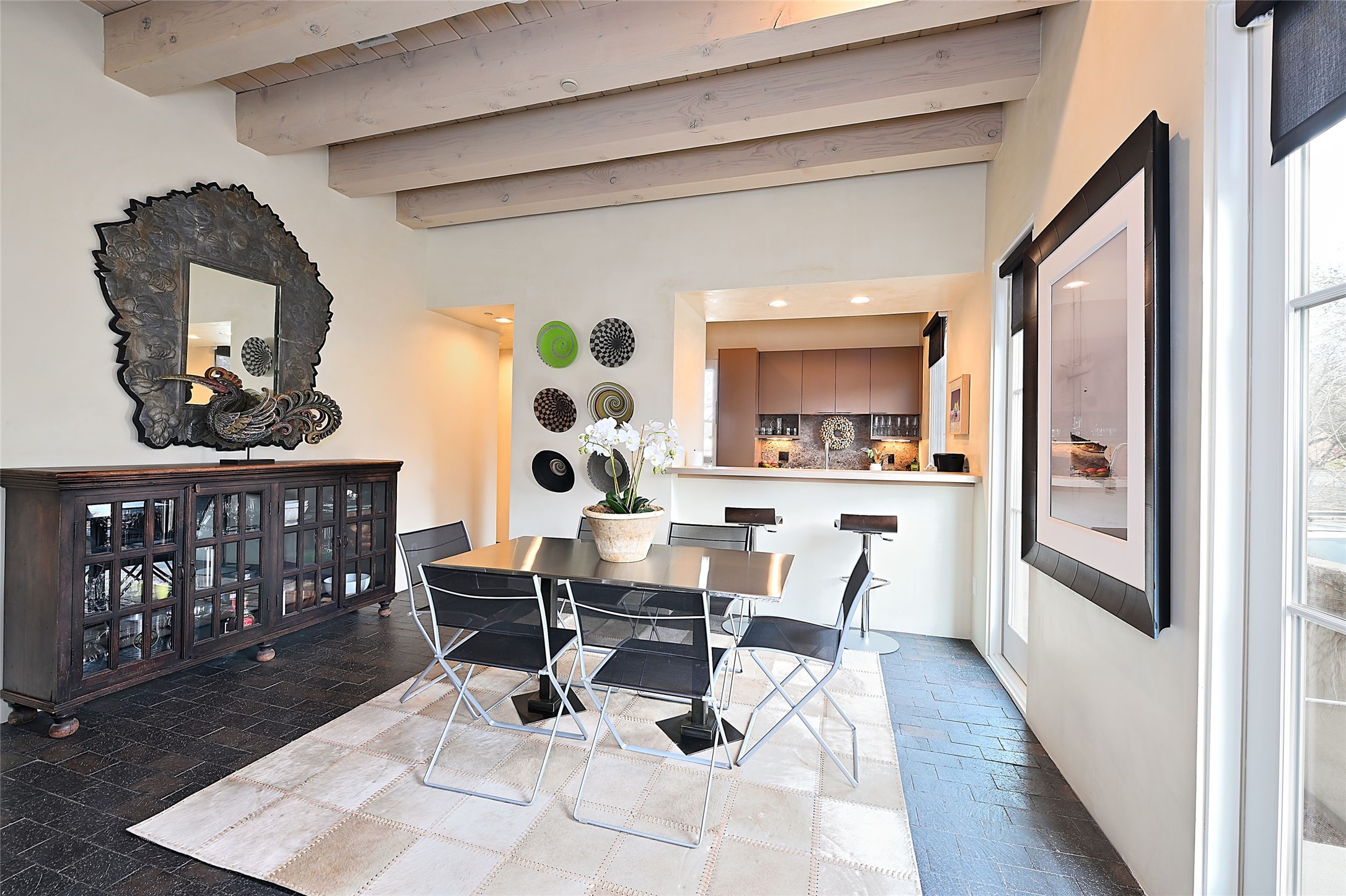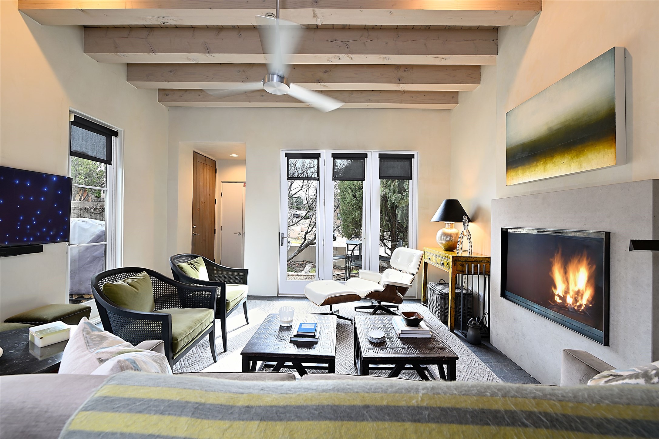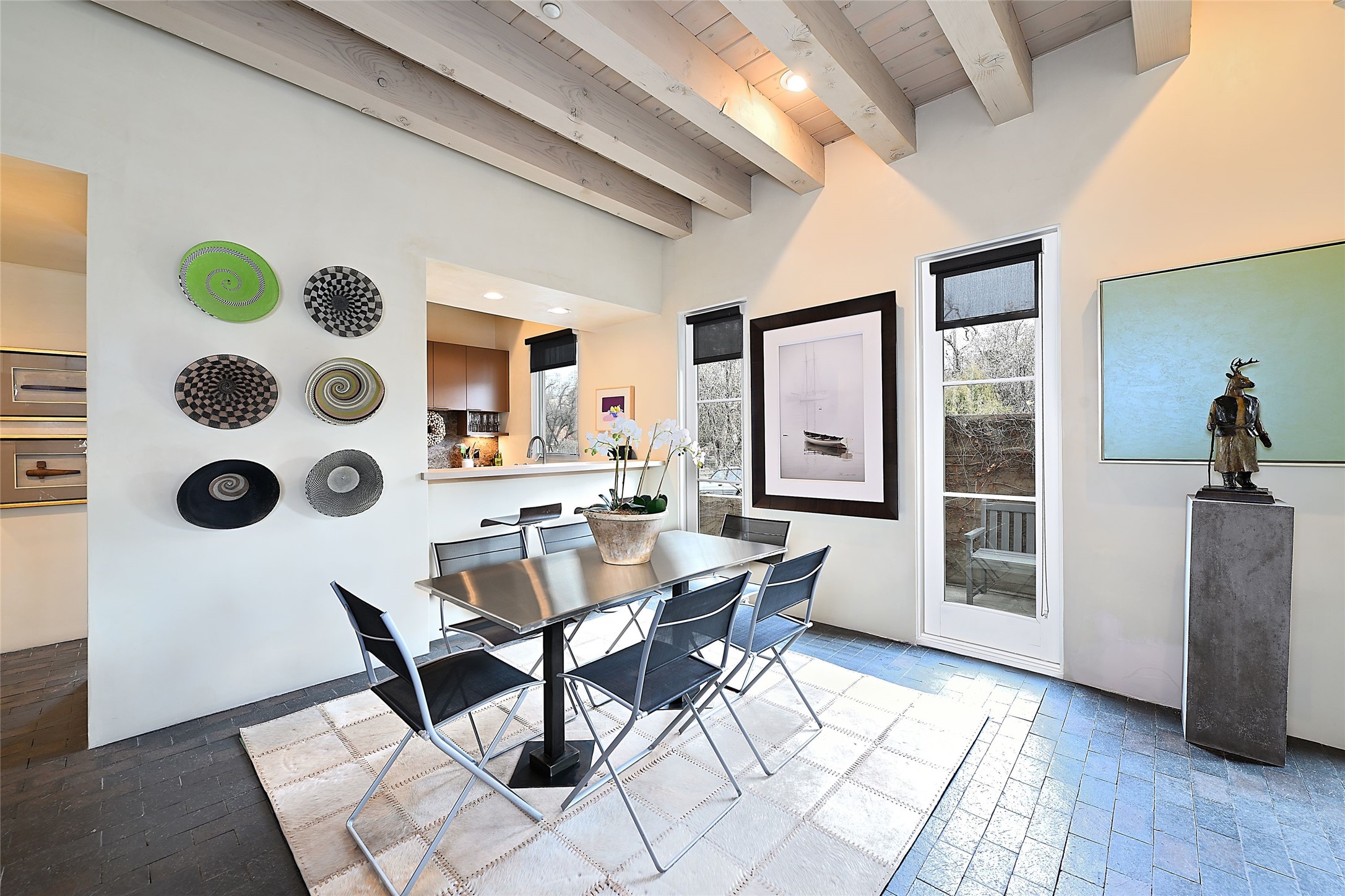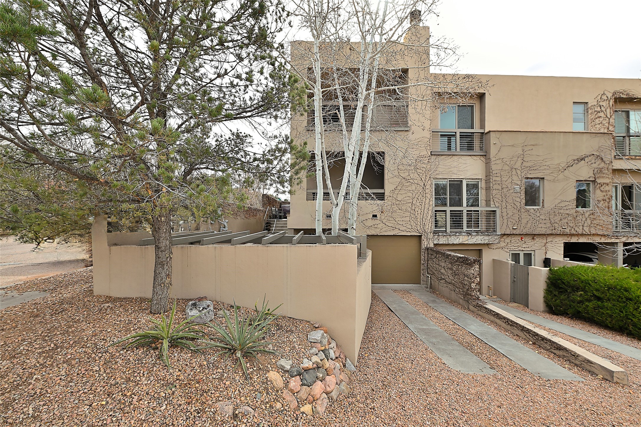On a quiet, charming street just blocks from the amenities and attractions of downtown Santa Fe and a quick drive from the ski area, this three-level home was designed by illustrious architect Trey Jordan, renowned for his innovative blend of contemporary and Southwestern styles. An enchanting getaway filled with sophisticated style, it features inviting open-plan living, dining, and kitchen spaces with easy access to a landscaped wraparound courtyard with a water feature and a covered balcony with a woodburning fireplace; two chic top-floor bedrooms and baths—one with a mountain-view balcony—and a single-car garage and a peaceful office or guest suite on the ground level. Oversized windows, skylights, and sliding glass doors admit floods of lovely natural light and offer views in multiple directions. Soaring ceilings, abundant storage, well-outfitted walk-in closets, high-caliber appliances—including mini splits—a discreet laundry closet, multiple fireplaces, a heated driveway providing parking for an additional car, and stylish fixtures and fittings combine to create a rare, enviable modern getaway in a legendary locale.