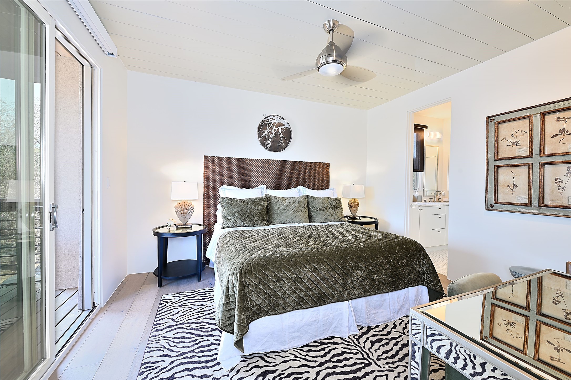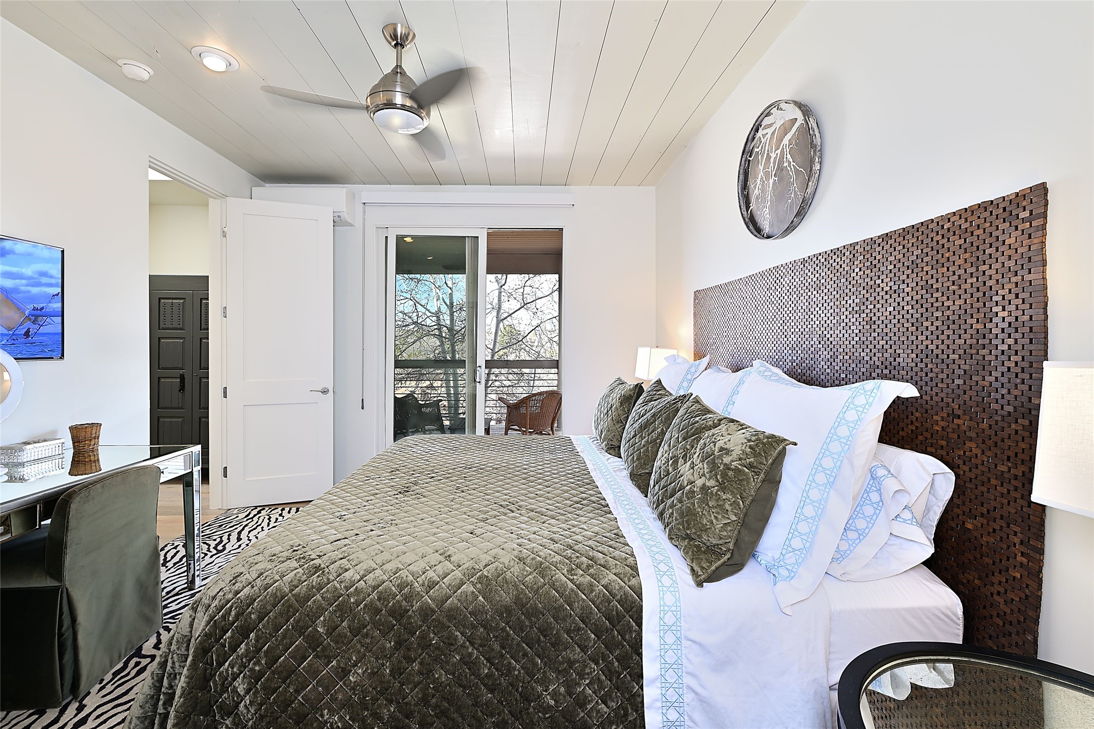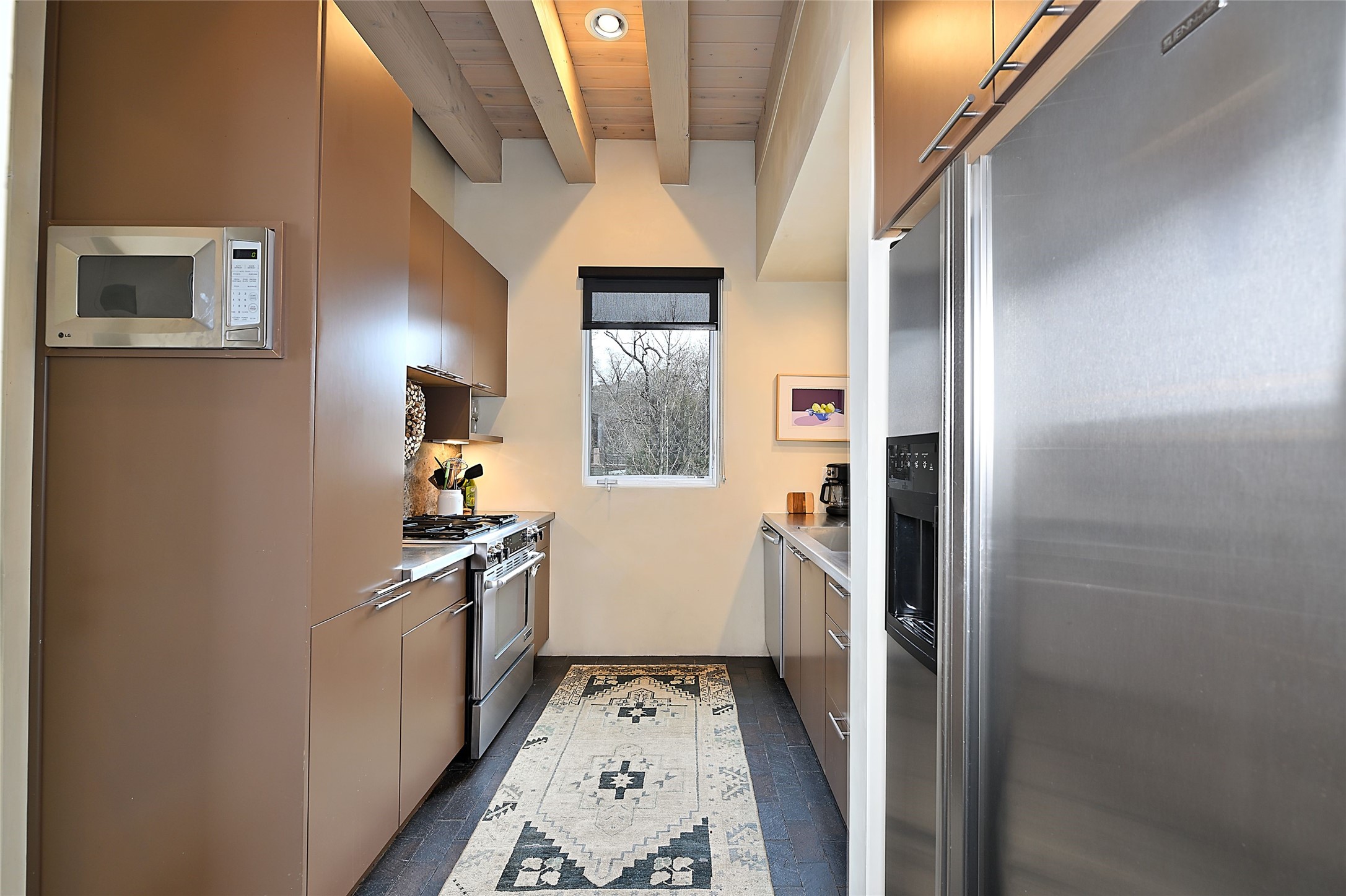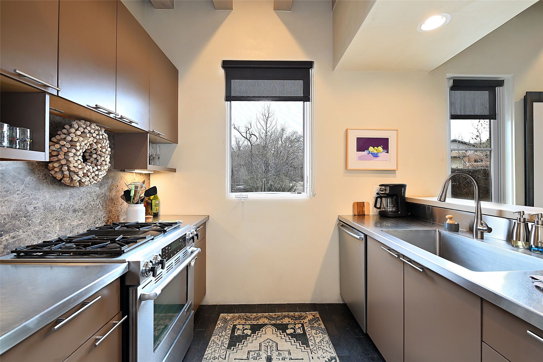 On a quiet, charming street just blocks from the amenities and attractions of downtown Santa Fe and a quick drive from the ski area, this three-level home was designed by illustrious architect Trey Jordan, renowned for his innovative blend of contemporary and Southwestern styles. An enchanting getaway filled with sophisticated style, it features inviting open-plan living, dining, and kitchen spaces with easy access to a landscaped wraparound courtyard with a water feature and a covered balcony with a woodburning fireplace; two chic top-floor bedrooms and baths—one with a mountain-view balcony—and a single-car garage and a peaceful office or guest suite on the ground level. Oversized windows, skylights, and sliding glass doors admit floods of lovely natural light and offer views in multiple directions. Soaring ceilings, abundant storage, well-outfitted walk-in closets, high-caliber appliances—including mini splits—a discreet laundry closet, multiple fireplaces, a heated driveway providing parking for an additional car, and stylish fixtures and fittings combine to create a rare, enviable modern getaway in a legendary locale.