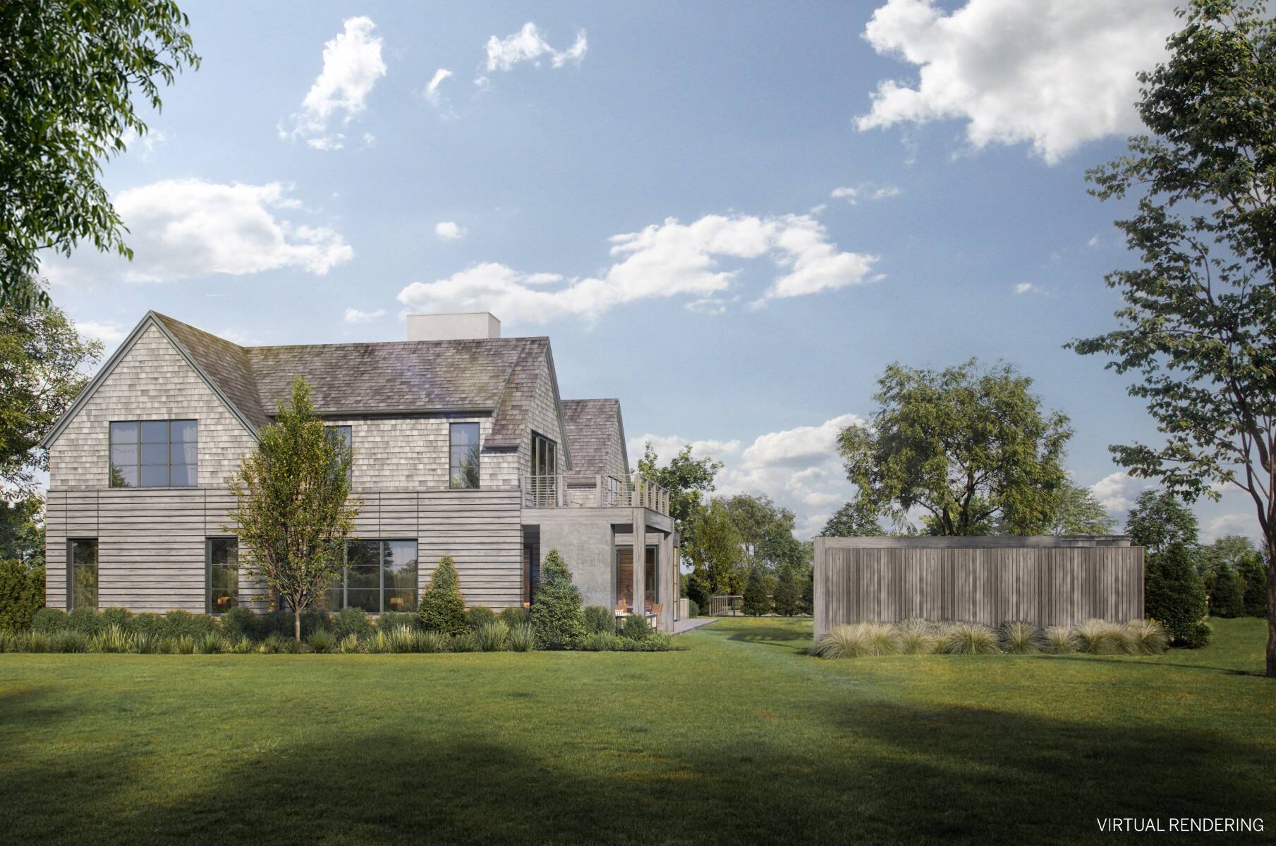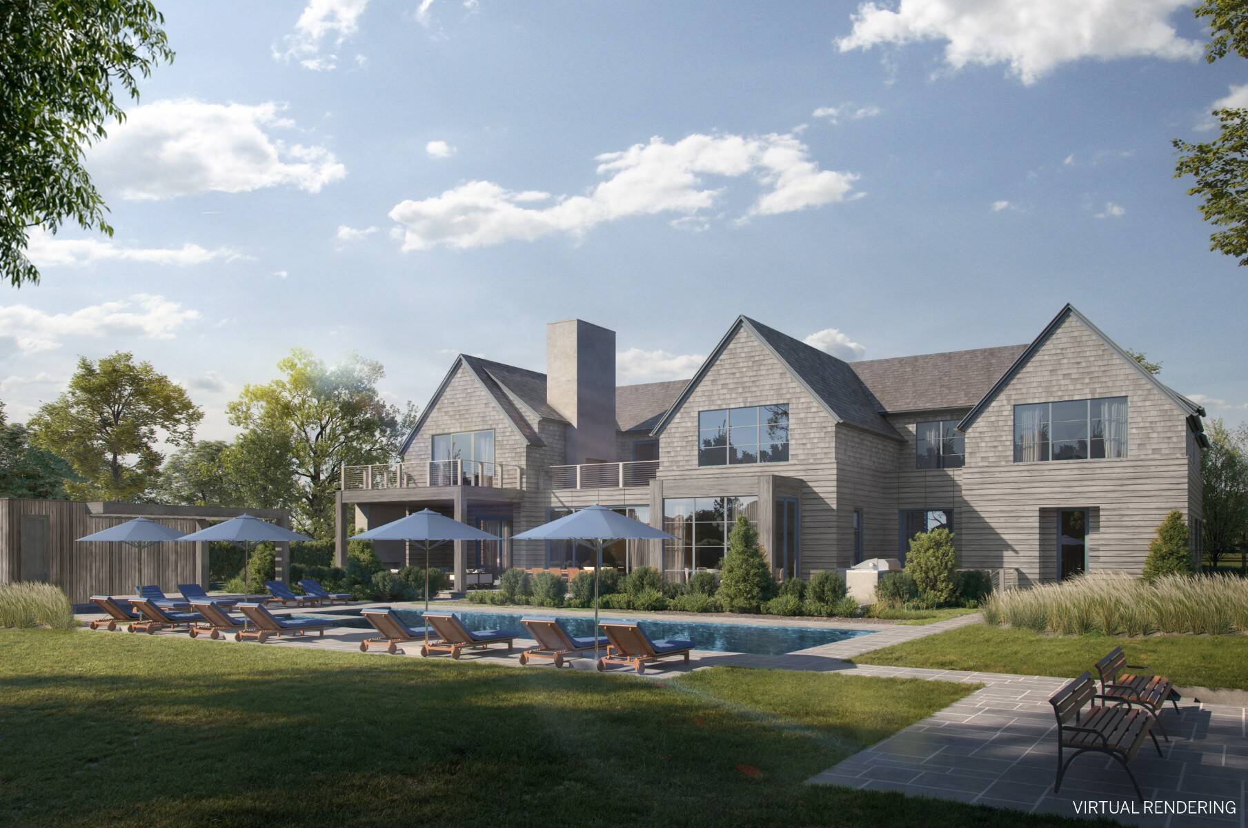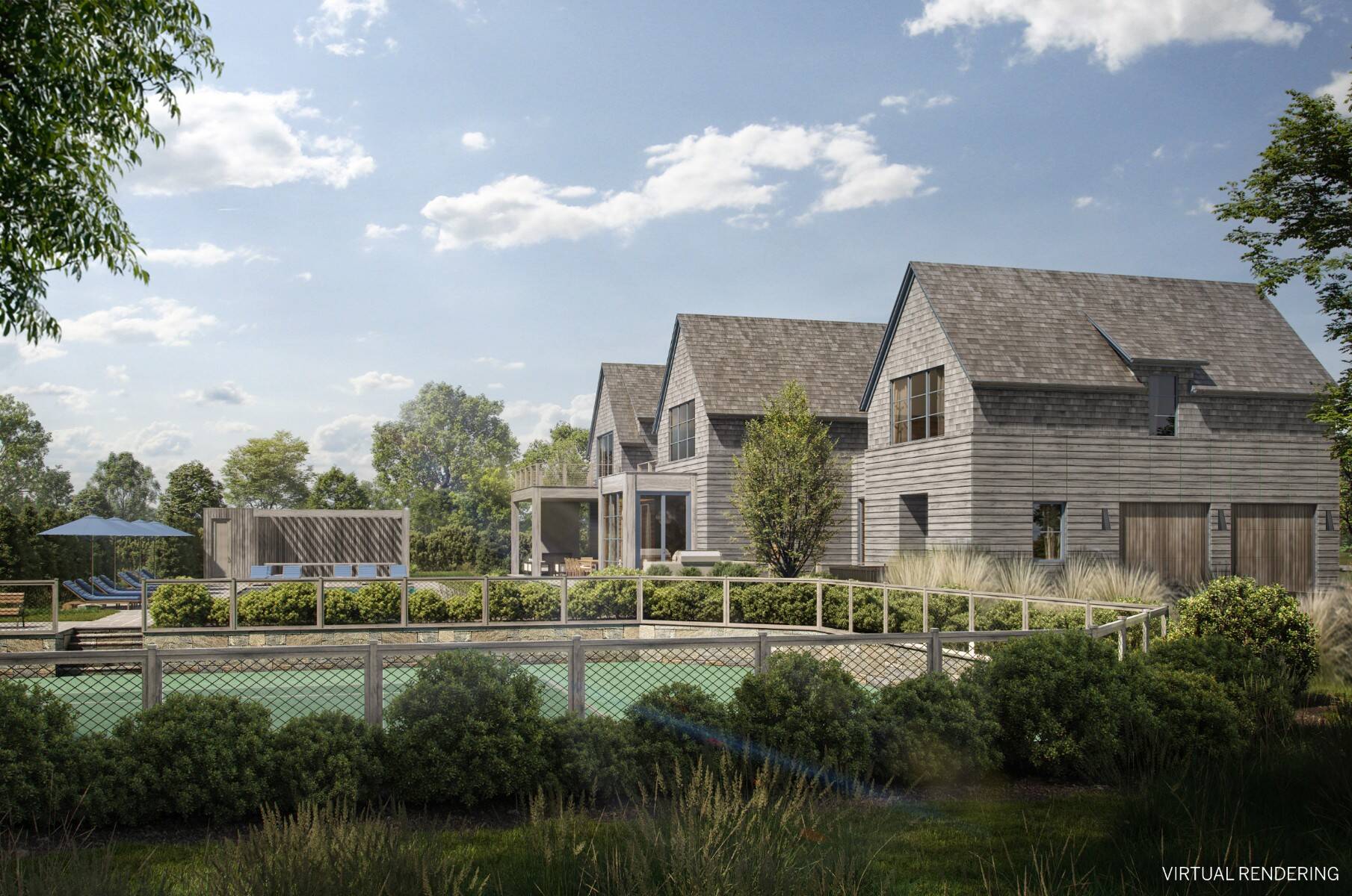 Situated on one of Sagaponack's most coveted lanes South of the Highway, this newly constructed estate offers approximately 9,700 square feet of living space, complemented by 1,157 square feet of accessory structures. Thoughtfully designed for both luxury living and entertaining, the home features 8 bedrooms, 9 full baths, and 3 half baths across three levels, all serviced by an elevator. A grand foyer welcomes you into expansive living spaces, including an oversized chef's kitchen with breakfast nook that opens seamlessly to the great room, highlighted by a 60 inch wood burning fireplace. Formal dining with butler's pantry, along with a separate family room leading to a covered porch with gas fireplace, creates multiple areas for gathering. A first floor secondary primary suite provides ideal accommodations for guests, along with a mudroom, laundry, and direct access to the two car garage. The second floor is anchored by an oversized primary suite featuring a masonry fireplace, private terrace, spa like bath, and two walk in closets. Three additional en suite bedrooms, an outdoor common terrace with gas fireplace, and a second laundry complete the level. The lower level is designed for recreation and wellness, offering a large entertaining room with sit down bar, theater, and a full gym with wellness bath including sauna, steam, and cold plunge. Three additional en suite bedrooms complete this level. Outdoor amenities rival a private resort, featuring a sunken all weather tennis court, a 50 foot pool with spa, and a pool house with pergola, wet bar, bathroom, and outdoor shower. Expansive patio areas provide the perfect setting for outdoor entertaining. Scheduled for completion February 2027, with the opportunity to be in by early next year. Ideally located just moments from Sagg Store and approximately one mile to Town Line Beach, this is a rare opportunity to secure a brand new Sagaponack South estate in a premier location.