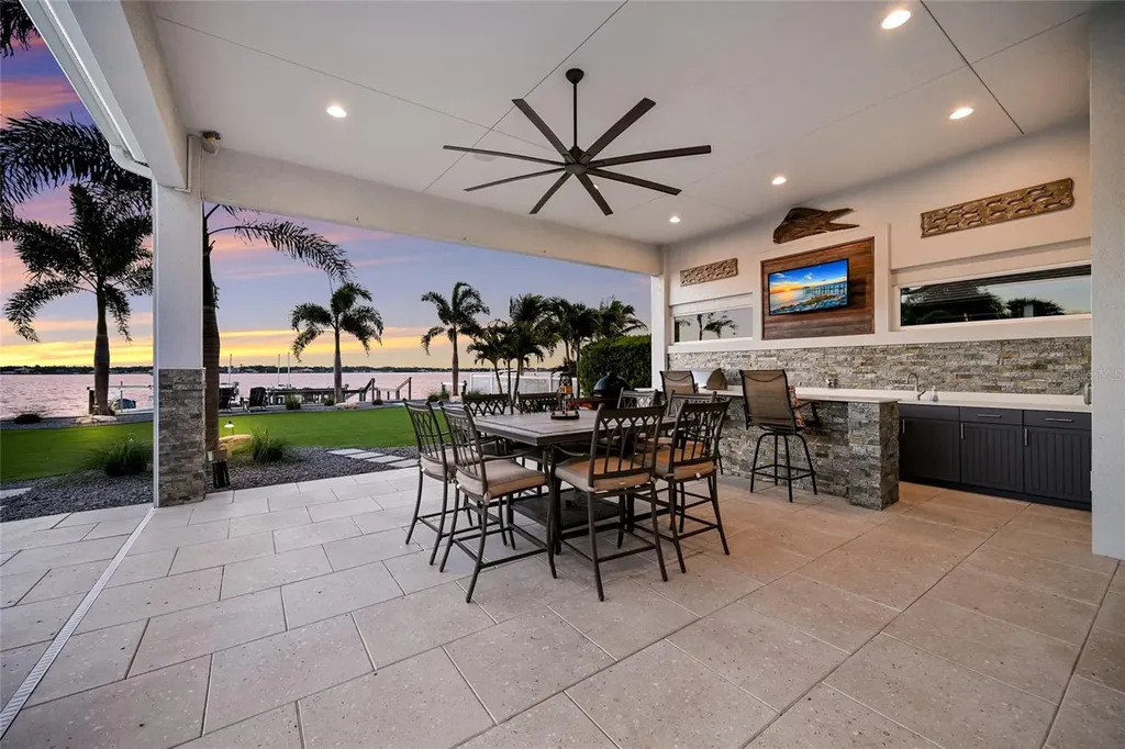 An extraordinary opportunity to own over 4,100 square feet of refined, single-level living on direct open water, complete with a private dock set against a breathtaking waterfront backdrop. Located within the exclusive, double-gated enclave of The Reserve at Harbour Walk on the Manatee River, this exceptional 2021-built estate offers the pinnacle of privacy, elegance, and coastal sophistication. From the moment you enter through the striking glass entry, you are welcomed by sweeping, unobstructed water views and a light-filled interior designed to impress. Professionally decorated with impeccable attention to detail, the home is offered furnished with an acceptable offer-presenting a true luxury experience. The grand vaulted living room showcases a sleek fireplace feature wall and a seamless blend of contemporary design and relaxed elegance. Expansive hurricane-impact windows and pocketing sliding glass doors seamlessly connect indoor and outdoor living spaces, while providing both beauty and peace of mind. The owner's suite is a tranquil retreat, perfectly positioned to capture serene water vistas and complemented by a spacious walk-in closet. The spa-inspired bath features upscale finishes, dual vanities, and an oversized walk-in shower with a soaking tub enclosure. Guest accommodations are thoughtfully designed for comfort and privacy, each with adjacent baths. An expansive bonus room elevates the home's entertainment appeal, complete with a wet bar, kegerator, and refrigerator-perfect for hosting while enjoying spectacular sunset views. A private office offers flexibility and can easily serve as a fourth bedroom. Outdoors, two generous lanai areas provide the ultimate waterfront lifestyle experience, enhanced by electric storm screens for added protection and comfort. A full outdoor kitchen, bar seating, and ample lounging space create an inviting setting to enjoy panoramic water views, vibrant sunsets, and abundant wildlife. The private dock is equipped with two boat lifts (30,000 lb and 10,000 lb), offering direct access to the Intracoastal Waterway and the Gulf, with waterfront dining and marinas just moments away. Further enhancing the home's quality and resilience is a whole-house generator, ensuring uninterrupted comfort year-round. Residents of The Reserve at Harbour Walk enjoy a premier lifestyle with a guarded entrance, additional gated security, tennis courts, walking trails, kayak launch, playground, and observation pier. Ideally situated near I-75, upscale shopping and dining, world-renowned beaches, major airports, and IMG Academy, this residence embodies the very best of luxury waterfront living. This is a rare opportunity to own a fully curated waterfront retreat and experience Florida coastal living at its finest.