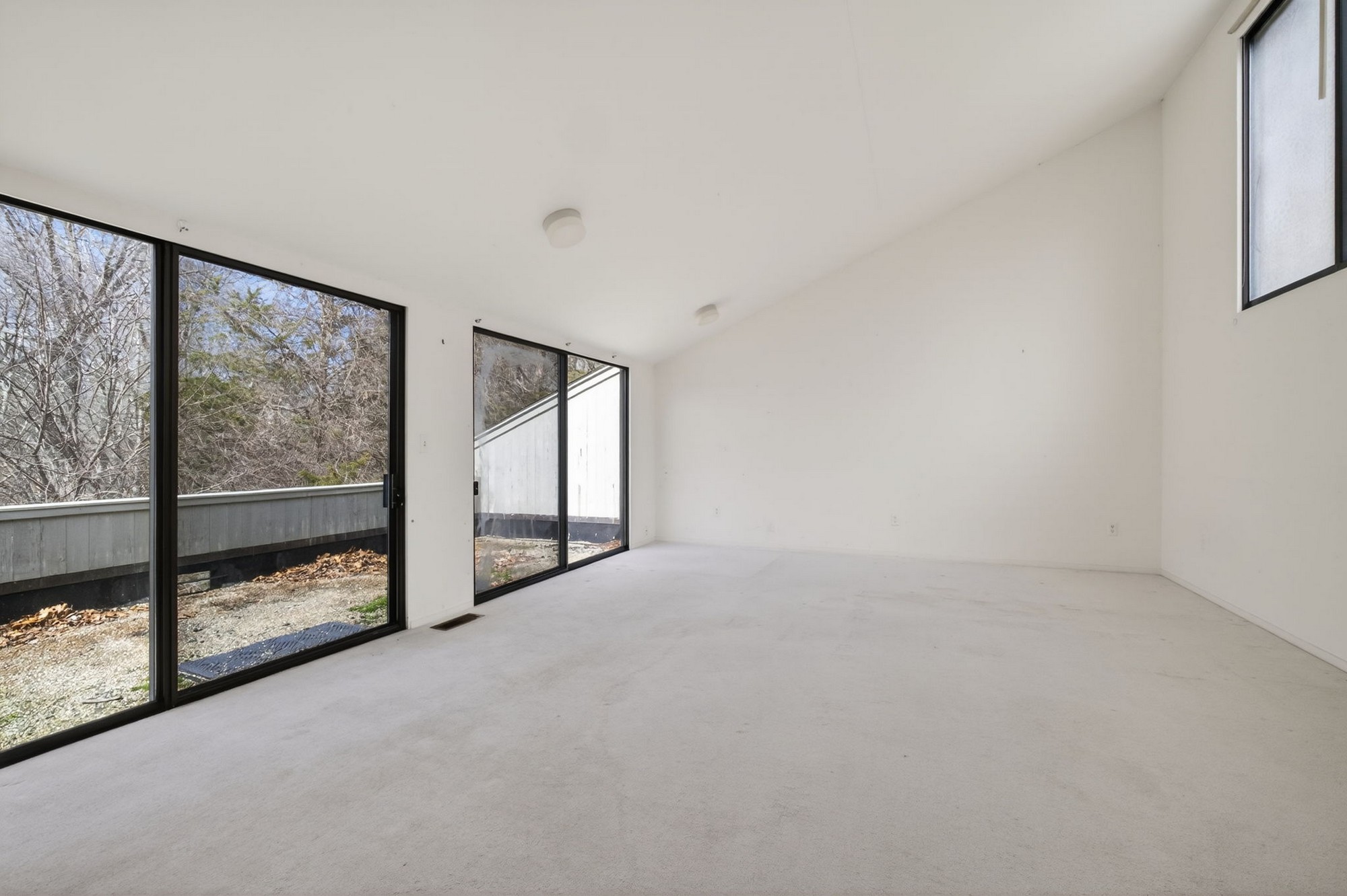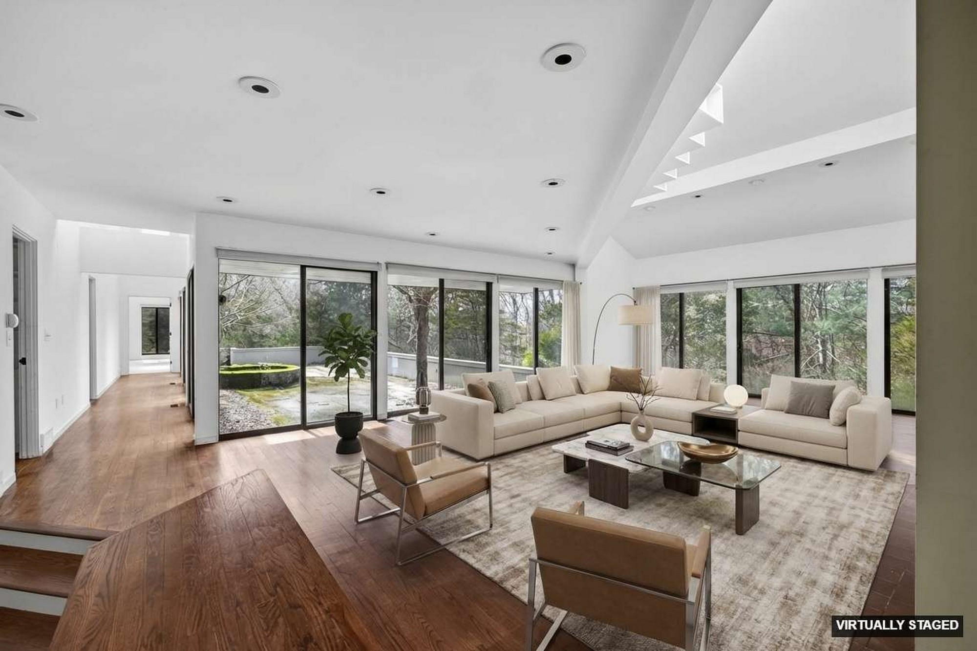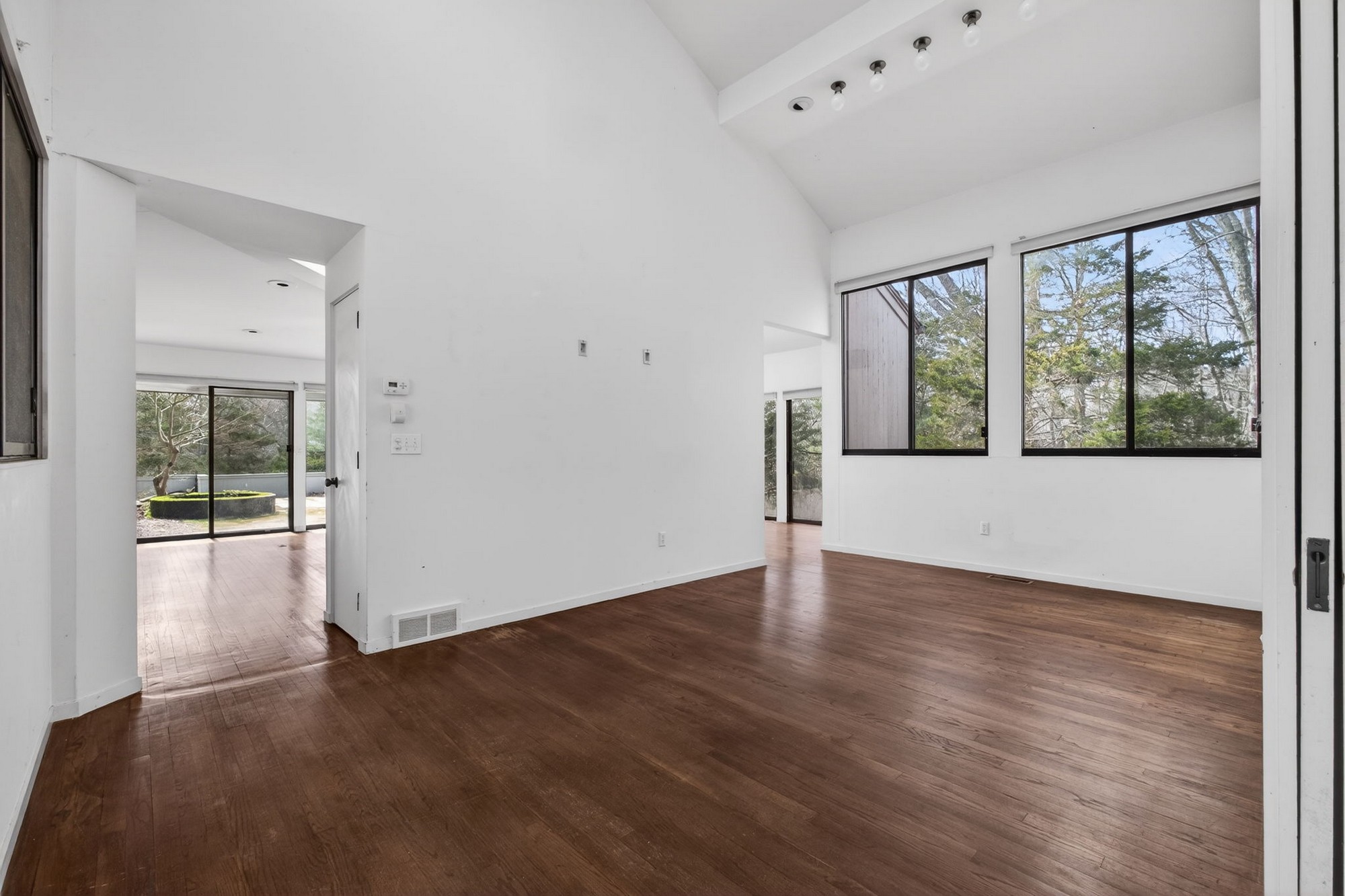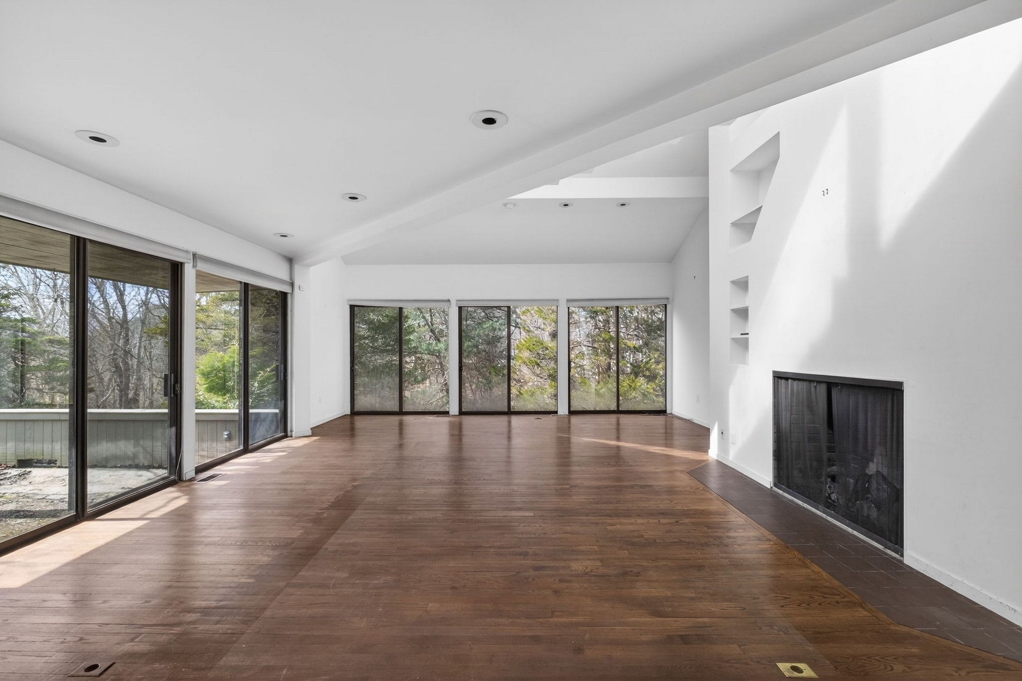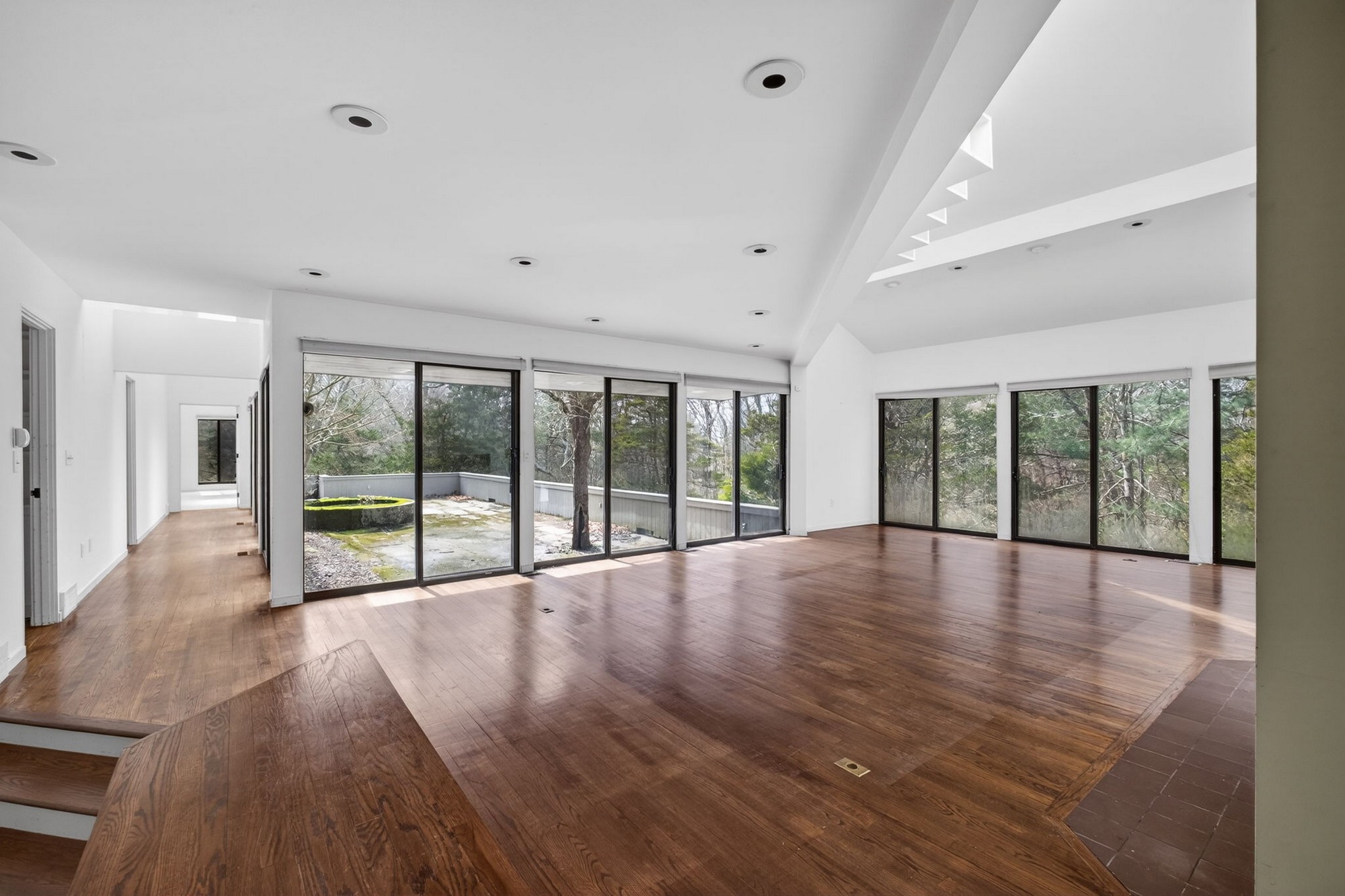 Modernist Elegance - Discover a master class in Mid-Century Modern design by Charles Moore, one of the founders of Centerbrook Architects and Dean of the school of architecture at Yale. Tucked away on 5.88 private, wooded acres near the historic heart of Old Lyme Village. Built in 1972, this 3,971-square-foot contemporary estate is a rare architectural find, where bold geometric forms meet the tranquil beauty of the Connecticut shoreline. The journey begins in the large foyer leading to the expansive living room, a soaring centerpiece defined by cathedral ceilings and a wall of glass sliders. This transparent boundary invites the outdoors in, leading you directly to a stone patio and "garden room" courtyard-an intentional architectural transition designed for effortless indoor-outdoor entertaining. From the main gallery, the home flows into a large, modern culinary hub featuring a sun-drenched eat-in area with a custom built-in banquet, perfect for slow mornings. For quieter moments, the private library offers a sanctuary of refined comfort, complete with rich hardwood floors and floor-to-ceiling built-in bookcases. The main level is anchored by a large primary retreat, a space designed for ultimate convenience with its own private sitting room and a sprawling, boutique-style walk-in dressing room. Upstairs, the architectural drama continues with two additional bedrooms-each boasting their own cathedral ceilings-connected by a classic Jack & Jill bath