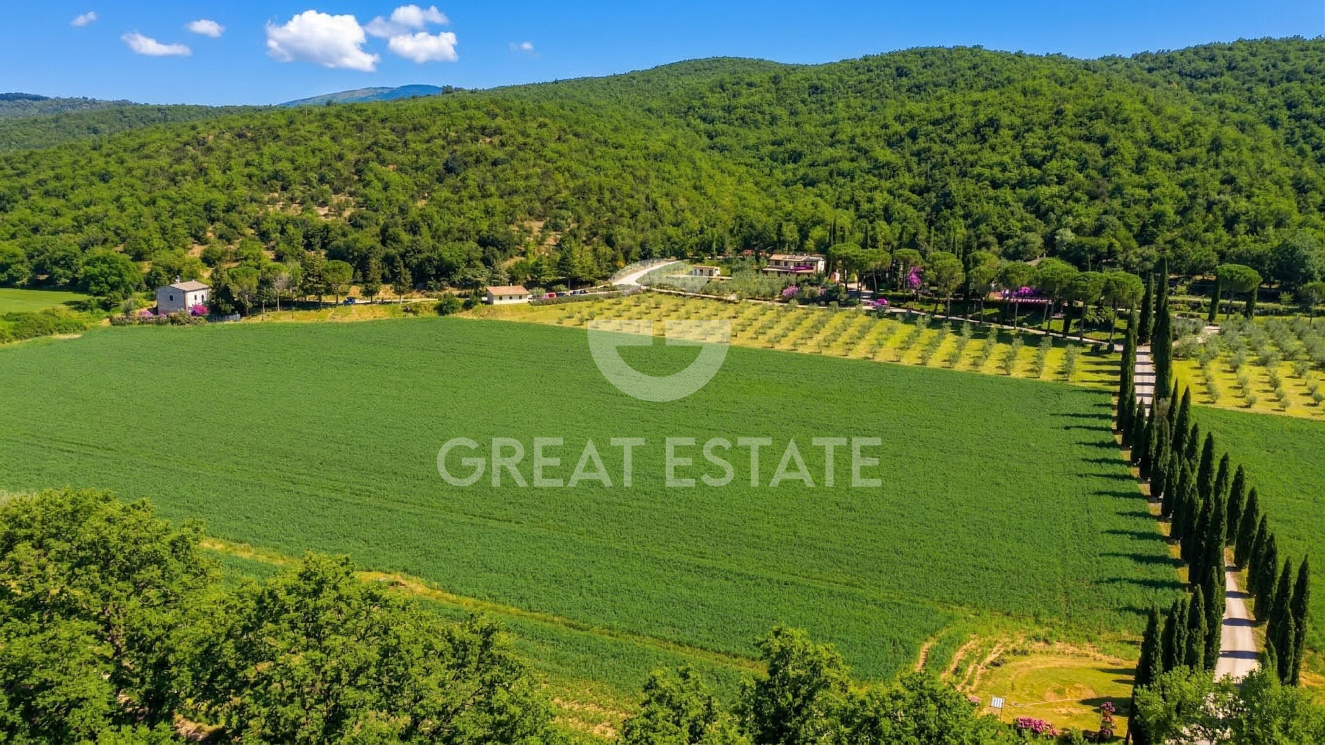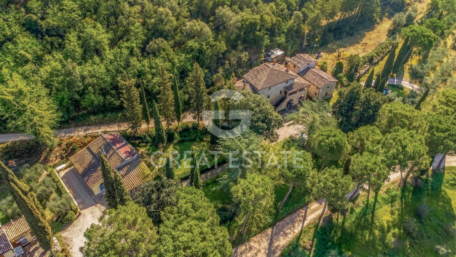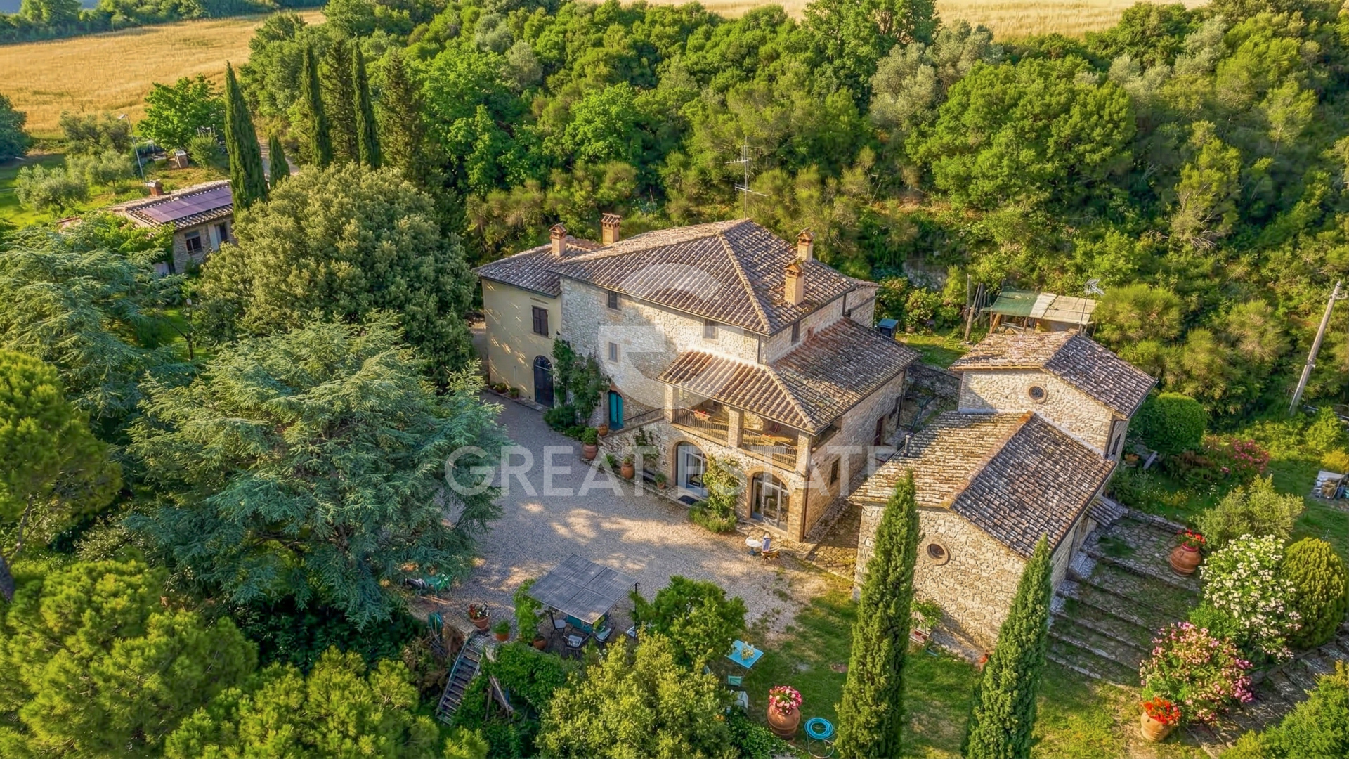 This small estate, hidden among the trees and backed by a hillside, enjoys a secluded position while at the same time being very close to a town offering all essential services. It is reached via a road in excellent condition which, leaving the town and following a beautiful cypress-lined avenue, leads to the hamlet. In just a moment it feels as though you have traveled miles, as you suddenly find yourself immersed in the countryside, surrounded by green fields and complete tranquility. The estate is composed of 7 buildings, of which 5 are residential properties, one used as an office and garage with a swimming pool alongside, and one serving as a pool house. The property is ideal for those wishing to establish an agriturismo business or simply to use the main residence as a private home and generate long-term rentals. It is surrounded by a total of 1.47 hectares classified as urban land and a further 19.09 hectares of agricultural land with extensive flat arable fields. The houses are arranged as follows: - Plastered residential house built in 2017/2018 with a portico and arranged over two above-ground floors connected by an internal staircase, comprising entrance hall, spacious living room, kitchen, bathroom and storage room, 3 bedrooms of which 2 have en suite bathrooms, an additional bathroom and hallway. - Stone farmhouse dating back to the late 1800s and restored in the 1990s, arranged over two above-ground floors connected by an external staircase and divided into two apartments. On the ground floor, an apartment consisting of living room, eat-in kitchen, 2 bedrooms, 2 bathrooms, two storage rooms (one with external access), hallway, pizza oven and a loggia. The first-floor apartment comprises living room, kitchen, dining room, study, 2 bedrooms, 2 bathrooms, a storage room and a terrace. - Stone residential house, partially plastered, built in the late 1800s and renovated in 2022, arranged on one above-ground floor, composed of eat-in kitchen, living room, one bedroom, two bathrooms, hallway and a portico. - Stone residential house built in the late 1800s and renovated in the 1990s, arranged over three above-ground floors connected by an internal staircase, comprising kitchen, living room, 3 bedrooms, two bathrooms and hallway. - Stone residential house built in the 1400s and renovated in the 1990s, arranged over two above-ground floors connected by an internal staircase, comprising living room with kitchen, bedroom and bathroom. - Plastered annex for office/garage use built in 2017/2018 on one above-ground floor with two large rooms and a bathroom. - Plastered pool house built in 2017/2028 with a large room and a storage room/bathroom. - Swimming pool built in 2027/2018. The land is divided as follows: 4.398 hectares of coppice woodland, 1.789 hectares of arable land, 6.178 hectares of arable land with trees, 2.187 hectares of olive grove, 0.492 hectares of wooded pasture, 4.047 hectares of mixed woodland.