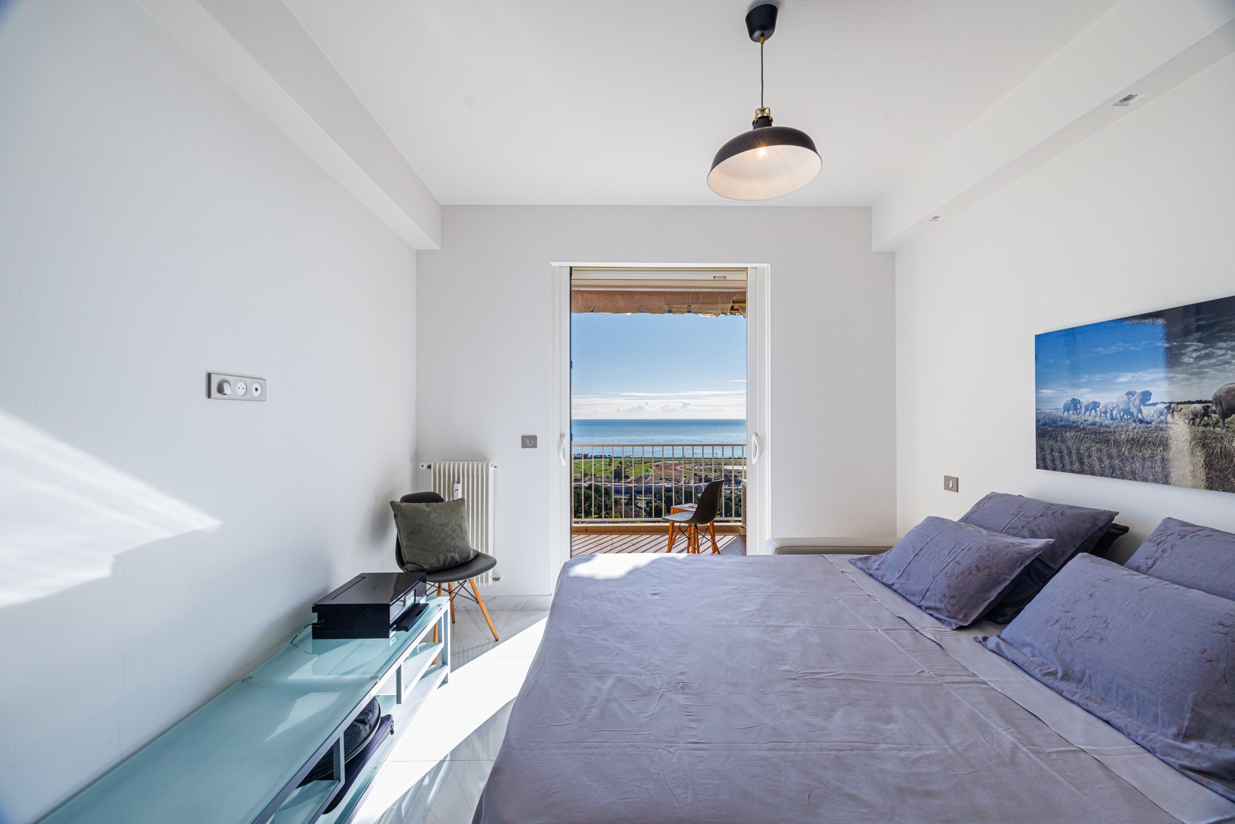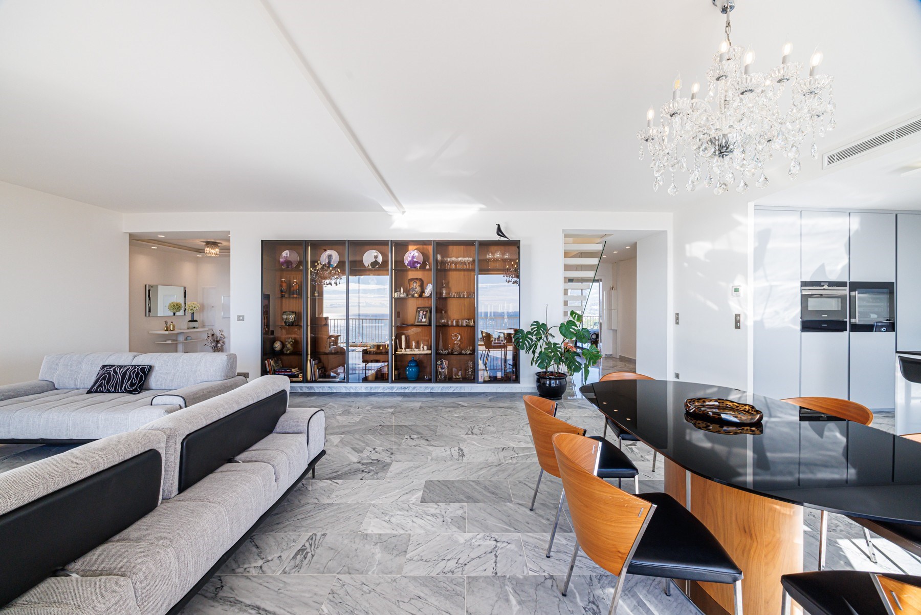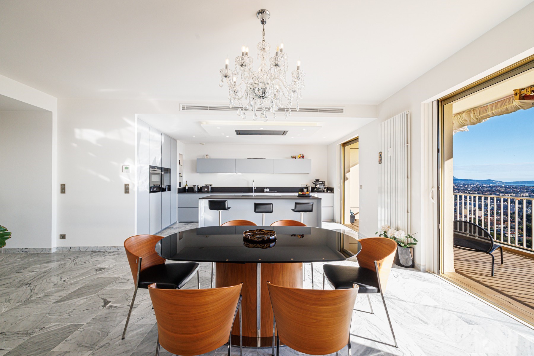 Penthouse for sale, Domaine du Loup, Cagnes-sur-Mer – 135 m², panoramic sea view Atop the Domaine du Loup, this 135 m² Carrez-law penthouse features over 100 m² of outdoor space with 180° panoramic views of the Mediterranean, from Cap Ferrat to Cap d’Antibes, including the Côte d’Azur Racecourse. The 65 m² living area is bright and opens onto a 32 m² terrace. The open-plan contemporary kitchen is designed around a central island and extends the reception space. A rear terrace of 13 m² connects to a utility and laundry area. An internal staircase leads to the private rooftop of 51 m² with solarium, jacuzzi, summer kitchen, and a 17 m² veranda with bathroom, usable as an independent bedroom or lounge. The Domaine du Loup is a 22-hectare secured residential estate with an Olympic pool, tennis courts, and shops. Close to beaches, Nice, and its airport. Contact Côte d’Azur Sotheby’s International Realty for more information.