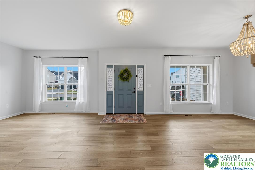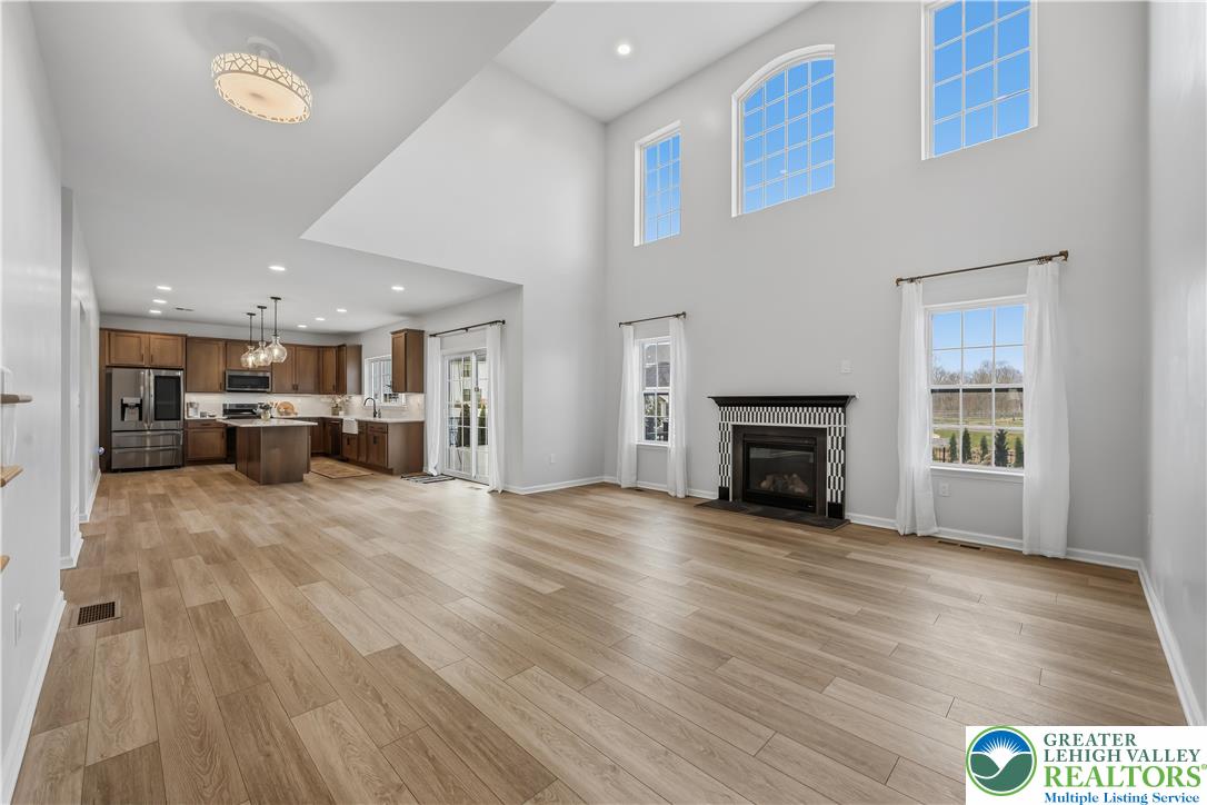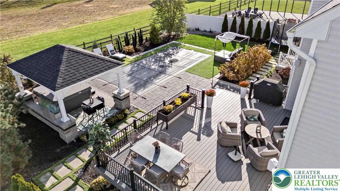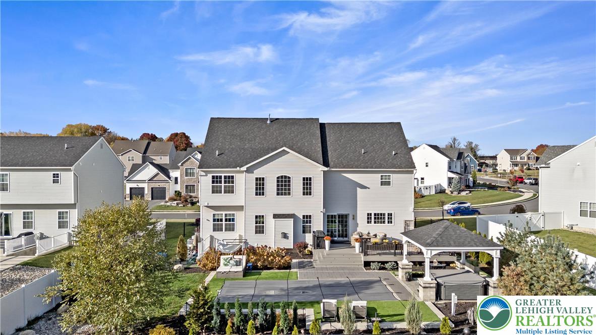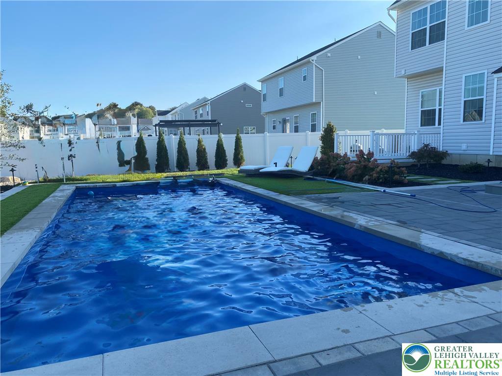 Welcome to 155 Barrall Street, a beautifully upgraded, 4 year young home in the highly sought after Nazareth School District. Offering over 4,000 sq ft, this open concept home features a dramatic two story great room with gas fireplace, leading to a fully equipped kitchen with upgraded appliances, gas stove, extended island with quartz countertops, marble mudroom floor, and pocket door pantry. The owner's suite, one of four spacious bedrooms, includes a sitting area and two massive walk in closets, while 4.5 baths and a separate second floor laundry provide ultimate convenience. The fully finished basement adds versatility with a wet bar, full bath, double door walkout to the backyard, and additional unfinished space for storage, housing the tankless water heater and furnace. Other upgrades include a finished polyurea garage floor with ample storage. Step outside to your backyard oasis, fully fenced and backing to a retention pond for an open, unobstructed setting with no homes directly behind. Enjoy a heated fiberglass in ground pool with automatic saltwater system, hot tub, expansive composite deck, custom gazebo with built in electrical outlets, and extensive hardscaping and landscaping. Landscape lighting transforms the space at night, creating a true resort style retreat perfect for summer entertaining. A rare opportunity in a well established neighborhood set within a charming, historic town, offering convenient access to major highways, shopping, dining, and medical services.