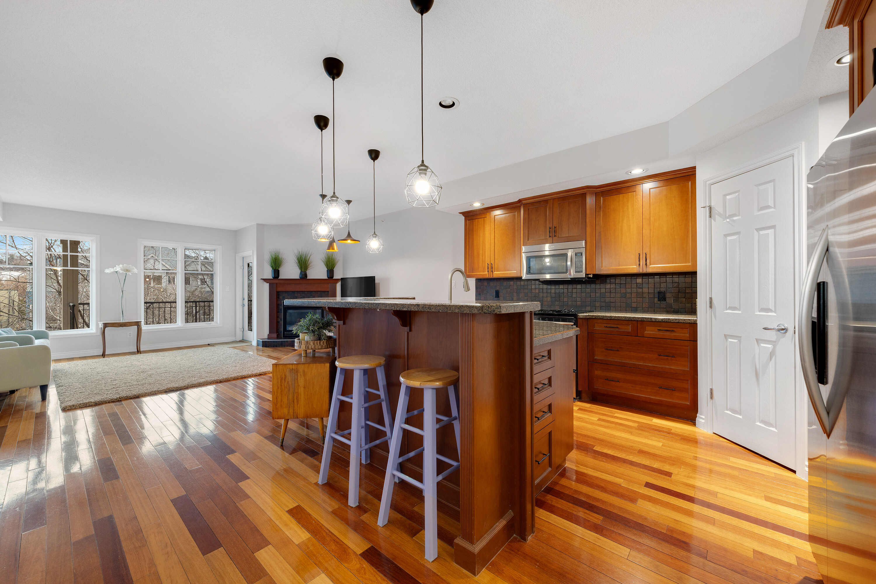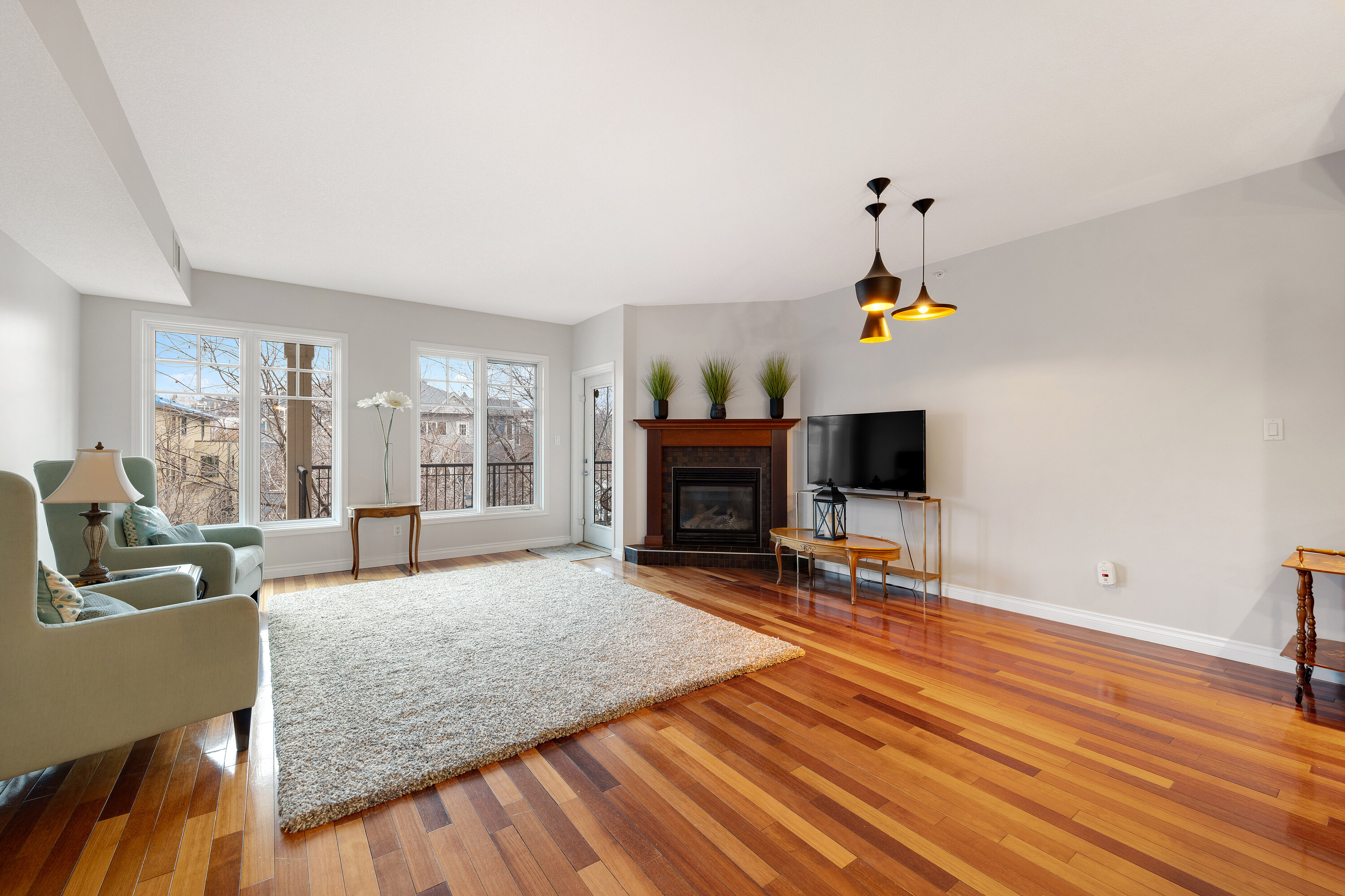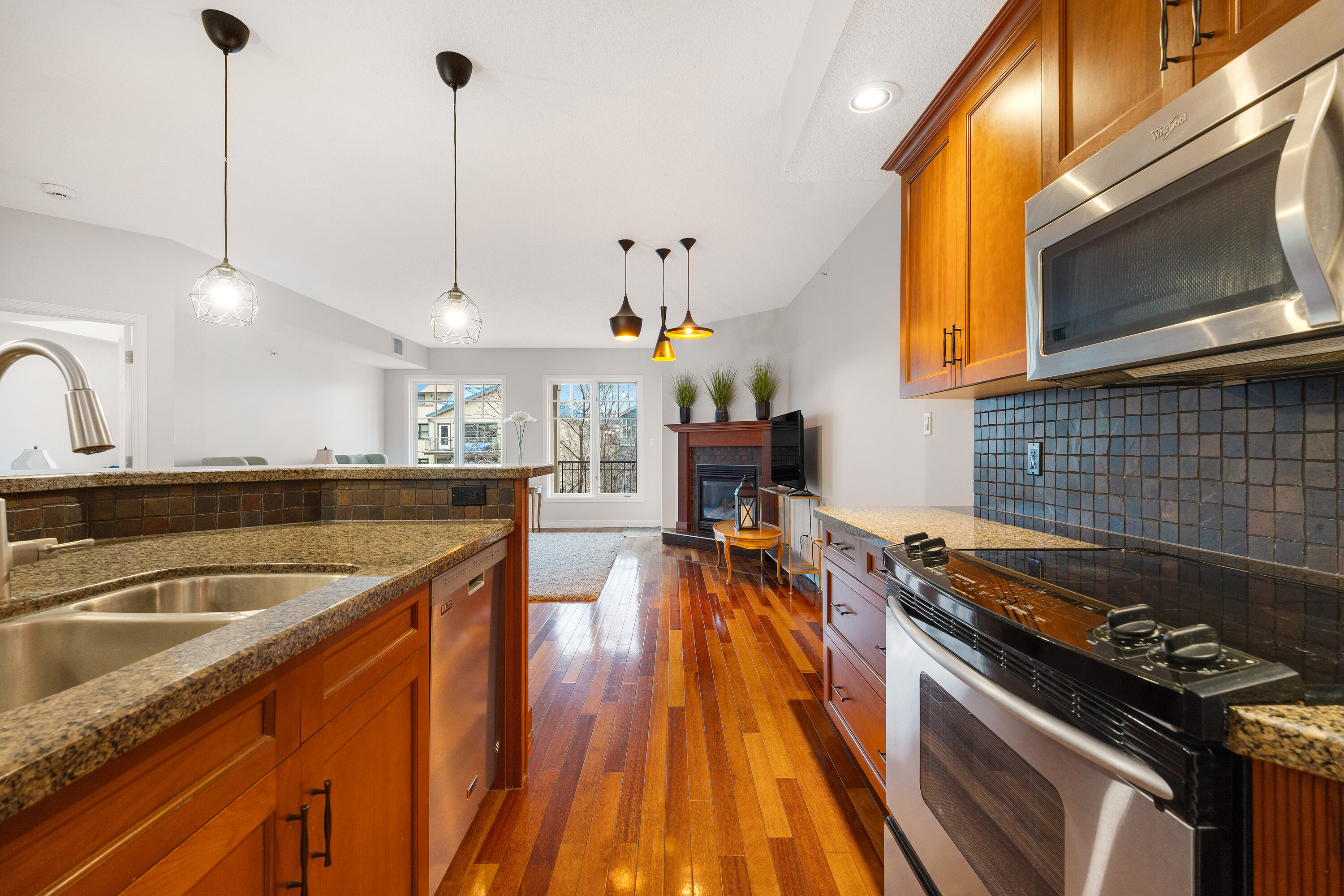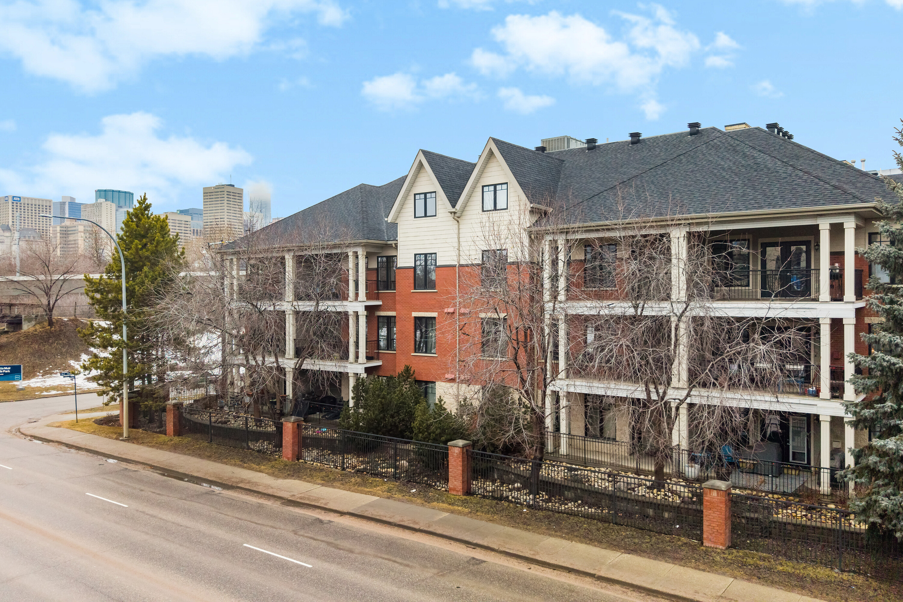 Located in a well-kept condo community beside Edmonton’s river valley, this top-floor home at The Landing offers a rare blend of comfort and immediate access to nature, with scenic trails functioning as your extended backyard. The suite provides over 1,100 square feet of single-level space with an open layout and warm Kempas hardwood flooring in the main living area. The kitchen includes cherrywood cabinets, granite countertops, stainless steel appliances, and a walk-in pantry, while a gas fireplace, upgraded lighting, and air conditioning enhance everyday living. The spacious primary bedroom features 20-foot vaulted ceilings, a walk-in closet, and an ensuite with a custom walk-in shower. A large deck with a gas hookup, underground parking, and access to the building’s fitness room add convenience, and with public transportation close by, this home offers both natural beauty and urban accessibility.
