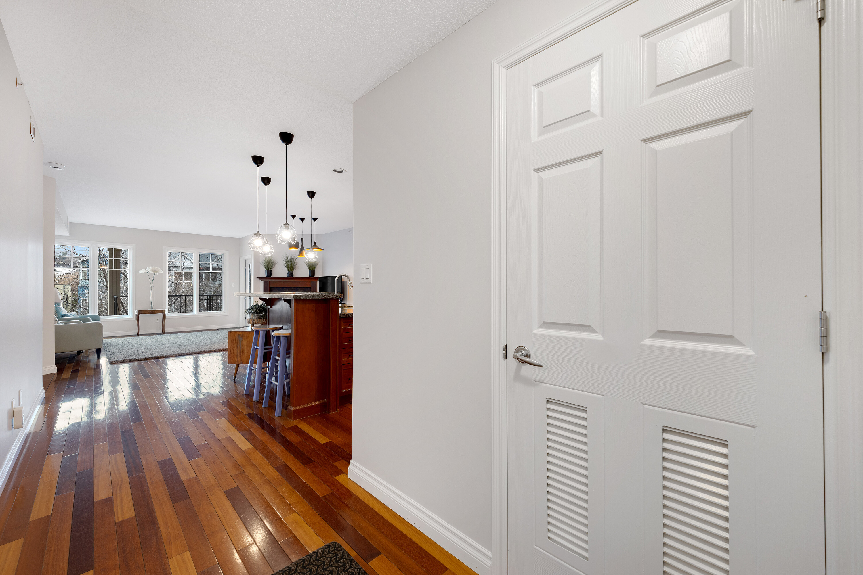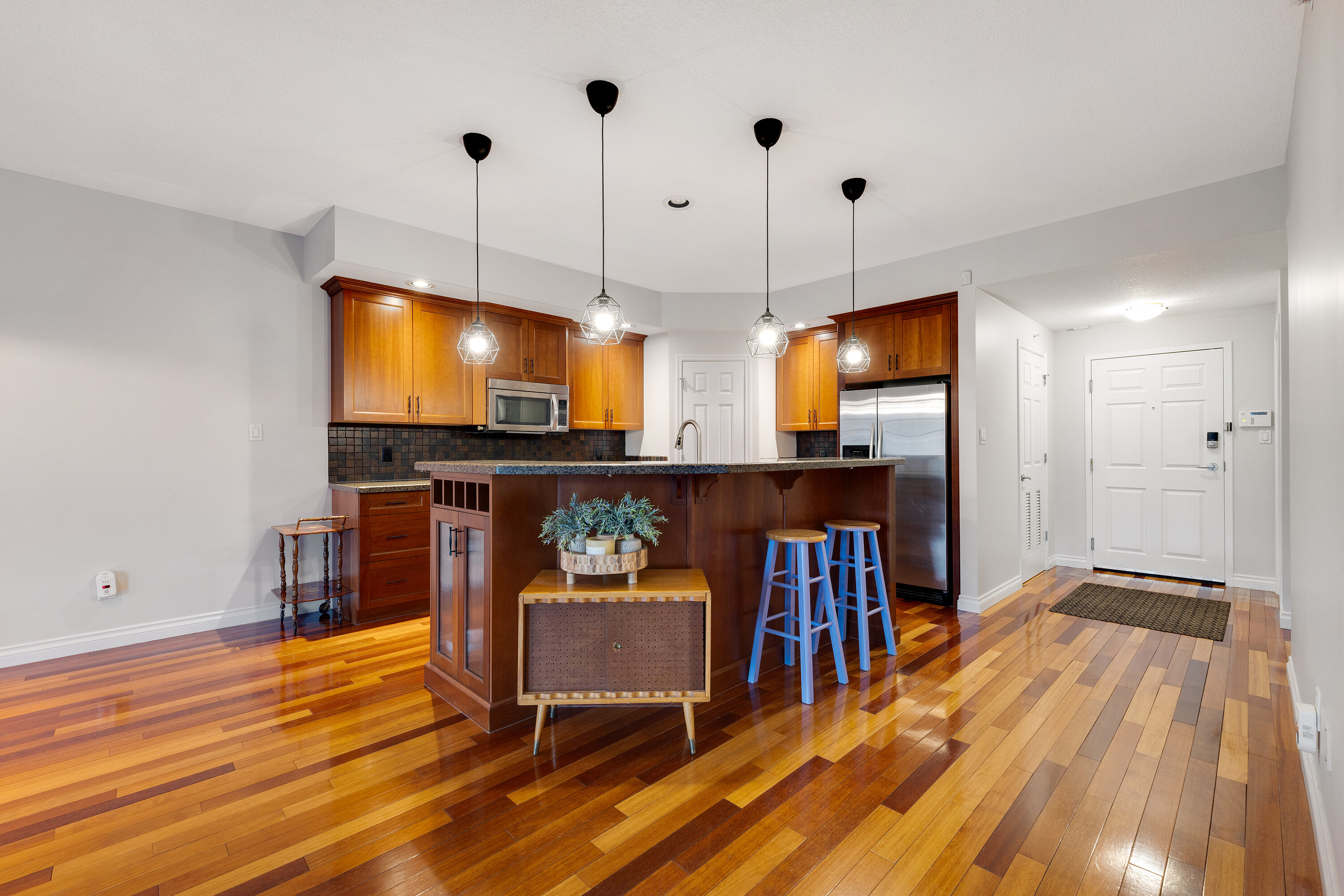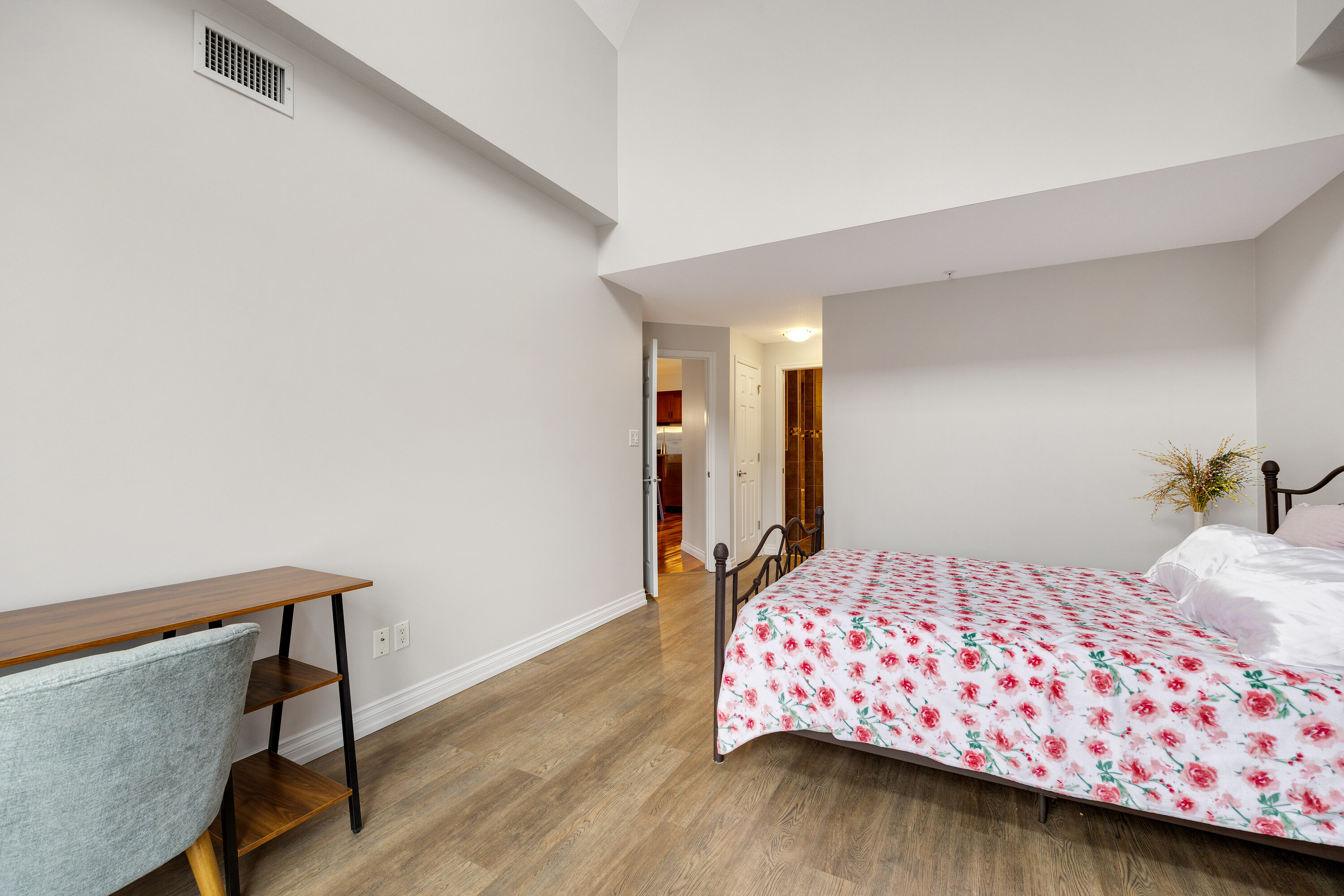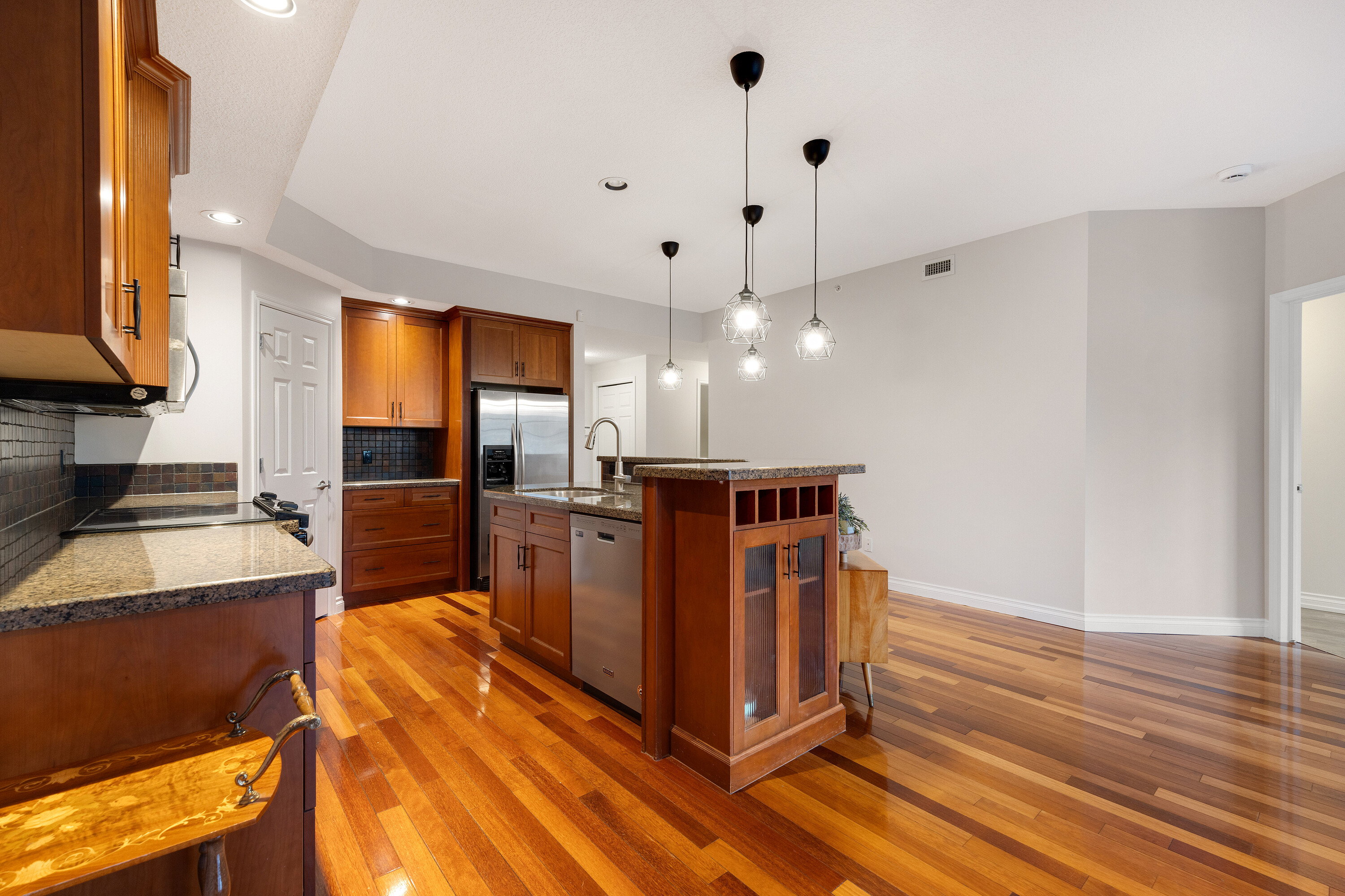 Located in a well-kept condo community beside Edmonton’s river valley, this top-floor home at The Landing offers a rare blend of comfort and immediate access to nature, with scenic trails functioning as your extended backyard. The suite provides over 1,100 square feet of single-level space with an open layout and warm Kempas hardwood flooring in the main living area. The kitchen includes cherrywood cabinets, granite countertops, stainless steel appliances, and a walk-in pantry, while a gas fireplace, upgraded lighting, and air conditioning enhance everyday living. The spacious primary bedroom features 20-foot vaulted ceilings, a walk-in closet, and an ensuite with a custom walk-in shower. A large deck with a gas hookup, underground parking, and access to the building’s fitness room add convenience, and with public transportation close by, this home offers both natural beauty and urban accessibility.