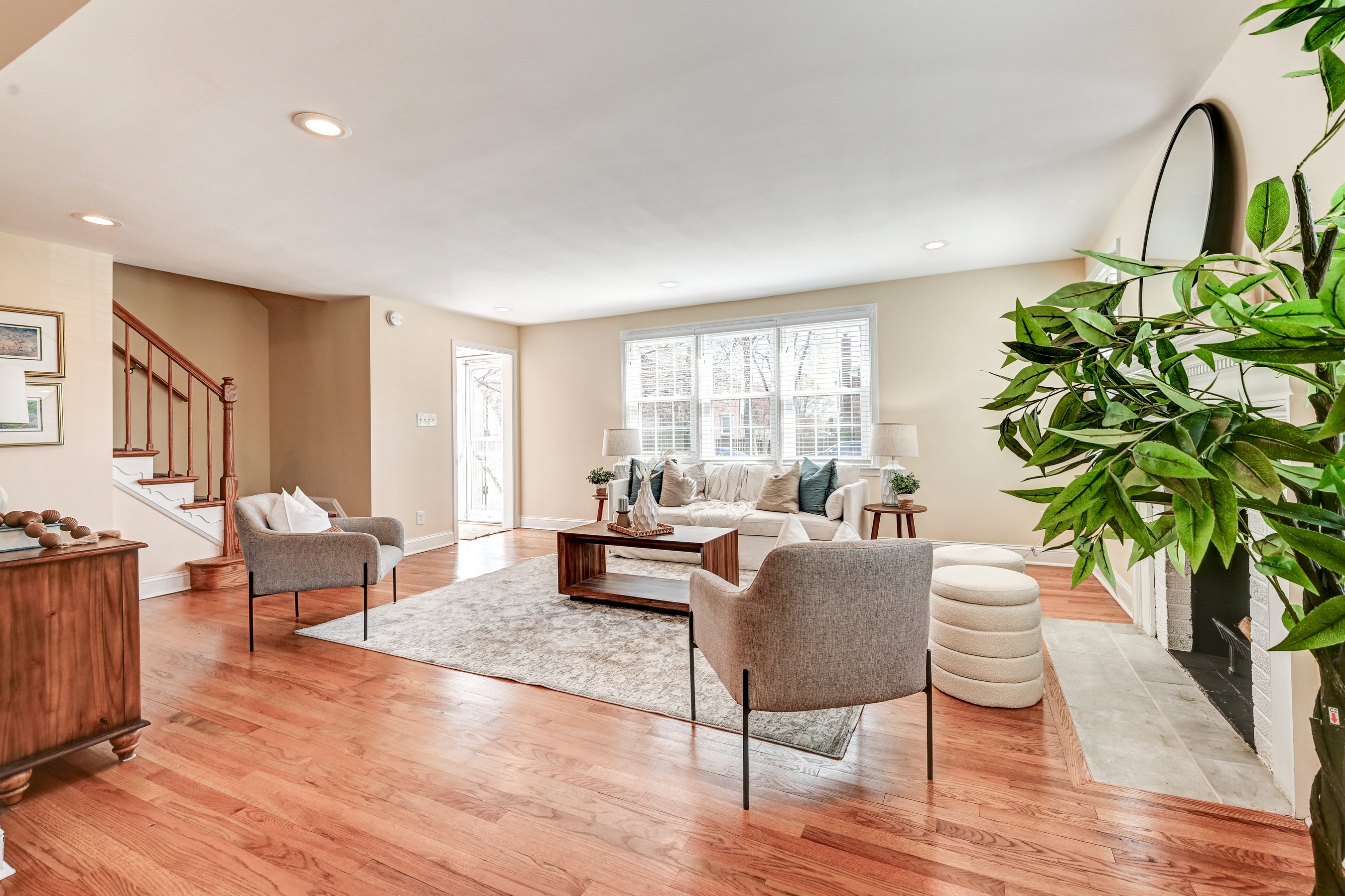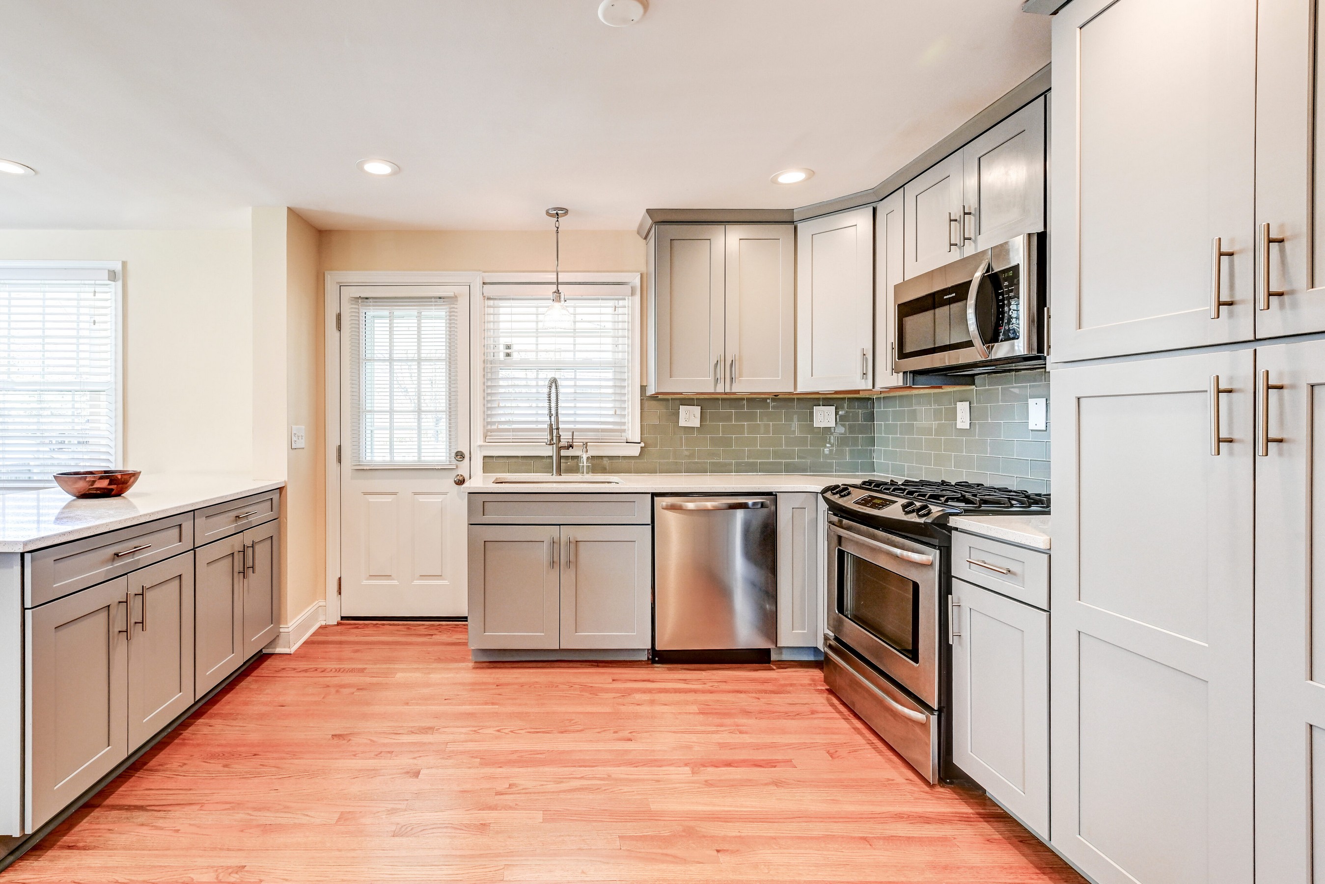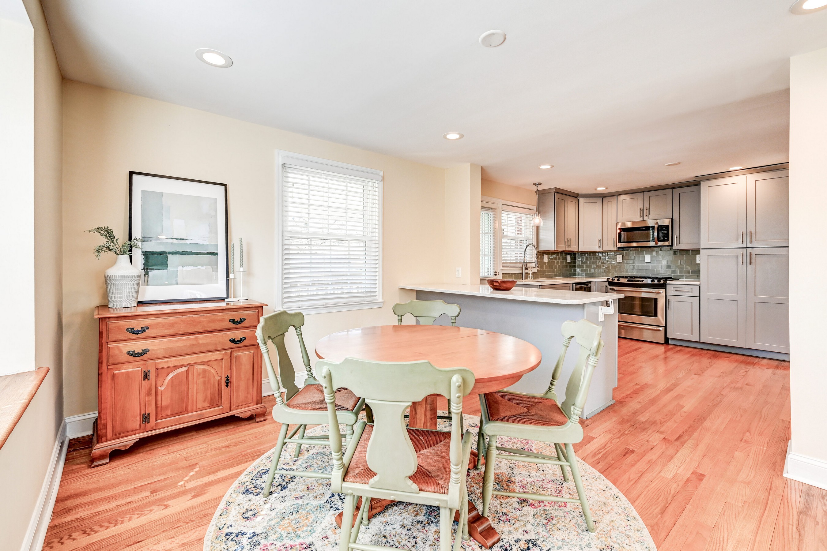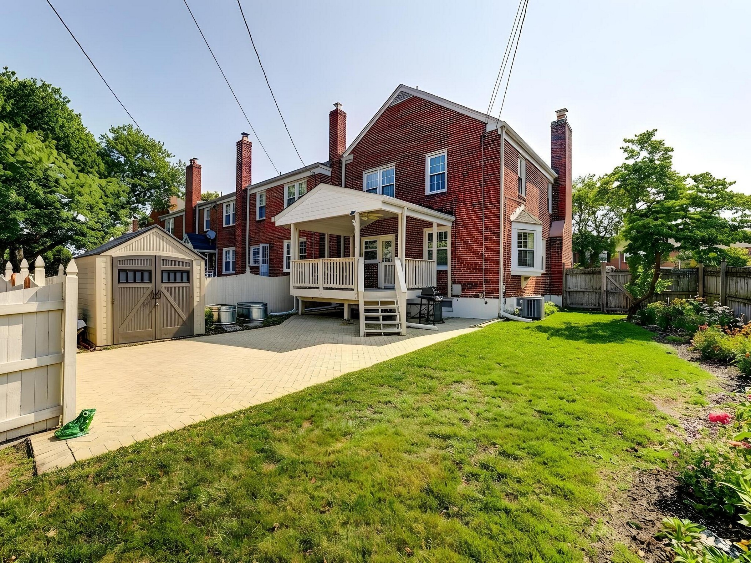 Completely Renovated in 2017, Very well maintained. Exceptional End of Group, Threee Bedrooms, 2 full bathrooms, open kitchen, and inviting living room opens into light filled dining room, with side bay window. Freshly Painted, Bright, clean and beautiful! Gleaming hardwood floors on the main level, and upper level. Full Finished Basement. .Kitchen includes quartz countertops, allowing extra seating space, under cabinet lighting, glass back splash, built-in Pantry, glass pendant lighting over sink, recessed lighting. From the open kitchen, step out onto the Large covered low maintenance Trex deck off the kitchen with ceiling fan. Hardscaped patio off of rear deck, Storage Shed within the Private fenced in back yard, garden space, beautifully landscaped with mature plants and dog wood tree. A second shed is large enough to store a lawn mower. New roof, HVAC, Hot Water Heater 2017, Replacement windows 2020, New Exterior Door 2025, New Carpet,!