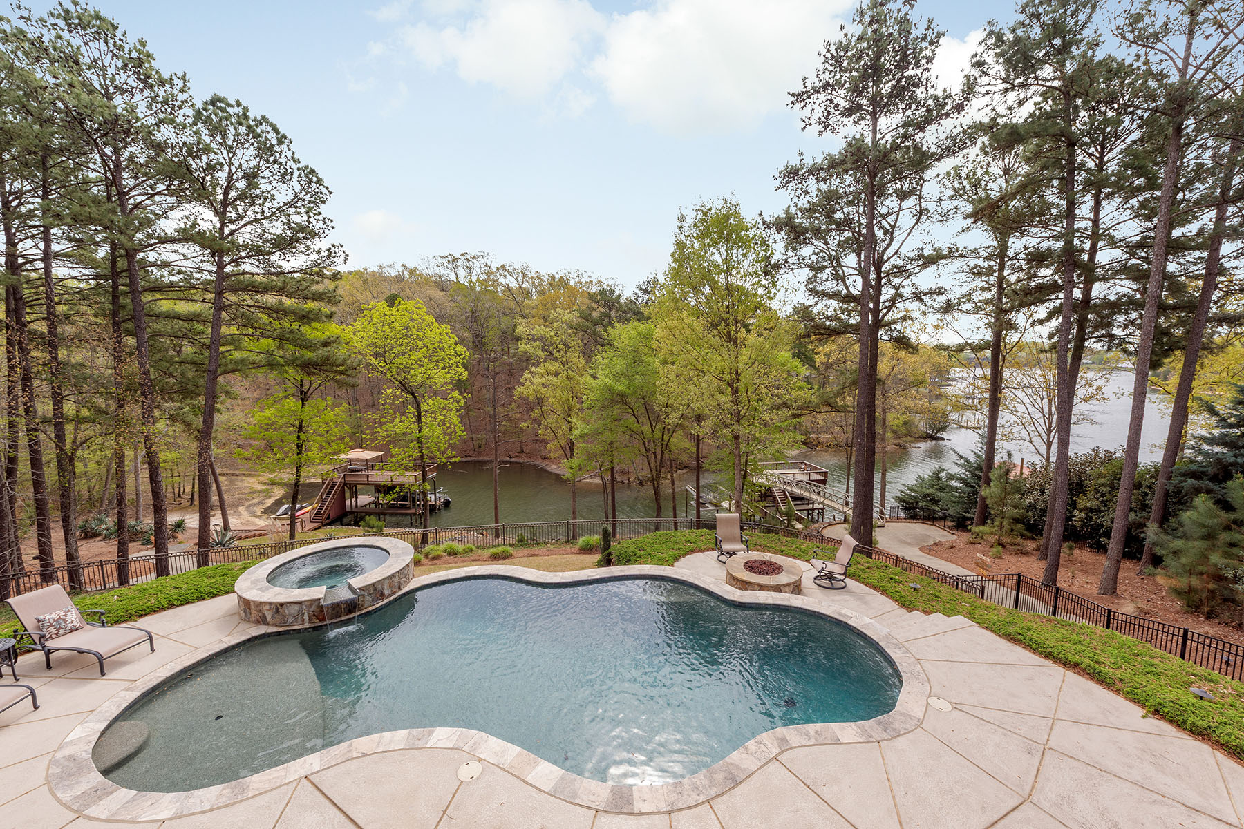 Outdoor living is equally impressive, featuring a resort-style in-ground pool with spa, hot tub, fire pit, and multiple covered and open-air spaces including a rear porch, deck, and patio—all overlooking serene water views. Enjoy direct lake access with a double-deck dock featuring a covered boat lift and two jet ski lifts on the lower level, plus a spacious upper-level entertaining area with breathtaking water views—perfect for relaxing or hosting on the lake.