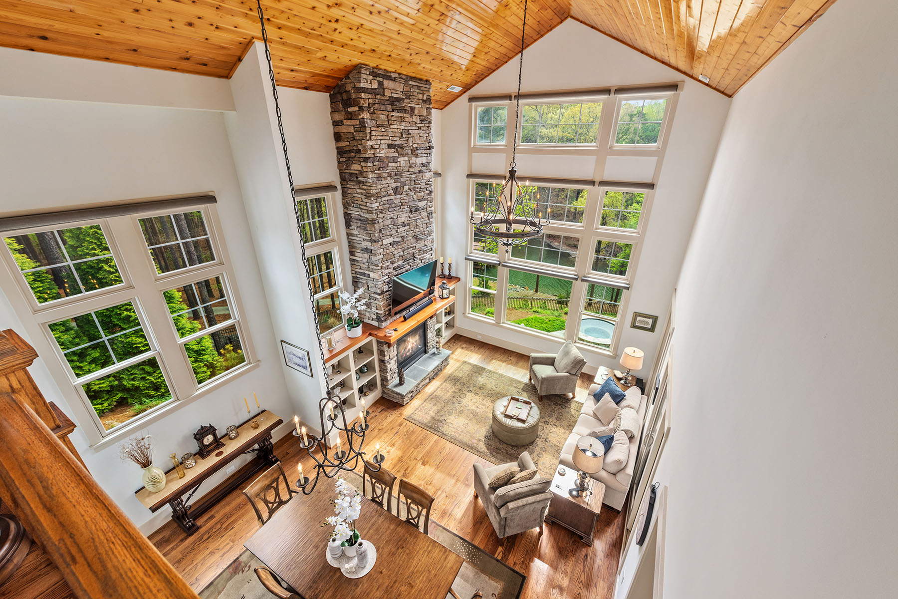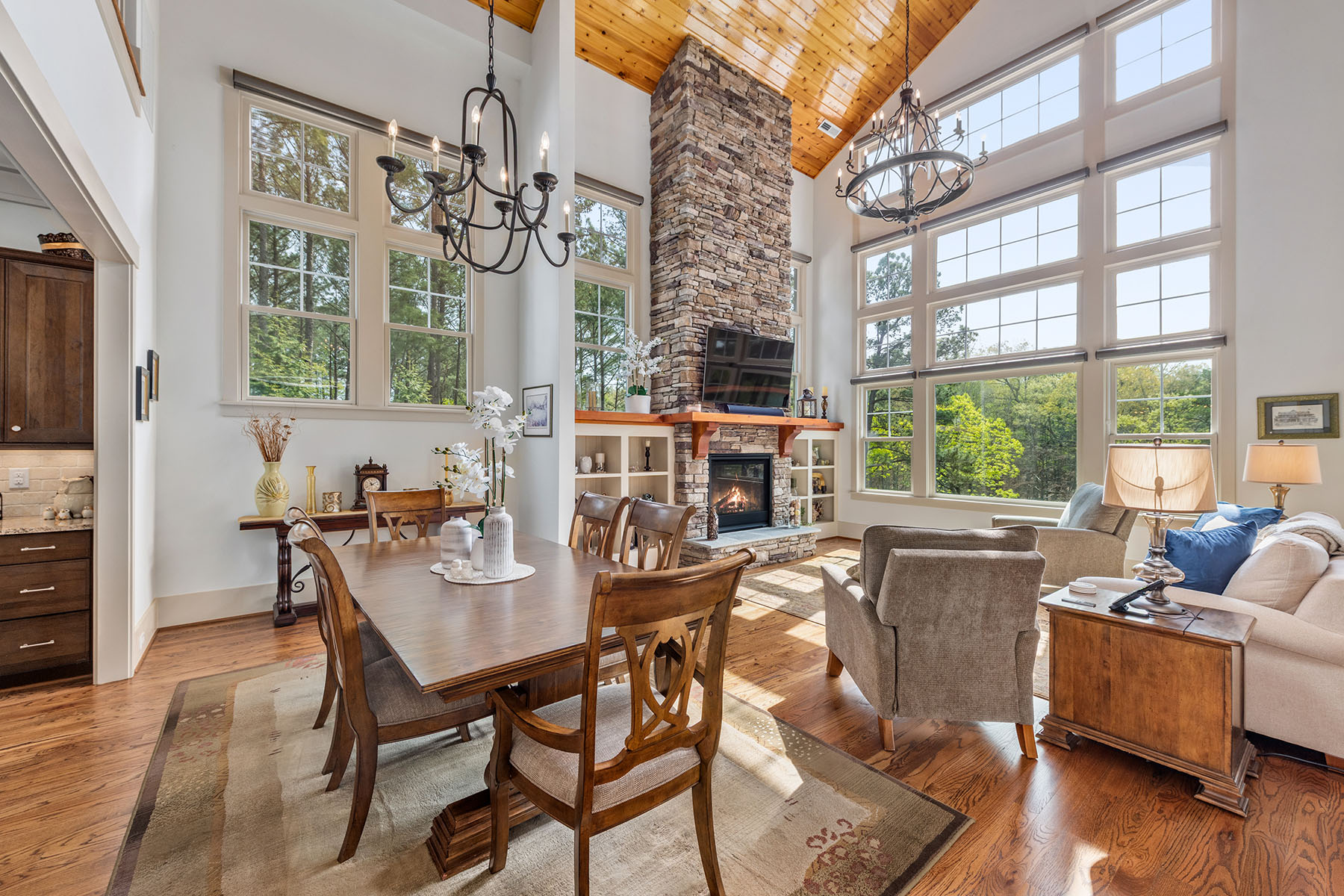 The main level features an open-concept layout anchored by a dramatic two-story living room with a soaring fireplace, creating a striking focal point filled with natural light. The chef's kitchen is equipped with a gas cooktop, double ovens, and premium appliances, while the elegant dining area is perfect for entertaining. The primary suite on the main floor provides a private retreat with a spa-inspired bath, and a utility room plus additional half bath add everyday convenience.