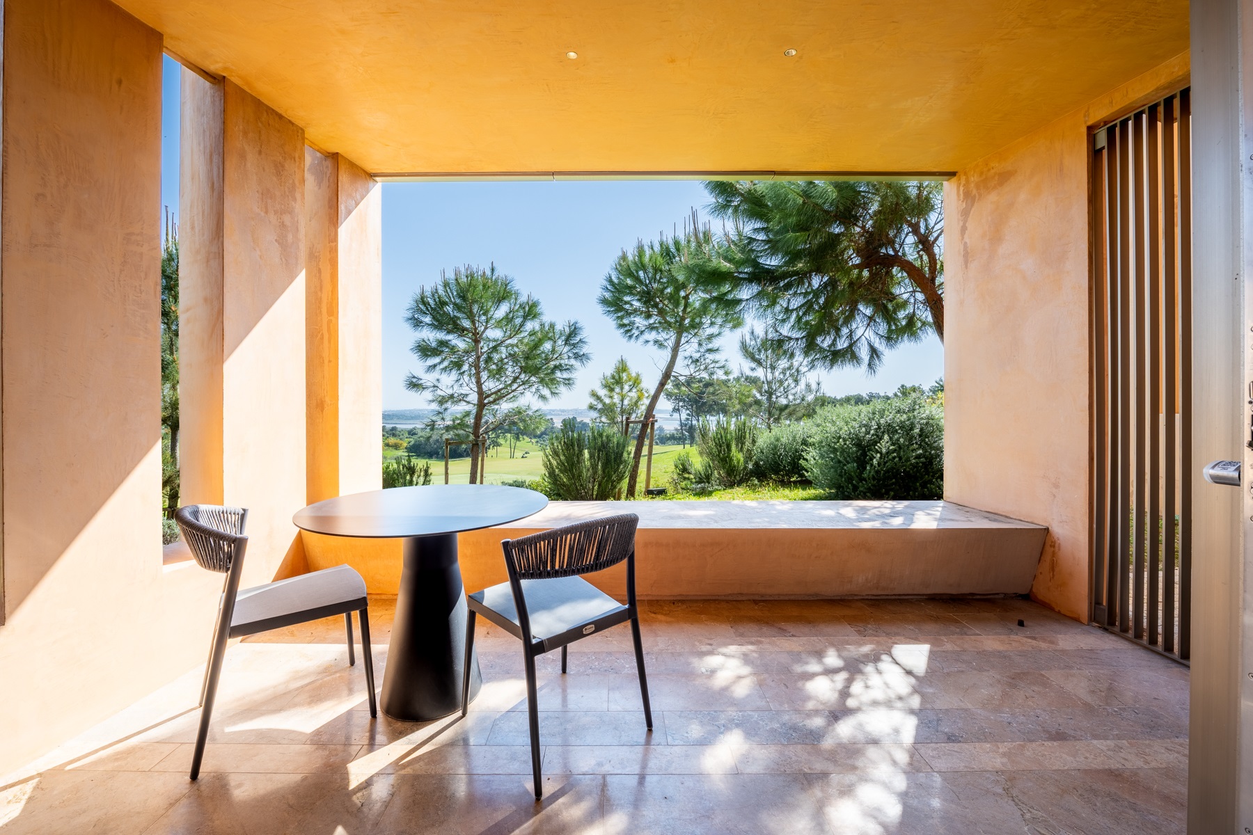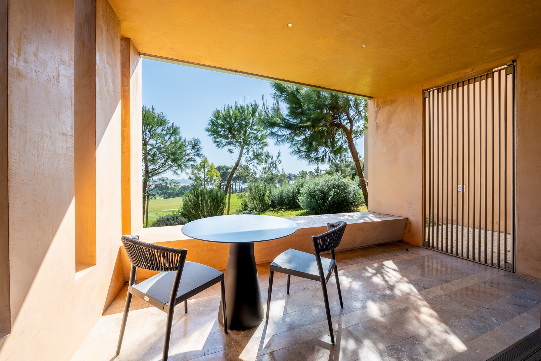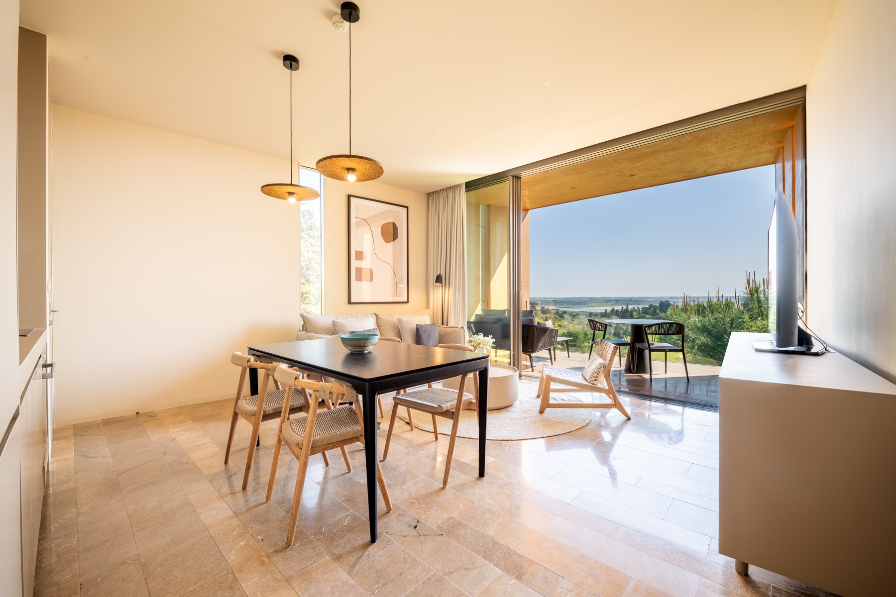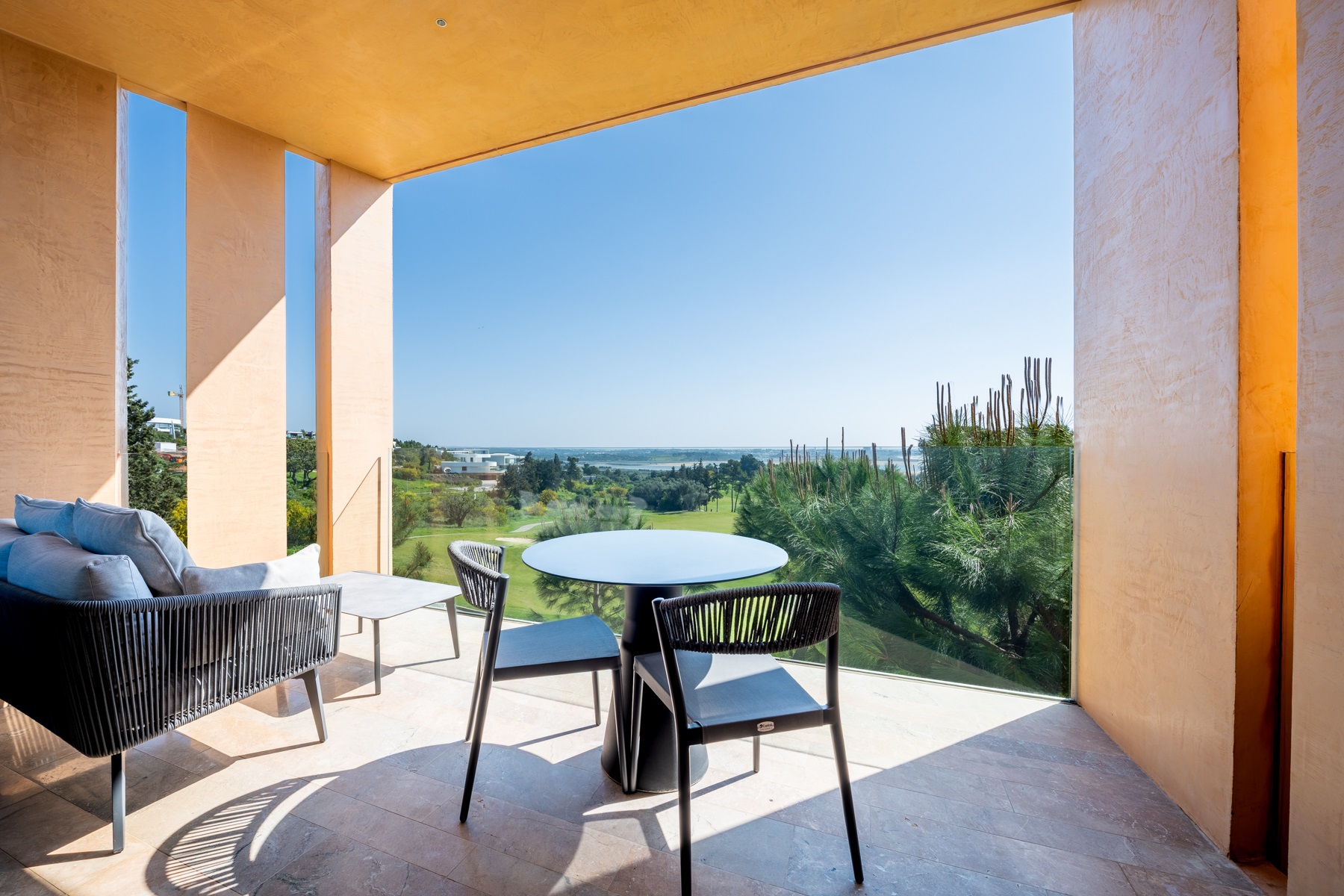 This Signature two-bedroom duplex apartment with private rooftop at Palmares Ocean Living & Golf Resort, completed in 2023 and offering 151.60 sqm of gross construction area, together with two private covered parking spaces and storage locker, was designed by RCR Arquitectes, winners of the Pritzker Architecture Prize, clearly represents a rare point where architecture, silence, light and horizon meet with complete natural harmony. Positioned at the at the beginning of the block, with no neighbouring unit on one side, this residence benefits from an uncommon sense of independence within the resort, where from its deep, architecturally integrated covered terraces, the view unfolds across three distinct and continuous layers: the vibrant green of the golf course, the calm waters of the Ria de Alvor, and beyond, the Atlantic Ocean. There are no interruptions and no visual noise, only horizon. Here, light enters as an architectural material in its own right, shaping volumes and setting the rhythm of the spaces as it moves through the interiors throughout the day, transforming each moment inside the home into a different experience. Inside, the finishes reflect the quiet sophistication of the RCR architectural language, with natural stone, honest materials, continuous surfaces and balanced proportions creating an atmosphere of understated comfort and elegance. Underfloor heating ensures year-round wellbeing, while the bedroom areas extend naturally towards the exterior, allowing you to wake each day with the landscape as a permanent backdrop. On the upper level, the private rooftop terrace becomes a personal viewpoint over one of the Algarve’s most privileged natural settings. This is true luxury. Living here is not simply about being inside the home; it is about stepping outside and, within minutes, reaching Meia Praia, walking along the estuary to the oyster beds of the Ria de Alvor, heading down to the golf clubhouse and its Michelin-starred restaurant for lunch overlooking the ocean, or simply following the natural trails that cross the resort landscape. Within the condominium, two exclusive swimming pools for residents, active security, and professional management ensure peace of mind and a consistently high quality of living experience. Very few units combine an end-of-block position, a private rooftop terrace, two parking spaces, and uninterrupted views over the golf course, the estuary and the ocean. This is one of them.