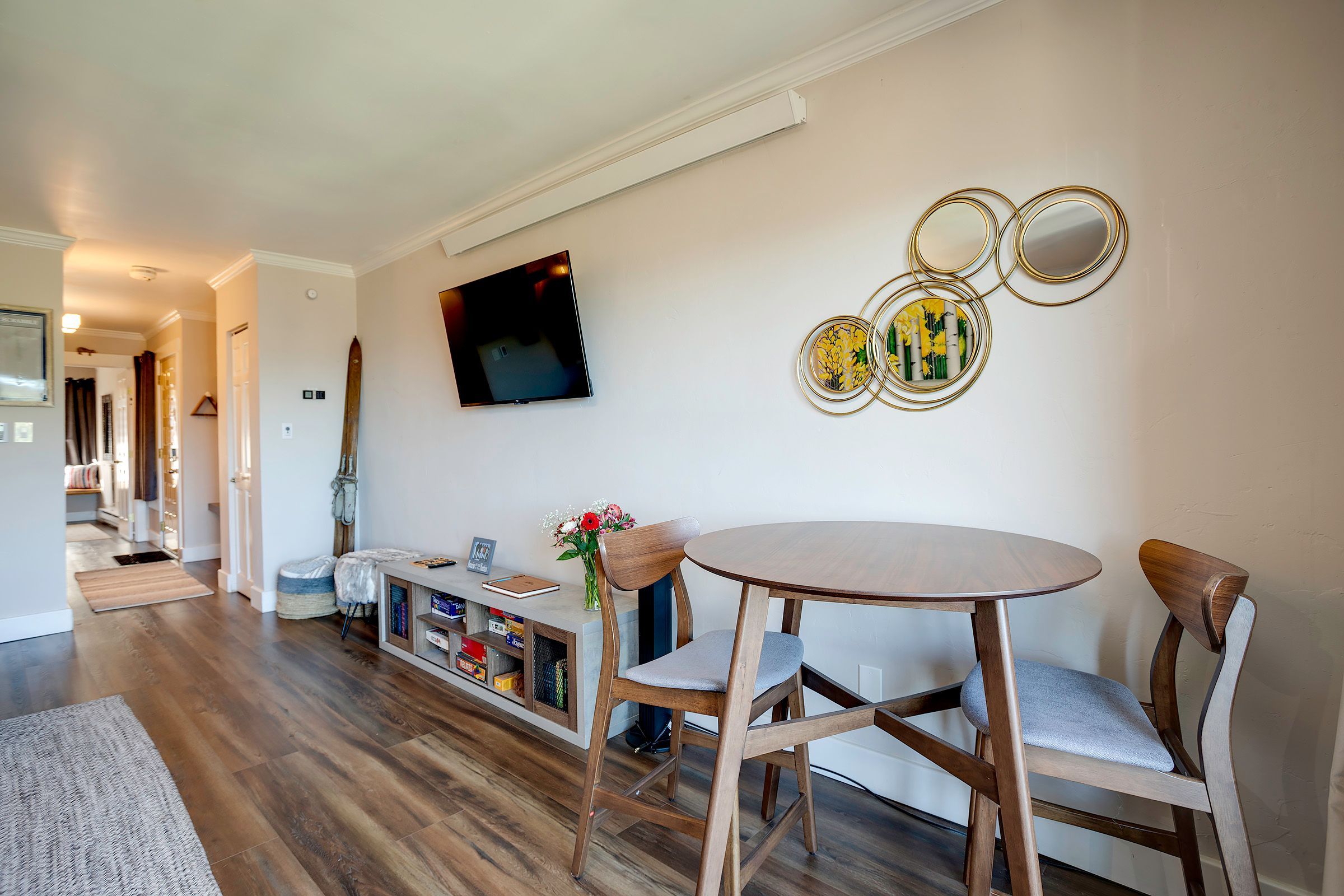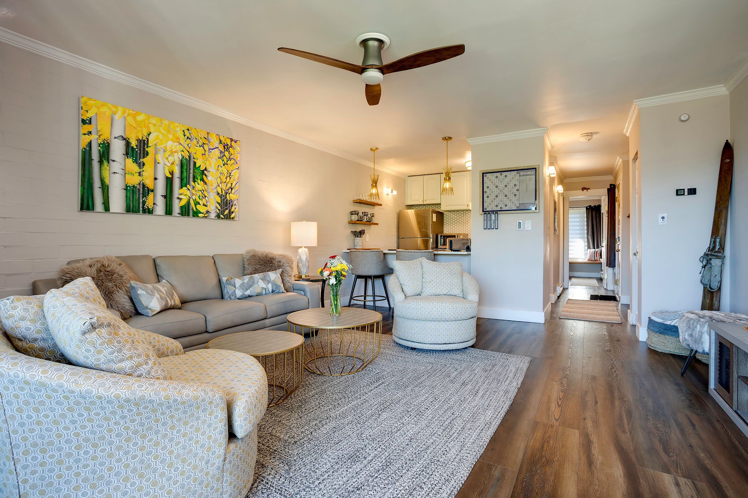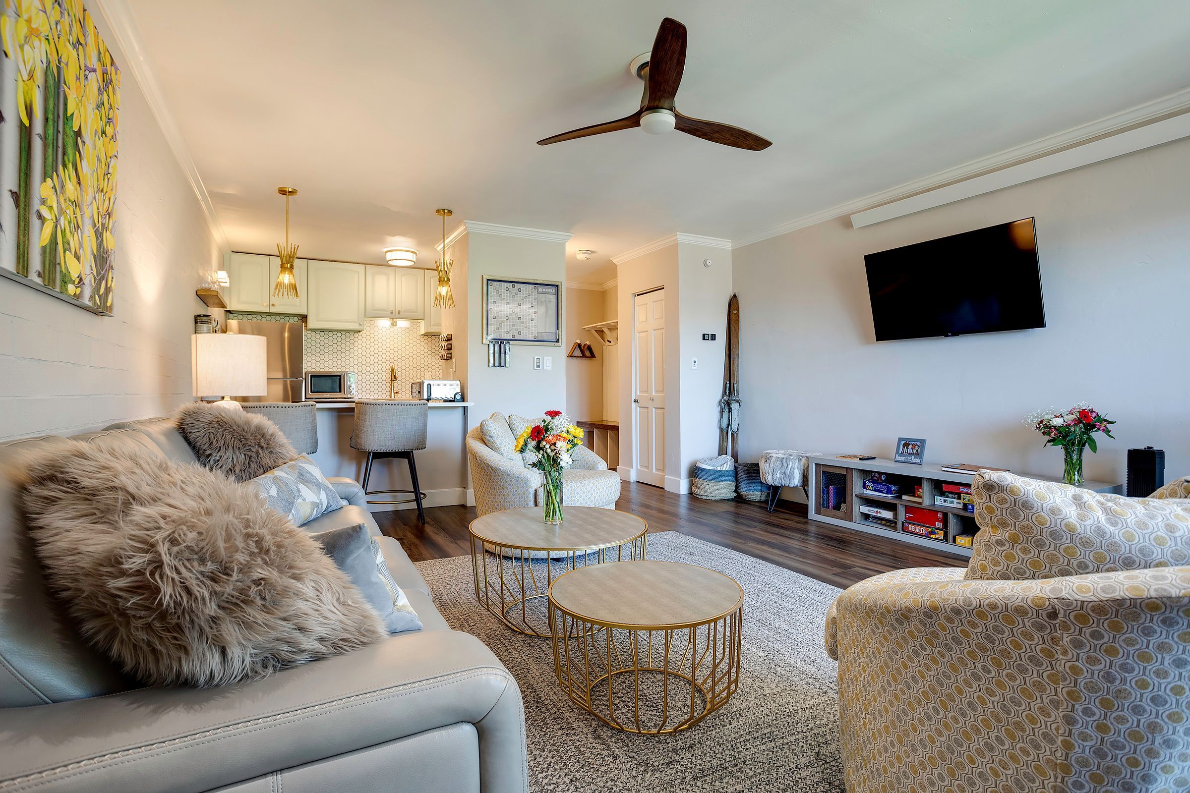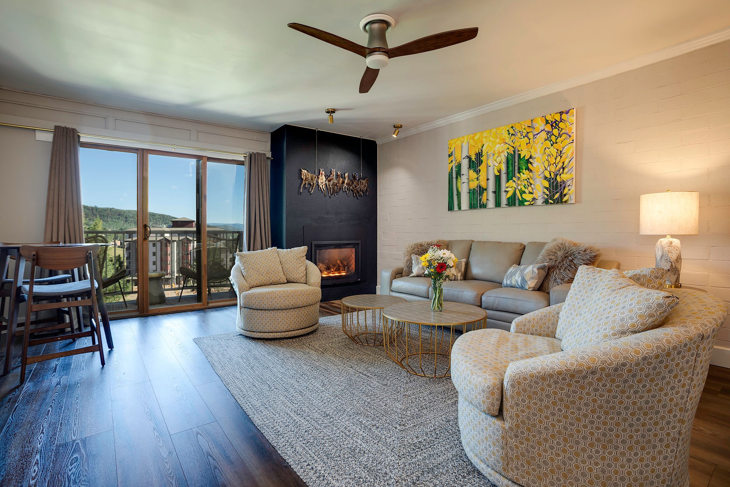 Tastefully updated and fully furnished, this turn-key one-bedroom, one-bath Ski Time Square condominium offers panoramic views of the Steamboat ski area and surrounding mountains. Offering exceptional flexibility in the short-term rental zone, it is ideal as a primary residence, mountain retreat, or investment property.Located across from the Steamboat Resort and steps from the free city bus, this condo delivers unmatched convenience to skiing, dining, grocery stores, and downtown Steamboat. Set in the heart of Ski Time Square, this condo also benefits from ongoing continued growth as the area sees renewed development, including new restaurants, retail, and ultra-luxury condominiums supporting long-term value appreciation.Access the unit via elevator or stairs. The electronic keypad entry offers enhanced security with access notifications. Inside, new luxury vinyl flooring seamlessly connects each room. The updated kitchen projects a clean, modern look with quartz countertops, stylish tile backsplash, stainless-steel appliances, updated cabinets, breakfast bar, and artistic light fixtures. The spacious living area features space to relax and entertain and a striking floor-to-ceiling leathered granite fireplace, perfect after a day on the slopes, while the private balcony invites you to unwind with ski area views, stunning sunsets, and the calming sound of Burgess Creek. The bedroom features all-new furnishings, a cozy window seat, a ceiling fan, and generous closet space. Community amenities include private ski lockers, bike storage, laundry facilities, and a nearby spa and fitness building with hot tubs and sauna. HOA dues cover nearly everything, making ownership simple and stress-free. A gated parking lot next door offers easy access to one parking spot. Whether you are skiing, hiking, biking, or enjoying Steamboat’s vibrant year-round lifestyle, this location delivers access to the best in every season.