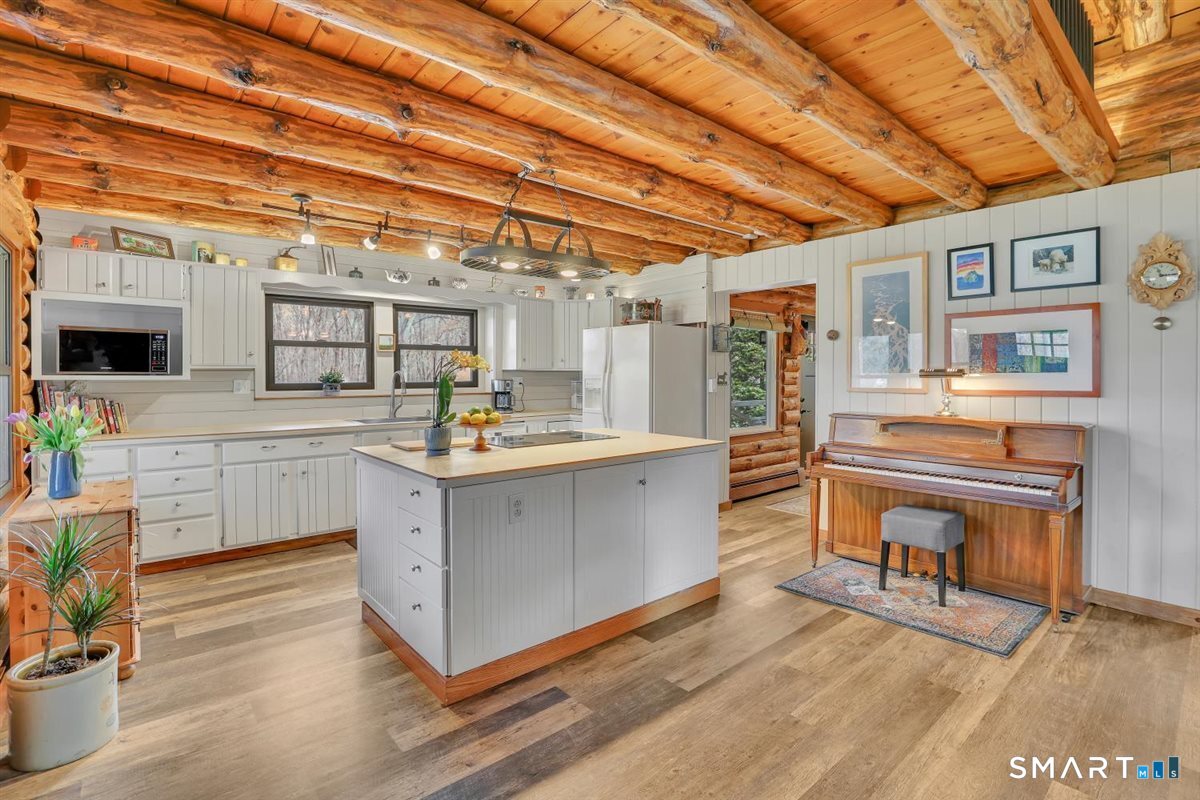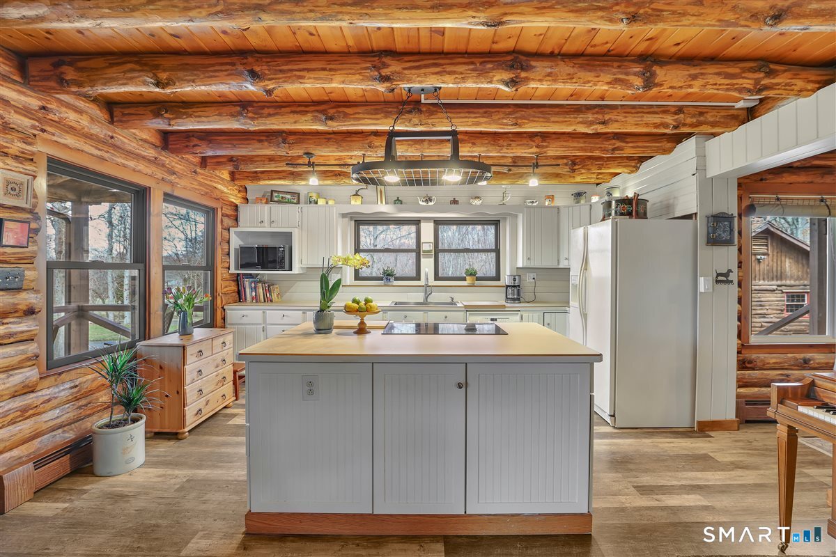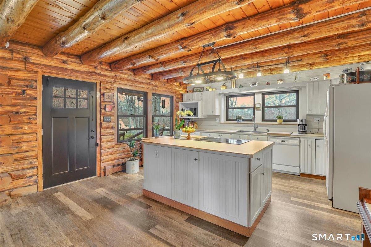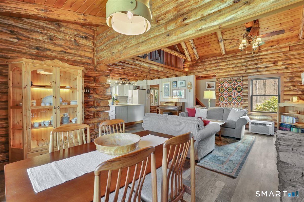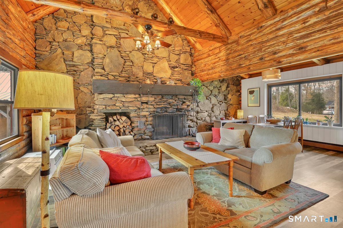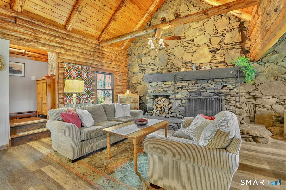 Tucked away on over an acre of level, private land, this charming 3-bedroom, 2-bath Cape-style log cabin offers the perfect blend of rustic character & modern comfort. Surrounded by nature, the setting provides a peaceful retreat while still enjoying close proximity to shopping with convenient highway access. Step inside to an inviting open floor plan highlighted by warm wood tones, exposed beams & a dramatic cathedral-ceiling living room featuring a breathtaking floor-to-ceiling full wall stone fireplace-truly the heart of the home. The fully applianced kitchen boasts crisp white cabinetry, ample counter space, & a center island with breakfast bar seating, perfect for casual dining & entertaining.The flexible layout includes a convenient first-floor bedroom & full bath. Upstairs, the primary bedroom features a loft area overlooking the stunning living room below, creating a unique and airy retreat. An additional bedroom & full bath complete the second level. The finished lower level expands your living space with a spacious rec room & guest bedroom-ideal for visitors, a home office, or a media space. Outside are 2 covered porches, an oversized detached 2-car garage with pull-down attic storage & built-in cabinetry, plus a separate oversized shed for all your tools & toys. Energy-efficient upgrades include new thermal windows & active solar, complemented by a 6-zone oil baseboard heating system for year-round comfort. 1 year AHS home warranty included.