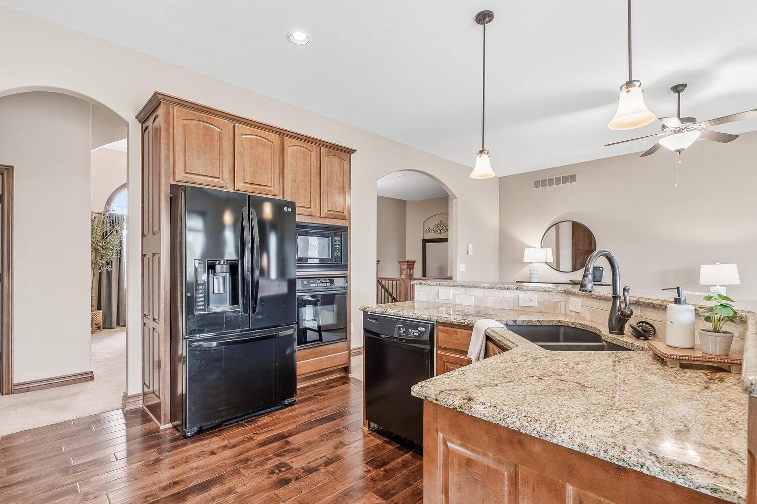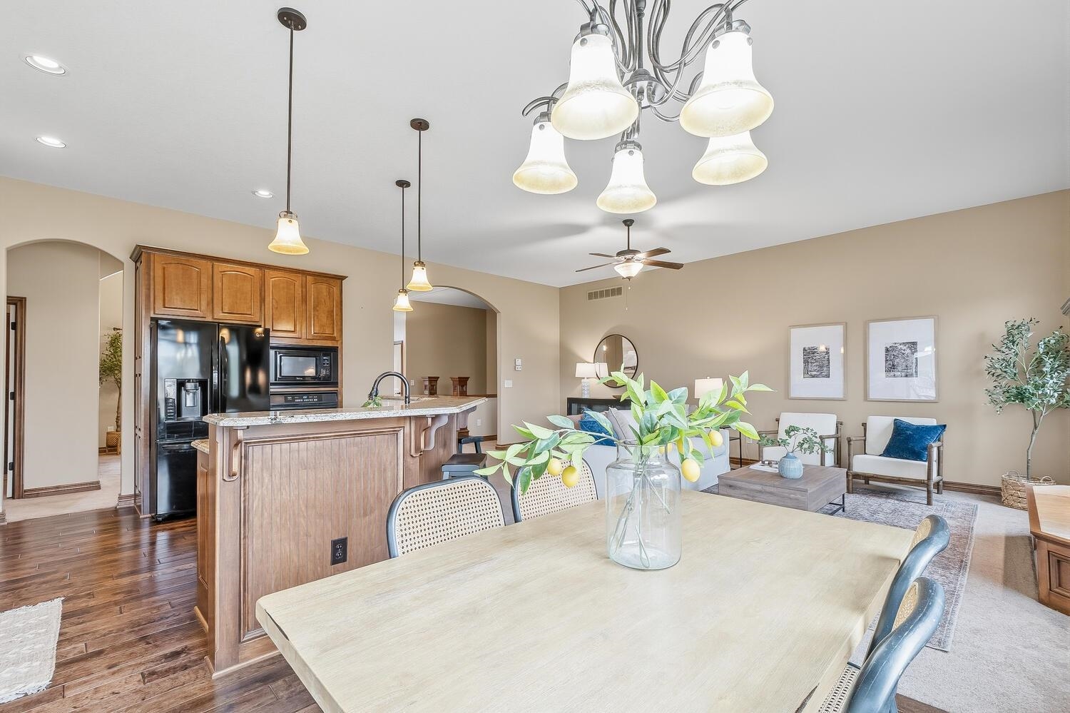 Potential for an assumable loan to a VA buyer at 2.75%! Beautiful 5-bedroom, 3-bathroom home with a 3 car garage for sale in the desirable Equestrian Estates! This home offers fantastic curb appeal and is nestled in a quiet neighborhood with easy access to Kellogg, making commuting a breeze. Step inside to an open-concept floor plan featuring a spacious family room with a cozy fireplace that flows seamlessly into the kitchen - perfect for entertaining. The kitchen is well-appointed with granite countertops, wood floors, and a walk-in pantry for ample storage. The primary suite is a true retreat, complete with a large walk-in closet, double vanity, relaxing soaker tub, and private water closet. Downstairs, the finished basement is an entertainer's dream with a wet bar, second fireplace, two additional bedrooms with oversized walk-in closets, and a versatile bonus room ideal for a home office or workout space. Enjoy neighborhood amenities including scenic lakes for walking and a community swimming pool. This home combines comfort, space, and convenience in one exceptional package!