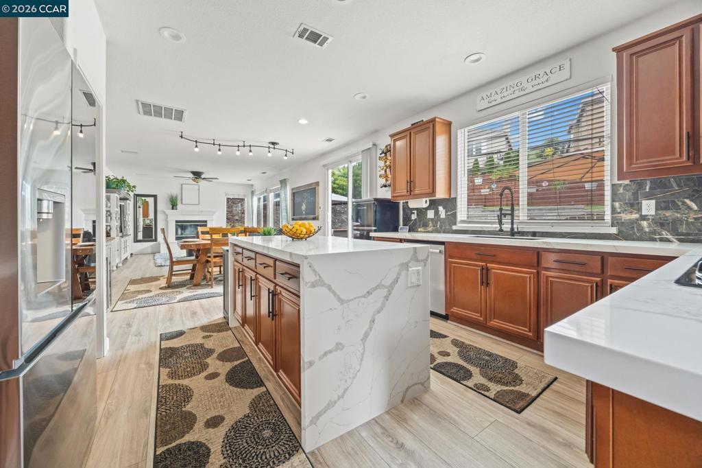 Open Thurs 4/2 from 5:30pm-7:30pm. Crystal Ranch luxury living 4+ bedrooms / 3.5 baths 3,240 sq ft resort-style pool and spa 3-car garage 911 Autumn Oak Cir blends generous scale, refined upgrades, and a luxury outdoor setting near Mt. Diablo trails. The two-story floor plan features a grand entry, cathedral ceilings, three fireplaces, an open kitchen and 2nd family room, a main-level bedroom and bath, spacious laundry room, and a versatile bonus room off the primary suite for an office, lounge, or fitness space. Recent improvements elevate the home with freshly painted interiors (2024), upgraded black hardware (2025), smart front door lock and Ring doorbell (2025), backyard Ring camera with floodlight (2025), updated fire alarms, new kitchen countertops (2025), new refrigerator and dishwasher (2025), a custom bar with wine fridge (2025), and a beautifully remodeled primary bath with granite countertops and an extended walk-in shower (2025). Outside, tiered retaining walls and landscaping (2025), along with a refreshed sport pool and spa (2026), Crystal Ranch amenities include a clubhouse, dog park, playground, community pool and spa, and tennis courts.