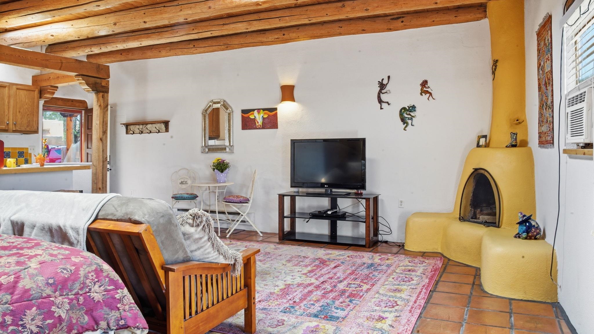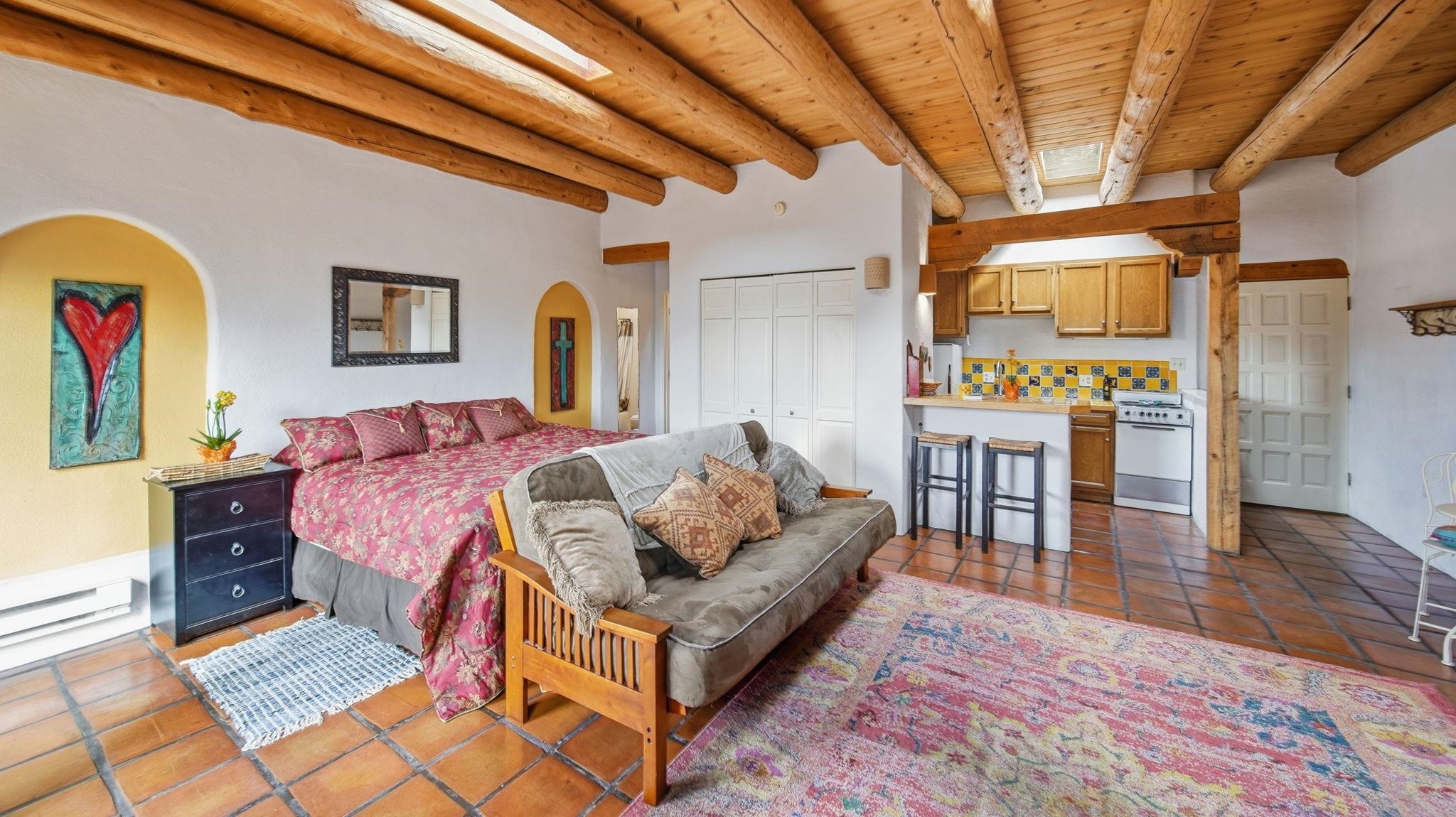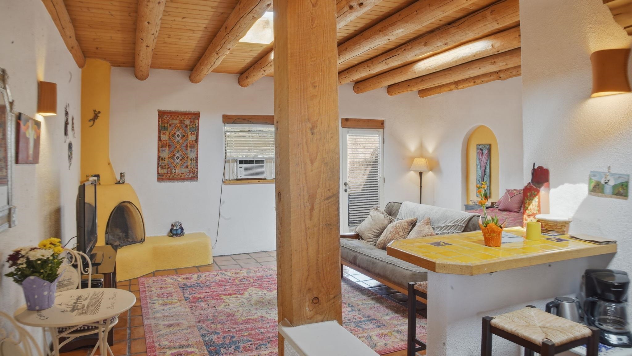 Sunset-Facing Historic Adobe Studio Around the Corner from Taos Plaza ~ Quietly tucked into the very northwest corner of the Las Casitas Condominiums blooming courtyard, #9 West is a highly private adobe studio listed on the National Register of Historic Places. The space is firmly grounded in authentic Southwestern character, featuring classic Saltillo tile floors, exposed ceiling vigas and beams with t&g, large nichos, built-in bancos, and a kiva fireplace for chilly high-desert nights. Plenty of natural light flows into this warm and well lit condo with skylights. As one of only three units in the building with a western exposure, the studio provides a rare sense of space and a vantage point to watch the sunset filter through distant cottonwoods. Walk and bike everywhere from this secluded unit; the historic Taos Plaza is just steps away, offering immediate access to the area's renowned galleries, museums, restaurants, and live music venues. Taos Ski Valley for skiing and then Ojo Caliente Hot Spring for soaking, both are a short scenic drive over the Gorge Bridge and Rio Grande National Monument. Designed for an effortless lifestyle, the low condo HOA cost covers grounds maintenance, trash service, water, sewer, and general insurance on the unit structure, helping to keep utility costs down for all homeowners. This is the Taos Casita you don't want to let get away, reach out to see for yourself! Vamos!