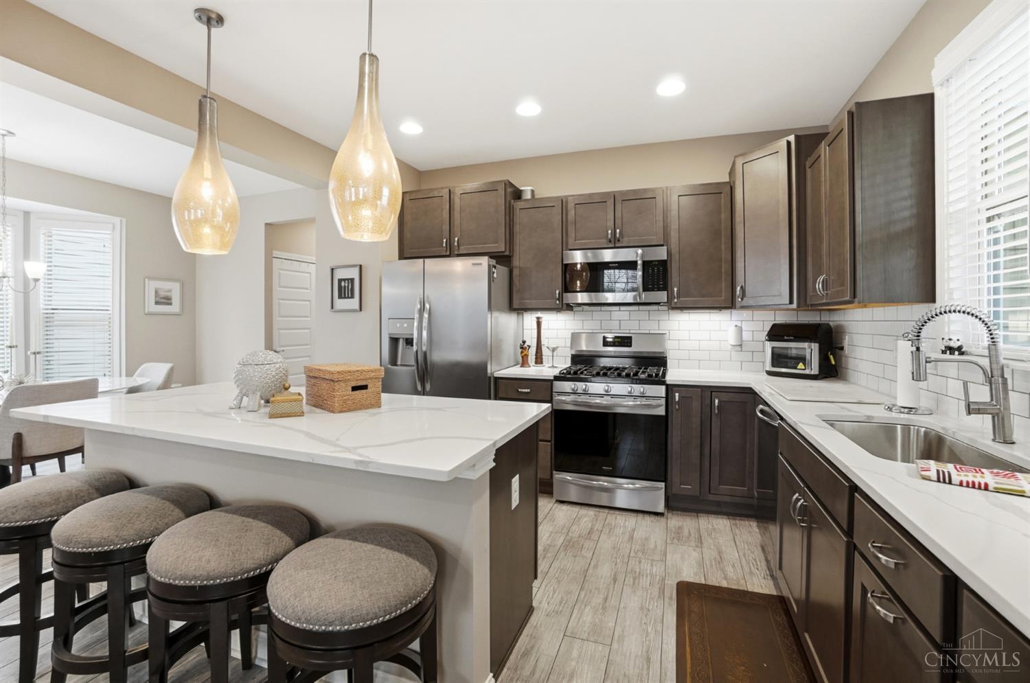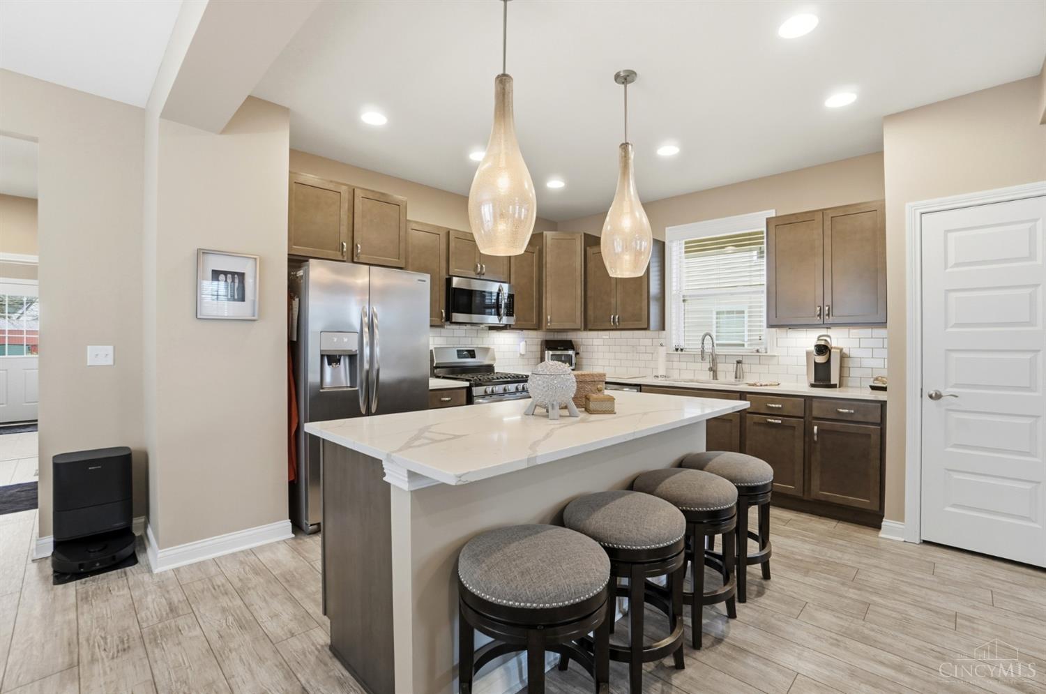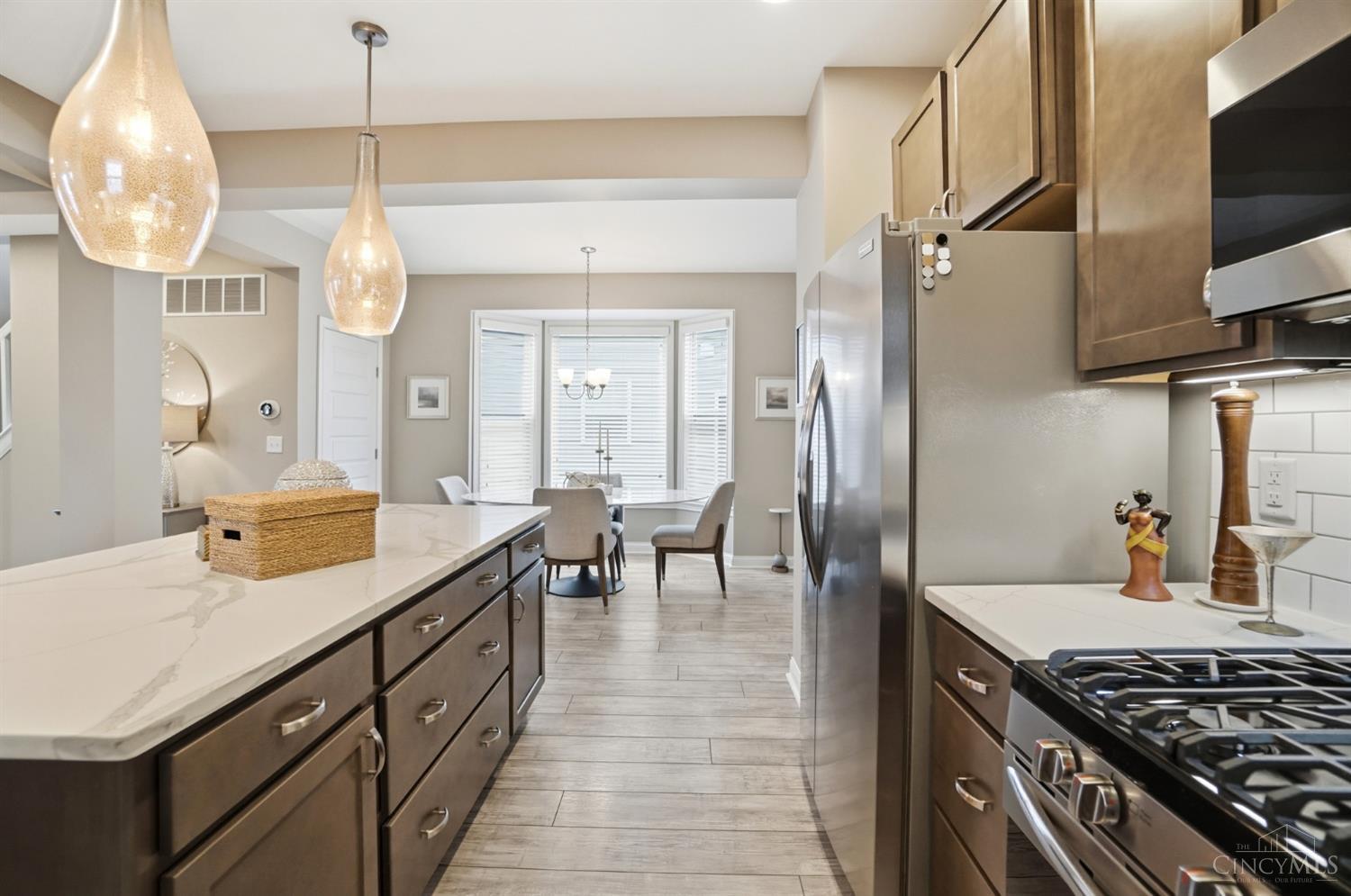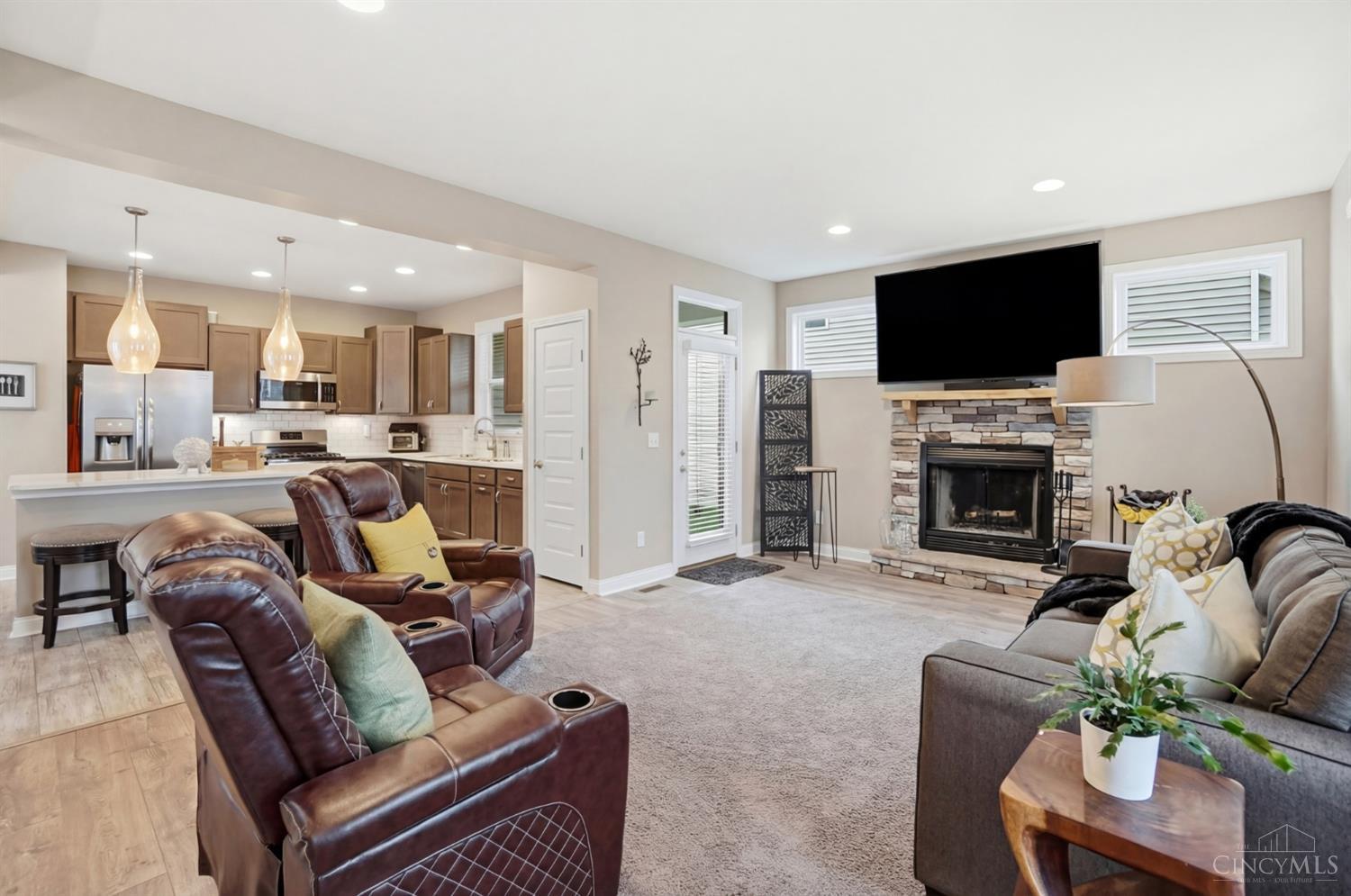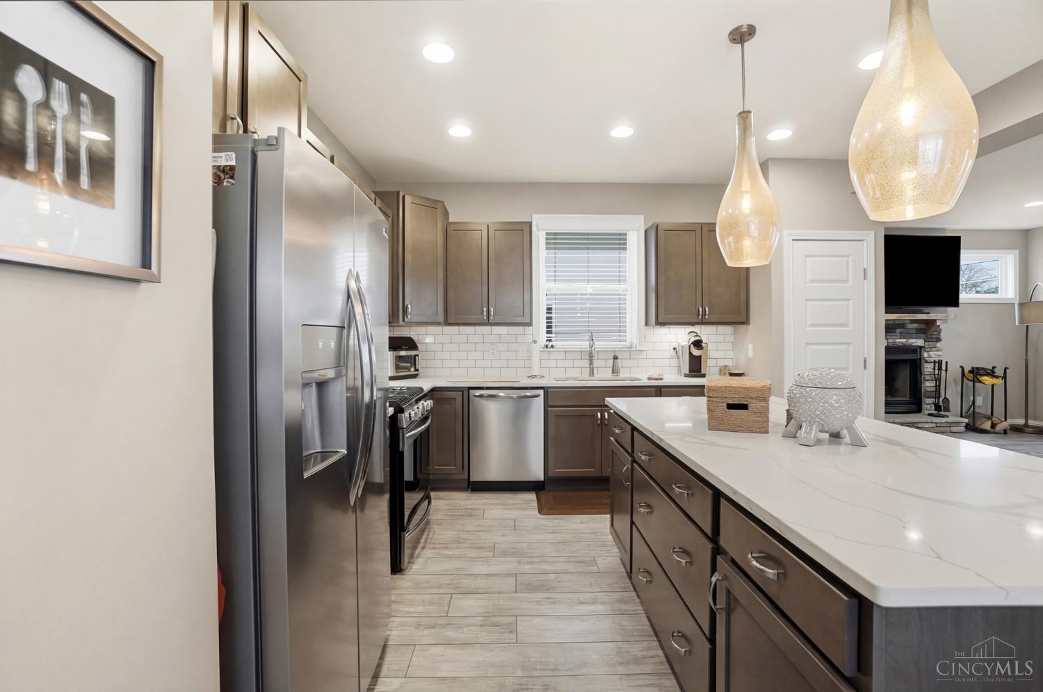 Beautiful 3 bedroom, 3 full and 1 half bath home offering open-concept main floor living. The kitchen features quartz countertops, a large island, stainless appliances, and opens to the living area with a wood-burning stone fireplace. Convenient access to a covered side porch from the main living space. The first floor also includes a dining area, laundry room and half bath. The finished basement provides additional living space, a full bath, and large storage areas. The second floor features a spacious primary suite with a raised tray ceiling, walk-in closet, attached study, en-suite bath, and private deck. Two additional bedrooms and a full hall bath complete the second level, along with a second private deck. A deep two car garage and additional HOA parking are available. The evening sunset views from the front porch and second floor deck are pretty amazing!